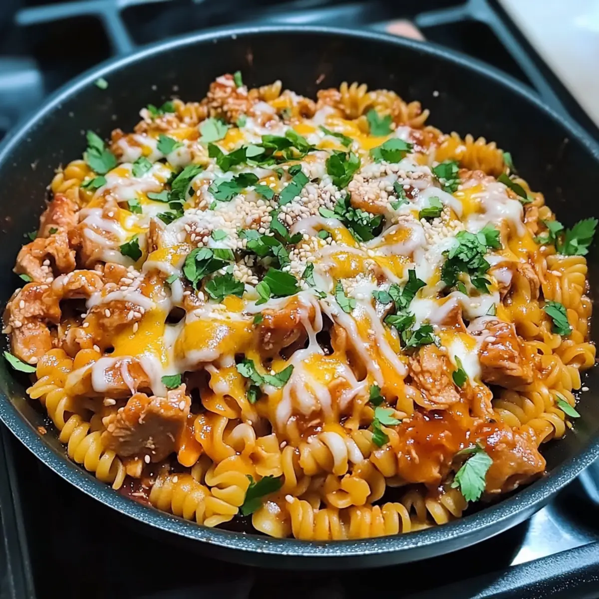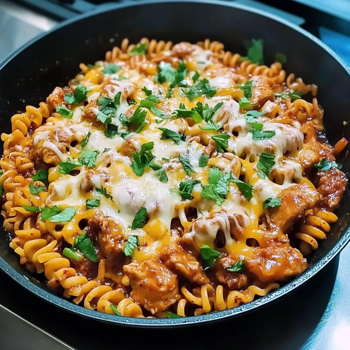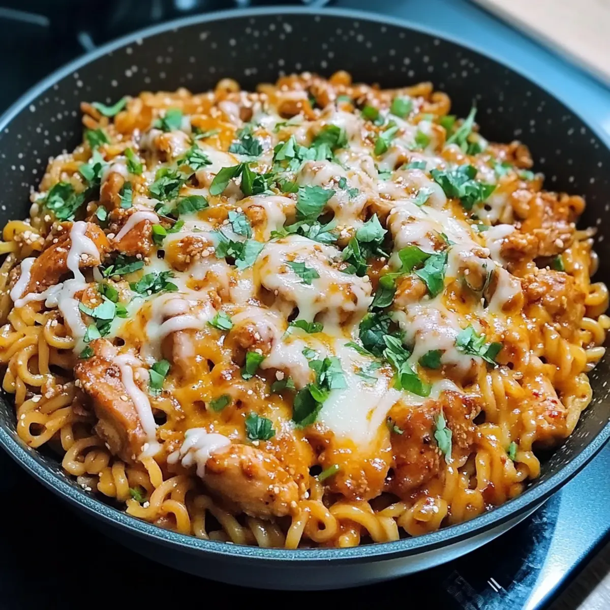 Jump to Recipe Print RecipeAs I stood in my kitchen, the aroma of sizzling chicken and spices wafted through the air, instantly transporting me to a bustling Korean street food market. That’s when I knew I had to share my twist on the classic—a recipe for Buldak-Style Cheesy Korean Spicy Chicken Noodles. This delightful dish brings together juicy chicken, chewy noodles, and a generous blanket of melty cheese, all while keeping the prep time under 30 minutes. It’s the ultimate low-effort meal for those cozy nights when you crave comfort without the fuss. You’ll love how this easy recipe balances the flavorful heat of Korean spices with creamy goodness, making it a sure-fire crowd-pleaser! Curious how to whip up this quick feast? Let’s dive in! Why Try Korean Spicy Chicken Noodles? Quick and Easy: In less than 30 minutes, you can have a mouthwatering meal on the table, perfect for busy weeknights. Flavor Explosion: The combination of spicy Korean flavors with melted cheese creates an unforgettable taste experience in every bite. Customizable: Feel free to toss in your favorite veggies or swap proteins, making this dish versatile to suit every palate. Comfort in a Bowl: Imagine the warmth of cheesy, sticky noodles that provide the ultimate comfort food experience, just like in your favorite Korean street food stalls. Crowd-Pleaser: Perfect for sharing, this recipe will leave your family and friends raving and asking for seconds! Once you try these Cheesy Chicken Enchiladas, you’ll know just how satisfying it can be to add that creamy touch to your meals! Korean Spicy Chicken Noodles Ingredients • Dive into the delightful components that make this dish shine! For the Chicken Boneless Chicken Thigh – Juicy and tender when cooked; feel free to substitute with chicken breast if desired. Gochugaru (1.5 tbsp) – These Korean red chili flakes add spice and depth; adjust based on your heat preference. Minced Garlic (2.5 tbsp) – Offers aromatic warmth; in a pinch, garlic powder (1 tsp) can be used instead. Black Pepper (1/2 tsp) – Provides mild heat and seasoning. Gochujang (1 tbsp) – This Korean chili paste adds both sweet and spicy notes; Sriracha can be a substitute, but the flavor will differ. Soy Sauce (2 tbsp) – Enhances umami; opt for low-sodium if you want to cut back on salt. Sweetener (1 tbsp, e.g., honey) – Balances the spiciness; you can also use sugar, maple syrup, or agave syrup. Neutral Oil – Ideal for frying without overpowering flavors; vegetable or canola oil works well. For the Veggies Onion (1, sliced) – Adds sweetness and flavor depth to the dish. Mixed Mushrooms (150g, sliced) – Brings earthiness and texture; feel free to swap with any preferred veggies for variety. For the Noodles Noodles (2 packs) – Korean Instant Ramyeon provides that perfect chewy texture; fresh ramen or udon are great alternatives as well. For the Topping Shredded Cheese (1/2 – 1 cup) – Adds creaminess; mozzarella or a blend ensures the best melt. Get ready to impress your taste buds with these Korean Spicy Chicken Noodles that are bursting with flavor! Step‑by‑Step Instructions for Buldak-Style Cheesy Korean Spicy Chicken Noodles Step 1: Marinate Chicken In a mixing bowl, combine the boneless chicken thighs with gochugaru, minced garlic, black pepper, gochujang, soy sauce, and sweetener. Massage the mixture well into the meat, ensuring every piece is coated. Let it marinate for about 10 minutes while you prepare the rest of the ingredients, allowing the flavors to infuse the chicken beautifully. Step 2: Cook Noodles Bring a large pot of water to a rolling boil and add the Korean instant Ramyeon noodles. Cook the noodles for 3–4 minutes, until they are slightly undercooked (just chewy). Drain them well and set aside to prevent them from sticking while you continue with the Buldak-Style Cheesy Korean Spicy Chicken Noodles. Step 3: Pan-Fry Chicken Heat a non-stick pan over medium-high heat and add a splash of neutral oil. Once hot, add the marinated chicken pieces in a single layer, allowing them to brown. Cook for about 2–3 minutes on each side until they are golden brown and 70% cooked through, releasing mouthwatering aromas as they sear perfectly. Step 4: Add Vegetables With the chicken still in the pan, gently push it to one side and add the sliced onion and mixed mushrooms. Sauté the vegetables for about 2–3 minutes, stirring occasionally, until they become tender and fragrant. This step enhances the flavor profile of your Buldak-Style Cheesy Korean Spicy Chicken Noodles while adding a colorful touch. Step 5: Combine Ingredients Add the previously drained noodles to the pan, mixing them well with the chicken and vegetables. Toss everything together for 1–2 minutes, ensuring the noodles absorb the juices and flavors from the chicken and veggies. This comforting mixture is the heart of your Korean Spicy Chicken Noodles, full of richness and warmth. Step 6: Melt Cheese Sprinkle a generous amount of shredded cheese over the noodle mixture, covering it evenly. Reduce the heat to low and cover the pan with a lid. Let the cheese melt for about 3–4 minutes until bubbly and gooey, creating that delightful melty layer. This final touch brings your Buldak-Style Cheesy Korean Spicy Chicken Noodles to life! Step 7: Serve and Enjoy Once the cheese is perfectly melted, remove the pan from the heat. Carefully scoop the cheesy chicken noodles into serving bowls, ensuring each bowl contains a hearty mix of chicken, noodles, and melted cheese. Garnish as desired and savor this delightful and comforting dish. Your journey of creating these Korean Spicy Chicken Noodles is complete! Korean Spicy Chicken Noodles Variations Feel free to get creative with this recipe and make it uniquely yours; the delicious possibilities are endless! Vegetable Boost: Add sliced bell peppers, carrots, or zucchini to increase nutrition and color. Cheesetastic: Experiment with different cheese