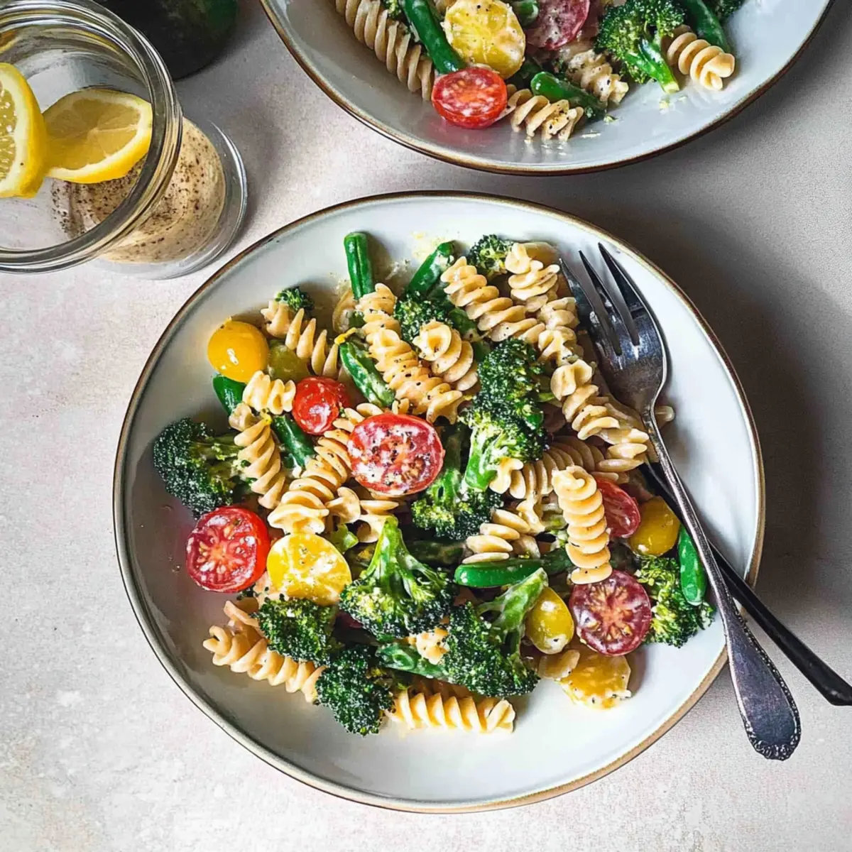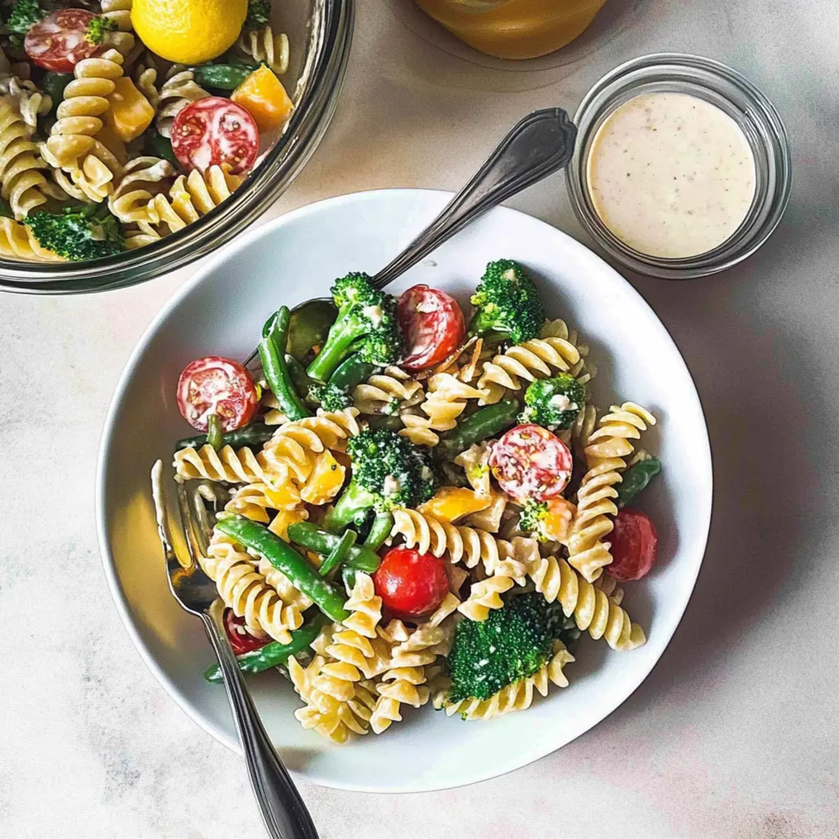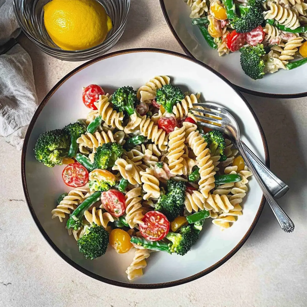 In a large mixing bowl, combine the cooled pasta, blanched broccoli, green beans, halved cherry tomatoes, diced bell peppers, and sun-dried tomatoes. Incorporate fresh dill and parsley for that pop of flavor. Pour the creamy dressing over the mixture and toss everything gently to coat. Make sure each piece is well-dressed for the best taste in your Lemon Pasta Salad.