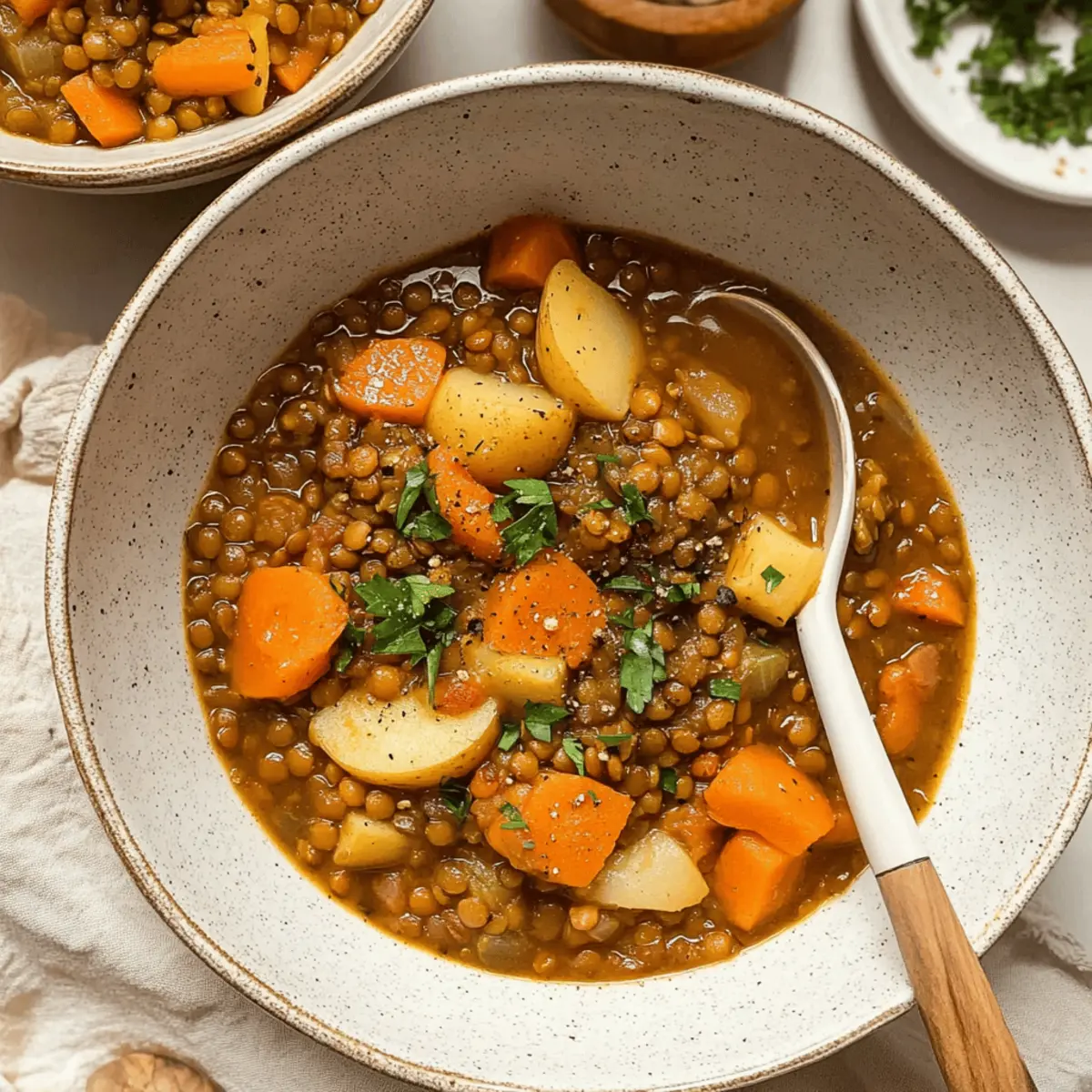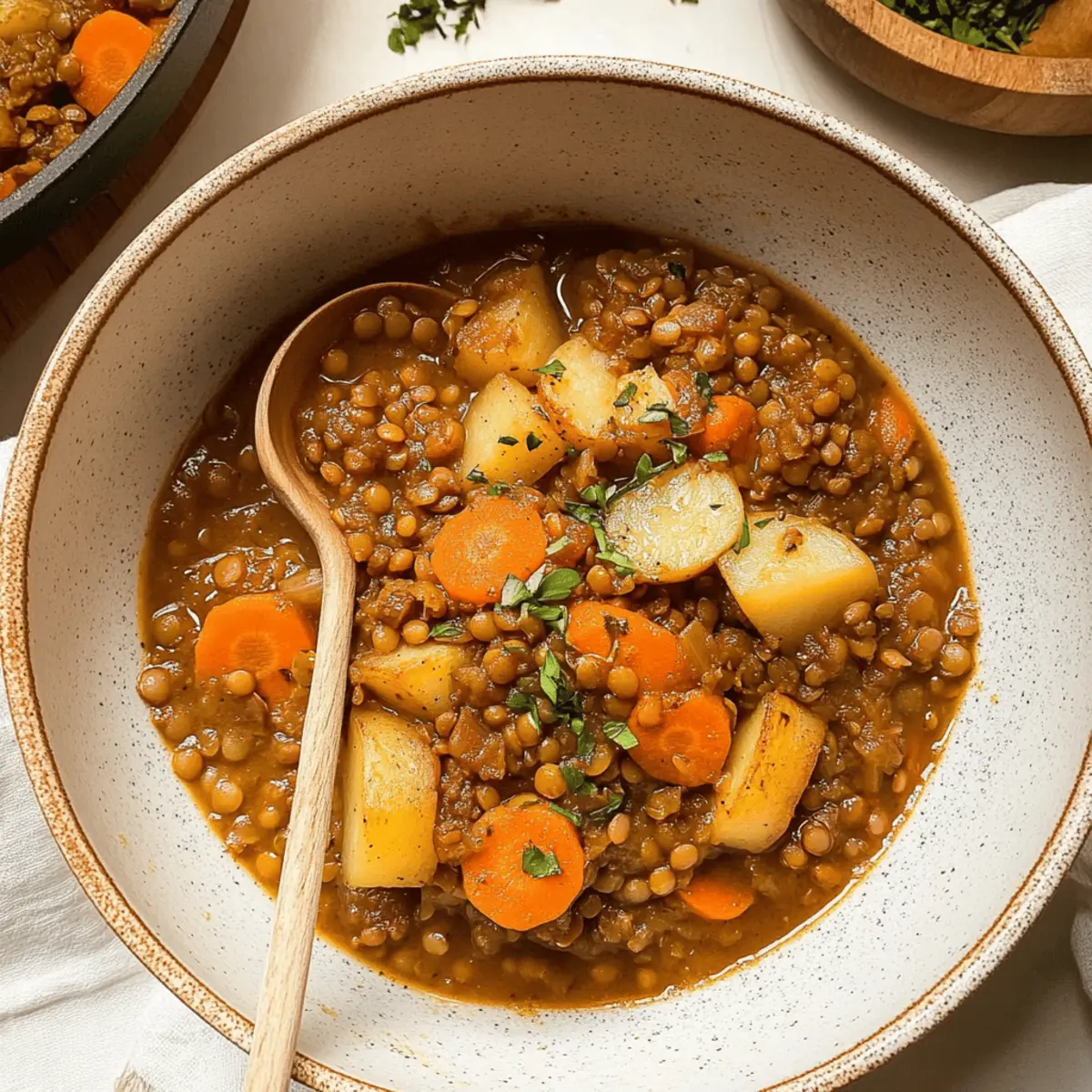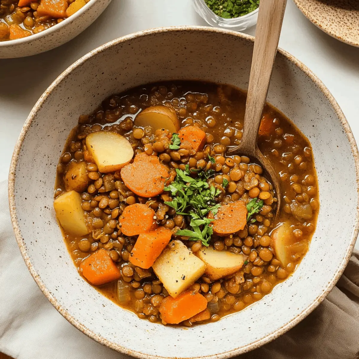 Jump to Recipe Print RecipeThe aroma of simmering spices filled the air as I hurried into the kitchen, desperately seeking comfort on a brisk evening. That’s when I decided to whip up my quick and hearty Lentil Stew with Potatoes. Packed with tender lentils, earthy potatoes, and an array of vibrant vegetables, it’s a dish that warms both the soul and the belly. What I love most about this recipe is that it not only comes together in just 45 minutes, but it’s also vegan and utterly filling—perfect for a busy weeknight dinner or an inviting gathering with friends. It’s a delightful way to embrace wholesome ingredients without sacrificing time or flavor. Curious to find out how to create this cozy hug in a bowl? Let’s dive into the recipe! Why is Lentil Stew a must-try? Comforting, hearty meal: This Lentil Stew is a hug in a bowl, combining earthy potatoes and tender lentils to create a nourishing, filling dish perfect for chilly evenings. Quick and easy: In just 45 minutes, you can bring this delicious vegan recipe to life, making it an ideal choice for busy weeknights. Customizable deliciousness: Feel free to add your favorite vegetables or grains; this stew embraces creativity! Try adding greens or swapping lentils for chickpeas for a delightful twist. Nutritious goodness: Packed with protein, fiber, and essential vitamins, it’s a satisfying option that contributes to a healthy diet, perfect as an everyday meal or a cozy gathering dish. Elevate your weeknight dinner by pairing this stew with a crusty bread or a fresh salad for a complete experience the whole family will love! Lentil Stew Ingredients • Everything you need for a cozy meal! For the Stew Dry Brown Lentils – A source of protein and fiber; no soaking required for this quick recipe. Olive Oil – Adds richness and helps sauté vegetables; swap with vegetable broth for an oil-free option. Onion – Provides a depth of flavor; red or yellow onions work equally well. Turmeric – Enhances flavor and adds a vibrant color; substitute with cumin if preferred. Carrots – Brings sweetness and texture; try parsnips or sweet potatoes for a change. Russet Potato – Contributes to the heartiness; Yukon gold potatoes can be used for a creamier texture. Garlic – Packs an aromatic punch; pre-minced garlic works well for convenience. Tomato Paste – Brings umami and richness; use tamarind paste if tomatoes are off the menu. Vegetable Broth – Forms the stew’s base; water can be used for a lighter version. Italian Seasoning – Blends herbal flavors beautifully; dried basil and oregano are good alternatives. Paprika – Adds a hint of smokiness; omit if a milder flavor is desired. Salt – Essential for enhancing flavors; adjust according to your taste preferences. Ground Black Pepper – Introduces a touch of heat; freshly ground offers the best flavor. Optional Add-ins Greens (Spinach/Kale) – Toss in during the last minutes for extra nutrition and color. Cayenne Pepper/Red Pepper Flakes – Spice things up for those who enjoy heat; just a pinch can elevate flavors. Now, gather your ingredients and let’s create a dish that everyone will want seconds of! Step‑by‑Step Instructions for Quick and Hearty Lentil Stew with Potatoes Step 1: Sauté the Onion In a large saucepan, heat 2 tablespoons of olive oil over medium heat. Once hot, add one chopped onion and sauté for about 5 minutes, stirring occasionally, until the onion is translucent and fragrant, bringing warmth and depth to your hearty lentil stew. Step 2: Add Garlic Next, stir in 2 minced garlic cloves and cook for an additional minute. This will infuse the oil with aromatic flavor, and you’ll know it’s ready when the garlic releases its delightful scent, enticing everyone in the kitchen. Step 3: Combine Veggies Add 2 sliced carrots and 1 cubed russet potato to the pan. Cook for about 5 minutes, stirring gently to coat them in the oil and allow them to soften slightly. This step creates a rich texture and bright flavor base for your lentil stew. Step 4: Incorporate Spices and Tomato Paste Stir in 2 tablespoons of tomato paste, 1 teaspoon of turmeric, and 1 teaspoon of Italian seasoning alongside a pinch of paprika, salt, and ground black pepper. Let these flavors meld over the heat for about 2 minutes until the mixture deepens in color and aroma, creating a savory foundation for your stew. Step 5: Add Lentils and Broth Now, mix in 1 cup of dry brown lentils and 4 cups of vegetable broth. Increase the heat to bring the mixture to a boil. You’ll see bubbles forming, which indicates it’s time to reduce the heat to low, ensuring a gentle simmer for the next phase of cooking. Step 6: Simmer the Stew Cover the pot and let the lentil stew simmer for 30 minutes, stirring occasionally. As the lentils cook, they will absorb the flavors and become tender, while the potatoes soften to create a comforting, hearty dish. Step 7: Final Seasoning and Serve Before serving, taste the stew and adjust the seasoning with more salt or pepper as needed. Optionally, add a splash of vinegar or fresh lemon juice to brighten the flavors. Ladle the warm lentil stew into bowls and relish the satisfying, cozy flavors! Lentil Stew Variations & Substitutions Customize your lentil stew experience with these fun, flavorful twists! Greens Galore: Add chopped spinach or kale during the final minutes of cooking to infuse your stew with vibrant colors and extra nutrients. Creamy Dream: Blend half of the stew for a creamy texture and then mix it back in for a comforting consistency that hugs your palate. Heat It Up: Spice things up with cayenne pepper or red pepper flakes for a fiery kick. Just a pinch can transform the flavor! Different Legumes: Switch out brown lentils for green lentils or chickpeas for a delightful variation, adding unique textures and flavors to your dish. Sweet Swap: Replace the russet potatoes with sweet potatoes for a touch of natural sweetness and vibrant color. 
