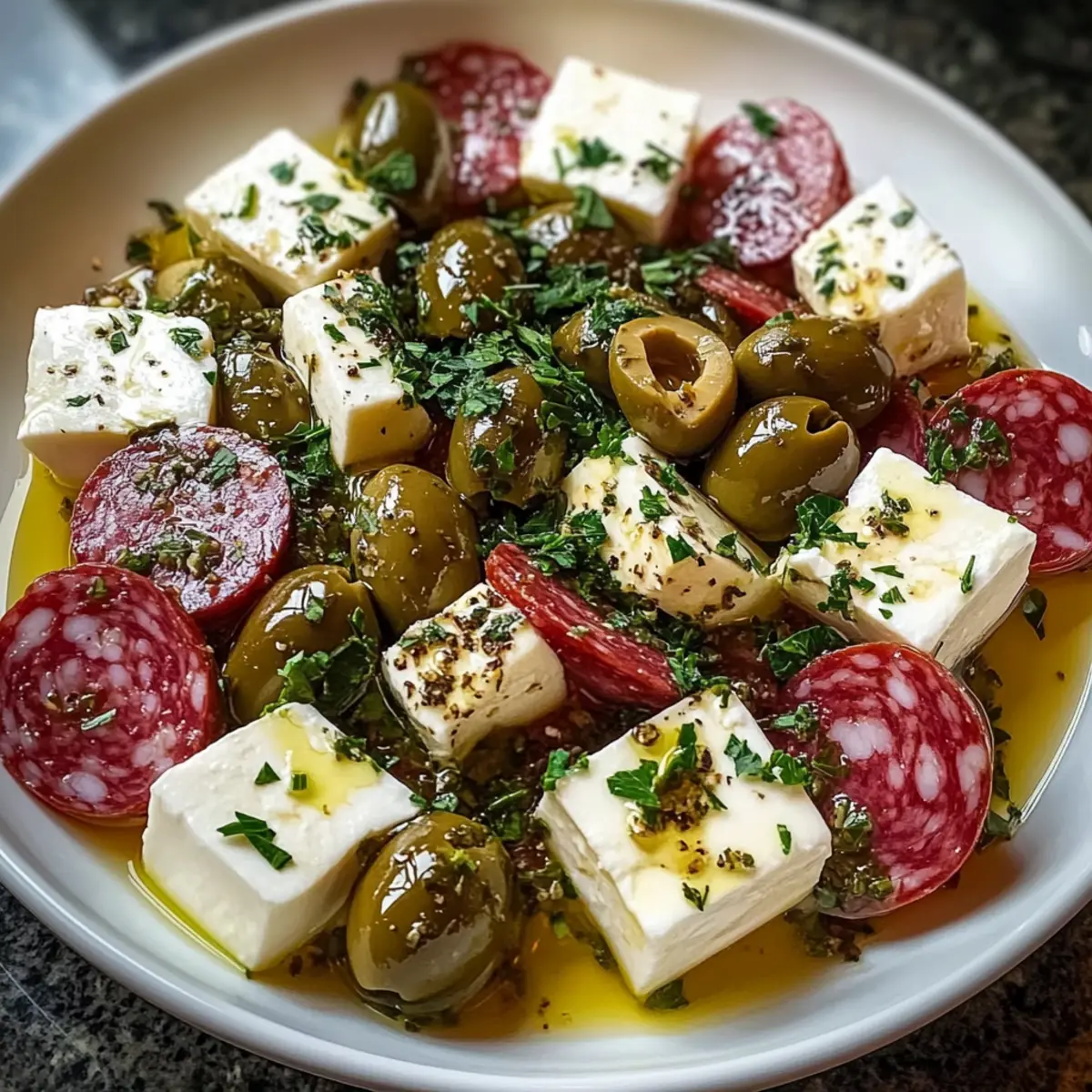 Jump to Recipe Print RecipeAs I stood in my kitchen surrounded by the delightful aromas of marinated cheese, salami, and green olives, a sense of joy washed over me. This Zesty Marinated Cheese Appetizer with Salami & Green Olives is the perfect solution for anyone looking to impress guests without spending hours in the kitchen. Not only is it a beginner-friendly dish that takes just 20 minutes to prep, but it also allows for endless customization—focus on your favorite ingredients or make it vegetarian. With rich and creamy mozzarella, tangy feta, and that savory kick from salami, every bite brings a burst of Mediterranean flair that everyone will love. Whether you’re hosting a casual gathering or a festive celebration, this appetizer will elevate your entertaining game to new heights. Ready to dive into this deliciously simple recipe that’s sure to be a crowd-pleaser? Why Make Marinated Cheese Appetizer? Beginner-Friendly Ease: You’ll find this recipe simple enough for everyone, ensuring a delightful outcome with minimal fuss. Flavor Explosion: The harmonious combination of creamy mozzarella, tangy feta, and savory salami creates a taste experience that your guests will rave about. Customizable Delights: Feel free to swap in your favorite cheeses or omit salami for a vegetarian twist—versatility is the name of the game! Perfect for Any Occasion: Whether it’s a casual get-together or an elegant dinner party, this appetizer is sure to wow your guests and elevate your spread. Quick Preparation: With just 20 minutes of hands-on time, you can easily create this impressive dish, allowing you to enjoy your gathering stress-free. Pair it with some artisan crackers or fresh vegetable sticks for an eye-catching presentation that maximizes both flavor and enjoyment! Marinated Cheese Appetizer Ingredients • Dive into the delightful world of flavors with these simple yet essential components. For the Cheese Mozzarella Cheese (8 ounces) – Creamy base that absorbs the marinade’s flavors; can substitute with burrata or gouda for a different texture. Feta Cheese (8 ounces) – Tangy and crumbly, brightens the dish; substitute with goat cheese for a varied flavor profile. For the Salami & Olives Salami (4 ounces) – Cured meat providing savory depth; can be replaced with prosciutto or omitted for a vegetarian version. Green Olives (1 cup, pitted and halved) – Adds briny flavor and crunch; substitute with black olives or sliced pickles for a twist. For the Marinade Extra Virgin Olive Oil (1 cup) – Main marinade component providing richness; no substitution recommended for optimal flavor. Garlic (4 cloves, minced) – Enhances aroma and flavor depth; use garlic powder in a pinch if needed. Dried Oregano (1 tablespoon) – Adds an herbal quality; can use fresh oregano (3 tablespoons) for a fresher taste. Red Pepper Flakes (1 tablespoon, optional) – Provides a kick of heat; omit for those preferring a milder flavor. Lemon Zest (from 1 lemon) – Brightens flavors with citrus notes; substitute with lime zest for a different zest. Lemon Juice (from 1 lemon) – Adds acidity to balance richness; can substitute with vinegar if needed. For the Garnish Fresh Parsley (for garnish, chopped) – Adds color and herbaceous freshness; no substitute necessary. With these Marinated Cheese Appetizer with Salami & Green Olives ingredients, you’re on your way to crafting a dish that’s sure to impress your guests! Step‑by‑Step Instructions for Marinated Cheese Appetizer with Salami & Green Olives Step 1: Prepare the Cheese Begin by cutting your mozzarella and feta cheese into uniform cubes, roughly 1-inch in size. This ensures that each bite is perfectly balanced. Place the cheese cubes in a large mixing bowl where they can mingle later with the salami and olives. The direct preparation will only take about 5 minutes! Step 2: Mix the Cheese with Salami and Olives Next, slice the salami into thin strips and halve each green olive. Add the salami and olives to the bowl with your cheese. Gently toss the mixture using a spatula or your hands, making sure each piece is well combined without breaking the cheese. This step should take no more than 3 minutes. Step 3: Whisk the Marinade In a separate bowl, whisk together the extra virgin olive oil, minced garlic, dried oregano, red pepper flakes, lemon zest, and lemon juice. Aim for a smooth and well-blended marinade, which should take about 2 minutes. The fragrant mix will infuse your Marinated Cheese Appetizer with Salami & Green Olives with rich flavors. Step 4: Combine Marinade with Cheese Mixture Drizzle the prepared marinade over the cheese, salami, and olives in the mixing bowl, ensuring an even coating. Stir gently but thoroughly to combine, allowing the marinade to soak into every ingredient. This process takes about 2 minutes, and you’ll notice the vibrant colors combine beautifully. Step 5: Cover and Refrigerate Once everything is mixed, cover the bowl with plastic wrap or transfer the mixture to a glass jar with a lid. Refrigerate your creation for at least 2 hours, but if you have the time, let it marinate overnight for even deeper flavors. This wait allows the ingredients to meld into a delightful appetizer. Step 6: Serve the Appetizer When it’s time to serve your Marinated Cheese Appetizer with Salami & Green Olives, use a slotted spoon to transfer the mixture onto a platter. This method prevents excess oil from dripping, keeping your appetizer looking and tasting fresh. Arrange it artfully, inviting your guests to dig in. Step 7: Garnish and Present Finally, sprinkle chopped fresh parsley over your dish for a pop of color and a touch of freshness. Serve the appetizer with toothpicks, artisan crackers, or slices of crusty bread to enhance the experience. Take pride in your creation as you share it with friends and family! What to Serve with Marinated Cheese Appetizer with Salami & Green Olives Elevate your gathering by complementing