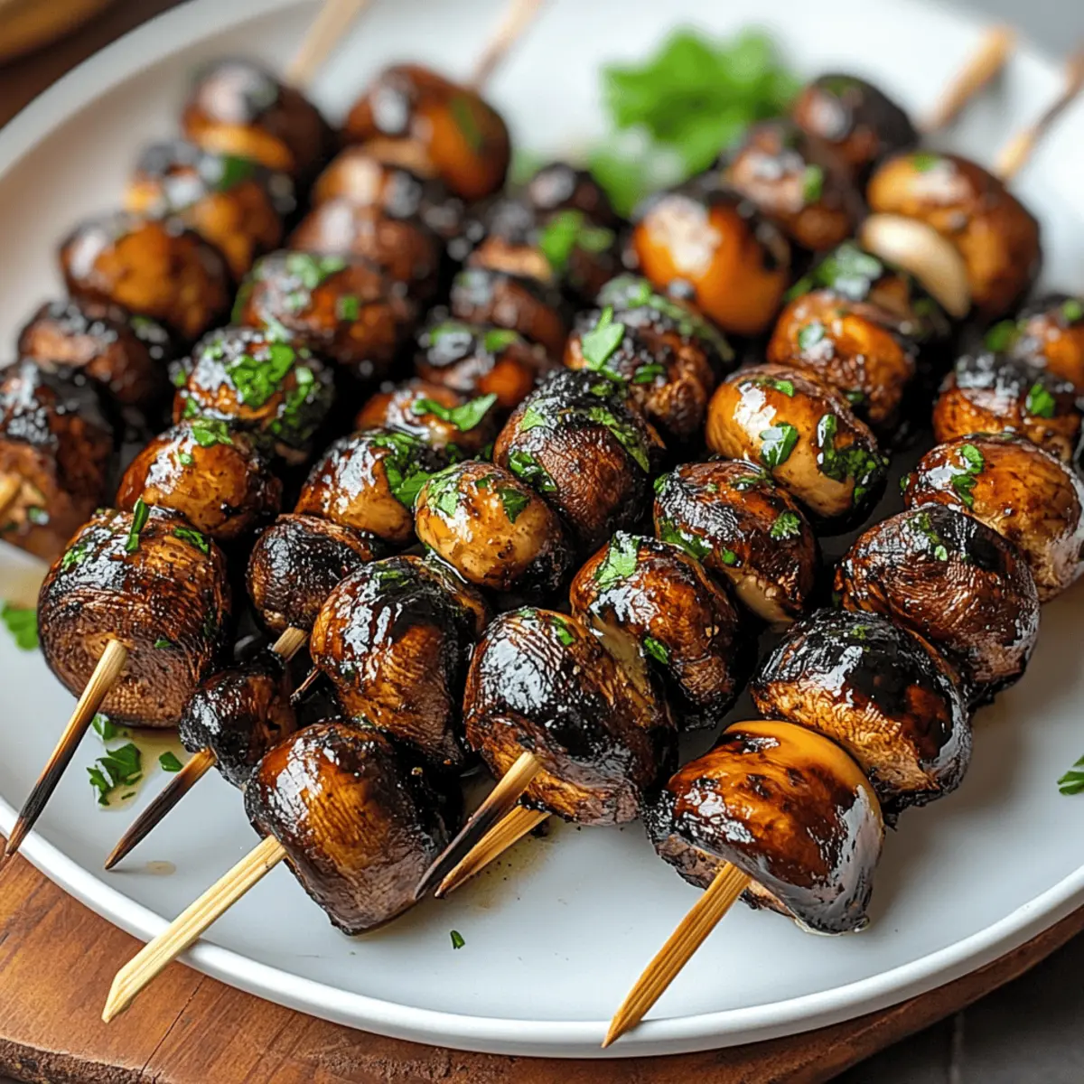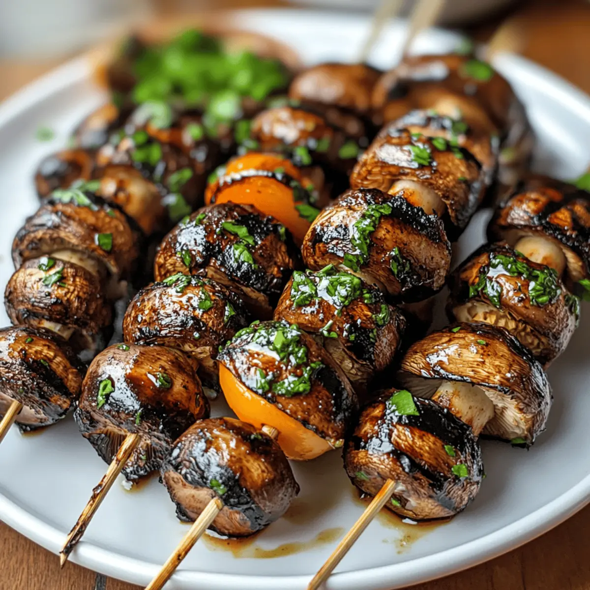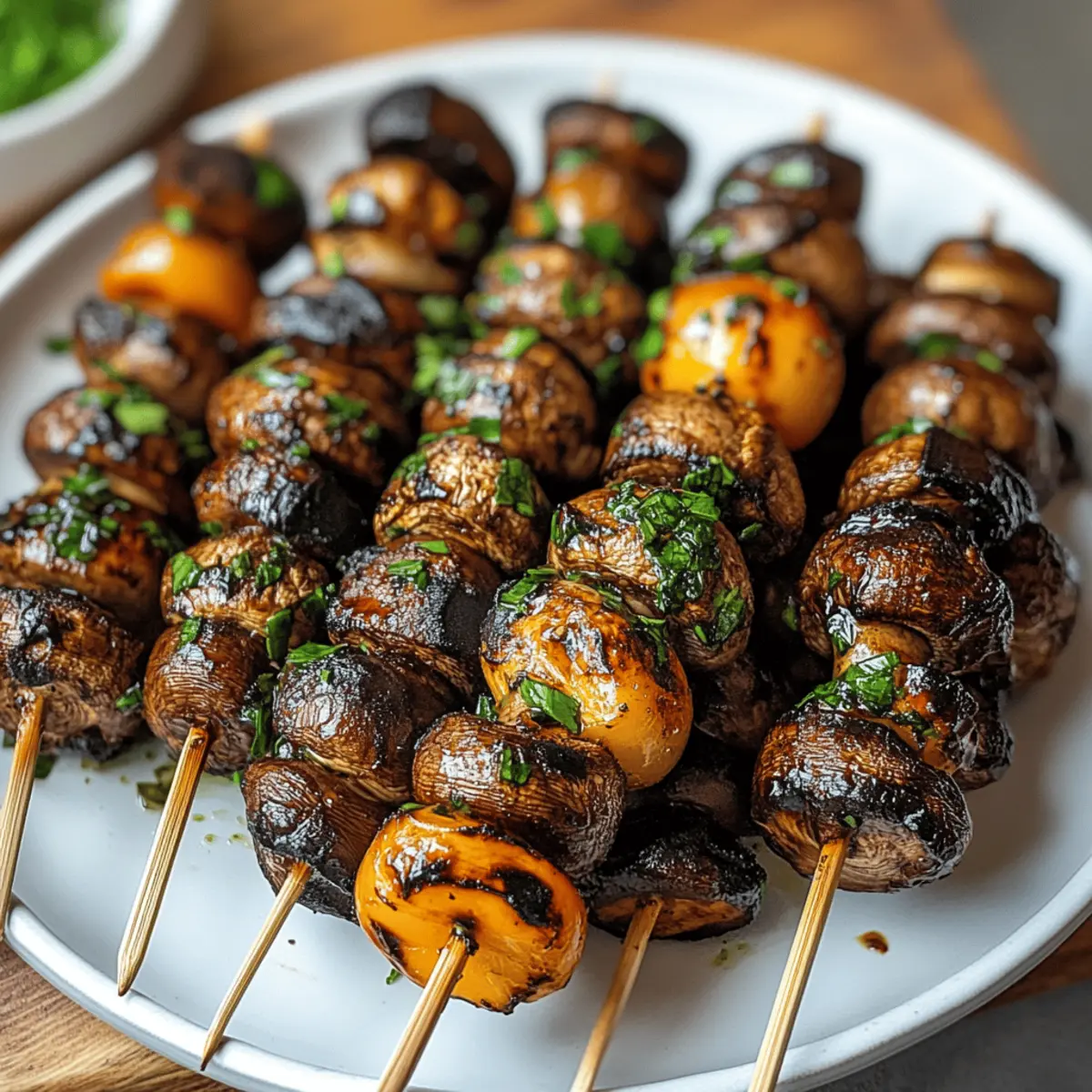 Jump to Recipe Print RecipeThere’s something magical about the sizzle of a grill on a warm summer evening, don’t you think? As the world around us comes alive, I find myself drawn to the smoky allure of Marinated Grilled Mushroom Skewers. These skewers are an easy, vegan-friendly delight, packed with robust flavors that prompt even the most dedicated meat-lovers to reconsider their options. With just a handful of ingredients, you can create a dish that’s not only simple to prepare but also versatile enough for any gathering, whether it’s a backyard BBQ or a cozy outdoor dinner. Imagine impressing your friends with skewers so juicy and full of umami that they’ll forget they’re plant-based! Ready to discover the secrets behind grilling these smoky treasures? Let’s dive in! Why are these skewers so delicious? Unforgettable Taste: The boldly herbed marinade elevates these skewers, offering a rich, smoky flavor that’s hard to resist. Simplicity at Its Best: With minimal ingredients and straightforward steps, you’ll have a show-stopping dish ready in no time. Versatile Appeal: Perfect as appetizers or star of the meal, they pair beautifully with fresh salads or heart-warming grain dishes like our Grilled Shrimp Bowl. Crowd-Pleasing: Impress both vegans and meat-lovers alike; everyone will be reaching for seconds! Meal Prep Friendly: These skewers store well, making them ideal for meal prep or casual entertaining. Enjoy the sizzle and flavor that keeps your gatherings lively! Marinated Grilled Mushroom Skewers Ingredients For the Marinade Olive Oil – Adds richness and moisture; can be substituted with avocado oil for a different flavor profile. Soy Sauce – Provides umami depth and saltiness; use tamari or coconut aminos for a gluten-free option. Balsamic Vinegar – Contributes sweetness and acidity; apple cider vinegar can also work as a substitute. Worcestershire Sauce – Adds complexity; opt for vegan Worcestershire sauce for a plant-based alternative. Garlic (minced) – Enhances flavor significantly; garlic powder can replace fresh if necessary. Dijon Mustard – Brings a delightful tang; substitute with yellow mustard if that’s what you have on hand. Honey or Maple Syrup – Sweetens the marinade naturally; for a vegan twist, use maple syrup. For the Skewers Mushrooms – The star of the dish; choose firm varieties like cremini or portobello for the best results. Thyme & Rosemary – Provide aromatic herbal notes; dried herbs can be substituted, though fresh is preferred. Smoked Paprika – Contributes that irresistible smoky flavor; regular paprika can be used as a substitute. Salt & Pepper – Essential for seasoning; adjust according to your taste preference. Optional Add-ins Colorful Veggies – Alternating with bell peppers, cherry tomatoes, zucchini, or red onions can add flavor and vibrancy. Cubed Firm Tofu or Seitan – Incorporate for an extra protein boost, complementing the smoky marinated grilled mushroom skewers beautifully. Step‑by‑Step Instructions for Marinated Grilled Mushroom Skewers Step 1: Prepare the Marinade In a medium bowl, whisk together olive oil, soy sauce, balsamic vinegar, Worcestershire sauce, minced garlic, Dijon mustard, and honey or maple syrup until smooth. Add freshly chopped thyme, rosemary, smoked paprika, salt, and pepper, giving the mixture a vibrant blend of flavors. This marinade is key to achieving those mouthwatering Marinated Grilled Mushroom Skewers, so ensure it is well combined and aromatic. Step 2: Marinate the Mushrooms Place the mushrooms in a resealable plastic bag or shallow dish, then pour the prepared marinade over them, ensuring each mushroom is well coated. Seal the bag or cover the dish with plastic wrap, then refrigerate for at least 30 minutes, ideally 2 to 3 hours. This soaking time allows the mushrooms to absorb the smoky and savory flavors, making your grilled skewers irresistible. Step 3: Soak the Skewers If you’re using wooden skewers, soak them in water for about 30 minutes before grilling. This step is essential to prevent the skewers from burning on the grill, ensuring your Marinated Grilled Mushroom Skewers stay intact and vibrant during the cooking process. Meanwhile, preheat your grill to medium-high heat to get it ready for those flavorful bites. Step 4: Preheat the Grill Once the skewers are soaked and the mushrooms have marinated, preheat your outdoor grill to medium-high heat. Lightly oil the grates with a paper towel soaked in cooking oil to prevent the skewers from sticking. A properly preheated grill is crucial; you’ll know it’s ready when you can hold your hand about six inches above the grate for 5 seconds before it becomes too hot. Step 5: Assemble the Skewers Remove the marinated mushrooms from the refrigerator and thread them onto the skewers, leaving a little space between each mushroom for even cooking. If you like, alternate them with colorful vegetables such as bell peppers, cherry tomatoes, or zucchini for added flair and flavor. The vibrant colors will make your Marinated Grilled Mushroom Skewers even more appealing! Step 6: Grill the Skewers Carefully place the assembled skewers on the preheated grill. Grill the skewers for about 10 to 12 minutes, turning them occasionally to ensure even cooking. You’ll know they’re done when the mushrooms become tender and slightly charred, with those delightful grill marks. For added flavor, brush the skewers with any leftover marinade during grilling. Step 7: Serve and Enjoy Once grilled to perfection, transfer your Marinated Grilled Mushroom Skewers to a serving platter. Sprinkle them with fresh parsley or chives for a bright finish before serving them warm. These delicious skewers are perfect as an appetizer or part of a main dish and will have everyone clamoring for more! What to Serve with Marinated Grilled Mushroom Skewers Elevate your meal with delightful pairings that bring out the delicious flavors of your skewers, tan
