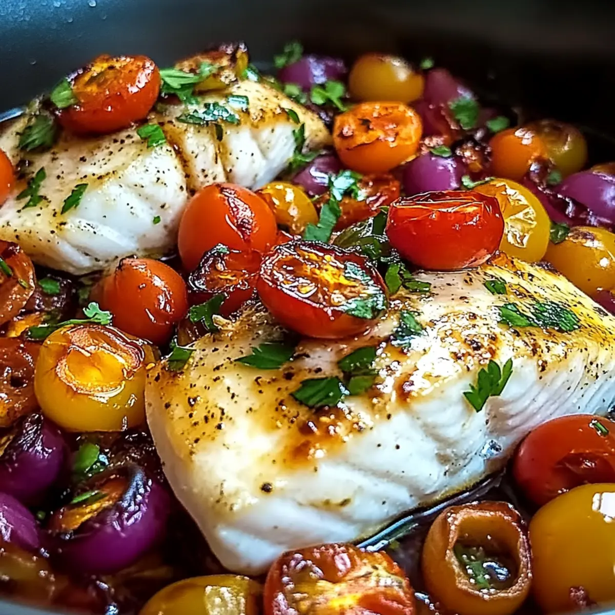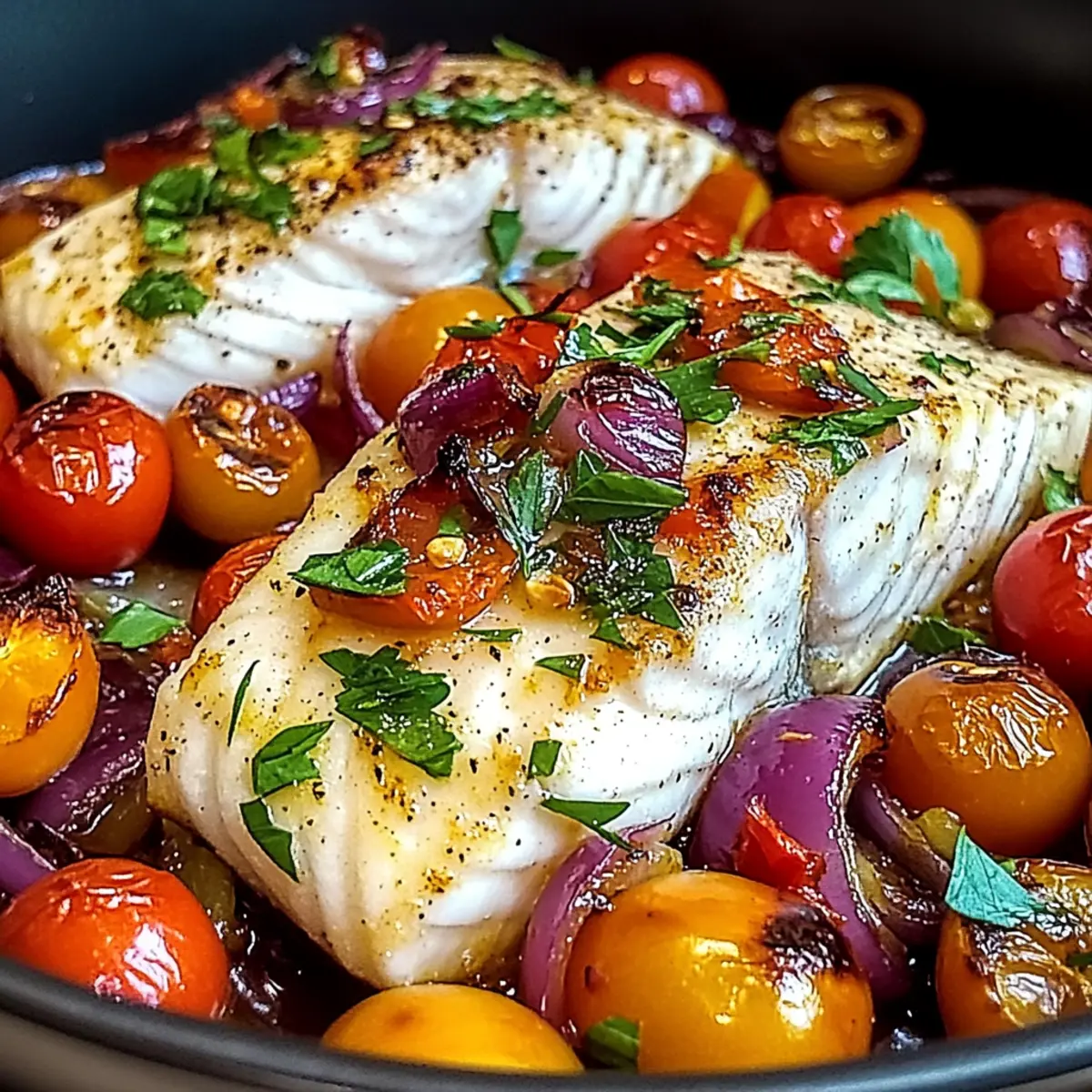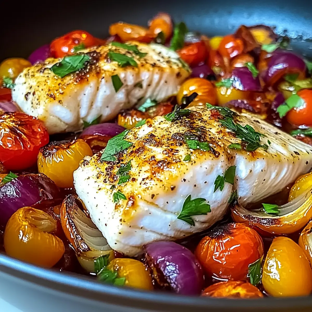 Jump to Recipe Print RecipeAs the golden hour casts a warm glow over my kitchen, the aroma of herbs and citrus fills the air, hinting at the exciting meal to come. Enter my Mediterranean Baked Fish recipe, a vibrant dish that transforms simple ingredients into a delightful celebration of flavor. This healthy, gluten-free recipe not only dazzles with its quick 30-minute prep time, but also effortlessly caters to busy weeknights and gatherings alike. Picture perfectly flaky white fish resting upon a colorful canvas of roasted vegetables, all kissed by lemon and fragrant herbs. The best part? You can swap in your favorite white fish—cod, halibut, or tilapia—making it incredibly versatile. So, what do you say, will you join me on this culinary journey to the sun-soaked shores of the Mediterranean? Why is Mediterranean Baked Fish a must-try? Healthy, Delicious Meal: This dish showcases the beautiful balance of flavors and nutrients found in Mediterranean cuisine, making it not only scrumptious but good for you. Quick Preparation: With just 30 minutes from start to finish, this recipe is perfect for anyone looking to whip up a hearty meal during a busy weeknight. Versatile Fish Options: Feel free to experiment with different types of white fish such as cod, halibut, or tilapia—tailor it to your taste and whatever is available. Family-Friendly: Kids and adults alike will love this effortless meal, turning dinner time into a flavorful family feast. Pair it with complementary sides like herbed quinoa or roasted potatoes for a complete experience. Aromatic Vegetables: Roasted bell peppers, cherry tomatoes, and a hint of garlic bring vibrant colors and tastes that enhance the flaky fish. Don’t forget to check out our recipe for Cheesy Baked Ziti or our Mediterranean Chicken Pasta Salad for more family-friendly meal ideas! Mediterranean Baked Fish Ingredients For the Fish • White Fish (cod, halibut, or tilapia) – The star of the dish; you can substitute with snapper or sole for an exciting twist. • Lemon Juice and Zest – Brightens the fish; swap with lime for a different citrus flair. For the Vegetables • Onions – Adds sweetness and depth; opt for red or yellow depending on your taste. • Bell Peppers – Provides color and crunch; zucchini can be used for a low-carb alternative. • Cherry Tomatoes – Brings acidity and bright flavor; substitute with diced regular tomatoes if needed. • Minced Garlic – Enhances the dish’s aroma; fresh garlic works best but garlic powder is a handy alternative. For the Flavor • Olive Oil – Adds rich flavor and is essential for roasting; feel free to switch to avocado oil if that’s what you have. • Dried Oregano and Paprika – Elevate the dish’s depth; fresh herbs can bring an even brighter taste. • Salt and Pepper – Essential seasonings; adjust according to your dietary needs. Extras for Depth of Flavor • Olives (optional) – Introduces brininess; any variety can work or omit for milder flavors. • Capers (optional) – Adds a tangy note; pickles can be a fun substitute if you’re in a pinch. • Fresh Parsley – Garnish this delightful dish for an extra touch of freshness; consider basil or cilantro for a unique twist. Enjoy crafting this Mediterranean Baked Fish that promises both nutrition and satisfaction for every family member! Step‑by‑Step Instructions for Mediterranean Baked Fish Step 1: Preheat the Oven Begin your culinary adventure by preheating your oven to a lively 400°F (200°C). This warm-up will create the perfect environment to roast your vibrant vegetables and flaky fish. As the oven heats up, it’s the ideal time to gather your ingredients and grease your baking dish to ensure nothing sticks while cooking. Step 2: Prepare the Baking Dish Lightly coat the bottom of your chosen baking dish with a drizzle of olive oil, ensuring a smooth layer for the Mediterranean Baked Fish. This step is crucial to prevent sticking and to infuse some delicious flavor into the dish. Set it aside and prepare to layer in your colorful vegetables! Step 3: Combine the Vegetables In a large mixing bowl, combine the sliced onions, bell peppers, cherry tomatoes, and minced garlic. If you want to add depth of flavor, toss in olives and capers. Drizzle everything generously with olive oil, then sprinkle with dried oregano, paprika, salt, and pepper. Mix well to coat all the veggies evenly with these aromatic ingredients. Step 4: Spread the Vegetables Carefully pour the seasoned vegetable mixture into the greased baking dish, spreading it out evenly across the bottom. Visualize a colorful bed for your fish—these vibrant vegetables will not only enhance flavor but also bring a delightful crunch to your Mediterranean Baked Fish. Step 5: Add the Fish Place the fish fillets on top of the arranged vegetables, ensuring the skin side faces down if applicable. Make sure the fish sits snugly on the veggie layer, as this will allow the flavors to mingle beautifully during baking. Your Mediterranean Baked Fish is shaping up to be a true delight! Step 6: Season the Fish Next, squeeze fresh lemon juice over the fish fillets, allowing the zesty flavor to soak in. Sprinkle lemon zest on top and adjust the seasoning as needed with salt and pepper. This step enhances the dish’s brightness and balances out the flavors perfectly in your Mediterranean Baked Fish. Step 7: Bake Together Slide the baking dish into the preheated oven and allow everything to bake uncovered for about 20-25 minutes. Keep an eye out for when the fish becomes opaque and flakes easily with a fork, while the vegetables soften and develop caramelized edges, signaling your delicious meal is almost ready. Step 8: Garnish and Serve Once your Mediterranean Baked Fish is perfectly cooked, remove it from the oven and let it sit for a few moments. Garnish with freshly chopped parsley for a touch of greenery and add lemon wedges on the side. Now, it’s time to serve up this v