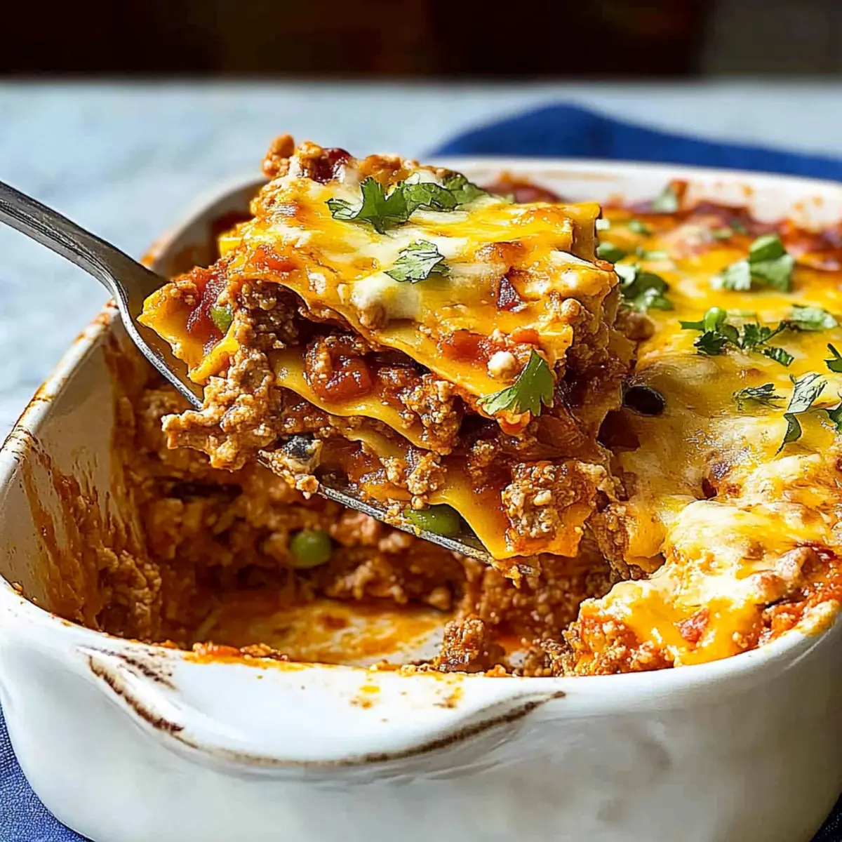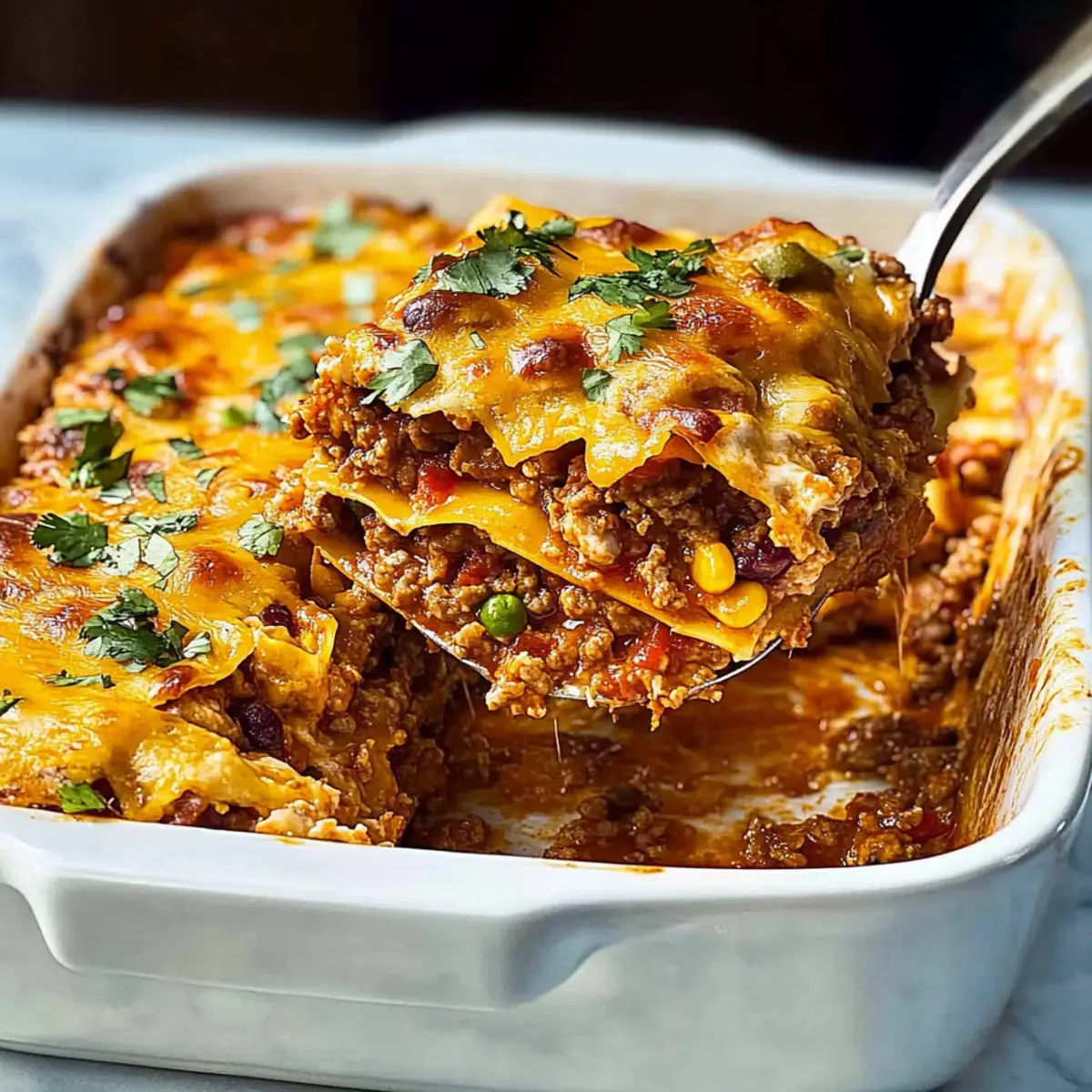Jump to Recipe Print RecipeThe aroma of sizzling onions and spices wafts through my kitchen, bringing back cherished family memories of laughter and hearty meals. This Mexican Lasagna Recipe transforms traditional flavors into a cozy casserole that tantalizes the taste buds with each bite. Layered with soft corn tortillas, seasoned ground beef, creamy refried beans, and melted cheese, it’s not only a delightful comfort food but also a time-saver for busy weeknights. Imagine assembling this feast in just a fraction of the time it takes to order takeout or the best part? You can easily make it ahead—perfect for those moments when everyone gathers for a meal. Ready to dive into a dish that promises warmth and satisfaction? Let’s get cooking! Why is This Mexican Lasagna a Must-Try? Comfort in Every Bite: This Mexican Lasagna combines classic flavors that will transport you straight to a family fiesta. Effortless Preparation: With simple steps, you can whip up this dish quickly, making it an ideal choice for busy weeknights! Versatile Ingredients: Customize it with your favorite proteins or even go vegetarian; it’s a canvas for your culinary creativity. Crowd-Pleasing Appeal: Perfect for gatherings, the layered goodness is sure to delight both kids and adults alike. Make-Ahead Friendly: Assemble it the night before and simply pop it in the oven for an effortless dinner; you won’t regret it! Pair this with a refreshing side like Sparkling Raspberry Lemonade for a complete meal that everyone will love! Mexican Lasagna Ingredients • Ready to gather what you need for a fantastic Mexican Lasagna? For the Casserole Neutral Oil – Use for cooking onions and peppers; olive oil works great too! Large White or Yellow Onion – Adds sweetness and depth; shallots are a milder alternative. Medium Red Bell Pepper – Brings sweetness and crunch; green bell peppers can work, but they are less sweet. Lean Ground Beef – The protein base for your dish; feel free to swap for ground turkey or chicken for a lighter option. Tomato Paste – For rich flavor and color; can substitute with fresh tomatoes if preferred. Taco Seasoning – Boosts flavor wonderfully; a blend of chili powder, cumin, and garlic powder can be used as substitutes. Frozen Corn Kernels – Adds sweetness and texture; canned corn is a perfectly acceptable substitute. Diced Green Chiles – Provides mild heat and depth of flavor; fresh jalapeños can be used for more spice. Red Enchilada Sauce – Adds moisture and flavor; feel free to try green enchilada sauce for a different taste. Kosher Salt – Enhances flavor; regular salt is fine too, just adjust to taste. For the Cheesy Layers Monterey Jack Cheese – Melts wonderfully for creaminess; substitute with Cheddar if you desire. Mild Cheddar Cheese – Adds vibrant flavor and color; you can use more Monterey Jack or a cheese blend if you prefer. For Assembling Corn Tortillas – Forms the base layers instead of pasta; flour tortillas are an option but will alter the texture. Refried Beans – Offers creaminess and protein; black beans can take their place if you’d like. For Topping and Garnish Chopped Fresh Cilantro – Adds a burst of freshness for garnish; parsley can work as a different herb option. Pico de Gallo, Sour Cream, Diced Avocado – Optional toppings that enhance flavor and add a fresh touch. Gather these ingredients and prepare to enjoy a comforting meal that embodies the spirit of family gatherings—all right from your kitchen! Step‑by‑Step Instructions for Mexican Lasagna Recipe Step 1: Preheat the Oven Begin by preheating your oven to 350ºF (175ºC). This temperature ensures that your Mexican Lasagna bakes evenly, allowing the cheese to melt beautifully and the flavors to blend perfectly. As it heats, take a moment to gather your ingredients and equipment, making the cooking process smoother and more enjoyable. Step 2: Sauté the Vegetables In a large skillet, heat 2 tablespoons of neutral oil over medium heat. Once shimmering, add a chopped large onion and a medium red bell pepper. Sauté these for about 4 minutes, or until the onion turns translucent and fragrant. This step adds depth and flavor to your Mexican Lasagna before introducing the meat. Step 3: Cook the Ground Beef Add 1 pound of lean ground beef to the skillet, breaking it apart with a spatula. Cook for 6-8 minutes, stirring occasionally, until the beef is browned and fully cooked. The meat should be crumbly and no longer pink. This savory layer plays a crucial role in the heartiness of your Mexican Lasagna. Step 4: Incorporate the Flavors Stir in 2 tablespoons of tomato paste and 1 tablespoon of taco seasoning, cooking for another 2 minutes until the mixture is fragrant. This enriches the beef with a warm Tex-Mex flavor profile. Take a moment to relish the delicious aromas wafting up, as this is the heart of your Mexican Lasagna. Step 5: Mix in Corn and Chiles Add 1 cup of frozen corn and 1 can of diced green chiles into the skillet, mixing until combined. Remove the skillet from heat once everything is evenly mixed. The corn adds sweetness and texture, enhancing the overall appeal of your Mexican Lasagna. Step 6: Combine with Enchilada Sauce Reserve 1 cup of red enchilada sauce, then mix the remainder into the skillet with the beef mixture. Season with kosher salt to taste, adjusting as necessary. This combination is essential for creating the layered structure and flavor in your Mexican Lasagna while keeping it moist. Step 7: Layer the Casserole In a baking dish, start layering by spreading ½ cup of reserved enchilada sauce on the bottom. Place 6 corn tortillas evenly over the sauce, followed by half of the refried beans, half of the beef mixture, and then sprinkle with 1/3 of the Monterey Jack and mild cheddar cheeses. Repeat these layers to create a hearty texture. Step 8: Final Layer and Bake Top with the remaining tortillas, enchilada sauce, and cheese mixture. Cover the baking dis