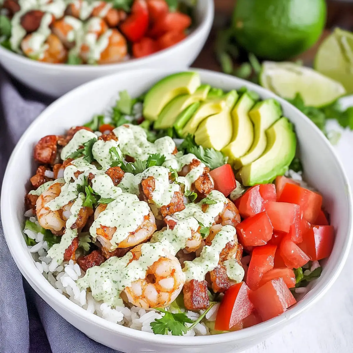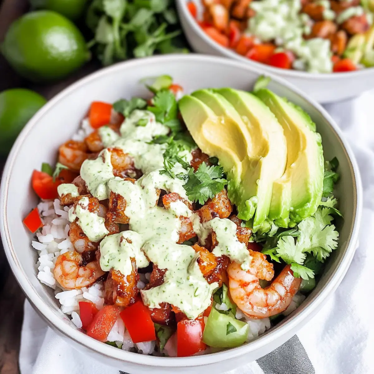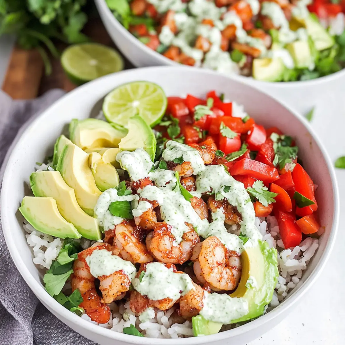 Jump to Recipe Print RecipeAs I prepped the colorful ingredients for my Quick Mexican Rice Bowls with Garlic Shrimp, the bright aroma of sizzling garlic wafted through my kitchen, instantly whisking me away to sunlit summer days. Combining perfectly tender shrimp with creamy avocado, hearty pinto beans, and a zesty cilantro lime dressing, this dish not only delights but also brings a burst of fresh flavors to your table. Perfect for those evenings when you crave something satisfying yet light, these rice bowls come together in just 30 minutes, making them an ideal choice for busy days. Plus, they’re versatile enough to fit various diets with simple swaps! Are you ready to create a delightful summer-inspired meal that your family will love? Let’s get cooking! Why Are Mexican Rice Bowls with Shrimp Special? Quick and Easy: In just 30 minutes, you can whip up these mouthwatering bowls, perfect for busy weeknights. Bursting with Flavor: The sautéed garlic shrimp combined with zesty cilantro lime dressing brings a deliciously fresh taste that’s hard to resist. Colorful and Nutritious: Packed with vibrant veggies like bell peppers and creamy avocado, each bite is a feast for the eyes and the palate. Versatile Enjoyment: Enjoy them as is, or substitute shrimp for chicken, tofu, or even black beans for a satisfying meal anyone can enjoy. Light yet Filling: This dish makes for a light summer meal that won’t leave you feeling heavy, yet is still hearty enough to satisfy your cravings. Whether you’re pairing it with tortilla chips and salsa or serving it with a side salad, these bowls are sure to impress your family and friends! Mexican Rice Bowls with Shrimp Ingredients For the Shrimp • Shrimp – Use fresh or thawed frozen shrimp for the best texture; avoid pre-cooked to prevent rubberiness. • Garlic – Fresh garlic brings an aromatic flavor; use powdered as a last resort. • Cumin – Adds warmth; can be substituted with coriander for a different flavor profile. • Chili Powder – Adjust according to your heat preference for the perfect kick. • Adobo Seasoning – Enhances overall flavor; taco seasoning can be a substitute if needed. • Kosher Salt & Pepper – Essential for balancing flavors; adjust to taste. For the Rice and Beans • Rice – Long-grain white is typical, but feel free to swap for brown rice, quinoa, or gluten-free grains. • Water – Necessary for cooking the rice; no substitutions needed. • Pinto Beans – A great source of protein and fiber; substitute with black beans or other canned options if preferred. For the Fresh Veggies • Bell Pepper – Adds crunch and color; any variety can be used to match your taste. • Avocado – Creamy texture and healthy fats; choose ripe ones for the best experience. • Lettuce (or Greens) – Use any leafy green for a fresh texture contrast. For the Dressing • Sour Cream – Base for the dressing; Greek yogurt is a great substitute for added tanginess. • Cilantro – The key herb for bright flavor; use parsley in a pinch. • Limes – Fresh limes add acidity and brightness; bottled juice can work if you’re in a hurry. • Honey (or Sweetener) – A touch of sweetness balances the dressing; agave syrup makes a suitable alternative. Step‑by‑Step Instructions for Mexican Rice Bowls with Shrimp Step 1: Cook the Rice Begin by preparing 1 cup of long-grain white rice according to the package instructions, typically using 2 cups of water. Bring the water to a boil in a medium saucepan, then reduce to a simmer, cover, and cook for about 15-20 minutes until the rice is fluffy and the water is absorbed. This will provide a delicious base for your Mexican Rice Bowls with Shrimp. Step 2: Heat the Beans While the rice is cooking, take a small saucepan and add one can of pinto beans. Heat over medium-low heat for about 5-7 minutes, stirring occasionally, until the beans are warmed through. This will add a nourishing element to your rice bowls, offering both protein and fiber. Step 3: Prep the Vegetables Next, wash and dice one bell pepper into small pieces for crunch and color. Slice 1-2 ripe avocados and chop 1-2 cups of lettuce or your favorite greens. Arrange all the fresh veggies on a cutting board, ready to elevate your Mexican Rice Bowls with Shrimp with vibrant flavors and textures. Step 4: Sauté Garlic & Shrimp In a large skillet, heat 2 tablespoons of olive oil over medium heat. Add 2 minced garlic cloves and sauté for 1-2 minutes until fragrant, being careful not to burn the garlic. Then, add 1 pound of peeled and deveined shrimp along with cumin, chili powder, adobo seasoning, salt, and pepper. Cook for 4-6 minutes until the shrimp are pink and opaque, stirring occasionally for even cooking. Step 5: Make the Dressing In a food processor, combine ½ cup of sour cream, ¼ cup of fresh cilantro, the juice of 1 lime, 1 tablespoon of honey, and a garlic clove. Blend until smooth, which should only take about 30 seconds. This dressing will enhance the flavors in your Mexican Rice Bowls with Shrimp, bringing creamy and zesty notes to each bite. Step 6: Assemble the Bowls Once everything is prepared, it’s time to assemble your bowls! In serving bowls, layer the cooked rice as the base, followed by the warmed pinto beans, sautéed shrimp, and fresh veggies. Drizzle generously with the cilantro lime dressing and finish with a squeeze of fresh lime juice. Optionally, sprinkle with queso fresco for an added creamy touch. Mexican Rice Bowls with Shrimp Variations Customize your Mexican Rice Bowls to suit your taste and dietary needs; there are so many exciting possibilities! Protein Swap: Replace shrimp with chicken, beef, or tofu for a hearty alternative. Each protein brings its unique flavor that can transform the dish. Grain Options: Use brown rice, quinoa, or cauliflower rice as a gluten-free base. This swap adds additional nutrients while keeping the meal satisfying. Extra Crunch: Toss in some tortilla str