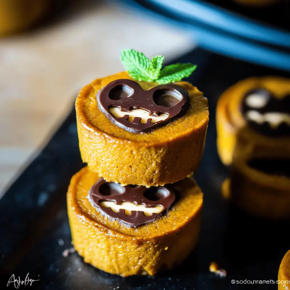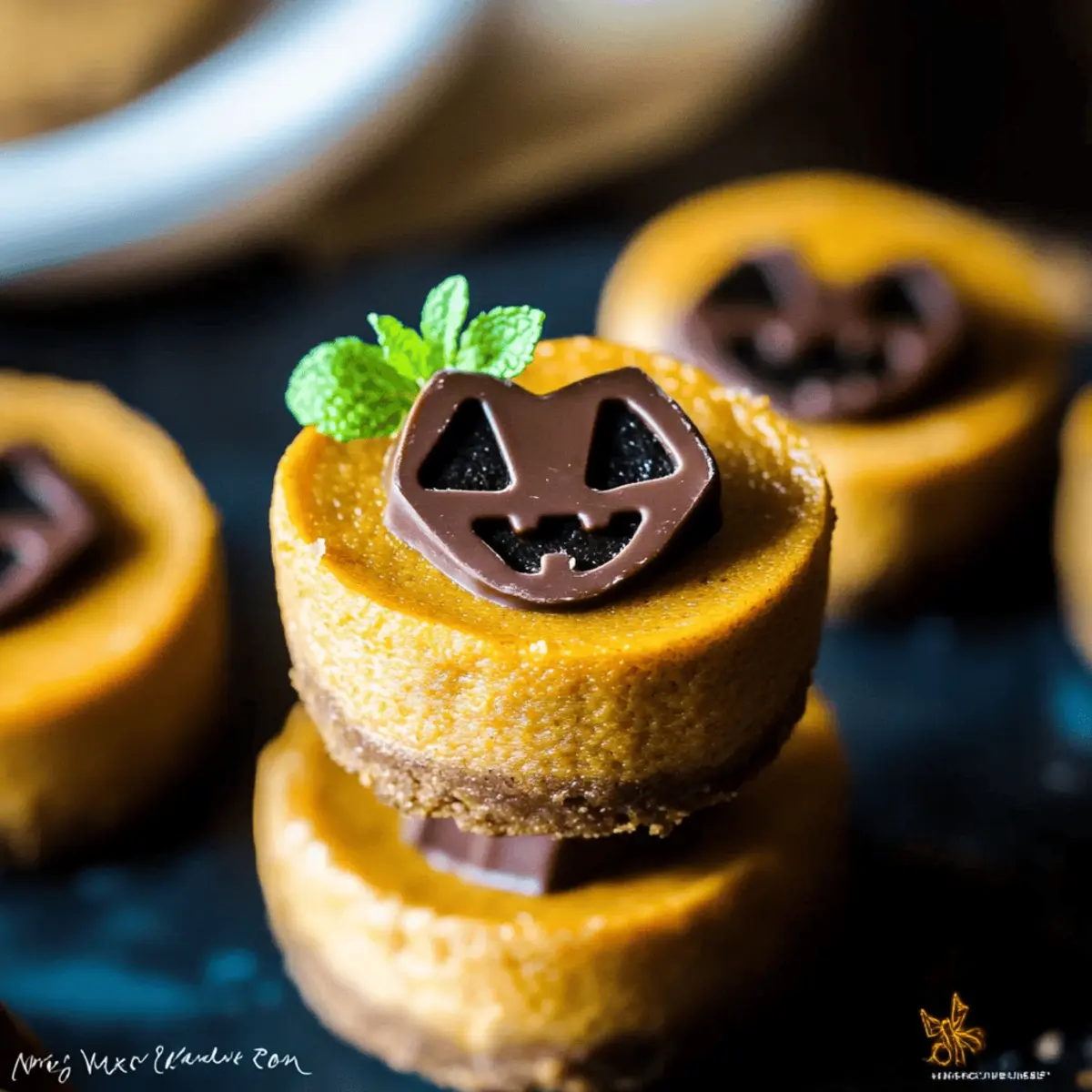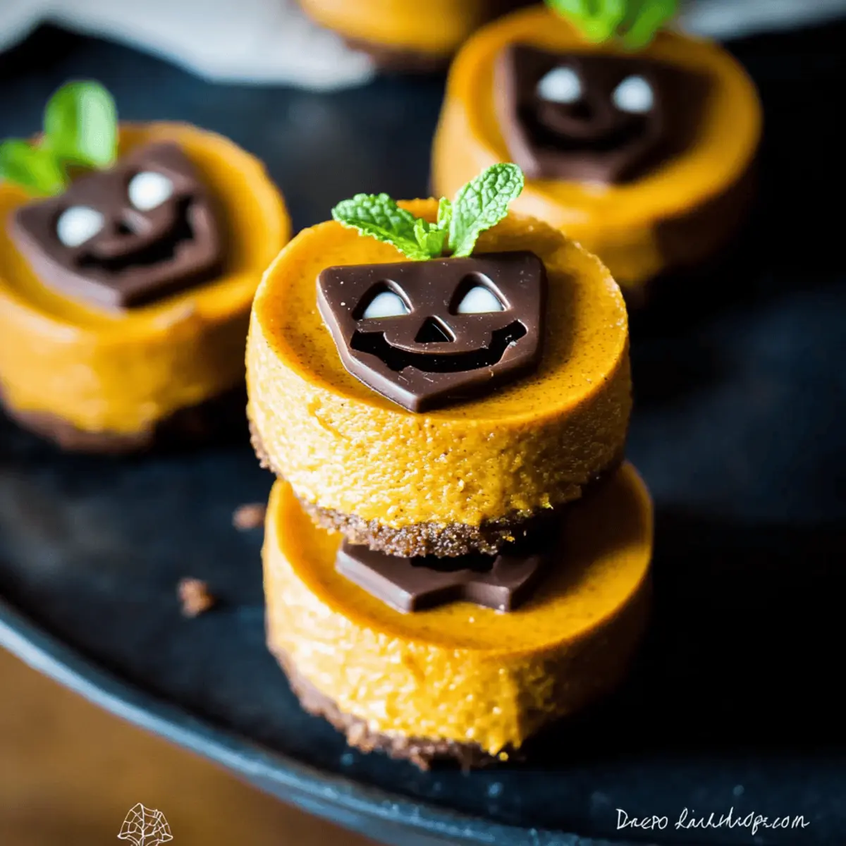 Jump to Recipe Print RecipeAs I walked through the vibrant fall market, the air was filled with warm spices and the inviting scent of roasted pumpkin. It struck me how the arrival of Halloween brings not just spooky decorations but also delectable treats that capture the season’s essence. Enter the Mini Pumpkin Cheesecake Jack-O’-Lanterns! These adorable, creamy delights are not only vegan and gluten-free but also delightfully easy to make—the perfect dessert for gatherings that promise to impress both kids and adults. With their charming jack-o’-lantern faces and rich pumpkin flavor, they offer all the festive fun without the guilt. Curious about how to create these treat-sized wonders? Let’s dive in! Why make Mini Pumpkin Cheesecake Jack-O’-Lanterns? Irresistible Presentation: These Mini Pumpkin Cheesecake Jack-O’-Lanterns are as cute as they are delicious, making them an eye-catching dessert for any Halloween gathering. Guilt-Free Indulgence: They’re vegan, plant-based, and gluten-free, providing a deliciously rich flavor without the guilt—perfect for health-conscious dessert lovers! Easy to Prepare: With simple steps, even novice bakers can whip up these treats. If you’re looking for more delightful cheesecakes, check out our Bake Cheesecake Discover and Bake Oreo Cheesecake recipes! Festive Flavor: The pumpkin spice mixed with a creamy cashew base creates an autumnal flavor that is hard to resist, encapsulating the spirit of the season. Perfect for Sharing: Whether for a party or a family night, these mini cheesecakes are just the right size for sharing, bringing joy to both kids and adults alike! Mini Pumpkin Cheesecake Jack-O’-Lanterns Ingredients Get ready to create these delightful, plant-based wonders! For the Cheesecake Flax Meal – Acts as an egg substitute, so if you’re out, ground chia seeds work well too. Warm Water – It helps to activate the flax meal and create that perfect gel-like consistency. Roasted Cashews – Provide a creamy base; substitute soaked almonds if you’re avoiding nuts. Pumpkin Purée – Adds delightful flavor and moisture—sweet potato purée is a great alternative if desired. Coconut Sugar – A natural sweetener; brown sugar can replace it for a similar taste. Unsweetened Vanilla Almond Milk – Adds flavor and liquid, but feel free to swap with any other plant-based milk. Maple Syrup – Sweetens your cheesecake naturally; agave syrup can be used as a substitute for additional sweetness. Coconut Oil – Helps keep the cheesecake rich; you can reduce fat by using unsweetened applesauce instead. Pumpkin Pie Spice – This delightful blend enhances flavor, but you can mix cinnamon and nutmeg if you don’t have it on hand. Salt – Just a pinch boosts all the flavors beautifully. For the Crust Coconut Flour – Keeps it gluten-free; swap with almond flour if you prefer. Unsweetened Cocoa Powder – Adds a delicious depth to the crust—omit it for a non-chocolate variation. For the Decoration Dark Chocolate – Used for creating the Jack-O’-Lantern faces; opt for vegan chocolate to keep the recipe plant-based. Mint Sprigs – A cute decorative touch that doubles as a stem, or get creative with edible basil leaves! These Mini Pumpkin Cheesecake Jack-O’-Lanterns are sure to be a hit this Halloween—let’s gather our ingredients and embark on this culinary adventure! Step‑by‑Step Instructions for Mini Pumpkin Cheesecake Jack-O’-Lanterns Step 1: Prepare Flax Mixture Start by whisking together 2 tablespoons of flax meal with 6 tablespoons of warm water in a small bowl. Allow this mixture to sit for about 10 minutes in the refrigerator until it thickens into a gel-like consistency. This flax mixture will act as the binding agent for your Mini Pumpkin Cheesecake Jack-O’-Lanterns. Step 2: Make Cheesecake Base In a high-speed blender, combine 1 cup of pre-soaked roasted cashews, 1 cup of pumpkin purée, ½ cup of unsweetened vanilla almond milk, ⅓ cup of coconut sugar, ¼ cup of maple syrup, and a pinch of salt. Blend until the mixture is completely smooth and creamy, which should take around 2-3 minutes. This delightful base captures the essence of the pumpkin flavor for your cheesecakes. Step 3: Prepare Crust In a medium-sized mixing bowl, beat together ¼ cup of melted coconut oil and ¼ cup of maple syrup until well combined. Gradually mix in 1 cup of coconut flour and 3 tablespoons of unsweetened cocoa powder, stirring until a smooth dough forms. This will create a delicious crust for your Mini Pumpkin Cheesecake Jack-O’-Lanterns. Step 4: Bake Crust Preheat your oven to 350°F (175°C). Press the crust mixture into the bottom of a mini cheesecake pan, ensuring it’s even and well-packed. Bake the crust in the preheated oven for about 5 minutes or until it starts to firm up slightly. Keep an eye on it to avoid over-baking; it should retain some moisture. Step 5: Combine and Bake Cheesecake After baking the crust, remove it from the oven and gently fold the gel-like flax mixture into the prepared cashew blend. Pour this cheesecake filling over the baked crust, spreading it evenly. Return the pan to the oven and bake for an additional 11-12 minutes until the filling is set yet still slightly jiggly in the center to maintain creaminess. Step 6: Cool and Chill Remove the pan from the oven and let the Mini Pumpkin Cheesecake Jack-O’-Lanterns cool completely at room temperature. Once cooled, refrigerate them for at least 6 hours, or overnight if possible, until they firm up and are ready for decoration. This chilling step is crucial for setting the texture perfectly. Step 7: Decorate Melt ¼ cup of dark chocolate with 1 teaspoon of coconut oil either in the microwave or over a double boiler until smooth. Carefully drizzle the melted chocolate over the chilled cheesecakes to create your Jack-O’-Lantern faces. Finish with a decorative mint sprig atop each cheesecake for a charming touch that resembles a stem, ma