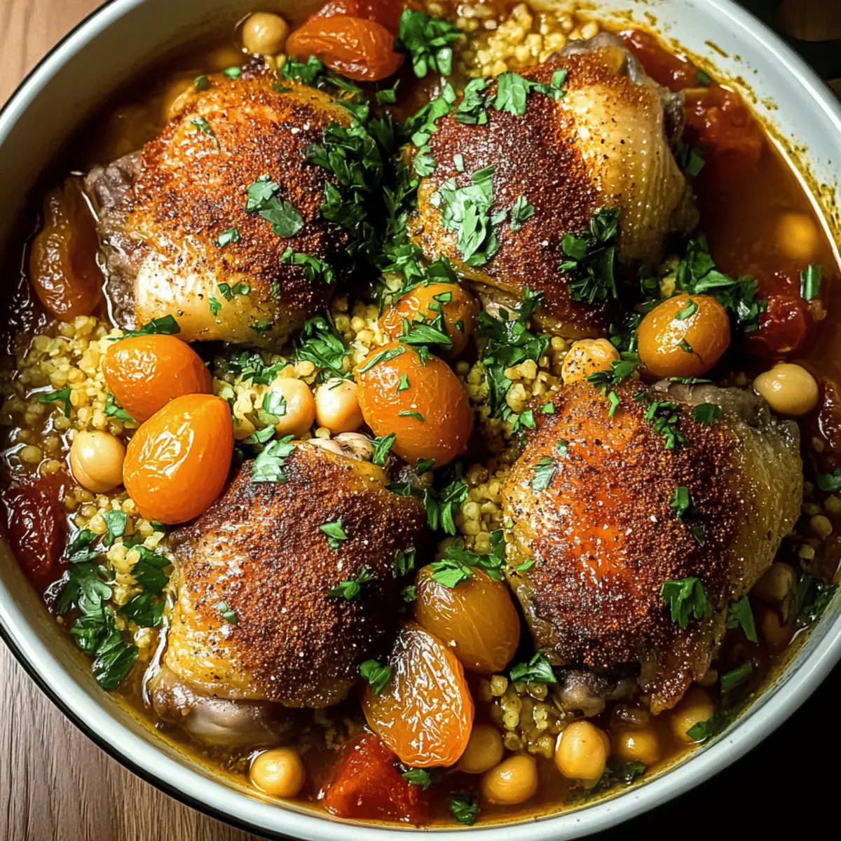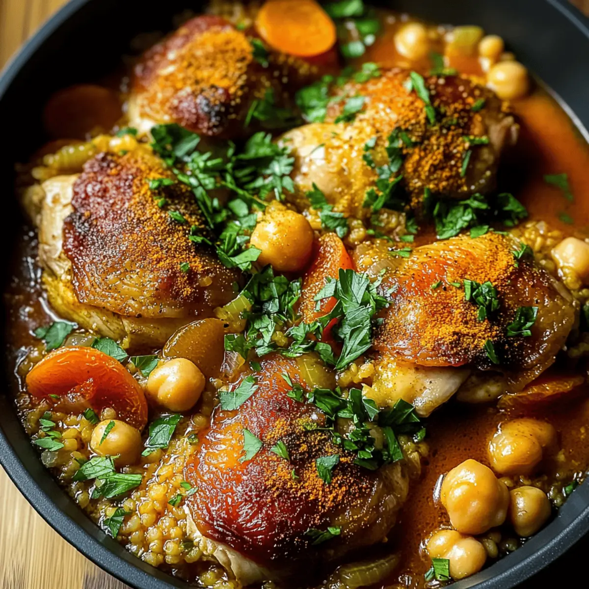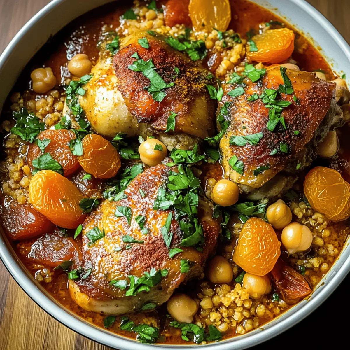 Jump to Recipe Print RecipeAs I opened the fridge, the remnants of our last fast-food dinner stared back at me, and I felt the urge to escape to a faraway culinary land. That’s when I decided to whip up a Moroccan Chicken Stew that would transport my taste buds straight to the bustling markets of Marrakech. This chicken recipe is not only a comforting blend of tender chicken thighs and a symphony of Mediterranean flavors but also a quick dinner solution that you can easily make in advance and freeze for hectic weeknights. You’ll love how the sweetness of dried apricots mingles with the warmth of spices, creating a stew that wraps you in a cozy embrace with each bite. Ready to dive into a world of aromas and tastes? Let’s get cooking! Why is Moroccan Chicken Stew a Must-Try? Comforting Warmth: This wonderful stew embodies the essence of home-cooked comfort food, perfect for chilly evenings. Vibrant Flavors: Infused with traditional spices, each bite is a delightful dance of Mediterranean aromas that elevate the ordinary. Easy Prep: With straightforward steps, it’s perfect for both novice and seasoned cooks looking to create a hearty dish. Make Ahead: You can freeze leftovers or prepare in advance, making meal prep a breeze for busy weeks ahead! Crowd-Pleasing: Ideal for family meals or gatherings, it’s a recipe sure to impress – much like our delicious Cheesy Chicken Enchiladas and Chicken Bacon Ranch, which are also family favorites. Nutritional Benefits: Packed with protein and flavors, this stew not only satisfies cravings but also nurtures your body! Moroccan Chicken Stew Ingredients • Discover the key elements to create this flavorful delight! For the Stew Base Chicken Thighs (2 lbs) – A juicy main protein; try chicken breasts for a leaner option, but they might dry out. Olive Oil (2 tablespoons) – Use extra virgin for richer flavor when sautéing. Onion (1 large, finely chopped) – Forms the aromatic base; make sure to sauté until translucent for sweetness. Garlic (3 cloves, minced) – Essential for depth; don’t skip this aromatic flavor booster. For the Spices Ground Cumin (1 teaspoon) – Adds a warm, earthy note that’s vital in Moroccan cooking. Ground Coriander (1 teaspoon) – Brightens flavors with its citrus undertones. Ground Ginger (1/2 teaspoon) – Provides warmth; fresh ginger can be used for a more vibrant kick. Ground Cinnamon (1/2 teaspoon) – Key to the sweet warmth of the stew; a touch of magic in each bite. Cayenne Pepper (1/4 teaspoon, optional) – Adds heat; leave it out if you prefer a milder flavor. Turmeric (1 teaspoon) – Supplies color and a hint of earthiness; curry powder can stand in as a substitute. For the Stew Ingredients Diced Tomatoes (1 can, 14 oz, undrained) – Creates the liquid base for the stew and contributes acidity. Chicken Broth (2 cups) – Enhances flavor; swap for vegetable broth to make it vegetarian. Chickpeas (1 cup, cooked or 1 can, drained) – A wonderful source of protein and texture; substitute with other beans or veggies as needed. Dried Apricots (1/2 cup, chopped) – Offers sweetness that balances the spiciness of the dish. Green Olives (1/4 cup, pitted and sliced) – Adds a briny complexity to the stew. For Serving Salt and Pepper – Essential for seasoning; adjust to your taste. Fresh Cilantro or Parsley (for garnish) – Brightens the dish with freshness. Cooked Couscous or Rice (for serving) – Perfect for absorbing the delectable stew flavors; you won’t regret this addition! This Moroccan Chicken Stew is created with love and deliciousness in mind, sure to nurture your soul—get ready to taste the magic! Step‑by‑Step Instructions for Moroccan Chicken Stew Step 1: Sauté the Aromatics In a large pot, heat 2 tablespoons of extra virgin olive oil over medium heat. Once hot, add 1 large finely chopped onion and sauté for about 5 minutes until it becomes translucent and soft. Stir in 3 minced garlic cloves, cooking for an additional 1-2 minutes until fragrant, allowing the warm aromas to fill your kitchen as you prepare for this Moroccan Chicken Stew. Step 2: Add the Spices Next, sprinkle in 1 teaspoon each of ground cumin and ground coriander, along with 1/2 teaspoon of ground ginger, 1/2 teaspoon of ground cinnamon, and 1 teaspoon of turmeric. If you enjoy a bit of heat, add 1/4 teaspoon of cayenne pepper. Stir the spices into the onion and garlic mixture for 1-2 minutes until the spices become aromatic, creating a deeply flavorful base for the stew. Step 3: Brown the Chicken Increase the heat to medium-high and season 2 pounds of chicken thighs with salt and pepper. Add the chicken thighs to the pot and brown them for about 4-5 minutes on each side, creating a beautiful, golden crust. This step is crucial for locking in the flavors of the Moroccan Chicken Stew as the chicken begins to release its juices into the pot. Step 4: Combine the Stew Ingredients Carefully stir in one 14-ounce can of undrained diced tomatoes along with 2 cups of chicken broth, 1 cup of cooked or drained chickpeas, and 1/2 cup of chopped dried apricots. Bring the mixture to a gentle boil, allowing the delicious ingredients to meld together as the pot bubbles and steams, creating an inviting atmosphere filled with Mediterranean scents. Step 5: Simmer Until Tender Once boiling, reduce the heat to low and cover the pot with a lid. Let the Moroccan Chicken Stew simmer for about 30-40 minutes, or until the chicken is tender and easily pulls apart with a fork. This slow cooking allows the spices to deepen and the chicken to absorb all those wonderful flavors, resulting in a rich and hearty stew. Step 6: Finish with Olives and Seasoning After simmering, stir in 1/4 cup of sliced green olives to add a briny complexity to the stew. Taste and adjust the seasoning with additional salt and pepper as desired. Mix everything thoroughly, ensuring each component is infused with flavor before serving this delightful Moroccan Chic