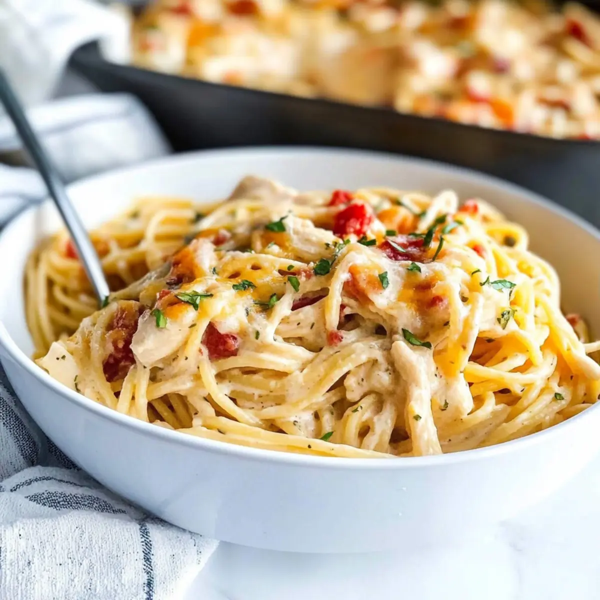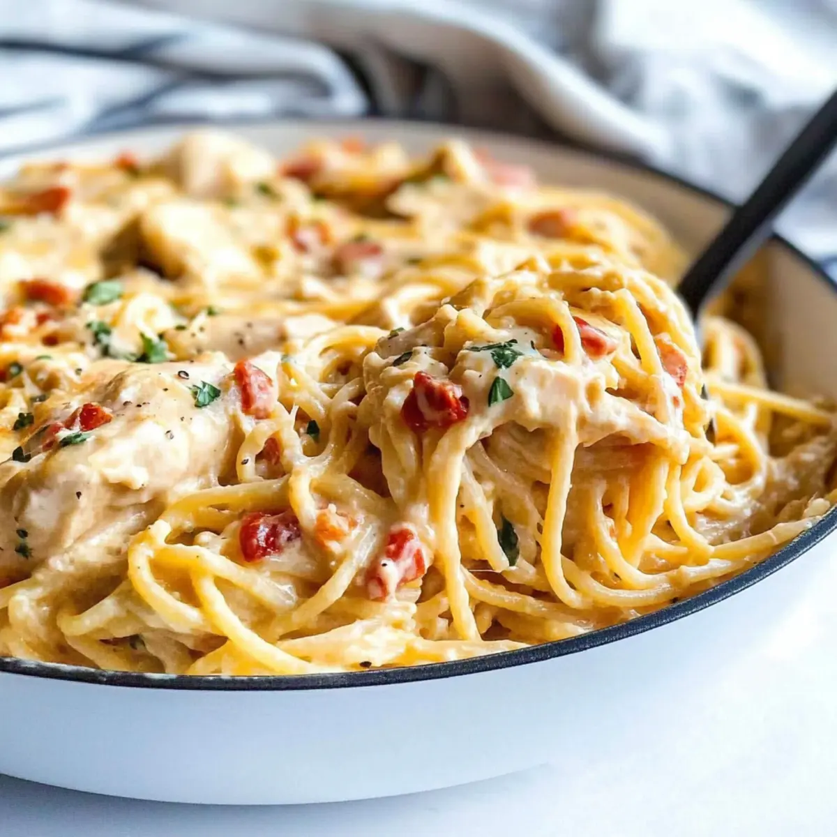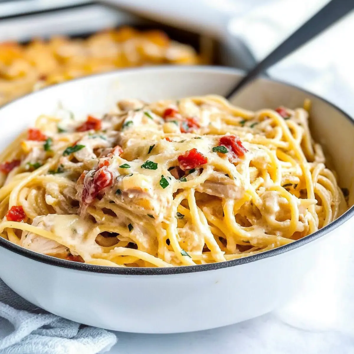 Jump to Recipe Print Recipe“Just imagine standing in your kitchen, the comforting aroma of melting cheese and savory chicken wafting through the air as you prepare a meal that feels like a warm hug. My Creamy One-Pot Chicken Spaghetti is exactly that—a deliciously simple dish that transforms leftover rotisserie chicken into a family favorite without the fuss. This easy recipe not only cuts down on prep time, making it a perfect weeknight savior, but it also yields an abundance of creamy goodness that will have everyone asking for seconds. Whether you’ve had a long day or just want to treat yourself, this one-pot wonder ticks all the boxes. Curious about how to whip up this comfort food classic in no time?” Why is this recipe a must-try? Simplicity at its finest: With just one pot needed, you cut down on dishes while preparing a delightful meal. Utilizes leftovers: Make the most of leftover rotisserie chicken, turning it into a creamy, dreamy pasta dish. Creamy, cheesy goodness: The combination of cheddar and mozzarella creates a rich, satisfying sauce that everyone will adore. Quick weeknight solution: This recipe is perfect for busy evenings, with minimal prep and cook time. Versatile flavors: Feel free to swap in your favorite veggies or cheeses to make it your own—try it with a blend of Italian cheeses for a fantastic twist! Pair it with a side of garlic bread or a fresh salad to complete your meal, adding to its crowd-pleasing appeal! One-Pot Chicken Spaghetti Ingredients For the Pasta • Spaghetti – The key base for this dish; you can swap any pasta shape you have on hand, making it adaptable to your pantry. For the Sauce • Unsalted Butter – This rich ingredient adds depth and flavor; feel free to replace it with olive oil for a lightened version. • Chopped Onion – Offers aromatic depth; shallots can be a milder substitute for a subtle flavor. • Minced Garlic – Enhances overall taste; use garlic powder as a quick fix—1/4 teaspoon substitutes one clove. • All-Purpose Flour – Thickens the creamy sauce; for gluten-free options, use gluten-free flour without compromising taste. • Low-Sodium Chicken Broth – Brings moisture and flavor; vegetable broth is a great alternative for vegetarians. • Dried Parsley, Oregano, Basil – These herbs create an authentic Italian flavor; fresh herbs are even better—just triple their quantity! • Red Pepper Flakes – For a hint of heat; if you prefer a milder dish, just omit them or replace with black pepper. • Salt and Pepper – Essential seasonings; adjust to taste according to the saltiness of your broth. For the Cheesy Goodness • Cheddar Cheese – Adds creamy flavor as the main cheese; try Monterey Jack for a different take. • Mozzarella Cheese – Provides that beloved stretchy texture; switch it out for provolone for a stronger flavor. • Half and Half – Infuses the sauce with creaminess; use heavy cream for a richer sauce or milk for a lighter option. For the Remaining Ingredients • Diced Tomatoes with Green Chiles – These offer tang and moisture; if you’re sensitive to spice, regular diced tomatoes work just fine! • Shredded Leftover Rotisserie Chicken – The star protein of this One-Pot Chicken Spaghetti; any cooked chicken or turkey can work as a substitute. Embrace the joy of home cooking with this delightful collection of ingredients! Step‑by‑Step Instructions for Creamy One-Pot Chicken Spaghetti Step 1: Cook the Spaghetti Begin by boiling a large pot of salted water over high heat. Add the spaghetti and cook according to the package instructions until al dente, typically about 8-10 minutes. Once cooked, drain the spaghetti and set it aside, making sure it retains its shape as it will be folded into the creamy sauce later. Step 2: Sauté the Onion and Garlic While the spaghetti is cooking, take a large skillet and melt 2 tablespoons of unsalted butter over medium-high heat. Once melted, add the chopped onion and minced garlic, sautéing them until the onion becomes translucent, which should take about 2 minutes. This mixture will form the aromatic base for your Creamy One-Pot Chicken Spaghetti. Step 3: Make the Roux Sprinkle in 1/4 cup of all-purpose flour over the sautéed onion and garlic, whisking continuously. Cook the flour for 2-3 minutes until it becomes golden and slightly nutty in aroma. This roux will help thicken the sauce, ensuring a creamy texture for your pasta dish. Step 4: Add Chicken Broth and Seasonings Gradually pour in 3 cups of low-sodium chicken broth while whisking until the mixture is smooth. Increase the heat slightly and allow it to simmer for about 3 minutes or until it thickens. Season the sauce generously with salt, pepper, dried parsley, oregano, basil, and a pinch of red pepper flakes for a hint of spice. Step 5: Incorporate the Cheeses Lower the heat to medium and add in 1/2 cup of shredded cheddar cheese and 1/2 cup of shredded mozzarella cheese. Stir until the cheeses melt and integrate smoothly into the sauce, creating a rich and creamy base for your One-Pot Chicken Spaghetti. Step 6: Combine All Ingredients Carefully fold in the drained spaghetti, 1 cup of half and half, 2 cups of shredded leftover rotisserie chicken, and a can of diced tomatoes with green chiles. Mix everything together until the pasta is well-coated in the creamy sauce, ensuring each strand is enveloped in cheesy goodness. Step 7: Transfer to Baking Dish Preheat your oven to 350°F (175°C). Lightly grease a 9×13-inch casserole dish and pour the creamy chicken spaghetti mixture into it, spreading it evenly. Don’t forget to top it off with the remaining cheddar and mozzarella cheese, allowing them to melt beautifully during baking. Step 8: Bake Until Bubbly Place the casserole dish in the preheated oven and bake for 20-25 minutes. Keep an eye on it; your Creamy One-Pot Chicken Spaghetti is ready when the cheese is melted, bubbly, and lightly golden on top. This baking step