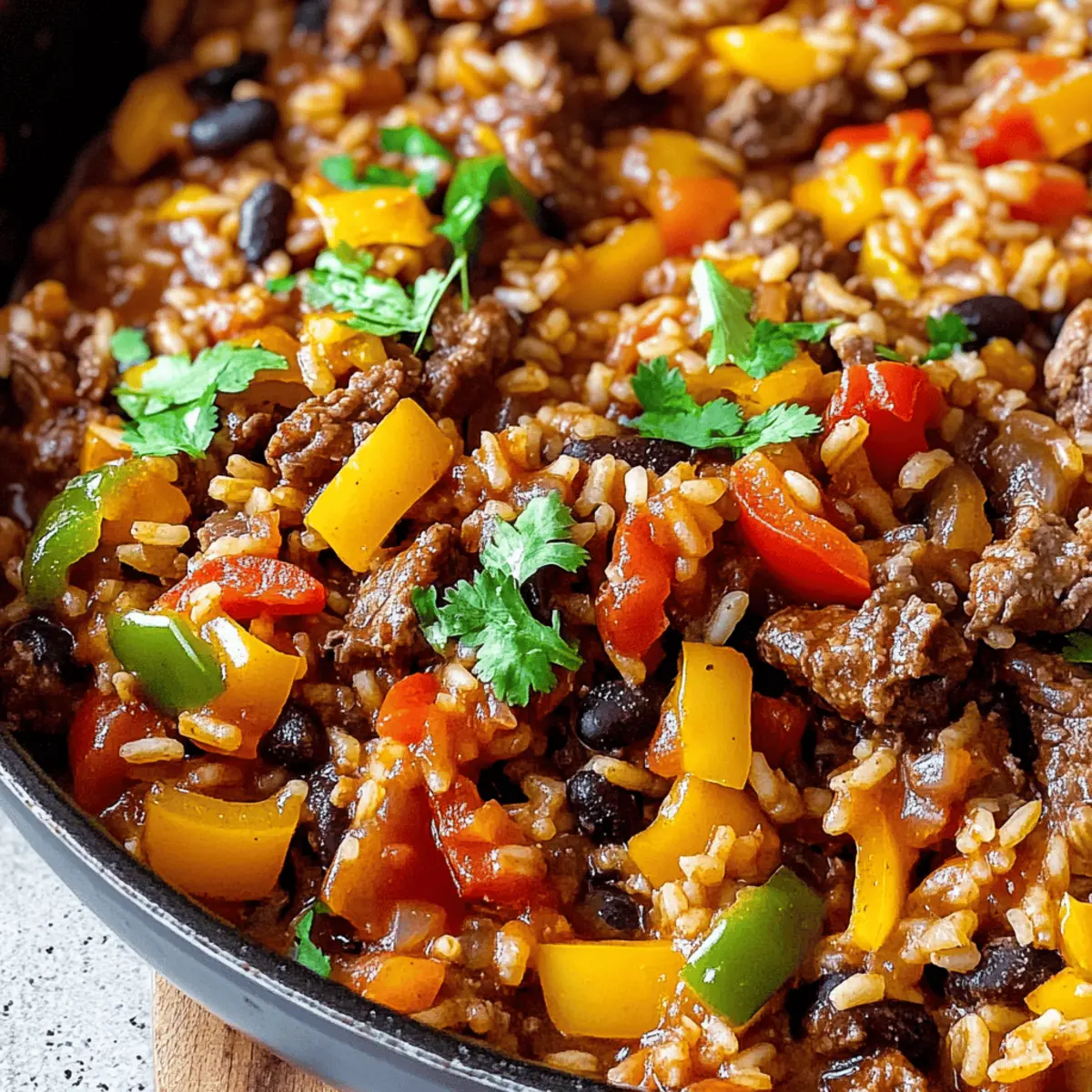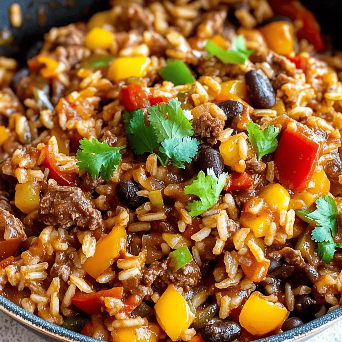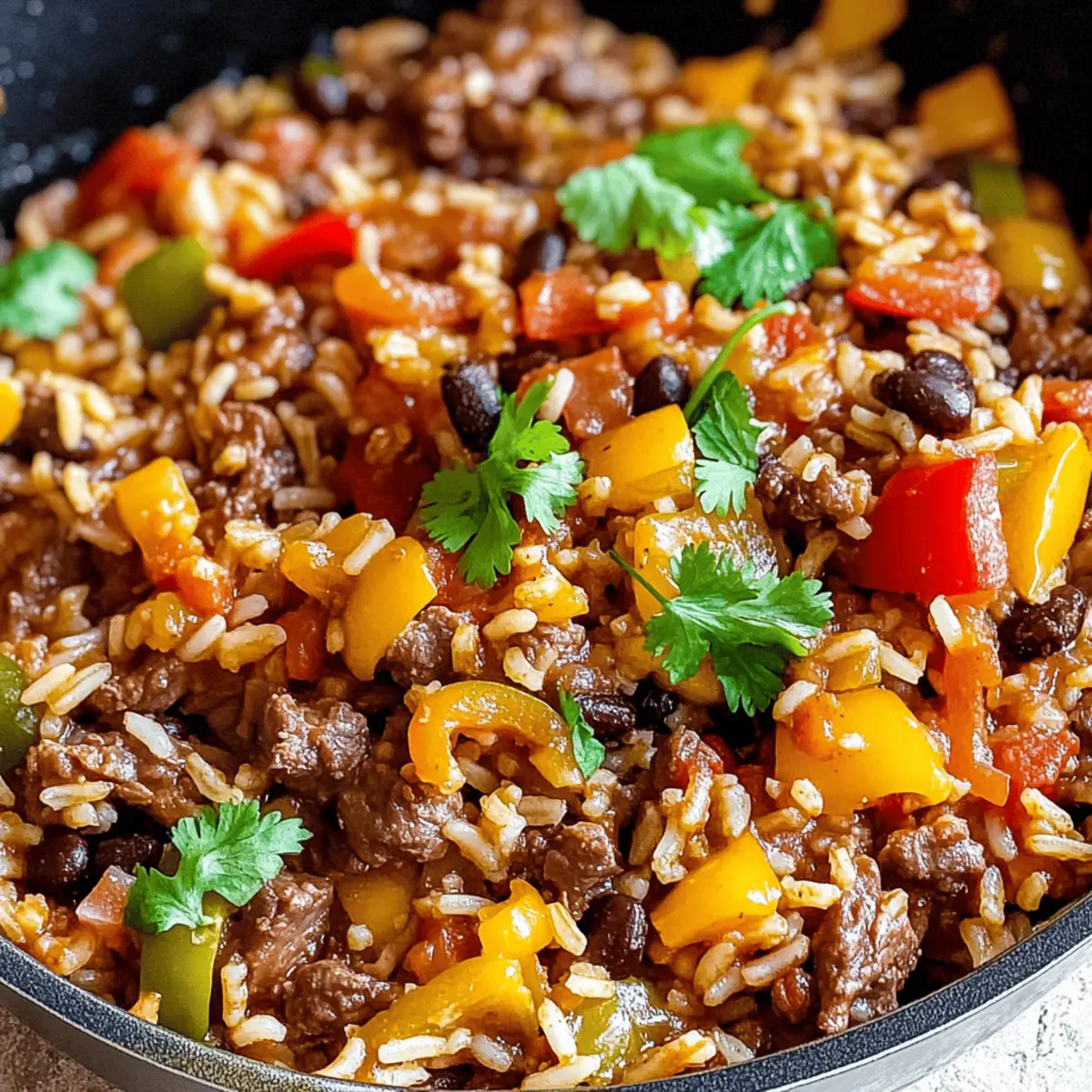 Jump to Recipe Print RecipeAs I stood in my kitchen, a colorful medley of bell peppers danced in the skillet, coaxing magical aromas to fill the air. This is where the charm of my One Pot Mexican Beef and Rice Skillet truly shines. It’s a quick weeknight meal that doesn’t skimp on comfort, packing hearty nourishment into a single dish. With each flavorful bite, you’ll savor tender beef, fluffy rice, and bold spices that transform an ordinary dinner into an extraordinary escape to Mexican cuisine. Plus, it’s gluten-free adaptable, making it family-friendly and easy to customize for every palate. Are you ready to discover your new go-to recipe for hectic evenings? Let’s dive into the deliciousness! Why is this skillet dinner a winner? Simplicity and Flavor: This One Pot Mexican Beef and Rice Skillet brings together a symphony of flavors with minimal effort, allowing you to enjoy a homemade meal even on your busiest nights. Customizable Comfort: With variations for beef, chicken, or vegetarian options, it caters to every dietary preference. Minimal Cleanup: Cooking in one pot means less time scrubbing and more time enjoying your meal, making it perfect for family dinners. Hearty and Nourishing: Packed with protein and veggies, each serving offers a satisfying balance of flavors that feels like a hug on a plate. Quick Prep Time: Ready in about 30 minutes, it’s an ideal choice when you need to whip up a meal in a hurry, like alongside a fresh salad or will pair perfectly with Skillet Breakfast Hash for delightful brunch ideas! One Pot Mexican Beef and Rice Skillet Ingredients Get ready to fill your kitchen with delightful aromas as we gather the essentials for this comforting, gluten-free adaptable dish! For the Skillet Ground Beef – This provides protein and richness; try swapping it with shredded chicken or ground turkey for a lighter touch. Rice – Acts as the base, absorbing all the flavors beautifully; use gluten-free rice if you need a gluten-free option. Bell Peppers – They add vibrant color and sweetness; you can replace them with zucchini or corn for variation. Tomatoes (canned or fresh) – They contribute acidity and moisture; for an extra kick, use diced tomatoes with green chilies. Onion – Adds depth to the flavor; shallots can be used if you prefer a milder taste. Garlic – Enhances aroma and taste; fresh garlic is best, though garlic powder can work in a pinch. Cumin – Brings in earthy warmth; you can substitute it with coriander or chili powder if desired. Chili Powder – Adds a delightful kick; adjust according to your heat preference or swap for paprika for a milder flavor. Salt & Pepper – Essential for enhancing the dish’s flavors; taste as you go to find your perfect balance. With these ingredients, you’ll create a One Pot Mexican Beef Rice Skillet that’s not just a meal, but a warm embrace for your family. Step‑by‑Step Instructions for One Pot Mexican Beef Rice Skillet Step 1: Brown the Beef In a large skillet, heat over medium heat, adding the ground beef. Cook for about 5-7 minutes, breaking it up with a spatula until fully browned and no longer pink. The beef should be nicely caramelized, releasing a savory aroma that fills your kitchen. Drain any excess fat if necessary. Step 2: Sauté the Veggies Add the diced onion and chopped bell peppers to the skillet, stirring frequently. Sauté the mixture for about 4-5 minutes until the vegetables are softened and the onion is translucent. The vibrant colors will brighten your dish, inviting everyone to the table. Step 3: Enhance the Flavor Stir in the minced garlic, cumin, and chili powder, cooking for an additional minute. You’ll know it’s time to proceed when the garlic is fragrant and aromatic, creating a warm, inviting scent in the air. This blend of spices will invigorate your One Pot Mexican Beef Rice Skillet with depth. Step 4: Add the Rice Introduce the rice to the skillet, mixing it well to ensure it’s coated with the flavorful meat and spices. Toast the rice for about 2 minutes, stirring continuously. This step enhances the flavor of the rice, allowing it to absorb all the delicious juices as it cooks. Step 5: Combine with Tomatoes and Broth Pour in the diced tomatoes and broth, bringing the mixture to a rapid boil. Ensure everything is well combined, then reduce the heat to low. This will create a nice simmer, and you might notice the vibrant colors of the dish intensifying. Step 6: Simmer to Perfection Cover the skillet and let it simmer for about 20 minutes, or until the rice is tender and has absorbed the liquid. During this time, occasionally peek under the lid to check the consistency, ensuring nothing is sticking to the bottom. Step 7: Fluff and Serve Once the rice is cooked, remove the skillet from heat. Use a fork to fluff the rice gently, mixing in the beef and veggies. This final step will make your One Pot Mexican Beef Rice Skillet light and fluffy, creating a delightful texture that’s ready to enjoy. Expert Tips for One Pot Mexican Beef Rice Skillet Cooking Time Adjustment: When using brown rice, increase the cooking time and liquid as it requires longer to cook—aim for an additional 10-15 minutes. Watch the Liquid: Keep an eye on the liquid level as it simmers to avoid burning or sticking. If it looks too dry, add a splash of broth. Spice Level Control: If cooking for children, start with less chili powder and gradually adjust the spice level to ensure everyone enjoys this One Pot Mexican Beef Rice Skillet. Freshness Matters: Use fresh garlic and vegetables for the best flavor. Dried or powdered alternatives can work, but they won’t deliver the same vibrant taste. Garnish for Flair: Don’t skip the garnish! Add cilantro, lime wedges, or avocado for added freshness and color, enhancing the visual appeal and flavor. Customize Ingredients: Feel free to swap in seasonal vegetables or favorite toppings like cheese or sour cream to make this dish truly your own