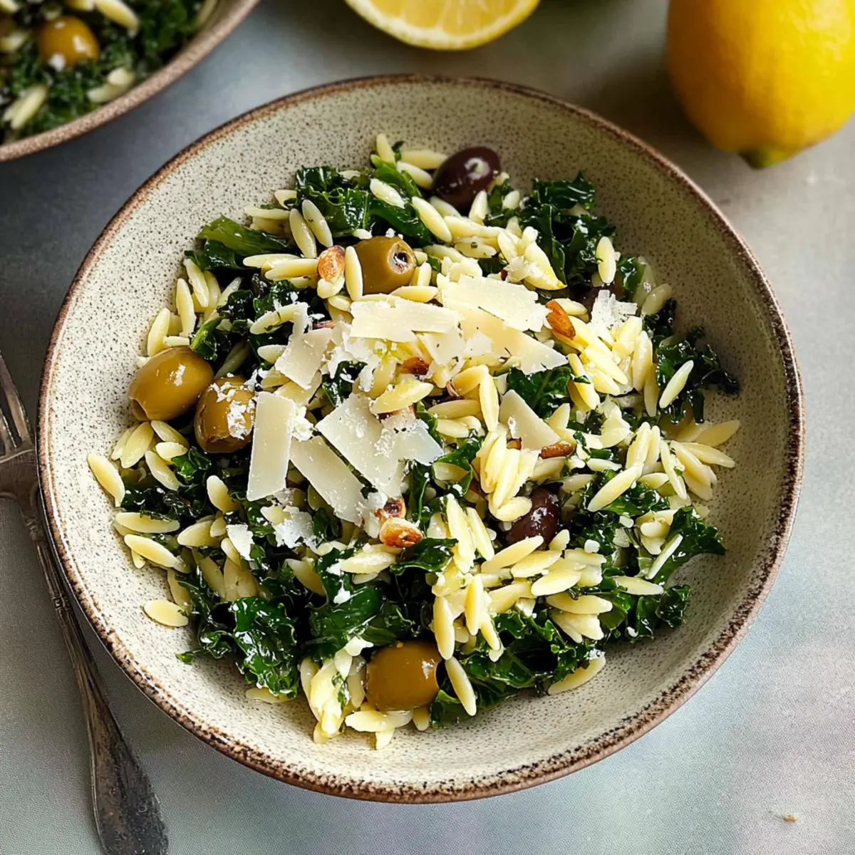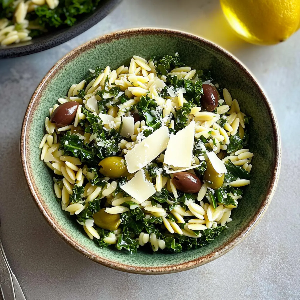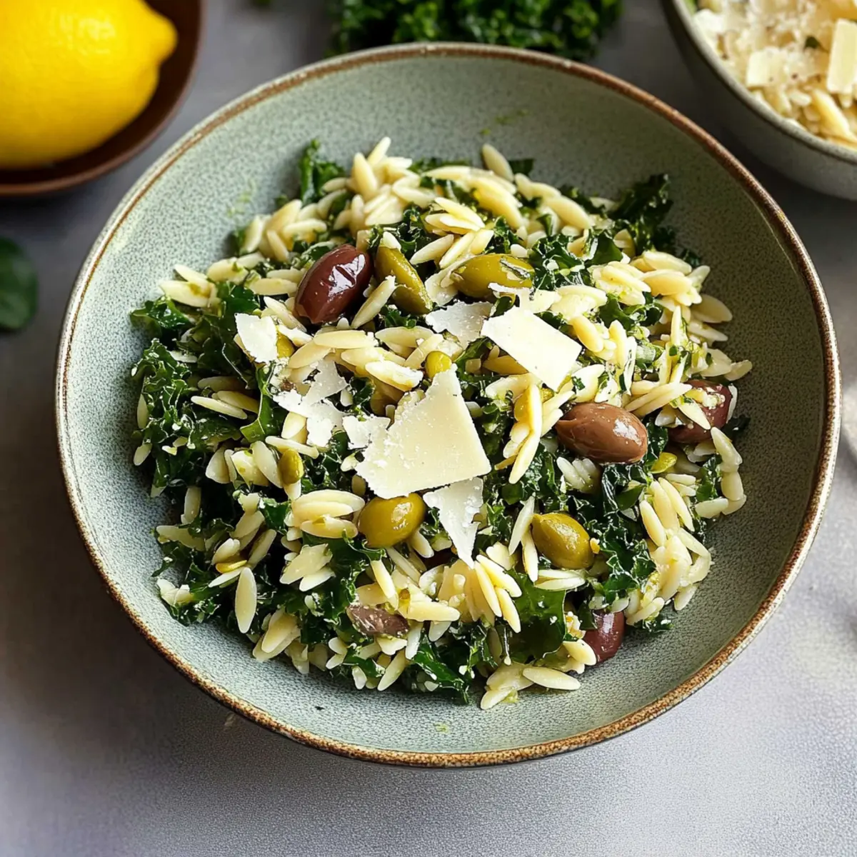 Jump to Recipe Print RecipeAs I tossed vibrant greens with glistening orzo, the kitchen filled with the zesty aroma of lemon dressing—a scent that whispers, “fresh and delicious.” This Orzo Kale Salad with Zesty Lemon Vinaigrette is not just a feast for the eyes; it’s an easy weeknight meal packed with nutrients that you can whip up in no time. Whether you’re looking to meal prep for a busy week or serve a colorful dish at your next gathering, this salad hits the mark. With its satisfying crunch from pumpkin seeds and a delightful hint of brininess from marinated olives, each bite is a refreshing experience. Would you rather enjoy it cold or warm, drizzled with extra vinaigrette? Let’s dive in! Why is Orzo Kale Salad So Irresistible? Colorful, Vibrant Ingredients: The bright greens and golden orzo make this salad a feast for the eyes, encouraging even the pickiest eaters to dig in. Nutritious Powerhouse: Packed with vitamins A, C, and K, this salad not only nourishes but also energizes you throughout the day. Versatile Meal Option: Perfect as a light lunch or a hearty side at dinner, it pairs beautifully with grilled meats or can stand alone as a vibrant vegetarian dish. Consider serving it alongside a refreshing Strawberry Spinach Salad for a colorful spread! Make-Ahead Perfection: Prepare this salad in advance and keep it in the fridge for up to 4 days, making your weeknight meals easier than ever. Lively Flavor: The zesty lemon vinaigrette elevates the flavors, and with optional add-ins like grilled chicken or beans, you can personalize it to your liking. Enjoy experimenting with different variations, perhaps by adding roasted veggies or swapping in quinoa for a gluten-free twist! Orzo Kale Salad Ingredients For the Salad • Dry Orzo – A hearty pasta base that gives the salad its satisfying structure; feel free to substitute with couscous or quinoa. • Spinach (2 packed cups, chopped) – Adds freshness and essential nutrients; arugula or mixed greens can also work well. • Kale (2 packed cups, chopped) – Provides a robust texture along with fiber and vitamins; any variety of kale is suitable, such as lacinato. • Shaved Parmesan (1/2 cup) – Introduces creamy umami flavors; for a dairy-free option, use nutritional yeast. • Pumpkin Seeds (1/3 cup) – Supplies crunch and healthy fats; sunflower seeds or nuts are excellent alternative choices. • Marinated Olives (1/3 cup, sliced) – Infuses a savory, briny flavor; swap for canned beans like chickpeas for a plant-based twist. For the Dressing • Olive Oil (1/4 cup) – Serves as the dressing base for rich flavor; a high-quality oil enhances taste. • Lemon Juice (Juice from 1 lemon, about 3 tbsp) – Brightens the entire dish with zesty acidity, making your Orzo Kale Salad sing! • Lemon Zest (1 tsp) – Adds a lovely burst of lemon flavor; be sure to zest before juicing the lemon. • Garlic (1 clove, crushed) – Provides an aromatic touch that deepens the dressing’s flavor profile. • Honey (1 tsp) – Balances out the acidity of the vinaigrette beautifully; for a vegan alternative, use maple syrup. • Dijon Mustard (1 tsp) – Contributes depth and a slight tang to the dressing; it helps to emulsify as well. • Salt & Pepper – Essential for seasoning the salad to your preference, enhancing all the fantastic flavors! Step‑by‑Step Instructions for Orzo Kale Salad Step 1: Cook the Orzo Bring a large pot of salted water to a rolling boil. Add in the dry orzo and cook for about 8-12 minutes until al dente, stirring occasionally to prevent sticking. Once cooked, drain the orzo in a colander and set aside to cool, ensuring it doesn’t wilt the fresh greens of your Orzo Kale Salad. Step 2: Prepare the Salad Base In a large mixing bowl, combine the chopped kale and spinach with the cooled orzo. Add in the pumpkin seeds and sliced marinated olives for that extra zest. Finally, sprinkle in the shaved Parmesan, ensuring all ingredients are evenly distributed, creating a nutritious and vibrant base for your Orzo Kale Salad. Step 3: Make the Dressing In a small mixing bowl, whisk together the olive oil, fresh lemon juice, and crushed garlic until well blended. Next, incorporate honey and Dijon mustard, followed by the lemon zest, salt, and pepper. This zesty lemon vinaigrette will bring your Orzo Kale Salad to life with a bright and tangy flavor that balance the dish beautifully. Step 4: Combine the Salad and Dressing Pour the freshly made dressing over the salad mixture, taking care to coat all the ingredients evenly. Using tongs or a large spoon, gently toss the salad, allowing the flavors to meld together. This step ensures that every bite of your Orzo Kale Salad is bursting with delightful taste and freshness. Step 5: Serve and Enjoy Top your beautiful Orzo Kale Salad with extra pumpkin seeds and a sprinkle of Parmesan, if desired. You can serve it immediately for a fresh crunch, or let it sit for a few minutes to allow the flavors to develop further. This salad can be enjoyed cold, warm, or at room temperature, making it versatile for any occasion. Expert Tips for Orzo Kale Salad Cook Perfectly Al Dente: Cooking orzo until it’s al dente adds the right texture. Overcooking can make it mushy and unappealing in your Orzo Kale Salad. Cool Before Mixing: Always let the cooked orzo cool completely before combining it with the greens. This prevents the kale and spinach from wilting, keeping your salad fresh. Flavor Boost with Extras: Consider adding proteins like grilled chicken or chickpeas for a satisfying meal. These options enhance the nutritional value of your Orzo Kale Salad. Make-Ahead Wonder: Preparing your Orzo Kale Salad ahead of time is a great strategy. It can be stored in the fridge for up to 3-4 days without losing its vibrant flavor and texture. Experiment with Variations: Don’t hesitate to try different seeds or roasted veggies based on your preference. Mixing flavors keeps your Orzo Kale