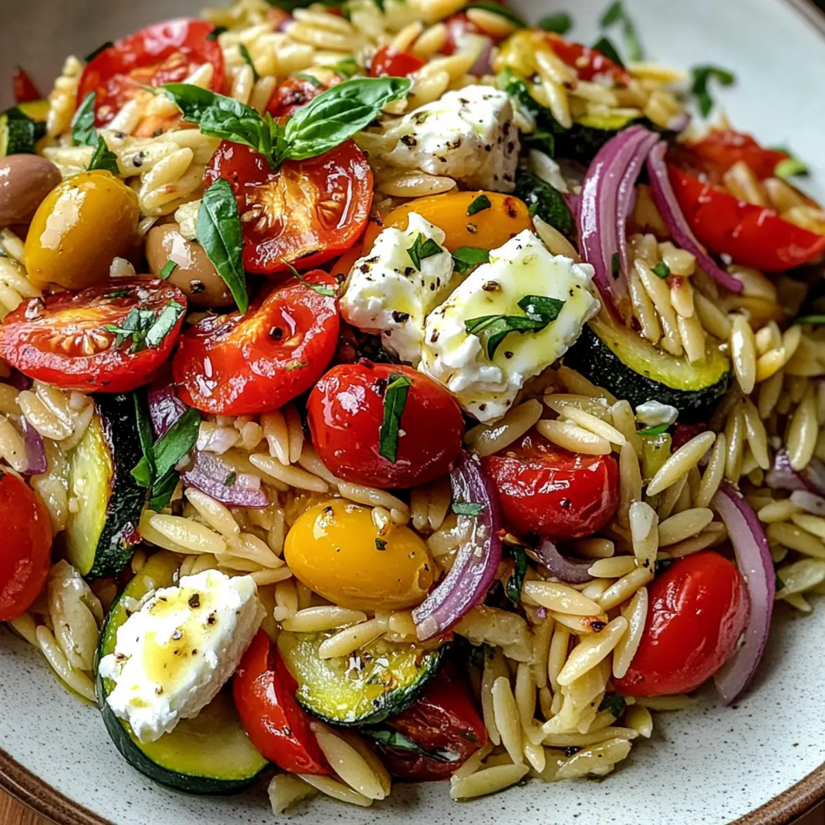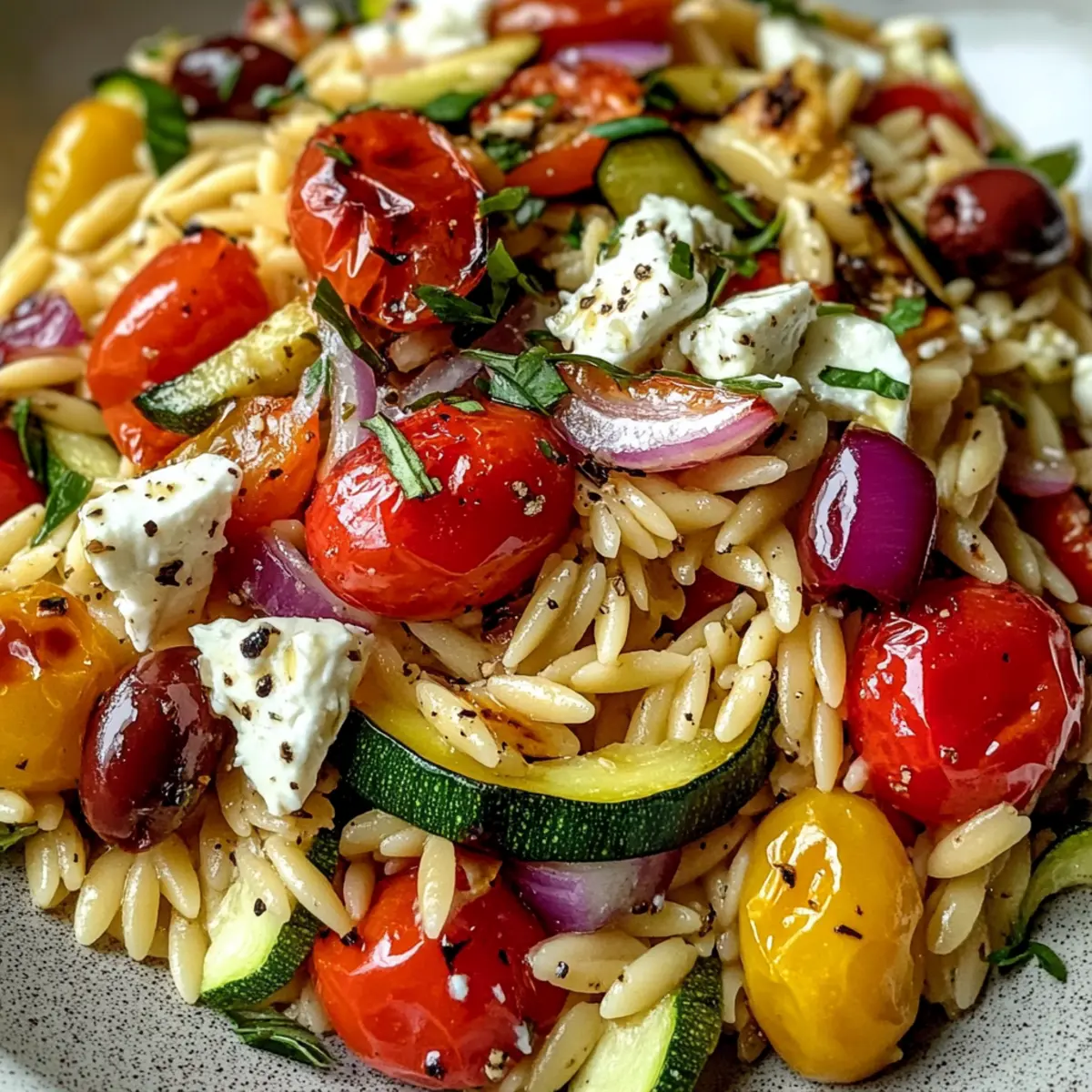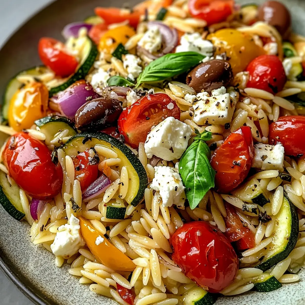 Jump to Recipe Print RecipeThe aroma of roasted vegetables wafts through my kitchen, instantly transporting me to the sun-drenched coasts of the Mediterranean. Today, I’m thrilled to share my vibrant Orzo Salad with Roasted Veggies and Feta, a dish that’s as delicious as it is easy to prepare. Packed with wholesome ingredients, this salad isn’t just a feast for the eyes; it’s a time-saver perfect for meal prep or a delightful side for any gathering. The combination of creamy feta, sweet, caramelized vegetables, and tender orzo creates a satisfying medley, enticing even the pickiest eaters. Plus, it’s vegetarian and can easily be made gluten-free, making it versatile for any diet. So, are you ready to bring a taste of the Mediterranean to your table? Let’s dive in! Why is this Orzo Salad special? Freshness, this Orzo Salad with Roasted Veggies brings vibrant Mediterranean flavors right to your table! Ease of preparation makes it a fantastic choice for busy weeknights or impromptu gatherings. Versatile ingredients allow you to swap vegetables based on what’s in season, and it’s easy to adjust for dietary needs—just switch the orzo for gluten-free pasta! Crowd-pleaser status means it’s always a hit at potlucks and family dinners. Serve it alongside a refreshing Strawberry Spinach Salad for a colorful feast that everyone will love! Orzo Salad Ingredients Here’s everything you need to create this delightful Orzo Salad with Roasted Veggies and Feta! For the Salad • Orzo pasta – Serves as the salad’s hearty base, adding a delightful chewiness; for a gluten-free version, substitute with gluten-free pasta. • Cherry tomatoes – Provides a burst of sweetness and lively color; quartered plum tomatoes can be an alternative if needed. • Red bell pepper – Contributes crunchy sweetness; feel free to explore with yellow or orange bell peppers instead. • Zucchini – Offers a subtle flavor and tender texture; yellow squash makes a great swap if you’d like. • Red onion – Enriches the salad with sweet-savory flavors when roasted; shallots can be a milder substitute. • Kalamata olives – Adds a briny richness that contrasts beautifully with the other ingredients; green olives can also be used instead. For the Dressing • Olive oil – A must for roasting and dressing, enhancing the salad’s flavor; light oils like canola are good alternatives if desired. • Lemon juice – Brightens the dish, giving it a fresh zing; lime juice can be used to substitute, providing a different twist. • Red wine vinegar – Deepens the flavor of the dressing; apple cider or white wine vinegar can work just as well. • Salt and pepper – Essential for bringing out the flavors; using sea salt can elevate the overall taste. • Dried oregano – Infuses a warm, aromatic note throughout; Italian seasoning can be an easy substitute if you prefer. For the Garnish • Fresh basil – Offers a fragrant and colorful touch; parsley or arugula can be used for a unique flavor variation. • Feta cheese – The creamy, tangy element that ties the dish together; for a dairy-free option, consider using a vegan feta alternative. Now that you have the ingredients ready, it’s time to blend these flavors together for a sensational Mediterranean experience! Step‑by‑Step Instructions for Orzo Salad with Roasted Veggies Step 1: Preheat the Oven Begin by preheating your oven to 400°F (200°C). This high temperature is essential for achieving perfectly roasted vegetables. While your oven warms up, prepare a baking sheet lined with parchment paper to prevent sticking and simplify cleanup later. Step 2: Prepare the Vegetables Next, spread the cherry tomatoes, diced red bell pepper, sliced zucchini, and red onion evenly across the prepared baking sheet. Drizzle the veggies with a generous amount of olive oil, then season with salt, pepper, and dried oregano. Toss the vegetables to ensure they are well-coated and vibrant with flavor. Step 3: Roast the Vegetables Place the baking sheet with the seasoned vegetables in the preheated oven and roast for 20-25 minutes. Keep an eye on them as they cook—you want the veggies to become tender and caramelized, exhibiting a light golden hue. This roasting step brings out their natural sweetness, enhancing your Orzo Salad with Roasted Veggies. Step 4: Cook the Orzo While the vegetables roast, bring a medium pot of salted water to a boil. Add the orzo pasta and cook according to package instructions until al dente, usually about 8-10 minutes. Once cooked, drain the orzo in a colander and rinse it under cold running water to stop the cooking process and cool it down. Step 5: Combine Ingredients In a large mixing bowl, combine the cooled orzo with the roasted vegetables, fresh basil, Kalamata olives, and crumbled feta cheese. Gently toss the ingredients together—this mix of flavors and textures in your Orzo Salad with Roasted Veggies is what makes it truly enticing. Step 6: Prepare the Dressing In a separate bowl, whisk together the freshly squeezed lemon juice and red wine vinegar. This zesty dressing is crucial for tying all the flavors of your salad together. Pour the dressing over the salad mixture and toss gently, ensuring everything is evenly coated and bursting with Mediterranean flavor. Step 7: Chill the Salad For the best flavor experience, it’s important to chill your salad. Cover the bowl with plastic wrap and let it rest in the refrigerator for at least 30 minutes. This resting time allows the flavors to meld beautifully, ensuring that each bite is as delicious as possible when you’re ready to serve. Step 8: Serve and Enjoy When you’re ready to enjoy your Orzo Salad with Roasted Veggies, you can serve it chilled or at room temperature. For an extra touch, garnish with additional fresh basil leaves. This vibrant salad is perfect as a side dish or a light main course, showcasing the deliciousness of the Mediterranean! What to Serve with Orzo 