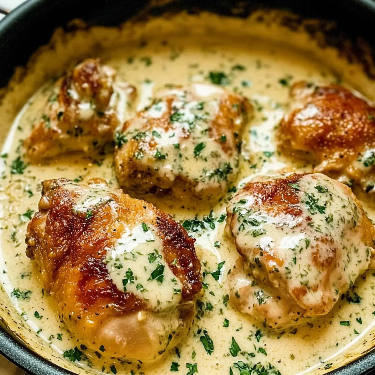 Jump to Recipe Print RecipeStepping into my kitchen, the inviting aroma of garlic and herbs wraps around me like a warm hug, instantly lifting my spirits. Today, I’m diving into a comforting classic with a twist: Creamy Oven Baked Chicken Thighs. This dish is a delightful fusion of home-cooked goodness and restaurant flair, featuring succulent chicken enveloped in a rich, velvety cream sauce. The best part? It’s all made in just one pan, making cleanup a breeze! Whether you’re looking for an effortless weeknight dinner or something special for family gatherings, this creamy delight is sure to win hearts and satisfy appetites. Are you ready to create a new favorite meal that’s as simple as it is delicious? Let’s get cooking! Why Are Oven Baked Chicken Thighs Amazing? Easy Prep: This recipe is hassle-free, letting you spend more time enjoying your meal and less time in the kitchen. It’s perfect for busy weeknights! Rich and Creamy: The luscious garlic-herb cream sauce elevates ordinary chicken thighs into a comforting dish that’ll have your loved ones coming back for seconds. Versatile Serving Options: Pair these Oven Baked Chicken Thighs with creamy mashed potatoes or a refreshing green salad for a well-rounded meal. One-Pan Wonder: Cleanup is a breeze since everything cooks in one pan, making it ideal for busy cooks. Crowd-Pleasing Flavor: Whether you’re hosting a family dinner or a casual get-together, the savory flavors will impress everyone at the table. Try serving it alongside my Cheesy Baked Ziti for a delightful feast! Oven Baked Chicken Thighs Ingredients For the Chicken • Bone-in Skinless Chicken Thighs – The star of the dish, they are juicier than chicken breasts and perfect for soaking up the rich sauce. • Olive Oil – A flavorful cooking fat that helps to brown the chicken beautifully. For the Cream Sauce • Unsalted Butter – Adds richness and can be substituted with more olive oil for a dairy-free version. • Garlic Cloves – Fresh garlic enhances the flavor profile. Always use fresh for the best aroma! • Heavy Cream – Creates the velvety sauce; coconut cream is a great dairy-free substitute. • Chicken Broth – Adds depth and moisture to the sauce; opt for low-sodium for healthier cooking. • Grated Parmesan Cheese – Offers added creaminess; feel free to use a dairy-free alternative if desired. For Seasoning • Paprika – A mild seasoning that gives the dish beautiful color and subtle flavor. • Dried Italian Herbs (Oregano/Thyme) – Essential for boosting the sauce’s flavor; a sprinkle works wonders. • Salt – A basic seasoning to adjust according to your taste preference. • Black Pepper – For a little kick; freshly ground is ideal to elevate flavor. For Garnish • Fresh Parsley or Dill – Adds a fresh touch and visual appeal right before serving. Now you’re just a few ingredients away from creating comforting Oven Baked Chicken Thighs that are sure to please! Step‑by‑Step Instructions for Creamy Oven Baked Chicken Thighs Step 1: Preheat Your Oven Begin by preheating your oven to 375°F (190°C). This ensures that your Creamy Oven Baked Chicken Thighs cook evenly and reach that perfect tender texture. As the oven warms, gather your ingredients and tools, including an oven-safe skillet for the next steps. Step 2: Prepare the Chicken Pat the bone-in skinless chicken thighs dry with paper towels to help achieve a beautiful sear. Season them generously with paprika, salt, and black pepper. This seasoning will enhance the flavors of your Oven Baked Chicken Thighs, creating a deliciously savory dish. Step 3: Sear the Chicken In your preheated skillet, add olive oil and 1 tablespoon of butter over medium-high heat. Once hot, carefully place the seasoned chicken thighs in the skillet, searing each side for 3-4 minutes until they are golden brown. This step seals in the juices and adds a scrumptious crust before baking. Remove the chicken and set it aside. Step 4: Make the Cream Sauce In the same skillet, reduce the heat to medium and add the remaining tablespoon of butter. Once melted, toss in the minced garlic and sauté for about 1 minute, or until fragrant. Next, stir in the heavy cream, chicken broth, grated Parmesan, and dried Italian herbs. Allow the mixture to simmer gently for 2-3 minutes, thickening into a rich, creamy sauce. Step 5: Combine Chicken and Sauce Return the seared chicken thighs to the skillet, nestling them into the cream sauce. Spoon the sauce over the top, ensuring each piece is coated. This not only infuses the chicken with flavor but also allows the sauce to work its magic as it bakes. Step 6: Bake to Perfection Transfer the skillet to your preheated oven and bake uncovered for 25-30 minutes. The chicken is done when it reaches an internal temperature of 165°F (74°C) and the sauce is bubbly and slightly thickened. Watch for that mouthwatering golden color on the chicken, signaling it’s ready to serve! Step 7: Garnish and Serve Once out of the oven, let it rest for a few minutes, then garnish your Creamy Oven Baked Chicken Thighs with fresh parsley or dill for a burst of color and flavor. Serve hot, and enjoy the warm comfort of this one-pan meal that is sure to delight your family and friends! Oven Baked Chicken Thighs Variations Feel free to make this recipe your own with these exciting twists and substitutes, enhancing the flavors and tailoring it to your family’s tastes. Lean Option: Replace chicken thighs with chicken breasts for a lighter dish; reduce baking time slightly to keep them juicy. Whether you’re watching calories or just prefer a leaner cut, this swap still delivers on flavor. Dairy-Free Delight: Use coconut cream instead of heavy cream for a rich, dairy-free sauce. The coconut adds a hint of sweetness and unique flavor that pairs beautifully with the herbs. Veggie Boost: Incorporate sautéed mushrooms or spinach into the sauce for added nutrition and flavor. Feel free to m