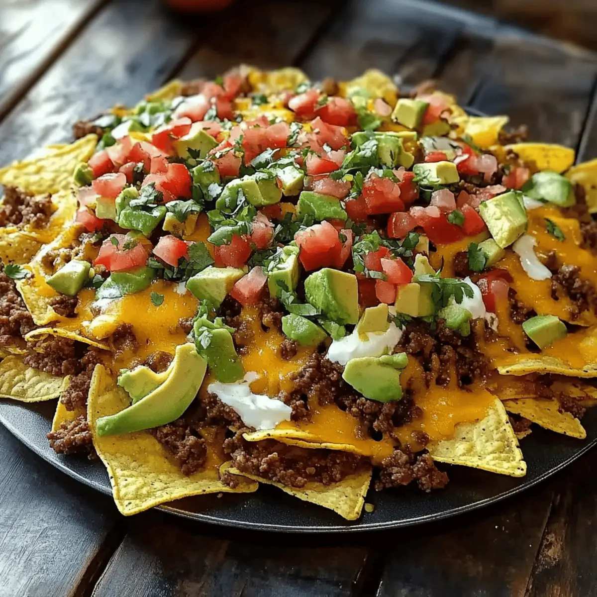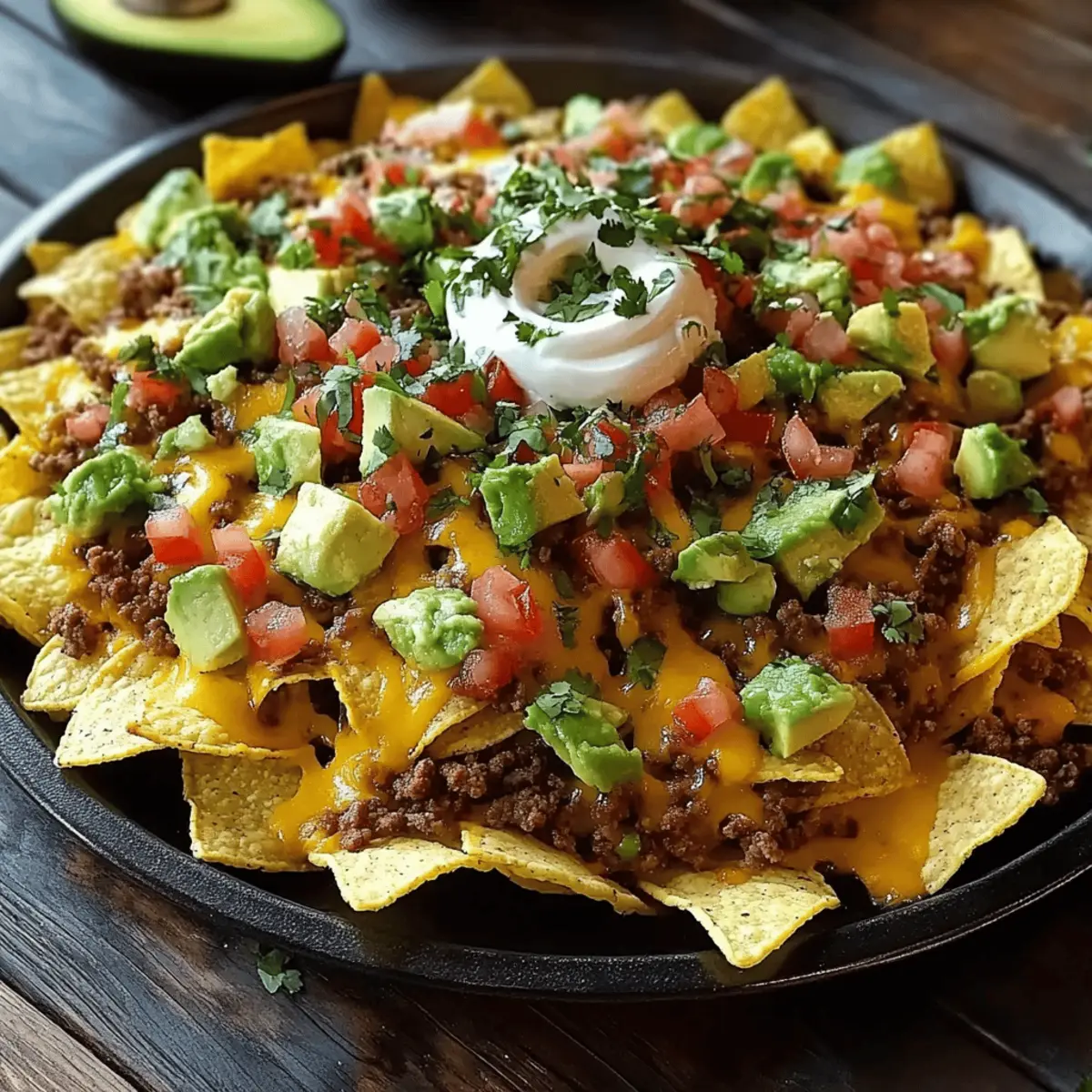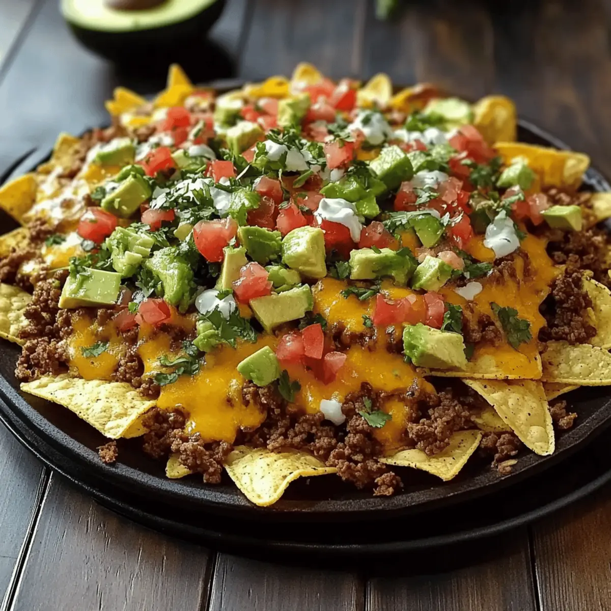 Jump to Recipe Print RecipeAs I pulled my fresh nachos from the oven, the aroma alone nearly had me swooning. These Oven-Baked Nachos aren’t just any snack; they are a vibrant celebration of flavors that turns the simple act of cooking into a joyful gathering moment. Perfectly layered with crispy tortilla chips, seasoned ground beef, and a melty cheese combo, they are a total crowd-pleaser. Best of all, this dish promises an easy preparation that means less time in the kitchen and more time enjoying with loved ones. Whether it’s movie night or a casual dinner party, these nachos will be the dish that keeps everyone coming back for more—trust me, they won’t last long! Are you ready to create your masterpiece? Why are Oven-Baked Nachos a must-try? Simplicity made delicious: This recipe is straightforward, requiring minimal prep time, so you can whip it up with ease. Flavors that pop: The combination of seasoned beef, melted cheese, and zesty toppings ensures every bite is bursting with excitement. Crowd-pleasing delight: Perfect for parties, these nachos keep everyone satisfied and coming back for more. Just imagine pairing them with a refreshing drink like Grilled Lemonade for a fun twist! Versatile options: You can easily customize with your favorite toppings, like jalapeños or corn, putting your personal spin on this classic dish. Memorable gatherings are just a bake away: Whether it’s a cozy movie night or a festive get-together, these nachos will anchor your table and create lasting memories. Oven-Baked Nachos Ingredients • Here’s everything you need to create your delicious Oven-Baked Nachos! For the Base Tortilla Chips – Essential for crunch; choose your favorite brand or try making homemade chips for extra freshness. Ground Beef – This main protein source brings hearty flavor; swap for turkey or plant-based option for a lighter twist. For the Seasoning Taco Seasoning – Delivers the spice and zest of Mexican cuisine; make your own simply with paprika, cumin, garlic powder, and onion powder if desired. For the Cheesy Layers Cheddar Cheese – Offers a melty, sharp flavor; feel free to use dairy-free cheese for a vegan option. Monterey Jack Cheese – A creamy counterpart to cheddar; Gouda can be a delightful substitute as well. For the Color & Freshness Bell Peppers – Adds brightness and crunch; use any color variety or skip if you prefer fewer veggies. Red Onion – Provides crunch and tang; green onions can offer a milder flavor if you like! For the Toppings Lime Sour Cream – A zesty, creamy drizzle that elevates the dish; just mix sour cream, lime juice, and a pinch of salt. Avocado – Adds creaminess and freshness; guacamole makes a delicious alternative if desired. Cilantro – This herbaceous garnish enhances flavor; simply omit if you’re not a fan of cilantro. Each ingredient plays a special role in making these Oven-Baked Nachos a true win for your gathering! Step‑by‑Step Instructions for Crispy Oven-Baked Nachos Delight Step 1: Preheat Your Oven Begin by preheating your oven to 350°F (175°C). This is crucial as it ensures that your Oven-Baked Nachos will cook evenly and achieve that delightful crispy texture. While the oven heats up, prepare a springform pan by placing a parchment collar around the sides to facilitate easy serving later. Step 2: Mix the Lime Sour Cream In a bowl, combine sour cream, freshly squeezed lime juice, and a pinch of salt. Stir well until the mixture is smooth and cohesive. For a fun twist, transfer this zesty lime sour cream into a squeeze bottle and refrigerate it while you continue with the nacho assembly. This will allow the flavors to meld beautifully. Step 3: Cook the Ground Beef Heat a skillet over medium heat and add your ground beef. Cook for about 8-10 minutes, breaking it apart with a spatula as it browns. Once fully cooked and golden, sprinkle in your taco seasoning, stirring to combine. Drain any excess fat, ensuring your beef is flavorful and packed with zesty goodness for your nachos. Step 4: Layer the Nachos Now, it’s time to assemble your Oven-Baked Nachos. Start by placing a layer of crunchy tortilla chips in your prepared springform pan. Sprinkle a generous portion of the seasoned ground beef over the chips, followed by chopped veggies like bell peppers and red onions, and then layer both the cheddar and Monterey Jack cheeses for that melty delight. Step 5: Build it Up For an added crunchy texture, finish with another layer of tortilla chips atop the cheese. You want to create that quintessential nacho height! Pop the pan into the preheated oven and bake for about 30 minutes, or until the cheese is deliciously bubbly and slightly golden, signaling that your Oven-Baked Nachos are ready to shine. Step 6: Add the Toppings Once your cheesy creation has baked to perfection, remove it from the oven. Drizzle the zesty lime sour cream generously over the top, then scatter diced avocado and fresh cilantro to elevate the flavor profile. These final touches bring freshness and tang that perfectly complement the rich, melty layers underneath. Step 7: Serve and Enjoy Finally, slice your nachos directly in the springform pan for an impressive presentation and serve them immediately. Pair these heavenly Oven-Baked Nachos with your favorite dips such as guacamole or salsa to enhance the experience. They are sure to be a hit at any gathering, so be prepared for compliments! Make Ahead Options These Oven-Baked Nachos are perfect for busy weeknights, allowing you to prep in advance and enjoy a stress-free mealtime. You can prepare the ground beef (cooked and seasoned) and store it in an airtight container in the refrigerator for up to 3 days. Additionally, cut your veggies and assemble the first layers of chips and cheese in your springform pan up to 24 hours ahead; just cover it tightly with plastic wrap. When ready to serve, simply add the prepped ingredients to the top, bake as directed for about 30 minutes, an