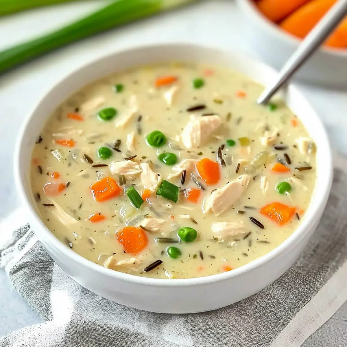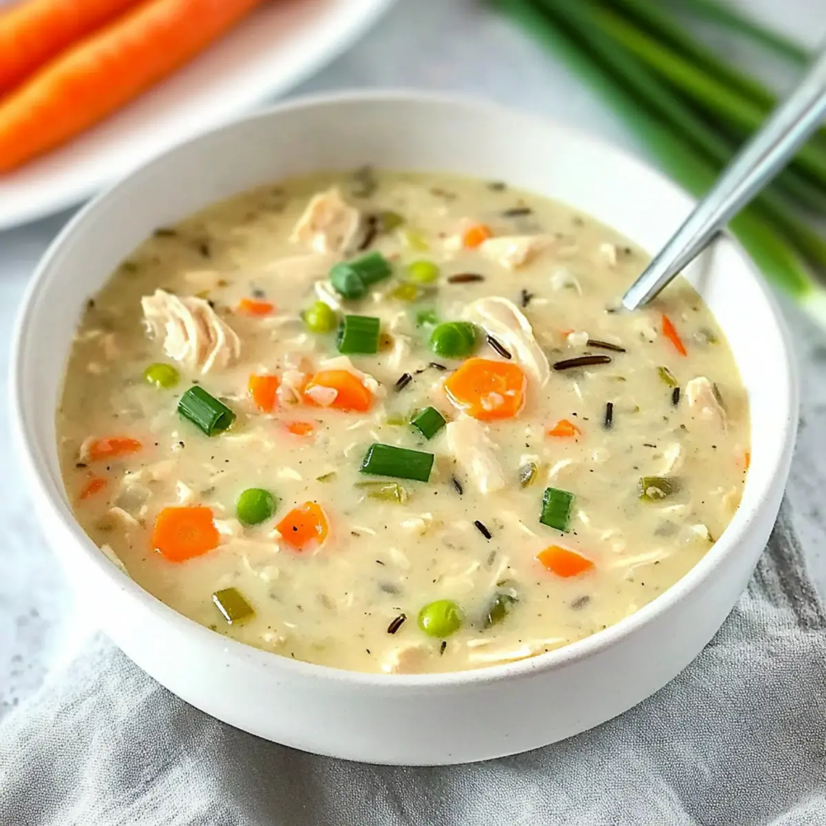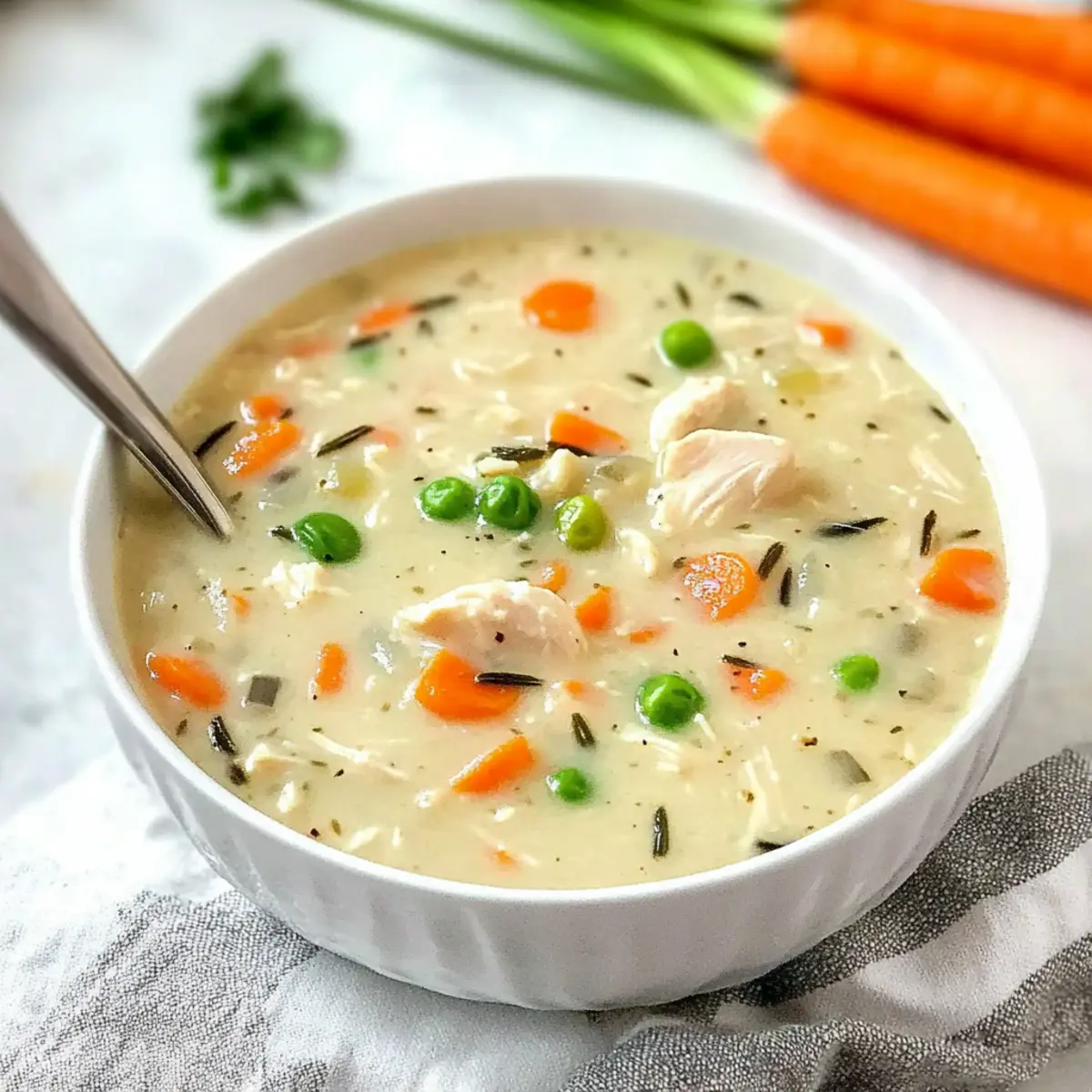 Jump to Recipe Print RecipeAs the chilly air wraps around us like a comforting blanket, there’s nothing quite like the cozy embrace of a homemade bowl of soup. My Copycat Panera Chicken and Wild Rice Soup is a delightful takeaway that you can create right in your kitchen. This creamy, hearty dish brings the warmth of that café favorite straight to your table with minimal effort. With just a few simple ingredients, this recipe stands out not only for its comforting flavors but also for its versatility—it can be made in a slow cooker or a Dutch oven! Whether you’re meal prepping for the week or looking for a delightful dinner to share with loved ones, this soup promises to be a quick and satisfying solution that will leave everyone feeling full and happy. Are you ready to dive into that deliciousness? Let’s get started! Why is this soup a must-try? Comforting warmth: There’s nothing like a steaming bowl of soup to chase away the chill! This flavorful dish wraps around you like a soothing hug. Quick preparation: You can whip this up in just around 30 minutes with minimal hands-on time, leaving you with more moments to relax or enjoy with family. Versatile ingredients: Easily swap out ingredients like chicken for turkey or add extra veggies like spinach or bell peppers for a nutritious boost. Crowd-pleaser appeal: Perfect for chilly evenings, this soup will delight your friends and family, with everyone asking for seconds! Pair it with a side of freshly baked baguette or enjoy it alongside a light, refreshing Hawaiian Chicken Salad for a complete meal. Make-ahead convenience: This recipe stores beautifully, making it an ideal option for meal prep; simply reheat and enjoy later! Panera Chicken and Wild Rice Soup Ingredients Here’s everything you need to create this comforting dish! For the Soup Base Olive Oil – Adds richness and helps sauté the vegetables; feel free to use another oil if you prefer. Carrots (½ cup) – Provides sweetness and color; substitute with parsnips for a different flavor. Celery (½ cup) – Adds a fresh crunch and depth; can be replaced with more carrots if desired. Onion (1 medium) – Essential for flavor; shallots or leeks make good substitutes. Garlic (3 cloves, minced) – Enhances the overall flavor; adjust quantity for a milder taste. Chicken Stock (32 oz) – The soup’s rich base; homemade stock adds depth, while low-sodium versions are a healthy option. Water (2 cups) – Helps achieve the right consistency of the soup. Milk (2 cups, divided) – Adds creaminess; options include cream or plant-based milk for a dairy-free option. Pepper (½ tsp) – Adds a mild heat; feel free to adjust to your taste. Dried Oregano (½ tsp) – Provides an earthy flavor; Italian seasoning works as a handy alternative. Bay Leaf (1) – Infuses depth of flavor while cooking; be sure to remove it before serving. For the Protein and Thickeners Cooked Chicken (2 large breasts, shredded) – Supplies protein; rotisserie chicken can make prep quicker. All-Purpose Flour (½ cup) – Thickens the soup; gluten-free flour blends can be suitable substitutes. For the Heartiness Rice a Roni Long Grain and Wild Rice (4.3 oz box + seasoning packet) – Key to the soup’s heartiness and flavor; a simple wild rice blend can be used instead, though seasoning may need adjustment. For Garnish Scallions – Optional for garnish; fresh parsley or no garnish can also work if you prefer. This delightful Panera Chicken and Wild Rice Soup is sure to become a comforting staple in your home! Step‑by‑Step Instructions for Creamy Copycat Panera Chicken and Wild Rice Soup Step 1: Sauté the Vegetables In a 6-quart Dutch oven, heat 2 tablespoons of olive oil over medium heat. Once shimmering, add 1 medium diced onion, ½ cup of diced carrots, and ½ cup of diced celery. Sauté for about 10 minutes, stirring occasionally, until the onions become translucent and the vegetables soften, creating a fragrant base for your delicious Panera Chicken and Wild Rice Soup. Step 2: Add Garlic and Liquids Stir in 3 cloves of minced garlic and cook for an additional minute until fragrant. Next, pour in 32 ounces of chicken stock and 2 cups of water, stirring well to combine everything. Add 1 cup of milk to bring creaminess, and then mix until the liquids are fully integrated into the aromatic vegetable mixture. Step 3: Incorporate Seasonings and Chicken Incorporate ½ teaspoon of pepper, ½ teaspoon of dried oregano, and 1 bay leaf into the pot while mixing thoroughly. Add the shredded cooked chicken, typically about 2 large breasts, to the bubbling soup. Allow the mixture to simmer on low for about 15 minutes, enabling the flavors to meld beautifully as it thickens slightly and the aroma enchants your kitchen. Step 4: Create the Thickening Mixture While the soup is simmering, you can prepare a thickening mixture. In a separate bowl, whisk together the remaining 1 cup of milk with ½ cup of all-purpose flour until completely lump-free. This will help you achieve that creamy texture essential for your comforting Panera Chicken and Wild Rice Soup, so take your time to mix it well. Step 5: Combine the Thickener and Soup Once your thickening mixture is ready, gradually pour it into the simmering soup. Stir continuously to prevent lumps from forming. This step is crucial for achieving a rich, creamy consistency. Keep stirring until the soup thickens, which should take about 5 minutes, resulting in a hearty base for your chicken and wild rice. Step 6: Add Rice and Final Simmer Stir in the Rice a Roni Long Grain and Wild Rice (4.3 oz box along with the seasoning packet) into the thickened soup. Increase the heat slightly and allow everything to simmer for about 20 minutes, or until the rice is tender. Watch as the soup transforms into a comforting delight, with every bite proving worth the wait. Step 7: Season and Serve After the rice has cooked through, taste your creamy copycat Panera Chicken and Wild Ric