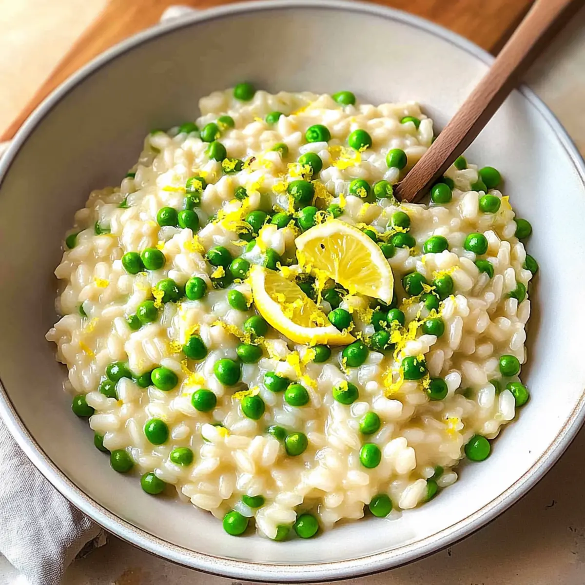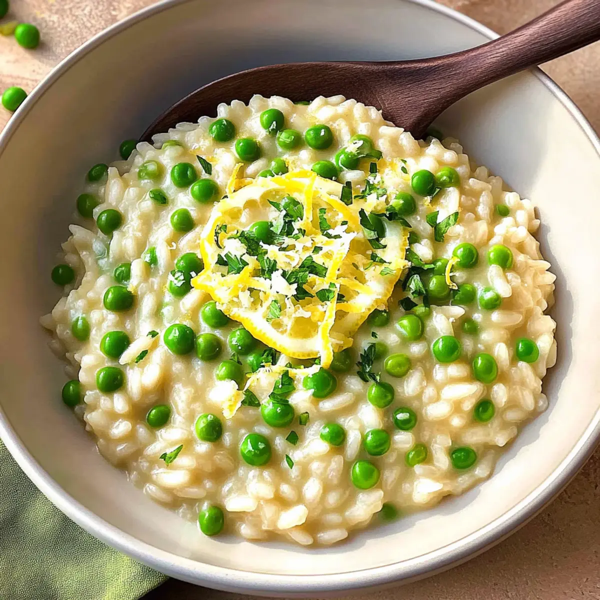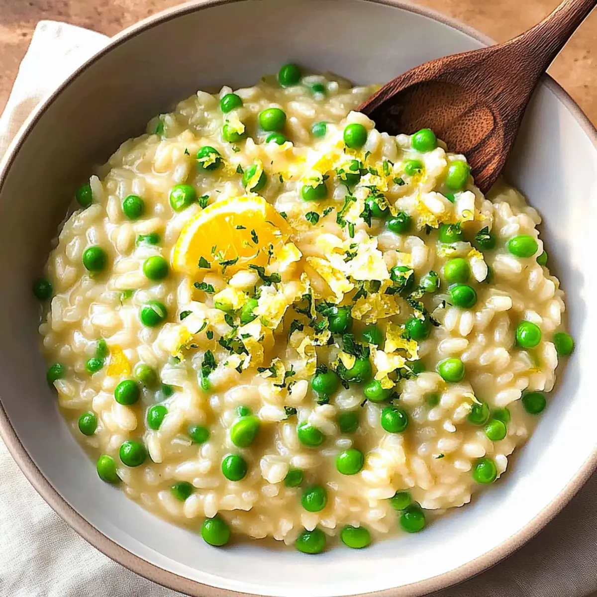 Jump to Recipe Print RecipeAs I stirred the pot, the delightful aroma of sautéed shallots filled my kitchen, intertwining with the crisp scent of bright lemon. Nothing compares to a dish that embraces the essence of spring, and this Creamy Pea Risotto with Lemon does just that. Within just 40 minutes, you can whip up a recipe that transforms simple ingredients into a comforting yet gourmet meal—perfect for impressing friends or treating yourself on a cozy night in. The creamy texture of arborio rice combines with the sweet notes of peas and a zesty lemon kick, making every bite a celebration of flavors. Plus, it’s vegetarian-friendly and can easily be adapted to fit vegan diets. Are you curious about how to create this beautiful dish that will elevate your dinner table? Why is Pea Risotto with Lemon a Must-Try? Simplicity at Its Best: This dish requires minimal techniques, making it perfect for home cooks of all levels. Just sauté, stir, and let the flavors meld together! Vibrant Flavor: The punchy lemon paired with sweet peas creates a refreshing and bright taste that truly embodies springtime. Versatile Delight: Feel free to customize! Whether you add fresh herbs, swap in asparagus, or try a dairy-free twist with nutritional yeast, this risotto adapts beautifully to your preferences. Quick Gourmet Meal: In only 40 minutes, you can serve up a restaurant-quality dish that’s sure to impress. Crowd Pleaser: Its creamy richness and elegant presentation make it ideal for intimate dinners or casual gatherings—a dish everyone will love. For a delightful pairing, consider serving it alongside a glass of Raspberry Peach Lemonade! Pea Risotto with Lemon Ingredients For the Risotto • Reduced-sodium chicken broth – Provides a flavorful base; substitute with vegetable broth for a vegetarian option. • Shallots – Add a mild onion flavor; finely chop for even distribution. • Butter – Adds richness and aids in sautéing; can be replaced with olive oil for a dairy-free version. • Arborio rice – The key ingredient for creaminess due to its high starch content; using other short-grain rice may yield different results. • Dried thyme – Enhances flavor with a subtle herbal note; fresh thyme can be used for a more intense taste. • Pepper – Enhances seasoning with mild spice. • White wine – Adds depth to flavors; can be substituted with additional broth for a non-alcoholic version. • Lemon juice – Provides acidity and brightness; freshly squeezed is preferred. • Frozen peas – Contribute sweetness and texture; fresh peas can be used if available. • Parmesan cheese – Adds a savory element; use nutritional yeast for a vegan alternative. • Grated lemon zest – Intensifies lemon flavor without adding acidity. Step‑by‑Step Instructions for Pea Risotto with Lemon Step 1: Heat Broth Begin by warming your reduced-sodium chicken broth in a small saucepan over low heat. Allow it to gently simmer without boiling, keeping it hot for the risotto. This step is crucial as adding cold broth will slow down the cooking process, preventing the creamy texture we desire in our Pea Risotto with Lemon. Step 2: Sauté Shallots In a large nonstick skillet, melt butter over medium heat, then add the finely chopped shallots. Sauté the shallots for 2–3 minutes until they are softened and fragrant, becoming translucent. This aromatic base will enhance the flavor of your risotto, providing a delicious foundation for the rest of the ingredients. Step 3: Add Rice Stir in the arborio rice, dried thyme, and black pepper, ensuring the rice is evenly coated in the buttery shallots. Toast the rice for about 2–3 minutes, watching for the edges to turn slightly translucent. This step helps release the rice’s starch, which will contribute to the creamy consistency of the Pea Risotto with Lemon. Step 4: Deglaze Pour in the white wine and freshly squeezed lemon juice, stirring constantly to deglaze the skillet. Cook for 1–2 minutes, allowing the liquid to absorb into the rice. This will intensify the flavors, making your risotto even more vibrant and delicious as the acidity balances the creaminess. Step 5: Combine Broth Gradually add the warm broth to the skillet, about ½ cup at a time, and stir continuously. Allow each addition to be fully absorbed before adding more, which should take around 20 minutes. You’ll know it’s ready when the rice is creamy and al dente, with each grain maintaining its shape—a hallmark of perfect Pea Risotto with Lemon. Step 6: Finish with Peas & Cheese Once the rice reaches its desired texture, gently fold in the thawed peas, grated Parmesan cheese, and lemon zest. Heat through for an additional 2–3 minutes, allowing the peas to warm up and the cheese to melt smoothly. This final step ties all the flavors together, creating a beautifully creamy dish that embodies the spirit of spring. Pea Risotto with Lemon Variations & Substitutions Get ready to elevate your Pea Risotto with Lemon by making it uniquely yours with these delightful twists! Protein Boost: Add cooked shrimp or scallops after finishing the risotto for a seafood flair. The combination of sweet peas and succulent seafood creates a delicious contrast that’s sure to impress. Herb Infusion: Incorporate fresh herbs like basil or parsley just before serving for a fragrant twist. This addition will brighten each bite, making it a refreshing dish that’s full of life. Green Replace: Swap out peas for asparagus or spinach if you’re feeling adventurous. The vibrant green colors will add variety and a new texture to the dish. Creamy Twist: Stir in crème fraîche or heavy cream before serving to enhance the richness. This decadent addition will elevate the creaminess and contribute to that luxurious mouthfeel. Vegan Delight: Replace parmesan cheese with nutritional yeast to satisfy dairy-free diets. It’ll provide a cheesy flavor while keeping your dish suitable for everyone at the table. Spic