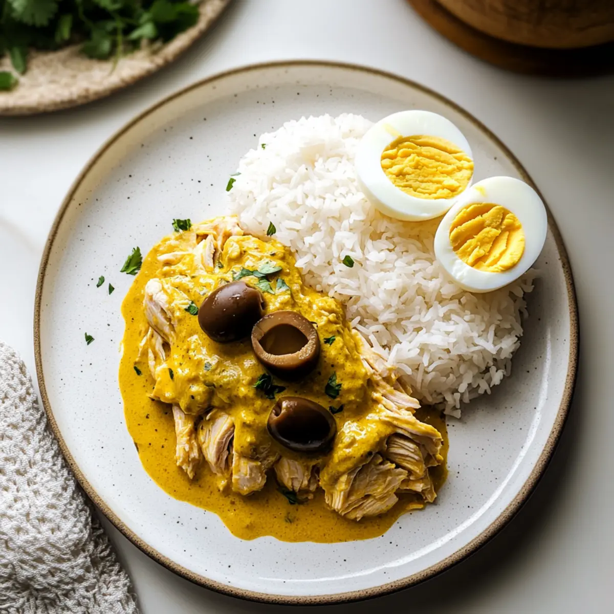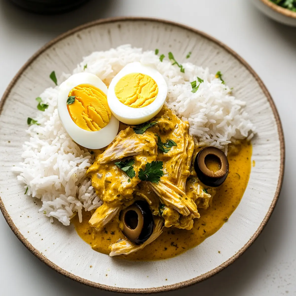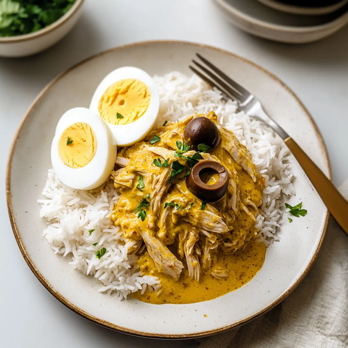 Jump to Recipe Print RecipeAs I stirred the vibrant, golden sauce, the fragrant aroma of Ají de Gallina wafted through my kitchen, instantly transporting me to the heart of Peru. This creamy, comforting chicken stew combines tender, shredded chicken with a silky sauce rich in ají amarillo peppers, perfect for those cozy nights when fast food just won’t do. Not only is this Peruvian Ají de Gallina recipe a crowd-pleaser, but it’s also quick, budget-friendly, and easily adaptable with substitutions to suit any pantry. Whether you’re hosting a special dinner or just looking for a delightful weeknight meal, this dish makes homemade cooking feel effortless. Who wouldn’t want to bring a little warmth and flavor to their table? Let’s dive into the heart of this classic recipe together! Why is Ají de Gallina So Special? Comforting Experience: Each bite of Ají de Gallina envelops you in warmth and joy, making it the perfect dish for cozy nights. Quick and Easy: This recipe comes together in under 30 minutes, allowing you to enjoy homemade goodness without the fuss. Budget-Friendly: With simple ingredients like chicken and bread, you can create a meal that satisfies your cravings without breaking the bank. Versatile Options: Feel free to swap chicken for turkey or tofu, catering to diverse dietary needs while maintaining the dish’s essence. Delightful Presentation: The vivid sauce, garnished with eggs and olives, makes for a stunning plate that impresses any guest. Discover more tips on how to elevate your homemade meals with budget-friendly recipes! Peruvian Ají de Gallina Ingredients For the Chicken: • Chicken – The star of the dish, providing heartiness and flavor; you can substitute turkey or tofu for a different protein source. For the Sauce: • Ají Amarillo Paste – Adds mild heat and vibrant color; if you can’t find it, blend yellow bell pepper with a little jalapeño for a similar effect. • Evaporated Milk – Contributes creaminess without making it heavy; whole milk mixed with a splash of cream works in a pinch. • White Bread – Thicken the sauce and enhance richness; plain crackers or leftover rolls can serve as a great substitute if needed. • Parmesan Cheese – Elevates the sauce with flavor and creaminess; grated pecorino or mild cheddar can work just as well. For the Garnish: • Olives – Adds a briny contrast and color; feel free to omit if they’re not your favorite. • Hard-Boiled Eggs – A traditional garnish that boosts texture and appearance; skip them if you’re not keen. Embark on your culinary adventure with this delightful Peruvian Ají de Gallina recipe, creating a cozy dish for all to enjoy! Step‑by‑Step Instructions for Peruvian Ají de Gallina Step 1: Prepare the Sauce Begin by soaking a few slices of white bread in a cup of evaporated milk for about 5 minutes, until softened. Transfer the soaked bread to a blender, and add 2-3 tablespoons of ají amarillo paste and ½ cup of grated Parmesan cheese. Blend until the mixture is smooth and creamy, forming the luscious sauce that will envelop your shredded chicken. Step 2: Cook the Chicken In a medium saucepan, combine 2 cups of shredded cooked chicken with the prepared creamy sauce over medium heat. Stir gently and allow it to simmer for approximately 10 minutes, ensuring the chicken absorbs all the rich flavors. Keep an eye on the sauce; avoid boiling to prevent curdling and achieve the perfect texture for your Peruvian Ají de Gallina. Step 3: Prepare the Garnishes While the chicken simmers, slice 2 hard-boiled eggs and chop a handful of olives for garnish. These flavorful additions will enhance both the visual appeal and taste of your dish. Once the chicken is done simmering, you’ll be ready to assemble the dish with these delightful toppings. Step 4: Serve the Dish To plate your comforting Peruvian Ají de Gallina, serve fluffy white rice on individual plates. Generously spoon the rich chicken sauce over the rice, allowing it to cascade beautifully. Add the sliced hard-boiled eggs and a few olives on top for a burst of color and flavor. Your warm, hearty meal is ready to be savored! Expert Tips for Peruvian Ají de Gallina Soak Bread Properly: Ensure the bread is soaked in milk until very soft, as this will help create a smooth sauce without lumps. Control the Heat: Keep the sauce at a low simmer after adding milk to prevent splitting; avoid boiling to maintain a creamy texture in your Peruvian Ají de Gallina. Use Fresh Ingredients: Fresh ají amarillo paste enhances flavor significantly; if unavailable, always blend your own with the freshest yellow peppers possible. Thicken Wisely: If your sauce is too thin, don’t add more bread; instead, let it simmer gently and reduce to thicken naturally while developing flavor. Decide on Garnishes: Place hard-boiled eggs and olives on top just before serving for a visually appealing and authentic look; skip them if you’re not a fan. Make Ahead Options Preparing Peruvian Ají de Gallina in advance is a fantastic way to save time during busy weeknights! You can make the creamy sauce up to 3 days ahead by soaking the bread in evaporated milk (as per the recipe) and blending it with the ají amarillo paste and cheese. Store the sauce in an airtight container in the refrigerator to maintain its rich flavor. You can also shred the cooked chicken up to 24 hours in advance, keeping it covered in the fridge to ensure it stays moist. When you’re ready to serve, gently reheat the sauce and chicken in a saucepan, adding a splash of milk to restore the creaminess. You’ll enjoy a delicious homemade meal with minimal effort! Variations & Substitutions for Peruvian Ají de Gallina Feel free to explore your culinary creativity with these delightful twists and substitutions for the classic Ají de Gallina! Turkey Substitute: Use cooked, shredded turkey instead of chicken for a delicious holiday-inspired version. It’s a great way to enjoy le