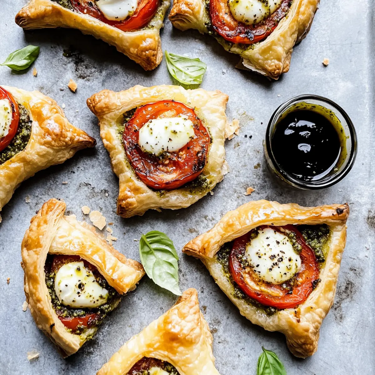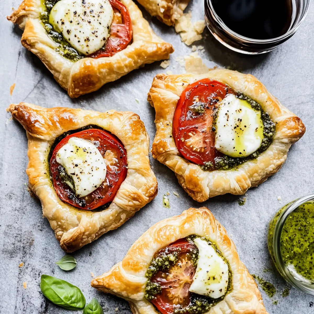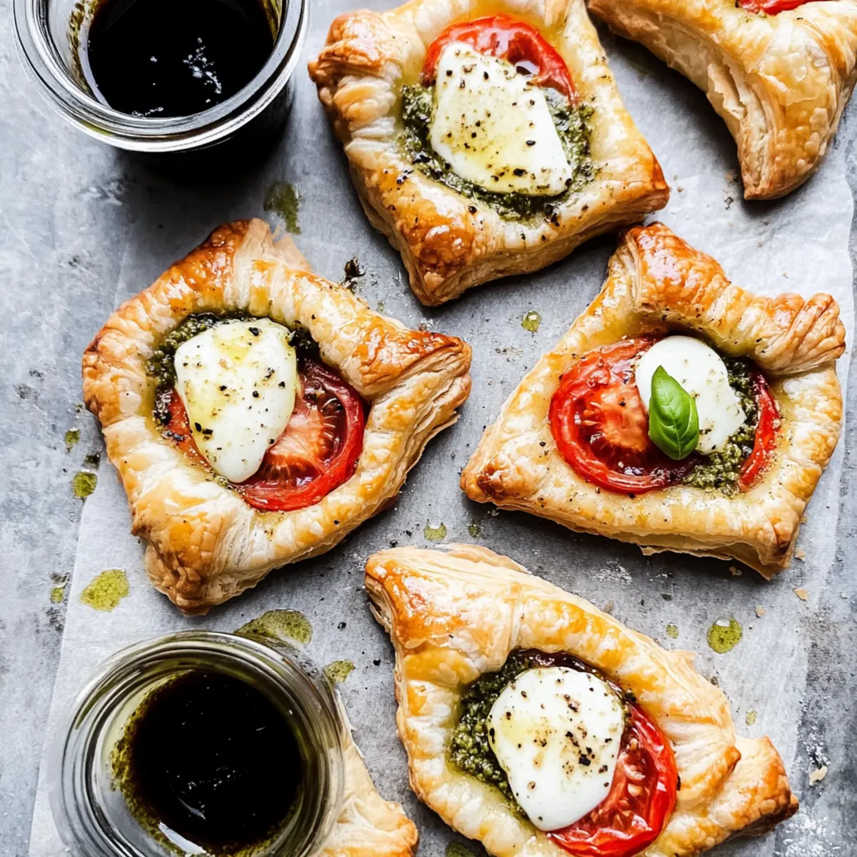 Jump to Recipe Print RecipeAs the sun shines brightly on a lazy afternoon, a fresh aroma wafts through the kitchen, instantly stirring up cravings. It’s no surprise that these Pesto Caprese Puff Pastries are my new go-to for effortless entertaining. With flaky puff pastry hugging vibrant homemade pesto, juicy Roma tomatoes, and melty mozzarella, they combine comfort with elegance in one delightful bite. The beauty of this appetizer lies in its simplicity—it’s easy to whip up in under 30 minutes, making it perfect for impromptu gatherings or when you just want to treat yourself. Plus, they bring a healthy twist to the table with fresh ingredients and that irresistible caprese flair. Curious how to create these golden treasures? Let’s dive in! Why Will You Love These Puff Pastries? Quick and Easy: These Pesto Caprese Puff Pastries are ready in under 30 minutes, making them an ideal option for last-minute gatherings or a comforting snack after a long day. Flavor Explosion: The rich pesto combined with fresh mozzarella and juicy tomatoes brings a delightful burst of flavor in every bite, elevating your snack game effortlessly. Versatile Ingredients: Feel free to get creative with the filling—try adding sun-dried tomatoes or swap mozzarella with burrata for a luscious twist. Crowd-Pleaser: These pastries are sure to impress your guests, making them a hit at parties or family dinners, alongside a refreshing salad or as part of a vibrant appetizer spread. Healthier Choice: With fresh ingredients and homemade pesto, you’re not just indulging but enjoying a wholesome treat that doesn’t compromise on taste. If you’re excited about this recipe, you might also love my Rhubarb Puff Tart for an equally delightful dessert! Pesto Caprese Puff Pastry Ingredients For the Pesto Walnuts – Adds a nutty flavor and texture to the pesto; substitute with pine nuts or almonds for a different taste. Fresh Basil Leaves – Provides a bright and aromatic flavor essential to the pesto; use parsley in a pinch, but the flavor will differ. Lemon Juice – Balances the richness of the pesto and adds acidity; substitute with vinegar if necessary. Salt – Enhances the overall flavors of pesto; adjust according to taste. Pepper – Adds a hint of spice; use black or white pepper based on preference. Garlic – Infuses the pesto with a robust flavor; adjust quantity for a milder taste. Olive Oil – Binds the pesto ingredients and adds richness; use avocado oil for a lighter alternative. Grated Parmesan Cheese – Offers a salty, savory note to the pesto; swap with nutritional yeast for a dairy-free version. For the Pastries Store-bought Puff Pastry – Provides the flaky crust for the pastries; ensure it’s fully thawed before use. Roma Tomatoes – Juicy and sweet, perfect for topping each pastry; substitute with heirloom or cherry tomatoes if preferred. Fresh Mozzarella – Melts beautifully and complements the other flavors; use burrata for extra creaminess. Small Basil Leaves – For garnish and added freshness. Balsamic Glaze – Adds sweetness and acidity when drizzled on top; store-bought is convenient, or consider making your own. Step‑by‑Step Instructions for Pesto Caprese Puff Pastries Step 1: Preheat the Oven Begin by preheating your oven to 400°F (200°C). As this warms up, line a baking sheet with parchment paper to ensure your Pesto Caprese Puff Pastries bake evenly and don’t stick. This preparation is crucial for achieving that golden, flaky exterior. Step 2: Make the Pesto In a food processor, combine walnuts, a pinch of salt, and peeled garlic cloves. Pulse these ingredients together until they form a chunky mixture. Next, add fresh basil leaves and lemon juice, pulsing to combine. Slowly drizzle in olive oil until the pesto achieves a smooth consistency, then fold in grated Parmesan cheese for an extra burst of flavor. Step 3: Prepare the Pastry On a floured surface, carefully roll out the thawed puff pastry. Use a sharp knife or pizza cutter to slice the pastry into 9 equal squares, approximately 4×4 inches. Ensure the squares are even for consistent baking, and keep the pastry lightly floured to avoid sticking. Step 4: Assemble the Pastries Take each pastry square and place a generous dollop of your freshly made pesto in the center. Follow with a slice of juicy Roma tomato and a piece of fresh mozzarella on top. Gently fold opposite corners of each square together, pinching the seams to seal them securely and create a delightful pocket. Step 5: Chill the Assembled Pastries Once all pastries are assembled, place them in the refrigerator for about 20 minutes. This step helps the pastries maintain their shape during baking, ensuring the filling stays neatly inside when cooked, resulting in perfectly puffed Pesto Caprese Puff Pastries. Step 6: Bake the Pastries After chilling, remove the pastries from the fridge. Brush each one with an egg wash made from a beaten egg for a beautiful golden finish. Sprinkle a touch of garlic salt and extra Parmesan on top. Bake for 20-25 minutes, or until the pastries are puffy and golden brown, filling your kitchen with irresistible aromas. Step 7: Cool and Serve Once baked, allow your Pesto Caprese Puff Pastries to cool slightly on the baking sheet. Drizzle with balsamic glaze and garnish with small basil leaves before serving. These delightful treats are best enjoyed warm, showcasing their flaky crust and flavorful filling! Pesto Caprese Puff Pastries: Endless Possibilities Customize your Pesto Caprese Puff Pastries with these delightful variations to suit your tastes and dietary needs! Nuts-Free: Omit the walnuts entirely for a nut-free pesto, and savor the fresh flavors without compromise. This means everyone can enjoy these tasty bites without any worry. Cheesy Twist: Substitute fresh mozzarella with burrata or goat cheese for a rich and creamy texture, giving your pastries an extra layer of indulgence. These delicious options elevate your fl