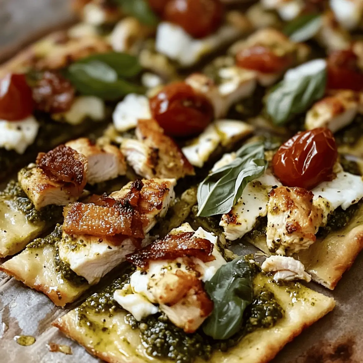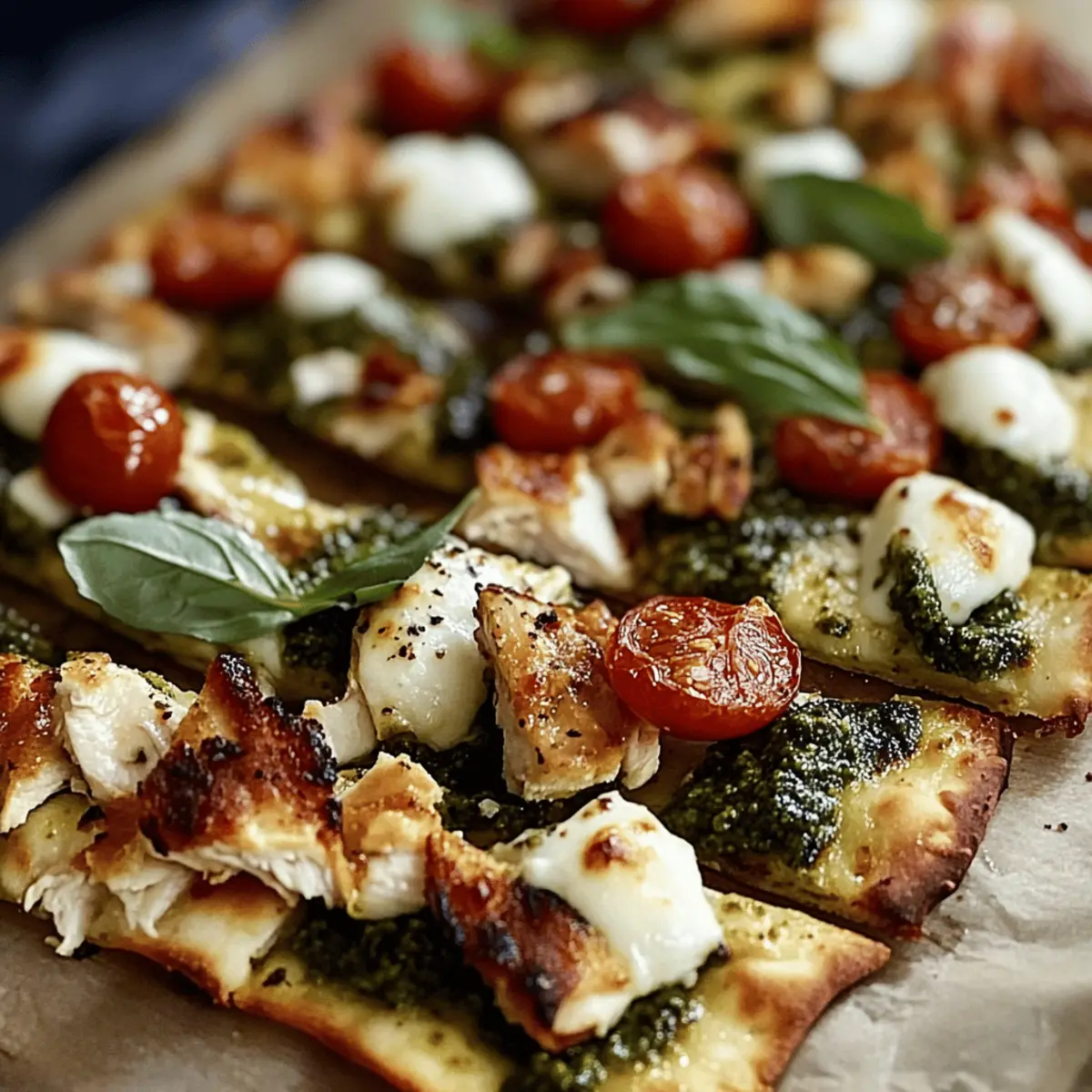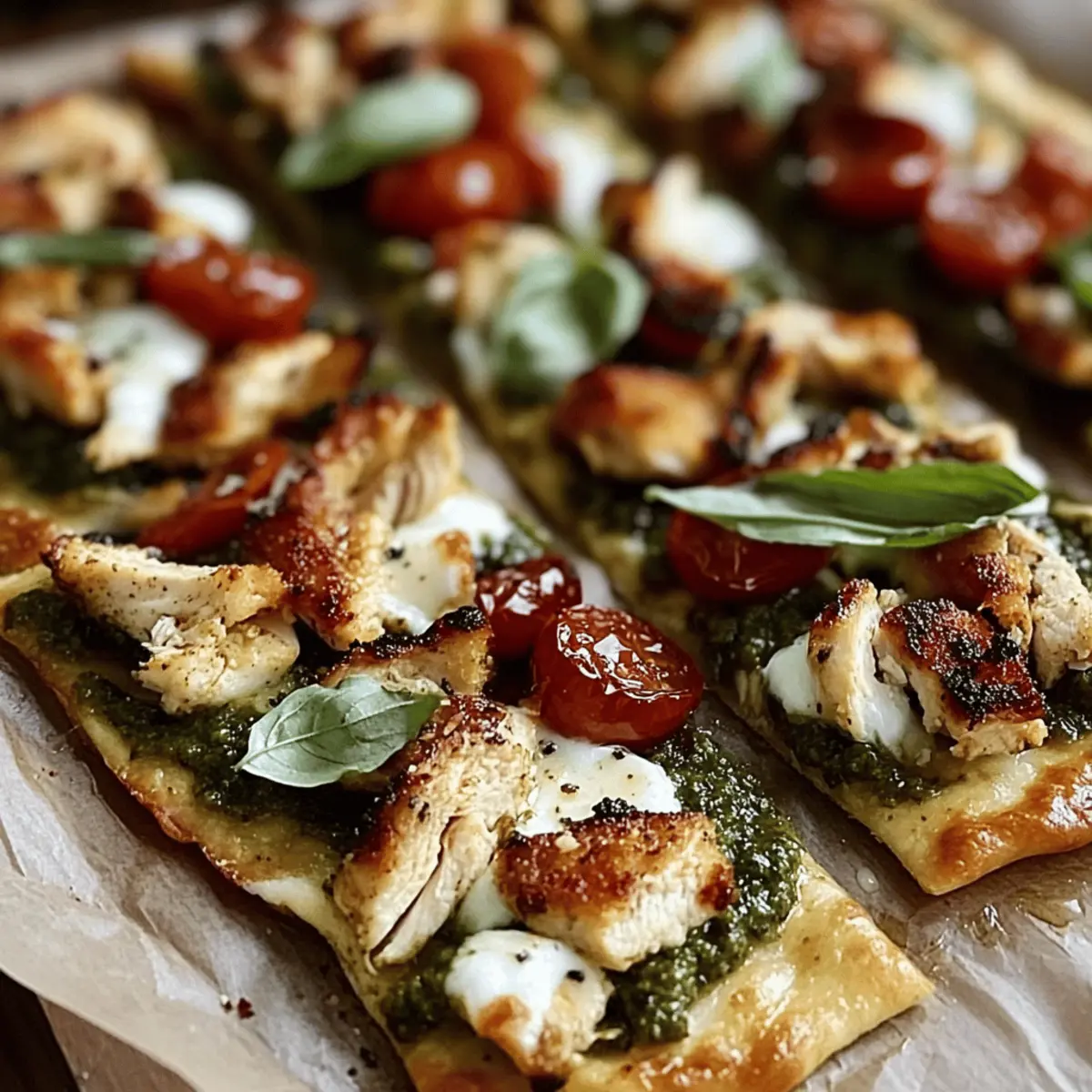 Jump to Recipe Print RecipeAs I pulled the golden flatbread from the oven, the enticing aroma of basil filled my kitchen, instantly inviting a sense of warmth and comfort. Today, I’m sharing my favorite quick dinner solution: Pesto Chicken Flatbread! This delightful dish brings together tender grilled chicken, vibrant basil pesto, and a crispy base in under 30 minutes. The best part? It’s not only easy to make but also incredibly versatile, so you can easily swap in your favorite veggies for a satisfying vegetarian option. Whether it’s a weeknight meal or a casual gathering, this Pesto Chicken Flatbread is sure to impress your family and friends. Are you ready to dive into a dish that’s as delicious as it is effortless? Let’s get started! Why is this Pesto Chicken Flatbread a must-try? Simplicity makes this dish a weeknight hero, bringing gourmet flavors to your table in under 30 minutes! Versatile enough for everyone, swap out chicken for grilled vegetables or tofu and create a delightful vegetarian option. Crispy, Cheesy Goodness awaits with a golden flatbread topped with gooey mozzarella and fresh tomatoes. Flavor-packed basil pesto harmonizes beautifully with tender chicken, creating a mouthwatering experience. Perfect for family dinners or casual gatherings, this flatbread will surely impress your guests—just don’t forget to pair it with a refreshing salad like Hawaiian Chicken Salad for an extra touch! Pesto Chicken Flatbread Ingredients Get ready to whip up something delicious! For the Flatbread 4 pieces of flatbread – A convenient base that crisps up wonderfully in the oven; consider making your own for a truly homemade experience! For the Chicken 2 large boneless, skinless chicken breasts – Provides hearty protein and texture; feel free to substitute with grilled vegetables or tofu for a vegetarian version. 2 tablespoons olive oil – Used for sauting the chicken and adding depth of flavor; can be replaced with avocado oil or melted butter. Salt and pepper, to taste – Enhances each flavor; adjust according to your preferences. For the Toppings 1 cup fresh basil pesto – A vibrant sauce that gives this dish an aromatic boost; it can be store-bought or homemade! 1 cup shredded mozzarella cheese – Melts beautifully for a creamy texture; experiment with cheddar or a dairy-free alternative if desired. 1/2 cup cherry tomatoes, halved – Adds a fresh, colorful touch; consider substituting with sun-dried tomatoes for a more intense flavor. 1/4 cup grated Parmesan cheese – Adds a zesty kick; omit for a vegan variant or substitute with nutritional yeast. For Garnish Fresh basil leaves (optional) – A lovely touch of freshness; arugula or spinach can also work well as substitutes. Now you’re all set to make your Pesto Chicken Flatbread! Step‑by‑Step Instructions for Pesto Chicken Flatbread Step 1: Preheat Your Oven Begin by preheating your oven to 400°F (200°C). This temperature ensures that your flatbread cooks evenly and achieves that perfect golden crispiness. While the oven warms up, gather your ingredients and line a baking sheet with parchment paper for easy cleanup. Step 2: Prepare the Chicken Pat the 2 large boneless, skinless chicken breasts dry with paper towels, then season them generously with salt, pepper, and optional garlic powder. This step enhances the flavors of the chicken and ensures a nice, tasty crust. Set aside while moving to the next step. Step 3: Cook the Chicken In a skillet, heat 2 tablespoons of olive oil over medium-high heat. Once the oil shimmers, add the seasoned chicken breasts carefully. Cook for about 6-7 minutes on each side or until they turn golden brown and the internal temperature reaches 165°F (75°C). Use a meat thermometer for accuracy; this step is key to a perfectly cooked chicken. Step 4: Slice and Rest After cooking, transfer the chicken to a plate and let it rest for 5 minutes. This resting period allows the juices to redistribute, resulting in tender chicken. Once rested, slice the chicken into thin strips, ready to adorn your Pesto Chicken Flatbread. Step 5: Assemble the Flatbreads Take the flatbreads and place them on the prepared baking sheet. Spread a generous layer of 1 cup of fresh basil pesto over each flatbread, ensuring an even coating. The pesto adds vibrant flavor and moisture to your dish, setting the base for what’s to come. Step 6: Add Chicken Evenly distribute the sliced chicken over the pesto-covered flatbreads, ensuring all pieces are well-placed and that no slice is left behind. This way, every bite of your Pesto Chicken Flatbread will be bursting with flavor and the satisfying texture of juicy chicken. Step 7: Top with Cheese and Tomatoes Sprinkle 1 cup of shredded mozzarella cheese over the chicken, followed by 1/2 cup of halved cherry tomatoes. The mozzarella will melt beautifully as it bakes, while the tomatoes add a fresh, colorful touch. For added flavor, finish with 1/4 cup of grated Parmesan cheese over the top. Step 8: Bake the Flatbreads Place the baking sheet with the assembled flatbreads in the oven and bake for 10-12 minutes, or until the cheese is melted and the edges of the flatbread are golden. Keep a close eye on them towards the end to achieve that perfect crispiness. Step 9: Broil for Extra Crispness For an added touch of texture, you can broil the flatbreads for 1-2 minutes after baking. This will give you an extra crispy finish, but watch closely to prevent burning. The result will be a delightful contrast of textures in your Pesto Chicken Flatbread. Step 10: Serve and Garnish Once baked, let the flatbreads cool slightly before slicing them into quarters or halves. If desired, garnish with fresh basil leaves to add a pop of color and a hint of freshness. Serve your delicious Pesto Chicken Flatbread warm and prepare for smiles all around! What to Serve with Pesto Chicken Flatbread The warmth of basil and the comfortable crunch of flatbread create a wonderful canvas 