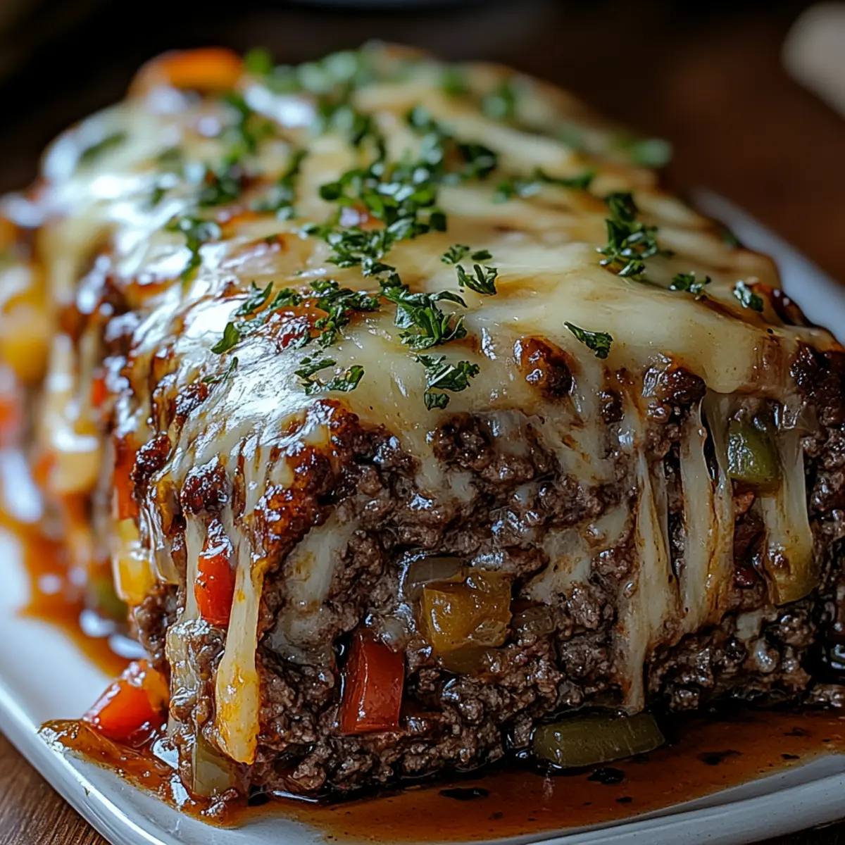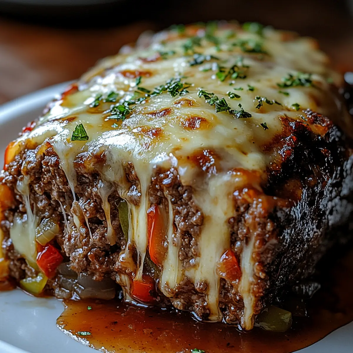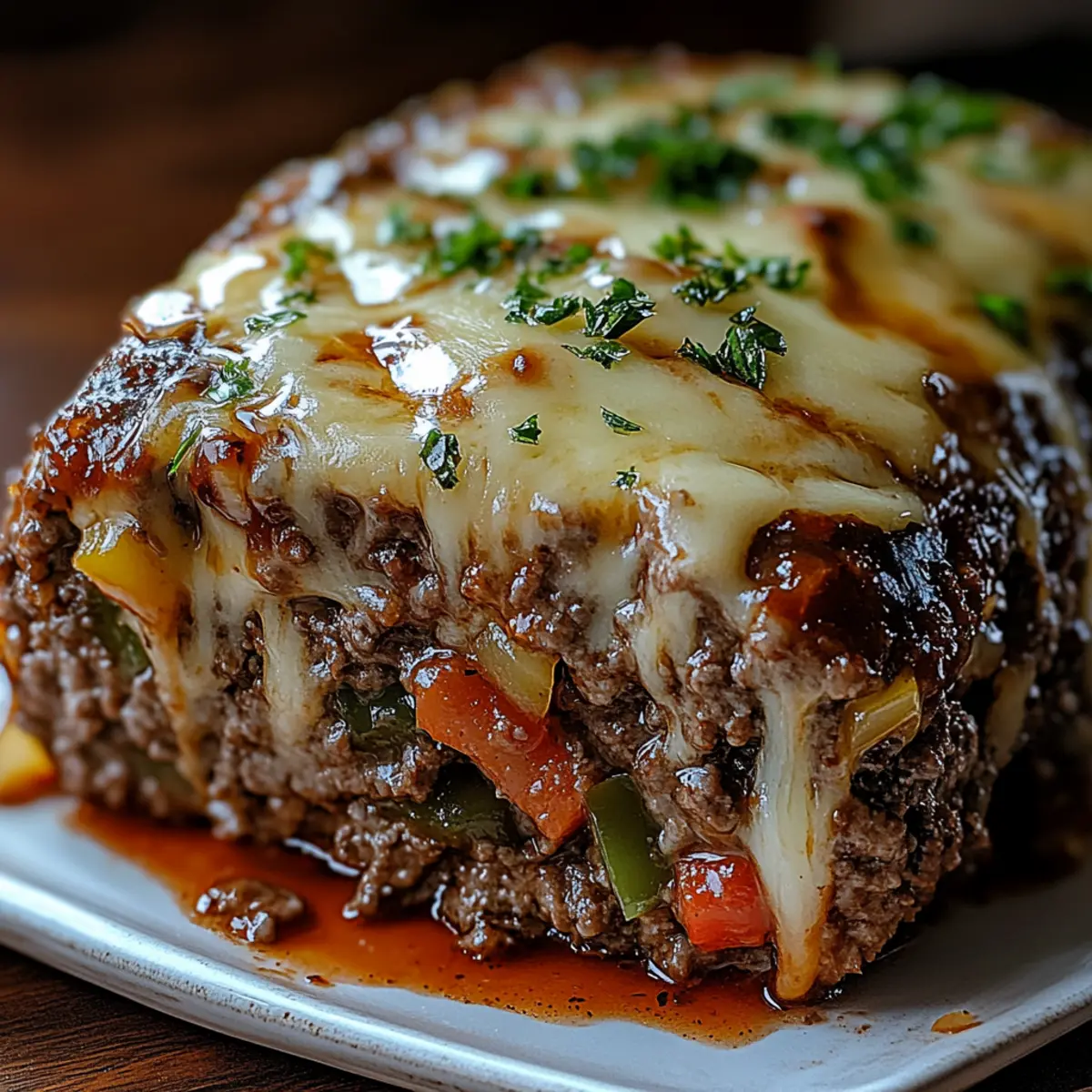 Jump to Recipe Print RecipeThe aroma wafting through my kitchen took me back to my childhood—Sunday dinners filled with laughter and my mom’s comforting creations. Today, I’m thrilled to share my favorite twist on a classic: Philly Cheesesteak Meatloaf. This delightful dish combines the robust flavors of a cheesesteak—notably the tender beef, savory sautéed onions, and melted cheese—infused into the heartwarming embrace of traditional meatloaf. Not only is it a family-friendly meal that pleases even the pickiest eaters, but it also offers the satisfaction of hearty comfort food that warms the soul. Plus, it’s easy to prepare, making it the perfect addition to your weeknight repertoire. So, why not celebrate dinner tonight with a slice of comfort? What will you pair it with? Why is Meatloaf So Comforting? Heartwarming Flavor: This Philly Cheesesteak Meatloaf brings together savory beef, melted cheese, and sautéed veggies for a taste that feels like a warm hug. Family-Friendly Delight: Perfect for picky eaters, this dish pleases all ages and makes family dinners an occasion to remember. Quick to Prepare: Ready in under an hour, it’s a fantastic weeknight option that doesn’t compromise on flavor or satisfaction. Versatile Pairings: Serve it with mashed potatoes, roasted veggies, or even a crisp salad for a balanced meal. This recipe is your new go-to for homey comfort! Memorable Leftovers: Enjoy the leftovers for lunch or dinner, keeping the flavor alive—just warm them up and savor the comfort all over again. Looking for more easy dinner ideas? Check out my easy weeknight meals for delicious options! Philly Cheesesteak Meatloaf Ingredients For the Meatloaf Ground Beef – the main protein that gives this dish its hearty flavor; you can swap it for ground turkey for a lighter option. Bread Crumbs – these add texture and help bind the meatloaf; gluten-free breadcrumbs work beautifully if needed. Egg – essential as a binder to keep everything together; there’s no direct substitute for its role. Milk – adds moisture for a tender result; feel free to use almond milk for a dairy-free alternative. Diced Onion – provides a wonderful aromatic flavor; shallots make a milder substitute if you prefer. Diced Green Pepper – this ingredient adds sweetness and crunch; you can switch it with diced celery or more mushrooms if desired. Sliced Mushrooms – contribute earthiness and moisture; canned mushrooms can save you if fresh aren’t available. Worcestershire Sauce – enhances the umami flavor in the meatloaf; soy sauce can be a quick alternative. Garlic Powder – introduces depth of flavor; fresh minced garlic amps it up even more, should you choose. Salt and Pepper – essential for balancing flavors; be sure to adjust to your personal taste. Provolone Cheese – adds a creamy, tangy touch; mozzarella or cheddar are great alternatives for different flavor profiles. For the Glaze Beef Broth – delivers moisture and flavor; chicken broth can replace it if you prefer. Ketchup – provides sweetness and tang in the glaze; BBQ sauce is a delicious alternative for a smoky twist. Brown Sugar – enhances sweetness in the glaze; honey or maple syrup can be used for a natural touch. Mustard – adds a hint of tanginess; yellow mustard is versatile while Dijon offers a refined taste. With these Philly Cheesesteak Meatloaf ingredients, you’re well on your way to crafting a comforting meal that will become a cherished family favorite! Step‑by‑Step Instructions for Philly Cheesesteak Meatloaf Step 1: Sauté Vegetables In a large skillet over medium heat, add a drizzle of oil and sauté the diced onions, green peppers, and sliced mushrooms until they become tender and slightly golden, about 5-7 minutes. Stir occasionally to prevent sticking, and then remove from heat. Allow the sautéed vegetables to cool for a few minutes while you prepare the meat mixture. Step 2: Mix Meatloaf In a spacious mixing bowl, combine the ground beef, breadcrumbs, egg, milk, Worcestershire sauce, garlic powder, and the cooled sautéed vegetables. Season with salt and pepper to taste. Gently mix the ingredients using your hands or a spatula, being careful not to overwork the mixture for a tender Philly Cheesesteak Meatloaf. Step 3: Assemble Meatloaf Preheat your oven to 350°F (175°C) and grease a loaf pan with non-stick spray or a light coat of oil. In the prepared pan, press half of the meat mixture evenly across the bottom. Layer slices of provolone cheese on top, then top with the remaining meat mixture, sealing the edges well to prevent cheese from oozing out during baking. Step 4: Make the Glaze In a small bowl, whisk together the beef broth, ketchup, brown sugar, and mustard until well combined. This sweet and tangy glaze will add extra flavor to the Philly Cheesesteak Meatloaf. Brush half of the glaze over the top of the meatloaf for a delicious coating before baking. Step 5: Bake Place your assembled meatloaf in the preheated oven and bake for 45-50 minutes, or until the internal temperature reaches 160°F (70°C). During the last 10 minutes of baking, brush on the remaining glaze to create a glossy, flavorful finish. Keep an eye on the edges to prevent burning. Step 6: Rest and Serve Once baked, remove the Philly Cheesesteak Meatloaf from the oven and let it rest for 10 minutes. This resting period allows the juices to redistribute for a moist loaf. Slice it carefully, garnish with fresh parsley if desired, and serve with your favorite sides, such as mashed potatoes or a fresh salad. Helpful Tricks for Philly Cheesesteak Meatloaf Gentle Mixing: Avoid overmixing the meat mixture to keep your Philly Cheesesteak Meatloaf tender. Overworking can make it dense and chewy. Temperature Check: Use a meat thermometer to ensure the internal temperature reaches 160°F (70°C). This ensures safety and prevents overcooking. Pan Choice: Opt for a loaf pan with higher sides to catch the juices while bak