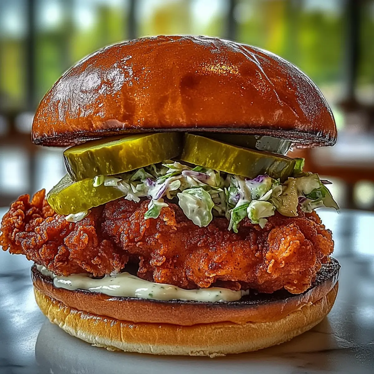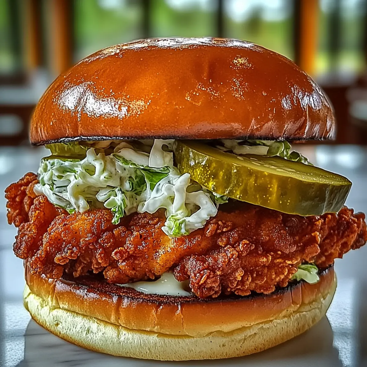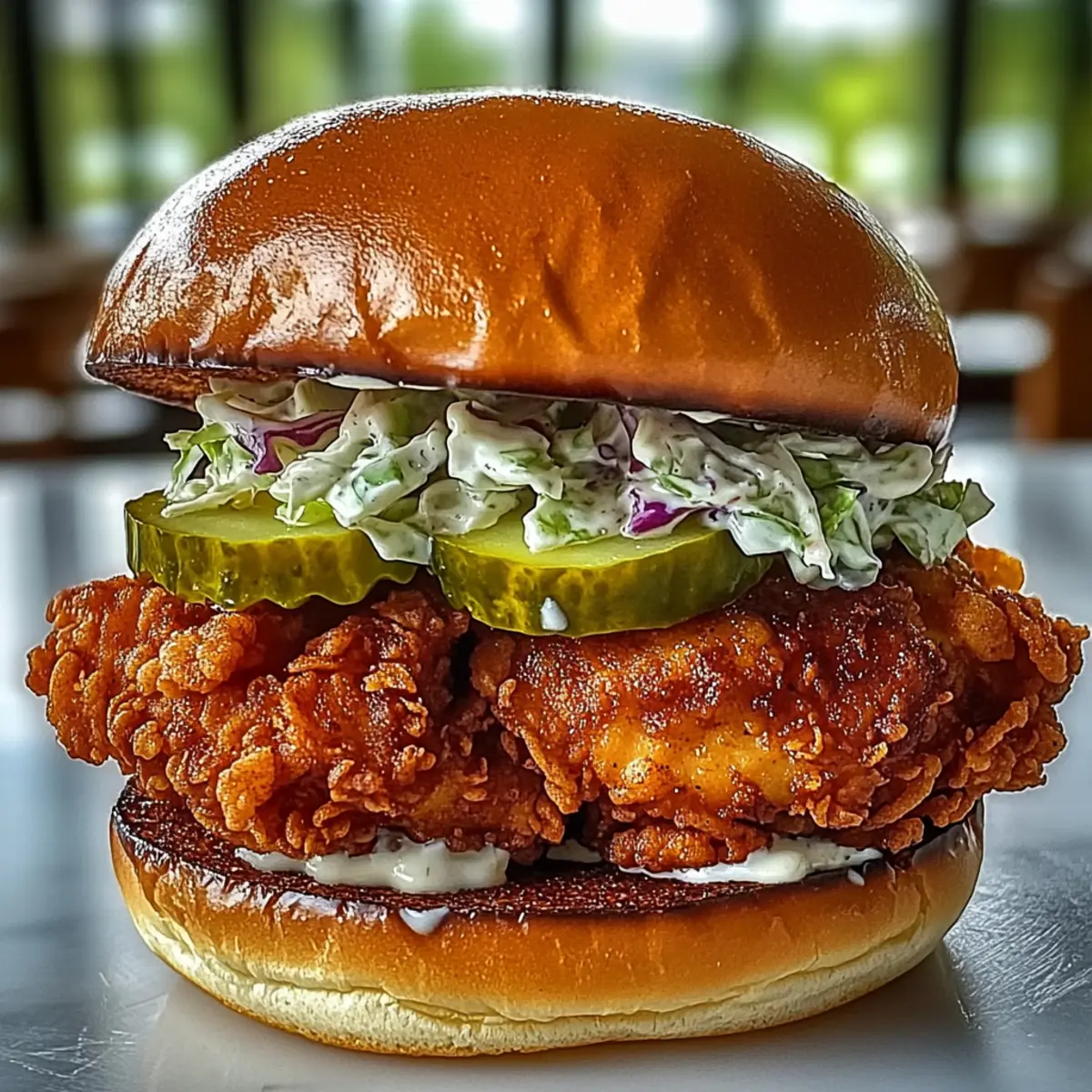 Jump to Recipe Print RecipeThe golden hue of frying chicken fills my kitchen with an irresistible aroma, instantly sparking joy and hunger. Today, I’m sharing my recipe for the Pickle Brined Fried Chicken Sandwich—a delightful twist on a classic that’s perfect for any mealtime craving. This scrumptious sandwich features crispy chicken thighs soaked in tangy dill pickle juice, stacked with a creamy slaw and crunchy pickles—all enveloped in a fluffy brioche bun. Not only is it a guaranteed crowd-pleaser, but it also transforms your weeknight dinner into something special with minimal fuss. Whether you’re hosting game day or simply looking to elevate a satisfying meal at home, this easy dinner option will satisfy your comfort food cravings. So, are you ready to indulge in some crispy goodness? Why is this fried chicken sandwich irresistible? Crispy Perfection: Every bite of this sandwich brings an incredible crunch, thanks to the perfectly seasoned flour and cornstarch coating. Juicy Delight: The pickle brine not only flavors the chicken but ensures it stays tender and succulent, elevating your homemade sandwich game. Easy to Make: With simple ingredients and straightforward steps, you can whip this up even on busy weeknights. Versatile Choices: Feel free to add your favorite toppings or swap in different pickles, like spicy ones for some heat. Crowd-Pleasing Flavor: Whether you’re serving it at a family dinner or a gathering with friends, this sandwich is bound to steal the spotlight! Check out our Chicken Bacon Ranch for a fresh side that complements it perfectly. Pickle Brined Fried Chicken Sandwich Ingredients For the Chicken Chicken Thighs – Juicy, boneless skinless thighs provide moisture and flavor. Substitution: Chicken breasts can be used but may need pounding for even cooking. Dill Pickle Juice – Acts as a brine to tenderize the chicken and add tangy flavor. Note: Use standard dill pickle juice for best results. Buttermilk – Enhances tenderness and helps the flour coating adhere for optimal crispiness. Note: Can be substituted with milk mixed with a bit of vinegar. For the Coating All-Purpose Flour – Essential for creating a golden-brown, crispy coating. Note: No direct substitutions recommended for the fry purpose. Cornstarch – Lightens the flour for extra crunch. Substitution: None recommended in frying context. Cajun Seasoning – Adds bold and peppery flavors to the breading. Substitution: Adjust to a milder seasoning if desired. Garlic Powder & Paprika – Provide additional savory depth and color. Notes: Fresh garlic can be used, but adjustments may be needed for flavor strength. For the Sandwich Assembly Brioche Buns – Soft, slightly sweet buns that complement the salty chicken. Substitution: Any soft sandwich bun can work. Mayonnaise – Adds creaminess to the sandwich. Substitution: Greek yogurt can be used for a lighter option. Green Leaf Lettuce – Brings freshness and color. Substitution: Other lettuce varieties can be used. Coleslaw Mix – Shredded cabbage and carrot add crunch and moisture. Substitution: Freshly shredded cabbage and carrots can replace pre-made mixes. Apple Cider Vinegar – Provides a zesty kick to the slaw. Substitution: White vinegar can work in a pinch. Sugar, Salt & Pepper – Balance and enhance flavor within the slaw. Thick-Cut Dill Pickles – Provide extra crunch and amplify the briny flavor. Substitution: Bread-and-butter or spicy pickles for an alternative taste. Fresh Chives (Optional) – For garnish and a mild oniony scent. Step‑by‑Step Instructions for Pickle Brined Fried Chicken Sandwich Step 1: Marinate the Chicken Begin by placing your boneless skinless chicken thighs in a large bowl. Pour in enough dill pickle juice to completely cover the chicken, and let it marinate in the refrigerator for at least 1 hour, or overnight for deeper flavor. This pickle brined step is crucial for tender and juicy chicken that packs a punch of flavor. Step 2: Prepare the Slaw While your chicken is marinating, mix up the slaw. In a separate bowl, combine coleslaw mix, 3 tablespoons of mayonnaise, apple cider vinegar, sugar, salt, and pepper. Stir everything together until the cabbage and carrots are well coated. Allow the slaw to chill in the refrigerator while you focus on the chicken, letting the flavors meld beautifully. Step 3: Set Up the Breading Station Now it’s time to create your crispy coating! In a shallow dish, combine all-purpose flour, cornstarch, Cajun seasoning, garlic powder, and paprika. Mix thoroughly. Once your chicken has marinated, remove it from the refrigerator, pat it dry with paper towels, and dredge each piece thoroughly in the flour mixture, pressing down to ensure the coating adheres well. Step 4: Fry the Chicken Heat oil in a deep skillet or Dutch oven to 350°F (175°C). Carefully add the breaded chicken thighs to the hot oil, being cautious not to overcrowd the pan. Fry each piece for about 5-6 minutes per side, until golden brown and crisp, ensuring the chicken reaches an internal temperature of 165°F (74°C). Once cooked, drain the chicken on a wire rack to maintain its crunch. Step 5: Toast the Buns and Assemble To finish your Pickle Brined Fried Chicken Sandwich, toast the brioche buns until golden brown. Spread a generous layer of mayonnaise on the bottom half of each bun, then layer on fresh green leaf lettuce. Add the crispy fried chicken, followed by a generous helping of coleslaw and thick-cut dill pickles. Cap each sandwich with the top half of the bun and get ready to dive into this delicious homemade delight! Storage Tips for Pickle Brined Fried Chicken Sandwich Fridge: Store leftover fried chicken in an airtight container for up to 3 days to retain moisture and flavor. Keep the buns and toppings separate to maintain their crispiness. Freezer: For longer storage, wrap fried chicken tightly in plastic wrap and then in aluminum foil before freezing. This method preserves quality 