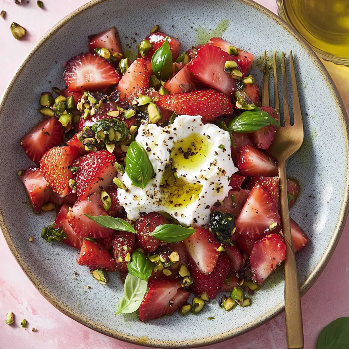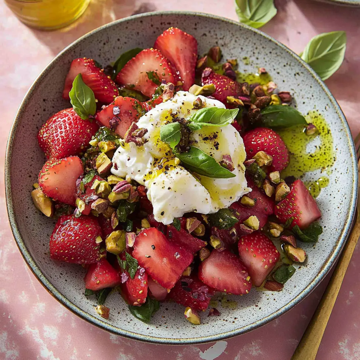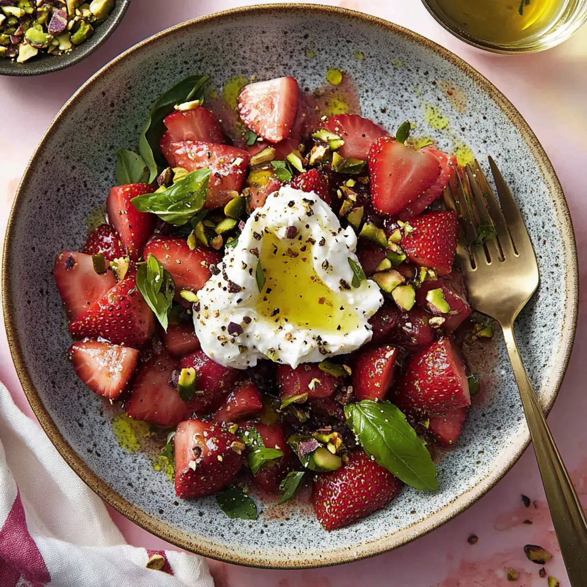 Jump to Recipe Print RecipeAs I stood in my kitchen, the vibrant colors of fresh spring produce caught my eye, making it impossible to resist the idea of a bright, zesty salad. Today, I’m thrilled to share my Pickled Rhubarb & Strawberry Salad with Burrata—a celebratory dish that balances the sweetness of ripe strawberries with the tangy crunch of quick-pickled rhubarb. Not only does this salad make a stunning appetizer, but it’s also a marvelous way to elevate your weeknight dinners. With its refreshing flavors and a creamy burrata nestled in the center, it’s a delightful crowd-pleaser that even picky eaters will adore. Ready to create a unique culinary experience that will have everyone asking for seconds? Let’s dive into this fresh and flavorful journey together! Why is This Salad So Special? Bursting with Flavor: The vibrant combination of juicy strawberries and tangy pickled rhubarb creates a mouthwatering symphony of sweet and tart notes that will awaken your taste buds. Creamy Goodness: With the luxurious burrata at its center, each bite envelops you in creamy richness, perfectly balancing the crunchy textures of the salad. Easily Customizable: Feel free to swap rhubarb for thinly sliced cucumber or replace burrata with goat cheese for a refreshing twist that caters to your preferences. Effortless Preparation: Quick pickling makes this dish easy and fast, ideal for busy weeknights or impressing guests at a dinner party. Colorful Presentation: The stunning colors make this salad a feast for the eyes, perfect for any occasion, and pairs beautifully with grilled meats or as a light appetizer. Try it alongside a Macaroni Salad Flavor for a delightful summer spread! Pickled Rhubarb & Strawberry Salad Ingredients For the Pickling • Rhubarb – Provides tartness and crunch; remember to only use the stalks, cut into small chunks. • White Balsamic Vinegar – Acts as the pickling agent; champagne vinegar can be a delightful substitute. • Sugar – Adds the sweetness needed to balance the tart rhubarb; honey works well if you prefer a natural option. • Kosher Salt – Enhances the flavors in the pickling solution. • Fennel Seeds – Gives a subtle aromatic flavor; optional for those who like a different profile. For the Salad Base • Strawberries – The star of this dish, providing sweetness and juiciness, quartered or sliced. • Orange Zest – Infuses a refreshing citrus aroma; fresh zest is best for flavor. • Fresh Basil Leaves – Adds a fragrant herbal note when torn or sliced into ribbons. • Chopped Toasted Pistachios – Contributes crunch and richness; substitute with toasted almonds for variety. For the Finish • Burrata Cheese – The creamy texture is essential for finishing this salad. • Extra Virgin Olive Oil – For drizzling, enhancing the richness of the salad. • Black Sesame Seeds – Optional garnish that adds texture and visual appeal. • Flaky Sea Salt & Black Pepper – For seasoning to taste, perfect for bringing all flavors together. Enjoy crafting this Pickled Rhubarb & Strawberry Salad that promises to be a vibrant addition to your table! Step‑by‑Step Instructions for Pickled Rhubarb & Strawberry Salad Step 1: Pickle the Rhubarb In a medium saucepan, combine 1 cup of white balsamic vinegar, 1/4 cup of sugar, 1 tablespoon of kosher salt, and 1 teaspoon of fennel seeds. Bring the mixture to a gentle simmer over medium heat, stirring until the sugar dissolves, about 1-2 minutes. Pour this hot pickling solution over 2 cups of thinly sliced rhubarb in a bowl, ensuring it’s fully submerged. Allow it to cool to room temperature, then refrigerate for at least 1 hour. Step 2: Prepare Salad Mixture In a large mixing bowl, add 2 cups of quartered strawberries and zest from 1 orange. Toss in 1/4 cup of torn fresh basil leaves and 1/4 cup of chopped toasted pistachios. Gently mix these ingredients, allowing the fragrant basil and sweet strawberries to meld together. This vibrant salad base will beautifully complement the tangy pickled rhubarb when combined. Step 3: Combine Ingredients After the rhubarb has chilled, strain it to remove excess liquid, reserving about 2 tablespoons of the pickling solution. Add the pickled rhubarb to the salad mixture, gently folding to avoid crushing the strawberries. The combination of flavors from the Pickled Rhubarb & Strawberry Salad will create a delightful contrast as you incorporate the tartness of the rhubarb with the sweetness of the strawberries. Step 4: Dress the Salad Drizzle 2 tablespoons of extra virgin olive oil and the reserved pickling liquid over the salad mixture. Season with flaky sea salt and freshly cracked black pepper to taste. Carefully toss the ingredients together to ensure everything is evenly coated. This step adds richness and enhances the fresh flavors, making your Pickled Rhubarb & Strawberry Salad even more appetizing. Step 5: To Serve Transfer the vibrant salad to a serving platter, creating a lovely nest in the center for the burrata. Gently tear open the burrata cheese and place it right in the middle of the salad, allowing its creamy texture to enhance each bite. Finish with a sprinkle of black sesame seeds for an elegant touch and drizzle a little more olive oil for added richness before serving with toasted bread or crostini. What to Serve with Pickled Rhubarb & Strawberry Salad with Burrata Elevate your dining experience by exploring these delightful pairings, perfectly complementing the vibrant flavors of your salad. Grilled Chicken: Juicy, herb-marinated grilled chicken adds a savory element that balances the sweetness of the salad. Plus, it’s an easy protein option for a well-rounded meal. Crispy Crostini: Serve alongside crispy crostini for a satisfying crunch. These bite-sized delights are perfect for scooping up creamy burrata and picking up all the vibrant flavors of the salad. Quinoa Pilaf: A light and fluffy quinoa pilaf, complemented with herbs and lemon, pr