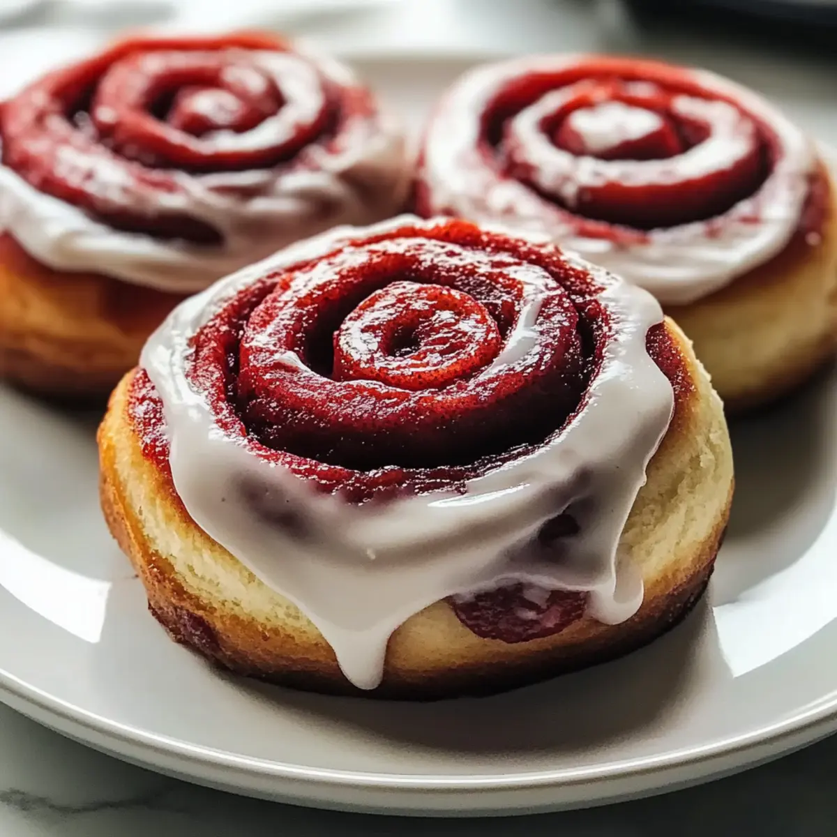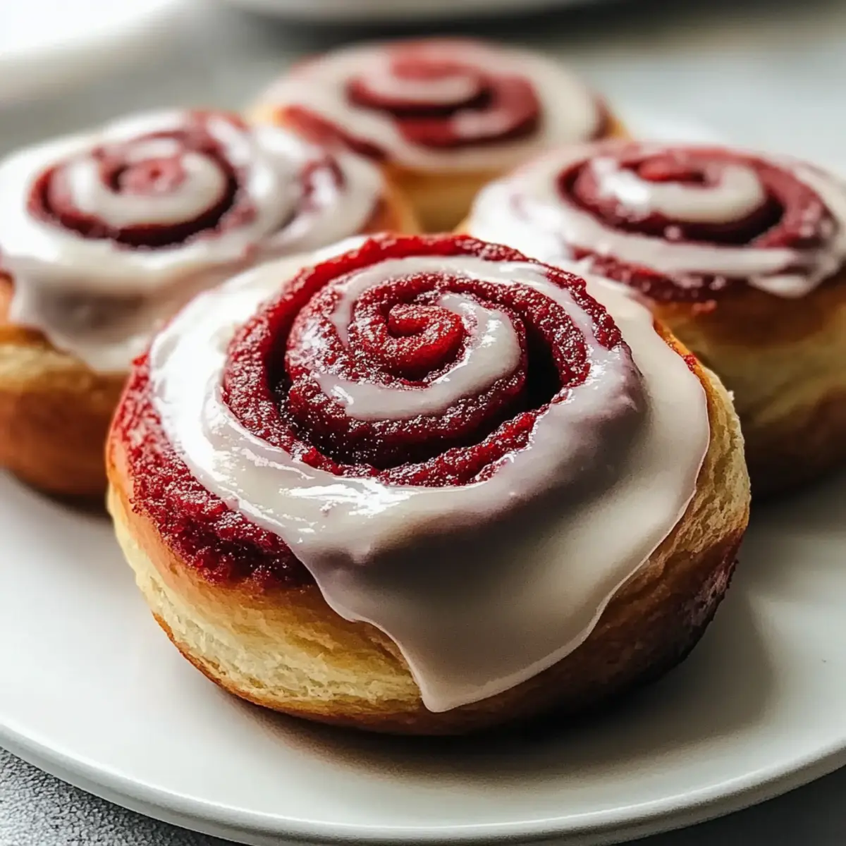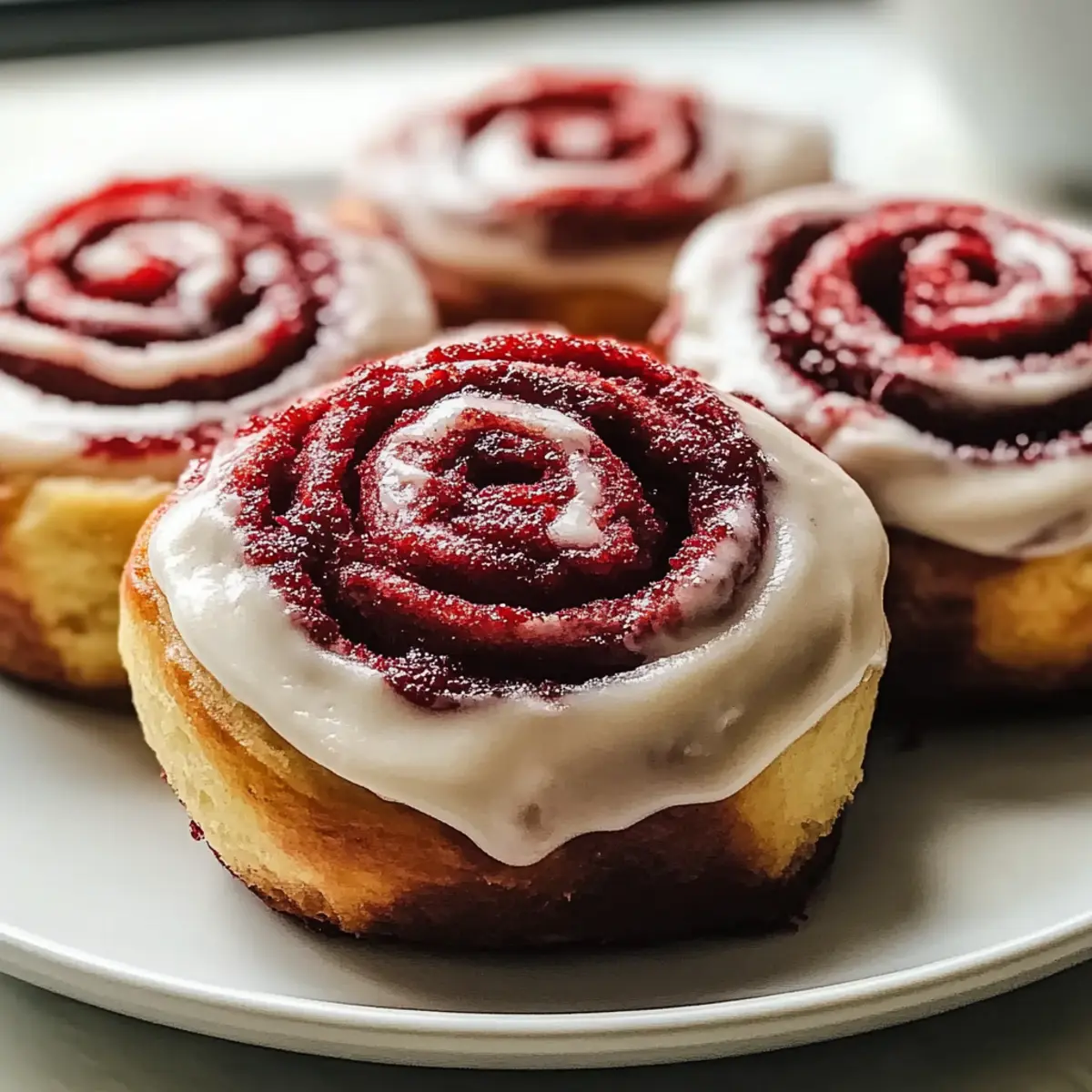 Jump to Recipe Print RecipeThere’s something magical about those weekends when the sweet smell of freshly baked goods fills the air, isn’t there? Today, I’m excited to share my go-to recipe for Red Velvet Cinnamon Rolls From Scratch, a delightful blend of rich flavors and cozy vibes that transforms any morning into a special occasion. With their vibrant crimson hue and fluffy texture, these rolls not only impress but also make for a perfect treat for gatherings or quiet days at home. Plus, they come together surprisingly quickly and are easy enough for bakers of all skill levels. Are you ready to dive into a baking adventure that will warm your heart and have everyone asking for seconds? Let’s roll! Why are these Red Velvet Cinnamon Rolls special? Irresistible Flavor: The moment you take a bite, the sweetness of the rolls combined with the hint of cocoa and cinnamon creates a flavor explosion you won’t forget. Visual Delight: Their stunning red hue makes these rolls a showstopper at any gathering, turning simple breakfasts into festive celebrations. Easy to Make: Don’t worry if you’re a beginner; the step-by-step process is straightforward and forgiving, ensuring success for bakers of all levels. Versatile Options: Whether you want to add chocolate chips or nuts, this recipe invites your creativity. Plus, consider pairing these with a cup of coffee or tea for the ultimate indulgence. Crowd-Pleasing Appeal: Perfect for brunch with friends or a cozy family gathering, these rolls are bound to become a staple in your recipe collection. Don’t forget to explore delightful variations like our Cinnamon Sugar Air Fryer Banana Chips to serve alongside! Red Velvet Cinnamon Rolls Ingredients • For the Dough All-Purpose Flour – Provides structure; substitute with gluten-free flour blend for a gluten-free option. Granulated Sugar – Adds sweetness; can replace with brown sugar for a richer flavor. Cocoa Powder – Enhances color and flavor; use unsweetened cocoa powder for best results. Active Dry Yeast – Leavening agent for rise; ensure it is fresh for optimal results. Salt – Balances sweetness and enhances flavors; no direct substitute recommended. Milk – Adds moisture and richness; substitute with non-dairy milk for a vegan version. Butter – Adds richness and flavor; use vegan butter for a dairy-free option. Eggs – Helps with texture and rise; for a vegan option, replace with flax eggs. Red Food Coloring – Provides signature color; omit for traditional cinnamon rolls if preferred. • For the Frosting Cream Cheese – Adds tanginess and creaminess to the frosting; use a dairy-free alternative if needed. Powdered Sugar – Sweetens the frosting; no direct substitute suggested. Vanilla Extract – Enhances overall flavor; consider using almond extract for a unique twist. Step‑by‑Step Instructions for Irresistible Red Velvet Cinnamon Rolls From Scratch Step 1: Prepare the Dough Start by warming 1 cup of milk to about 110°F (43°C) and combine it with 2 ¼ teaspoons of active dry yeast and a pinch of sugar in a mixing bowl. Let it rest for 5-10 minutes until frothy. Then, mix in ¼ cup of melted butter, ½ cup of granulated sugar, 1 beaten egg, 2 tablespoons of unsweetened cocoa powder, and ½ teaspoon of salt. Gradually add 3-4 cups of all-purpose flour until the dough is smooth and elastic. Step 2: First Rise Transfer your kneaded dough into a greased bowl and cover it with a clean kitchen towel. Place it in a warm spot and let it rise for about 1 hour, or until it has doubled in size. This critical step is essential for achieving airy Red Velvet Cinnamon Rolls, so keep an eye on the dough for that lovely puffiness. Step 3: Shape Rolls Once the dough has risen, punch it down gently to release the air. Roll it out into a 16×12 inch rectangle on a lightly floured surface. Spread ¼ cup of softened butter evenly over the dough, then sprinkle a generous mix of ¾ cup of sugar and 2 tablespoons of cinnamon. Roll the dough tightly into a log, sealing the edges, and cut it into 12 equal pieces. Place these in a greased baking dish, spacing them evenly. Step 4: Second Rise Cover the baking dish with the kitchen towel once more and allow the rolls to rise for about 30 minutes in a warm environment. During this time, they will puff up beautifully, enlarging each roll, which is necessary for that soft, fluffy texture that makes these Red Velvet Cinnamon Rolls so irresistible. Step 5: Bake Preheat your oven to 350°F (175°C). After the second rise, bake the rolls in the preheated oven for 25-30 minutes or until they turn a luscious golden brown on top. The aroma will fill your kitchen, showcasing the delightful combination of flavors. Remove them from the oven and let them cool slightly in the pan before frosting. Step 6: Frost While the rolls cool, prepare the cream cheese frosting by mixing 8 ounces of softened cream cheese, 2 cups of powdered sugar, and 1 teaspoon of vanilla extract until smooth and fluffy. Once the Red Velvet Cinnamon Rolls have cooled for about 10 minutes, generously spread the frosting on top, allowing it to melt slightly into the warm rolls for an extra creamy touch. Expert Tips for Red Velvet Cinnamon Rolls Check Yeast Freshness: Always ensure your active dry yeast is fresh—if it doesn’t froth after 10 minutes in warm milk, it’s best to start over for perfect Red Velvet Cinnamon Rolls. Perfectly Fluffy Rolls: Never skip the second rise! It creates the light texture that makes these rolls so delicious. Avoid Sticky Dough: If your dough feels overly sticky while kneading, add flour a tablespoon at a time until smooth—not too much or it can dry out the rolls. Cooling Time: Let the rolls cool for about 10 minutes before frosting; this prevents the icing from melting away and gives a lovely creamy finish. Customize Flavor: Feel free to experiment! Adding chocolate chips or a hint of almond extract in the frosting can create delightful variations