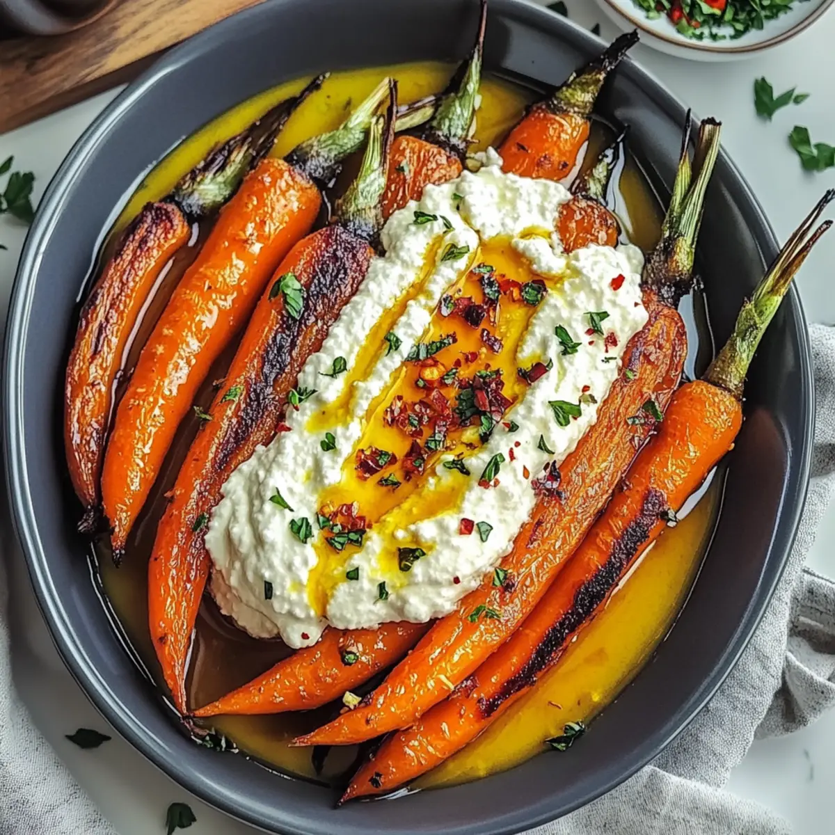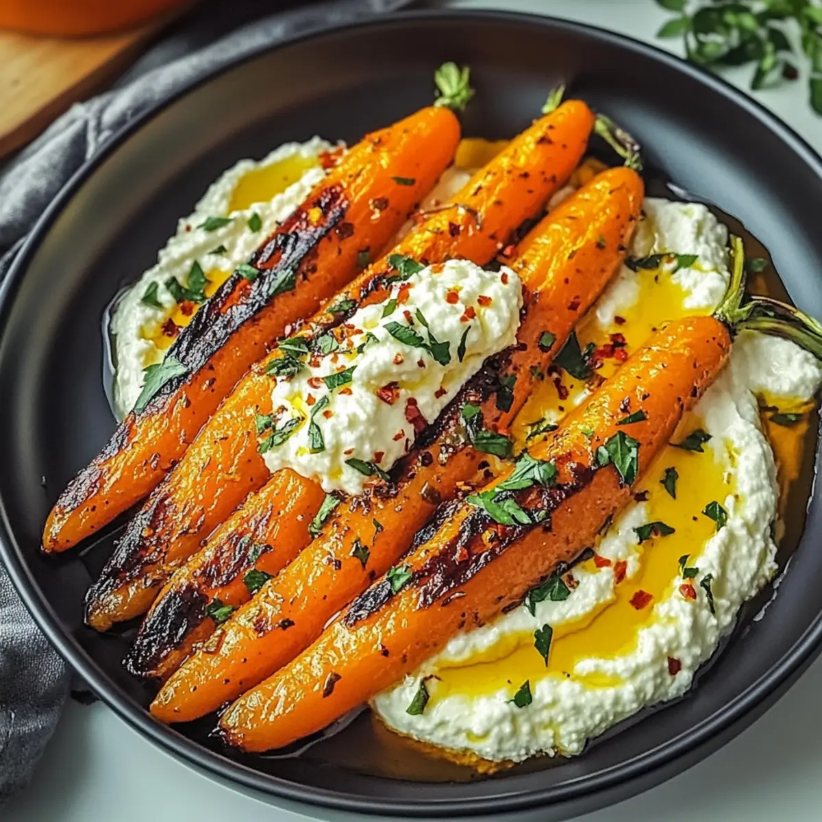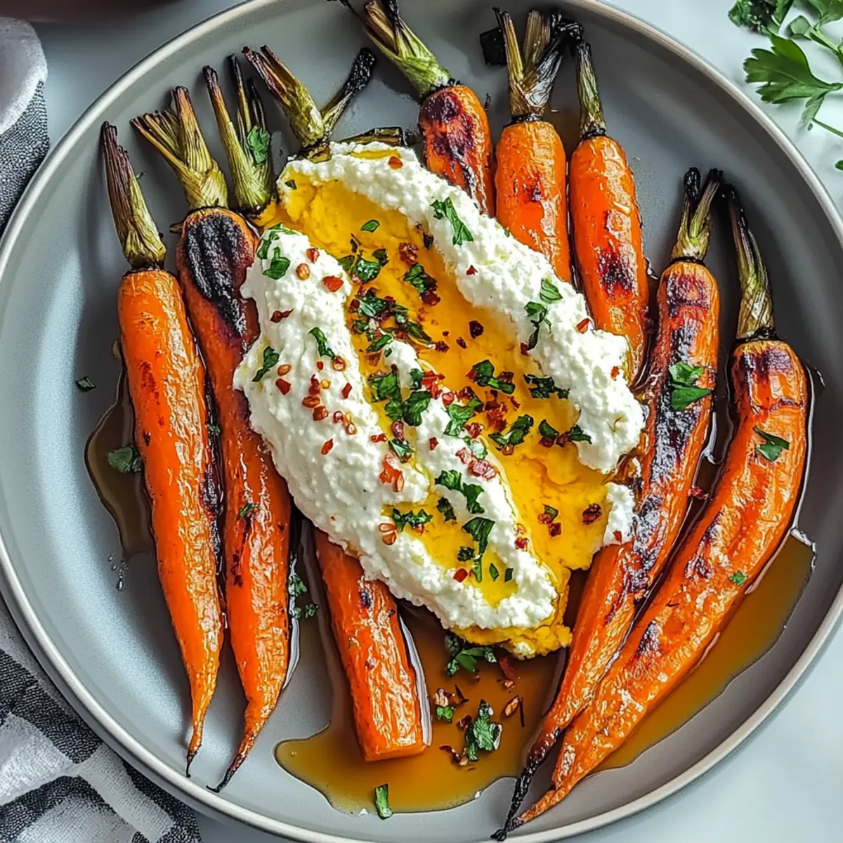 Jump to Recipe Print RecipeAs the aroma of caramelizing carrots fills the kitchen, I can’t help but feel a wave of excitement. This isn’t just any roasted vegetable; we’re talking about Roasted Carrots with Whipped Ricotta and Hot Honey—a dish that beautifully marries sweetness with a hint of spice. The first perk? It’s an easy side that elevates any meal from ordinary to extraordinary while being vegetarian and gluten-free. Plus, the creamy whipped ricotta provides a delightful contrast that makes this dish a true showstopper. Imagine serving this vibrant ensemble at your next gathering or enjoying it as a comforting weeknight side. Curious how the fiery honey complements the sweet earthiness of the carrots? Let me take you through the simple steps to create this mouthwatering masterpiece! Why Are These Carrots So Irresistible? Deliciously Unique: The combination of sweet roasted carrots with creamy whipped ricotta creates an unexpected yet delightful taste experience. Easy to Prepare: With straightforward steps, even beginner cooks can master this dish, making it perfect for busy weeknights. Healthy & Wholesome: This recipe is not only vegetarian and gluten-free but uses fresh ingredients, aligning with a health-conscious lifestyle. Crowd-Pleasing Appeal: Serve alongside roasted meats or as a star vegetarian side dish, and watch your guests rave about it! Versatility: Consider serving it over a bed of quinoa or couscous for a heartier, wholesome meal, just like in our Pasta Salad Vegetables. Flavor Explosion: The balance of hot honey and spices elevates this dish, making it a standout addition to any table. Try it today and impress your family or friends with something truly special! Roasted Carrots with Whipped Ricotta Ingredients For the Carrots Carrots – Use large carrots for a sweeter, more even roast. Olive Oil – This enriches flavor and helps achieve perfect caramelization. Salt – Enhances the natural sweetness and flavor of the carrots. Black Pepper – Adds a touch of warmth without overwhelming the dish. Ground Cumin – Offers a warm, earthy note that complements the sweetness. Ground Coriander – Brightens the dish with its citrusy flavor profile. Smoked Paprika – Infuses a gentle smokiness for an extra layer of depth. For the Whipped Ricotta Ricotta Cheese – Fresh ricotta creates a smooth, creamy base; don’t skimp on quality! Honey – Balances the spice and enhances the dish’s sweetness; adjust to taste. Red Pepper Flakes – Delivers a zesty kick, perfectly complementing the carrots. Lemon Juice – Brightens flavors and adds a touch of acidity. For Garnish Fresh Parsley – Adds a pop of color and freshness to the final presentation. Dive into this Roasted Carrots with Whipped Ricotta recipe to create an impressive yet easy dish that’s bound to be a hit at any gathering! Step‑by‑Step Instructions for Roasted Carrots with Whipped Ricotta Step 1: Preheat the Oven Begin by preheating your oven to 425°F (220°C). This high temperature is crucial for achieving beautifully caramelized Roasted Carrots with Whipped Ricotta. As the oven warms up, you’ll create the perfect environment for roasting that enhances the natural sweetness of the carrots. Step 2: Prepare the Carrots While the oven heats, peel the carrots and cut them into even pieces, about 1-2 inches in length for uniform cooking. This ensures that all the pieces roast evenly, developing a tender texture and beautiful golden color. Larger carrots work best for sweetness and consistency. Step 3: Coat the Carrots in Oil Spread the chopped carrots onto a large baking sheet, ensuring they are in a single layer for effective roasting. Drizzle with olive oil, which adds richness and promotes caramelization. Use your hands or a spatula to toss the carrots until they are well coated, creating a mouthwatering foundation for your dish. Step 4: Season the Carrots Sprinkle salt, black pepper, ground cumin, ground coriander, and smoked paprika over the carrots. These seasonings will enhance the natural flavors and provide a warm, aromatic profile. Toss again to ensure every piece is evenly flavored, creating an irresistible aroma as you prepare to roast. Step 5: Roast the Carrots Place the seasoned carrots in the preheated oven and roast for 20-25 minutes. After about 12 minutes, flip the carrots to ensure they brown evenly. Look for them to become tender and lightly browned—this visual cue indicates that they’ve reached the perfect doneness for your Roasted Carrots with Whipped Ricotta. Step 6: Whip the Ricotta While the carrots are roasting, prepare the creamy whipped ricotta. In a medium-sized bowl, add fresh ricotta cheese and use an electric mixer to whip it until smooth and creamy. This process will only take a few minutes, creating a luscious base that perfectly contrasts the roasted carrots. Step 7: Incorporate Honey Slowly drizzle honey into the whipped ricotta while continuing to mix. Adjust the sweetness to your taste, balancing the creaminess of the ricotta with the sweetness of the honey. This fusion brings a delightful flavor that complements the spicy notes of the dish. Step 8: Add Red Pepper Flakes Mix in red pepper flakes and a splash of lemon juice to the whipped ricotta. This addition brightens the flavor and gives your whipped ricotta a gentle kick. Just a small amount can elevate the dish, creating a vibrant contrast to the sweetness of the roasted carrots. Step 9: Assemble the Dish Once the carrots are perfectly roasted, allow them to cool slightly for better flavor before serving. Spoon generous dollops of the creamy whipped ricotta onto a serving platter, then artfully arrange the roasted carrots on top. The contrast in colors will be stunning! Step 10: Garnish and Serve Finish by drizzling additional honey over the top of the carrots for that extra touch of sweetness. Sprinkle freshly chopped parsley as a garnish to add a bright pop of color. Your beautiful Roasted Carro