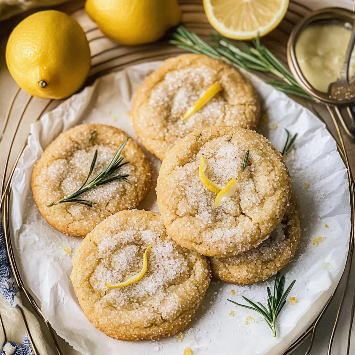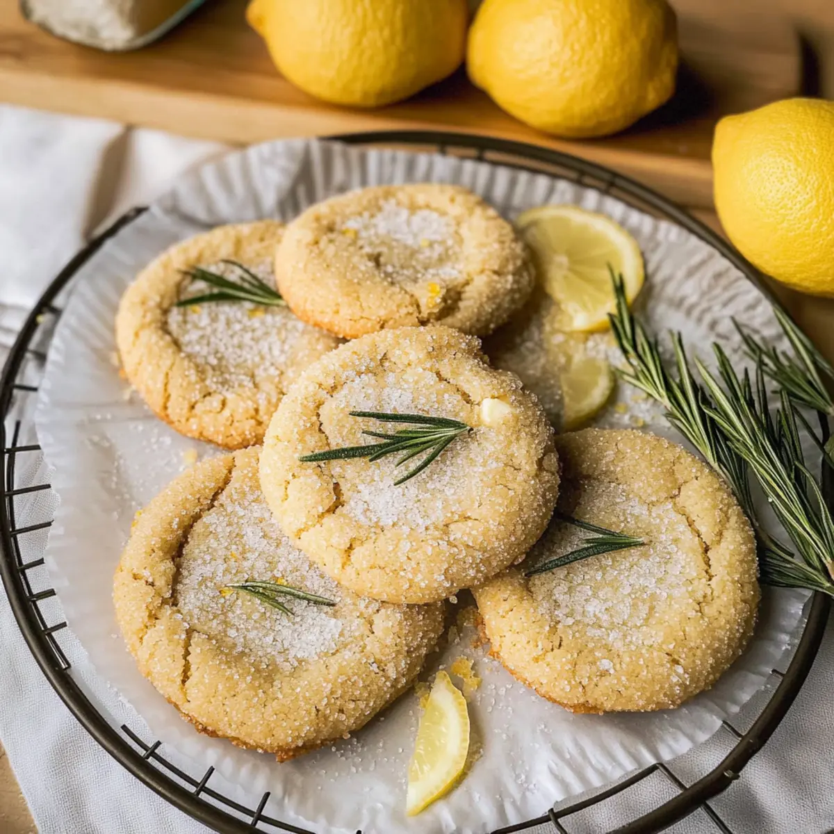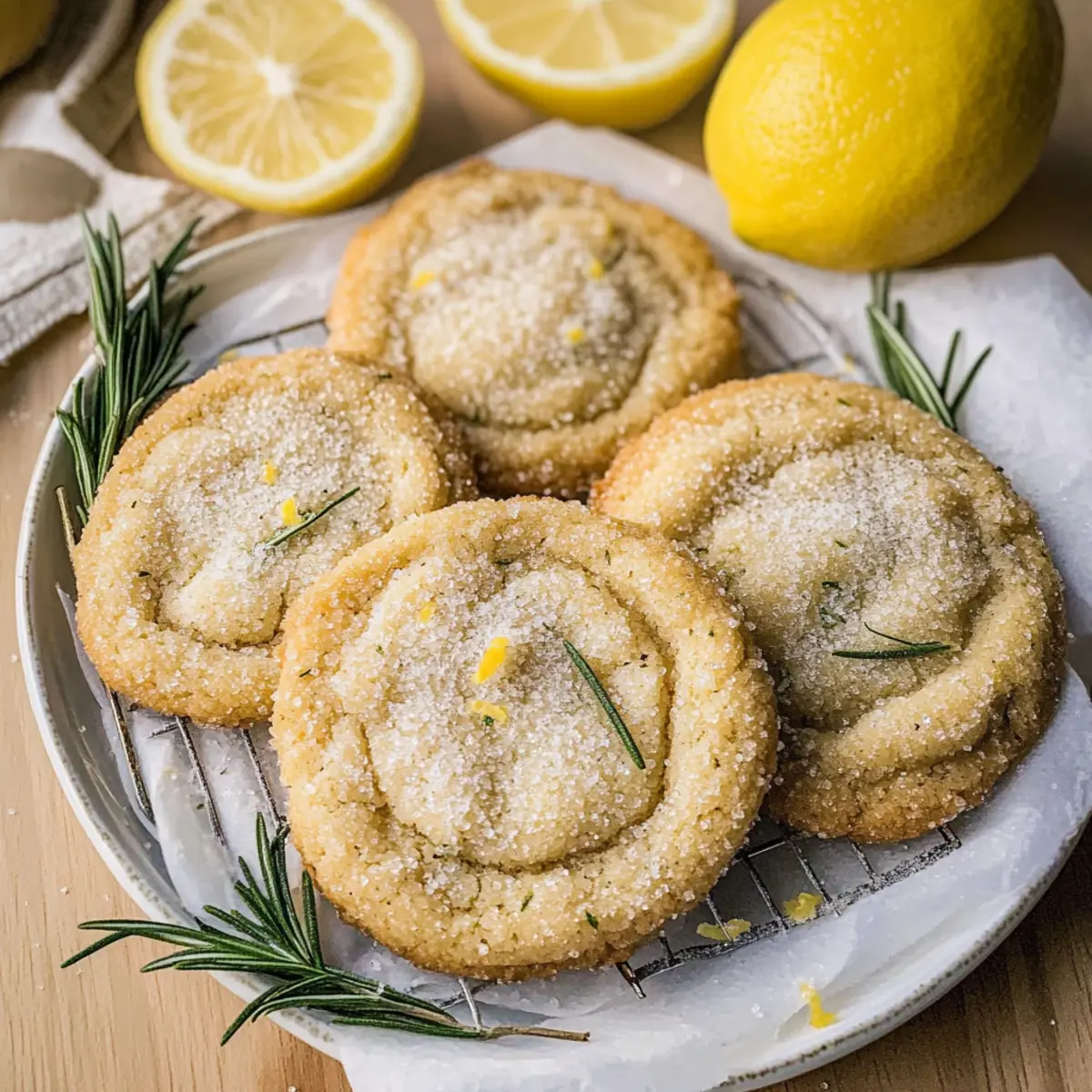 Jump to Recipe Print RecipeAs I unwrapped the warm, fragrant cookie dough, the comforting aroma of brown butter and fresh rosemary wafted through my kitchen, instantly drawing me in. Today, I’m excited to share my recipe for Rosemary Cookies with Lemon Sugar, a delightful treat that effortlessly combines savory and sweet elements. These soft, chewy cookies bring a unique twist to classic flavors, making them perfect for an afternoon pick-me-up or a cozy gathering with friends. With minimal prep time, you’ll be ready to impress your loved ones with these bakery-style goodies right in your own home. Are you ready to elevate your cookie game and discover the magic of this herbaceous delight? Why are these cookies a must-try? Unique Flavor Fusion: The delightful combination of fresh rosemary and zesty lemon creates a taste that’s both refreshing and comforting. Buttery Goodness: Brown butter adds a rich, nutty flavor that elevates these cookies to a whole new level. Perfectly Chewy: With a soft center and slightly crisp edges, these cookies offer the ideal texture that makes you want to reach for another. Versatile Treat: Whether paired with tea or served at a dessert platter, they’re perfect for any occasion. For a tangy twist, try these with Lemon Garlic Butter Salmon for a flavorful meal pairing. Effortlessly Simple: With straightforward steps, you can create bakery-quality cookies in the comfort of your kitchen, making them a crowd favorite! Rosemary Cookies with Lemon Sugar Ingredients For the Dough Unsalted butter – Adds richness and moisture; using unsalted allows better control over the salt levels. Fresh rosemary – Introduces a unique herbaceous flavor; if fresh isn’t available, use half the amount of dried rosemary. White granulated sugar – Sweetens the cookies and aids in achieving a lovely golden color during baking. Large egg – Provides essential structure and moisture; make sure it’s at room temperature for optimal mixing. Egg yolk – Enriches the cookies’ texture for that perfect chewy bite. Vanilla extract – A warm flavor component that complements the savory notes of rosemary. All-purpose flour – Acts as the main building block of the cookie; spoon and level off for accurate measurement. Baking soda & baking powder – Essential leavening agents that make these cookies rise beautifully. Salt – Enhances the overall flavor of the cookies. For the Lemon Sugar Coating Lemon zest – Infuses a refreshing citrusy note into the sugar; it brightens up the flavor of the Rosemary Cookies with Lemon Sugar. Granulated sugar – Serves as a sweet base that balances the tartness of the lemon zest. For Added Flavor Chopped fresh rosemary – Reinforces the herb flavor, ensuring every bite is fragrant and delightful. Step‑by‑Step Instructions for Rosemary Cookies with Lemon Sugar Step 1: Make Brown Butter In a medium saucepan, melt the unsalted butter over medium heat. Stir frequently as the butter begins to foam, cooking it for about 5–7 minutes until it turns golden brown and emits a nutty aroma. Remove the pan from heat, strain out the fresh rosemary, and let the brown butter cool. Chill it in the refrigerator for 30–45 minutes until solidified. Step 2: Mix Wet Ingredients In a large mixing bowl, beat the chilled brown butter with granulated sugar until it’s creamy and well combined. Incorporate the large egg, egg yolk, and vanilla extract, mixing until everything is smooth and homogeneous. This mixture forms the base of your Rosemary Cookies with Lemon Sugar, creating a delightful buttery flavor. Step 3: Prepare Dry Ingredients In a separate bowl, sift together all-purpose flour, baking soda, baking powder, salt, and the chopped fresh rosemary. This step ensures even distribution of the leavening agents and herbs throughout the cookie dough. Gradually combine the dry mixture with the wet ingredients, stirring until just mixed, being careful not to overmix. Step 4: Form Dough Scoop and portion the cookie dough onto a lined baking sheet using a cookie scoop or tablespoon. For best results, chill the formed dough in the refrigerator for at least 30 minutes. This chilling step solidifies the butter again, helping the cookies retain their shape while baking and creating a soft, chewy texture. Step 5: Prepare Lemon Sugar In a small bowl, combine the lemon zest and granulated sugar. Use your fingertips to rub the lemon zest into the sugar, releasing the essential oils and infusing the sugar with tangy flavor. This lemon sugar will provide a bright, sweet coating for your Rosemary Cookies with Lemon Sugar and enhance their overall taste. Step 6: Bake Cookies Preheat your oven to 350°F (175°C). Roll each chilled cookie ball in the prepared lemon sugar until fully coated, then place them on a lined baking sheet, leaving space between each. Bake for about 12 minutes, until the edges are golden and the centers are slightly puffy. Allow the cookies to cool on a wire rack before enjoying these delightful treats. Rosemary Cookies with Lemon Sugar Variations Feel free to explore these delicious variations that will add your personal touch to these delightful cookies! Citrus Twist: Substitute lemon zest with orange or lime zest for a vibrant new flavor experience. Each citrus brings its unique brightness, transforming your cookie into a taste of summer! Chocolate Drizzle: Melt some dark chocolate and drizzle it over cooled cookies for a decadent twist. The combination of chocolate with the rosemary is simply divine! Dairy-Free: Replace unsalted butter with coconut oil or a dairy-free butter alternative for a lactose-free option. The results are still rich and delicious, perfect for all to enjoy. Nutty Addition: Stir in some finely chopped nuts, such as walnuts or pistachios, for extra crunch and depth. The nutty flavors complement the rosemary beautifully! Spiced Up: Mix in a pinch of ground cinnamon or ginger for a warm kick. This subtle heat wonderfully enhance