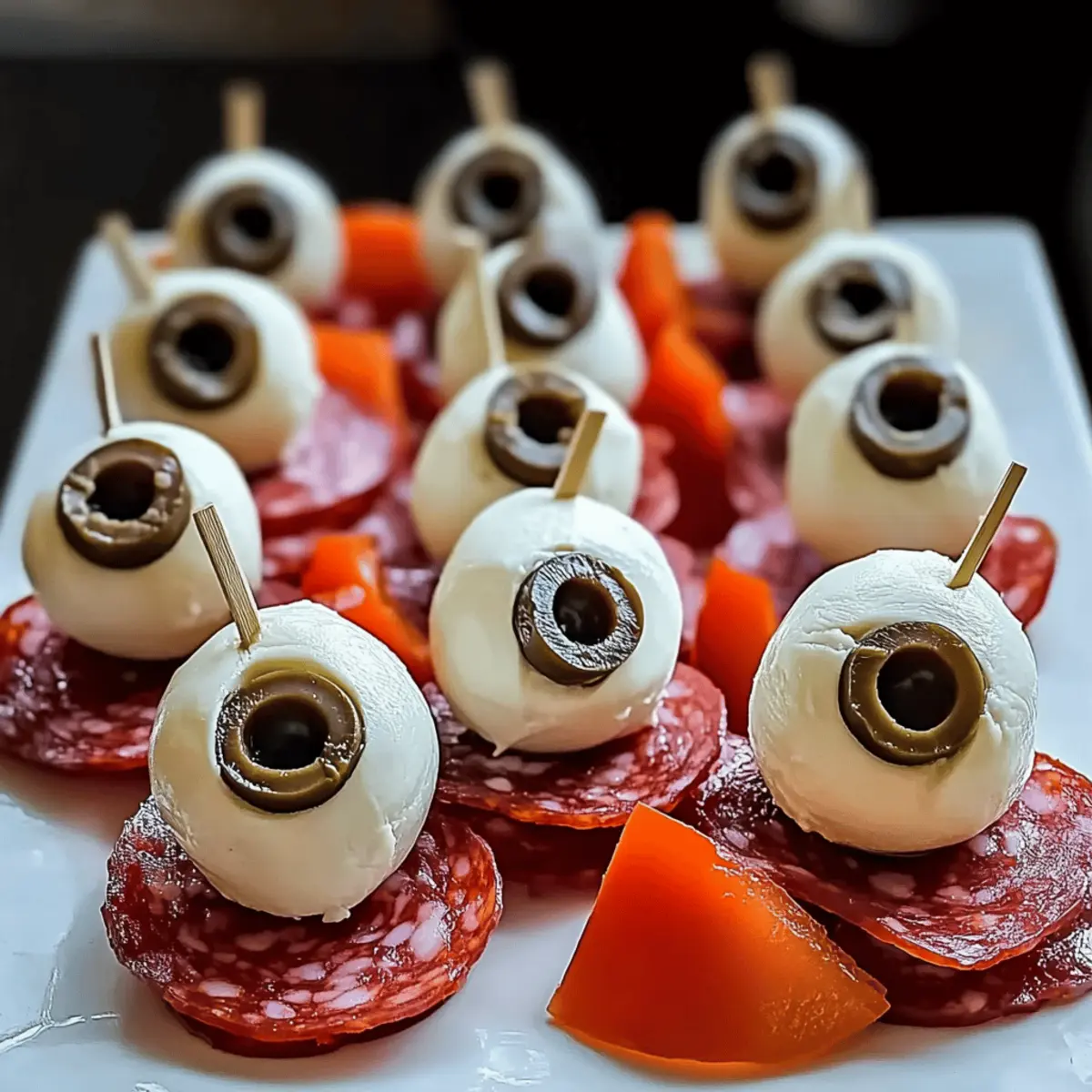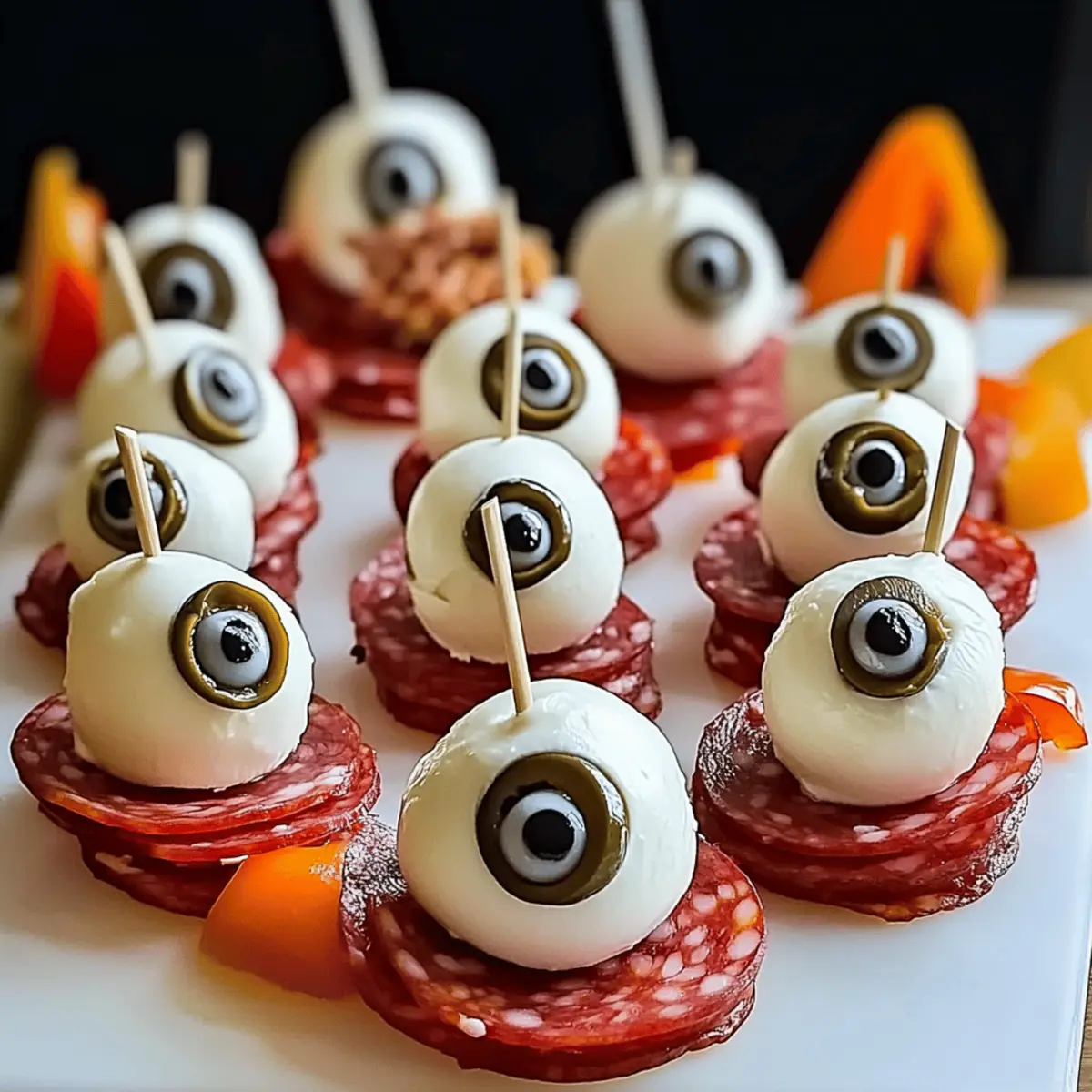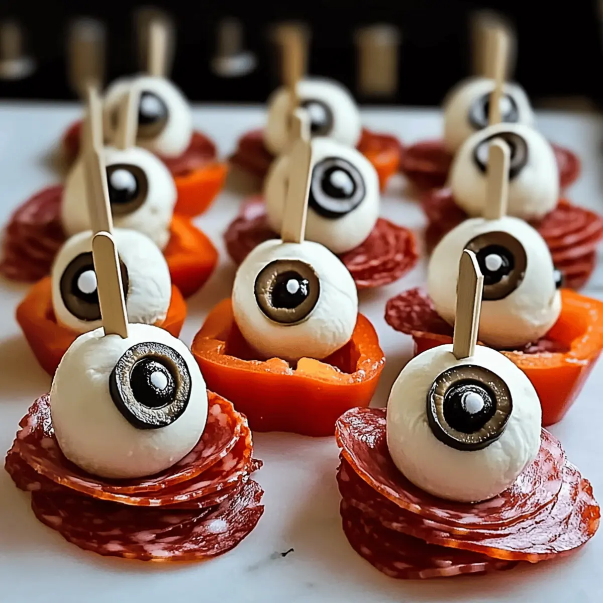 Jump to Recipe Print Recipe“Did you hear that gasp of delight when the Halloween party begins?” These Salami Mozzarella Eyeballs are destined to be the star of your spooky gathering, combining playful presentation with effortless preparation. The best part? They require no cooking skills at all, allowing even the busiest hosts to shine! The creamy mozzarella, paired with the savory slices of pepperoni and briny kalamata olives, creates a mouthwatering experience that speaks to both the eyes and taste buds. These spooky appetizers not only serve as crowd-pleasers but are also super adaptable—with variations like prosciutto or jalapeño for those looking to switch things up. Ready to incite some culinary curiosity at your Halloween festivities? Let’s dive into this fun and easy recipe! Why Are Salami Mozzarella Eyeballs So Fun? Playful Presentation: These appetizers are eye-catching and delicious, making them a perfect conversation starter at any Halloween party. Effortlessly Easy: No cooking skills? No problem! This recipe requires minimal preparation, ideal for busy hosts. Flavorful Surprise: The combination of creamy mozzarella, savory pepperoni, and briny olives is a delightful treat for the taste buds. Adaptable Options: Switch it up with variations like Mozzarella Pepperoni Croissant or spicy jalapeños for a twist to suit your guests. Crowd-Pleasing Appeal: These spooky bites are sure to impress family and friends, leaving them wanting more! Salami Mozzarella Eyeballs Ingredients For the Eyeballs Fresh Mozzarella Balls – Choose a firm variety for the perfect creamy yet stable base. Kalamata Olives – Chopped olives enhance the realistic appearance of the eyeball pupils; whole olives can be used for consistency. Pepperoni Stick – A firm stick is ideal for robust flavor; avoid pre-sliced for better texture. Red Bell Pepper – Provides a vivid, crisp accent that mimics “blood” around the eyeballs for a dramatic effect. For Variations Prosciutto – Swap pepperoni for prosciutto and add fresh basil for an Italian twist. Jalapeño Slices – Incorporate pepper jack cheese and spicy jalapeños for a heat kick! White Cheddar & Cranberries – Perfect for a festive holiday theme, turning them into “Christmas eyeballs.” These Salami Mozzarella Eyeballs make for a fun, no-cook Halloween treat that’s sure to delight! Step‑by‑Step Instructions for Salami Mozzarella Eyeballs Step 1: Prepare the Mozzarella Begin by gently draining the fresh mozzarella balls and patting them dry with a paper towel. Using a small, sharp knife, carefully create shallow indentations about 1/4 inch deep on the top of each mozzarella ball to form the eye sockets. Take your time and avoid cutting too deep, as you want to maintain the integrity of the mozzarella for your Salami Mozzarella Eyeballs. Step 2: Create the Pupils Finely chop the kalamata olives to resemble small pupils and press a piece into each indentation you made in the mozzarella. Make sure they fit snugly to maintain the eyeball appearance. The salty brininess of the olives will perfectly complement the creamy mozzarella, enhancing the visual and flavor profile of the Salami Mozzarella Eyeballs. Step 3: Prepare the Pepperoni While the mozzarella and olives are prepped, cut the pepperoni stick into various sizes, including 3/4-inch chunks and thin slices. This variation in size adds visual interest to the Salami Mozzarella Eyeballs and helps to mimic the eye’s appearance. Keep the pepperoni pieces handy for assembly and ensure they are neatly arranged for easy access. Step 4: Slice the Red Bell Pepper Next, wash the red bell pepper and slice it into thin wedges, which will be used as fake “blood” around the eyeballs for a spooky effect. Aim for pieces that are roughly 1/4-inch thick to ensure that they are both visually appealing and easy to manage when assembling your dish. The vibrant red color will create a stunning contrast against the mozzarella. Step 5: Assemble the Eyeballs Now it’s time to bring your Salami Mozzarella Eyeballs together! Start by assembling skewers, placing a red pepper wedge followed by a chunk of pepperoni. Add a mozzarella ball with the pupil facing outward, then layer on a thick slice of pepperoni and a few thin slices. Finish with another mozzarella ball to seal the skewer. Repeat until you have a visually striking display. Step 6: Chill and Serve Once your Salami Mozzarella Eyeballs are assembled, place them on a serving platter and refrigerate them for at least 1-2 hours before serving. This will help them stay firm and fresh. For the best flavor and presentation, aim to assemble them 2-4 hours before your Halloween gathering and serve chilled to keep everything looking great! Make Ahead Options These Salami Mozzarella Eyeballs are a hit for meal prep, allowing you to enjoy your Halloween festivities with less stress! You can prepare the mozzarella balls with indentations and the kalamata olive pupils up to 24 hours in advance. Simply store them in an airtight container in the refrigerator to keep them fresh. Additionally, slice the pepperoni and red bell pepper ahead of time as well; they can be refrigerated for up to 3 days without losing quality. When it’s time to serve, just assemble the skewers and chill for at least 1-2 hours to ensure they maintain their shape and flavor. Enjoy the ease of having a festive treat ready at a moment’s notice—perfect for busy hosts! What to Serve with Salami Mozzarella Eyeballs? Pair these delightfully spooky bites with complementary treats that will elevate your Halloween soirée and ensure a memorable feast! Crispy Dino Nuggets: Fun and familiar, these bite-sized nuggets bring a playful element that kids and adults alike will love. Perfect for the young at heart! Pumpkin Spice Cookies: Sweet and spiced, these cookies add a comforting warmth, perfectly balancing the savory flavors of the eyeballs with their delightfully rich texture. Chilled Vege