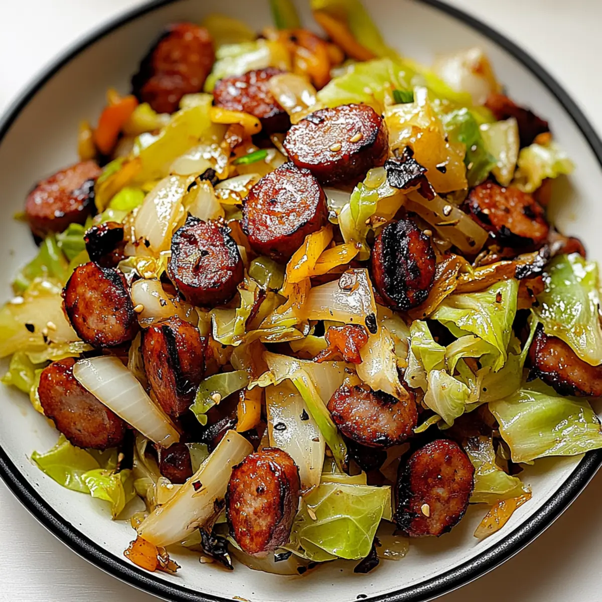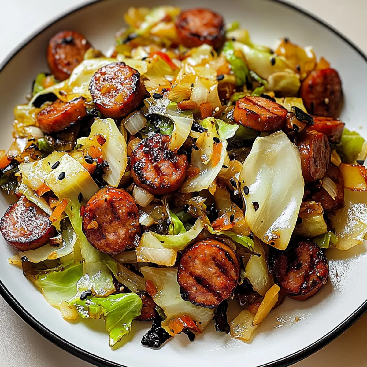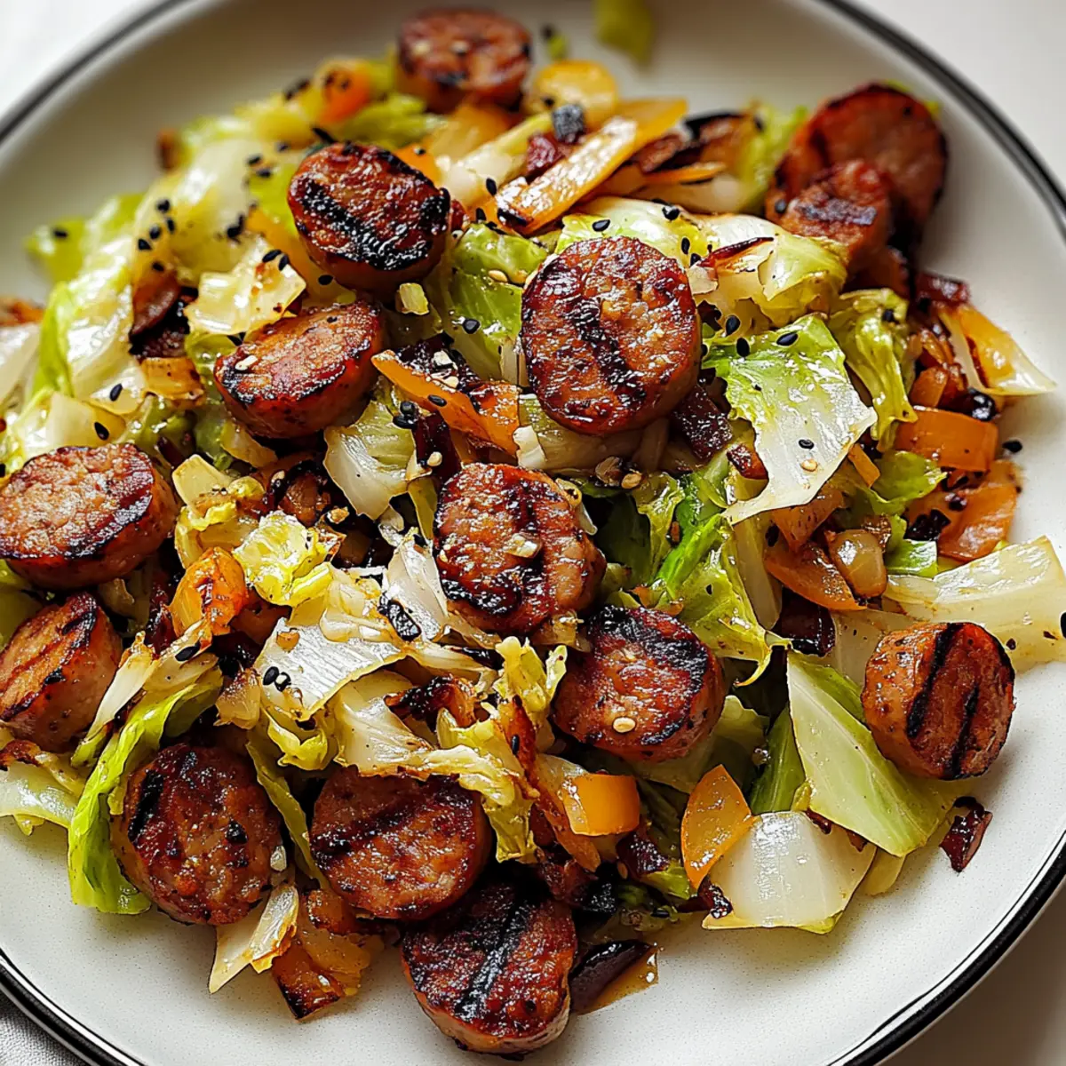 Jump to Recipe Print RecipeAs the handle of a frying pan hits the stovetop with a satisfying clank, I can already taste the comforting goodness of my Savory Sausage and Cabbage Stir Fry. This quick meal lets juicy sausage dance with crunchy cabbage, vibrant bell peppers, and savory onions — all in just one pan! Not only is this dish a breeze to whip up on busy weeknights, but it’s also super versatile, allowing you to switch out the ingredients based on what you have on hand or your dietary needs. Whether you’re craving something hearty or looking for a healthier dinner option, this recipe can fit the bill and become a family favorite. Are you ready to transform your kitchen into a stir-fry haven? Why Choose This Stir Fry Recipe? Quick and Easy: This Sausage and Cabbage Stir Fry comes together in just 20 minutes, perfect for those busy weeknights. Flavor-Packed: With juicy sausage mingling with tender cabbage, vibrant peppers, and aromatic garlic, each bite is a burst of savory goodness. Customizable: Feel free to switch up the vegetables or protein—this dish plays well with whatever you have on hand. One-Pan Wonder: Minimize cleanup while enjoying a satisfying meal, allowing you more time to relax. Whether you’re craving comfort food or a healthier choice, this recipe is sure to become a go-to. Don’t forget to check out our Grilled Sausage Grazing for additional serving ideas! Sausage and Cabbage Stir Fry Ingredients For the Stir Fry Sausage – Provides the main protein component and savory flavor; feel free to substitute with chicken, turkey, or tofu for a different flavor profile. Cabbage – Adds bulk and nutrition with a crunchy texture; use green or Napa cabbage as variations. Bell Peppers – Introduces sweetness and color, enhancing visual appeal; swap for carrots or snap peas if preferred. Onions – Contribute sweetness and depth of flavor; use red or white onions interchangeably. Garlic – Adds aromatic flavor; fresh is preferred but garlic powder can be a quick substitute. For the Sauce Soy Sauce – Essential for umami flavor; use low-sodium soy sauce for a healthier option. Sesame Oil – For added richness and flavor depth; olive oil can be a lighter alternative. Red Pepper Flakes – Provide heat; optional based on spice preference. With these simple ingredients, you’ll be ready to create your own delicious Sausage and Cabbage Stir Fry in no time! Step‑by‑Step Instructions for Sausage and Cabbage Stir Fry Step 1: Prepare Ingredients Begin by slicing your choice of sausage into bite-sized pieces. While the sausage is resting, chop the cabbage into thin strips and dice the bell peppers and onions. Mince a couple of garlic cloves to add aromatic richness to your Sausage and Cabbage Stir Fry. Having everything prepped will ensure a smooth cooking experience and allow the flavors to blend beautifully. Step 2: Cook Sausage In a large skillet or wok, heat a tablespoon of oil over medium-high heat until shimmering. Carefully add the sausage pieces, letting them brown for about 5 minutes. Stir occasionally to achieve an even golden color and crisp edges, which will enhance the savory flavor of your stir-fry. When the sausage is fully browned, transfer it to a plate and set aside. Step 3: Add Aromatics Using the same skillet, add the diced onions and minced garlic to the remaining oil over medium heat. Sauté for about 2 minutes, stirring frequently until the onions become translucent and fragrant. This step enhances the depth of flavor in your Sausage and Cabbage Stir Fry, creating a savory base for the vegetables that follow. Step 4: Incorporate Veggies Toss in the chopped cabbage and bell peppers, mixing them well with the sautéed onions and garlic. Stir-fry the mixture for approximately 3-4 minutes, allowing the vegetables to soften slightly while retaining their vibrant colors. Aim for a tender yet crisp texture in the cabbage, which balances perfectly with the juicy sausage in this delicious stir fry. Step 5: Add Sauce Pour in a generous splash of soy sauce along with a drizzle of sesame oil while adding red pepper flakes for some heat, if desired. Stir the mixture thoroughly, ensuring all the veggies and sausage are well-coated in the sauce. Continue to cook for another 5 minutes, allowing the flavors to meld together while the vegetables remain tender-crisp in your Sausage and Cabbage Stir Fry. Step 6: Final Touches Taste the stir fry and adjust seasoning if necessary, adding more soy sauce or sesame oil as desired. Once everything is harmoniously combined and cooked to perfection, serve the Sausage and Cabbage Stir Fry immediately. The glossy sauce and vibrant colors will make for an inviting, comforting meal that’s sure to please everyone. Sausage and Cabbage Stir Fry Variations Feel free to play with the ingredients and make this stir fry your own, transforming it into something uniquely yours with every bite! Dairy-Free: Substitute traditional sausage with turkey or tofu for a lighter, flavorful option. Veggie Boost: Add sliced carrots, snap peas, or zucchini for extra nutrition and vibrant colors. Spicy Kick: Incorporate fresh ginger or more chili flakes for a delightful heat that warms the soul. Sweet Twist: Try swapping bell peppers for sweet corn or peas to add a touch of sweetness to your dish. Herb Infusion: Add fresh thyme or basil for a fragrant herby flavor that elevates the dish wonderfully. Asian Influence: Switch out soy sauce with teriyaki sauce for a sweet and tangy flavor twist to your stir fry. One-Pan Meal: Make it a complete meal by tossing in cooked noodles toward the end—just like in our Mongolian Ground Fry, it creates an all-in-one delicious experience! Savory Base: For a deep savory flavor, use chicken broth instead of water when cooking the veggies in our Sticky Chicken Rice! With these variations, the possibilities are endless, and you’re sure to find a combination that delights your taste buds! Expert Tips for Sausage
