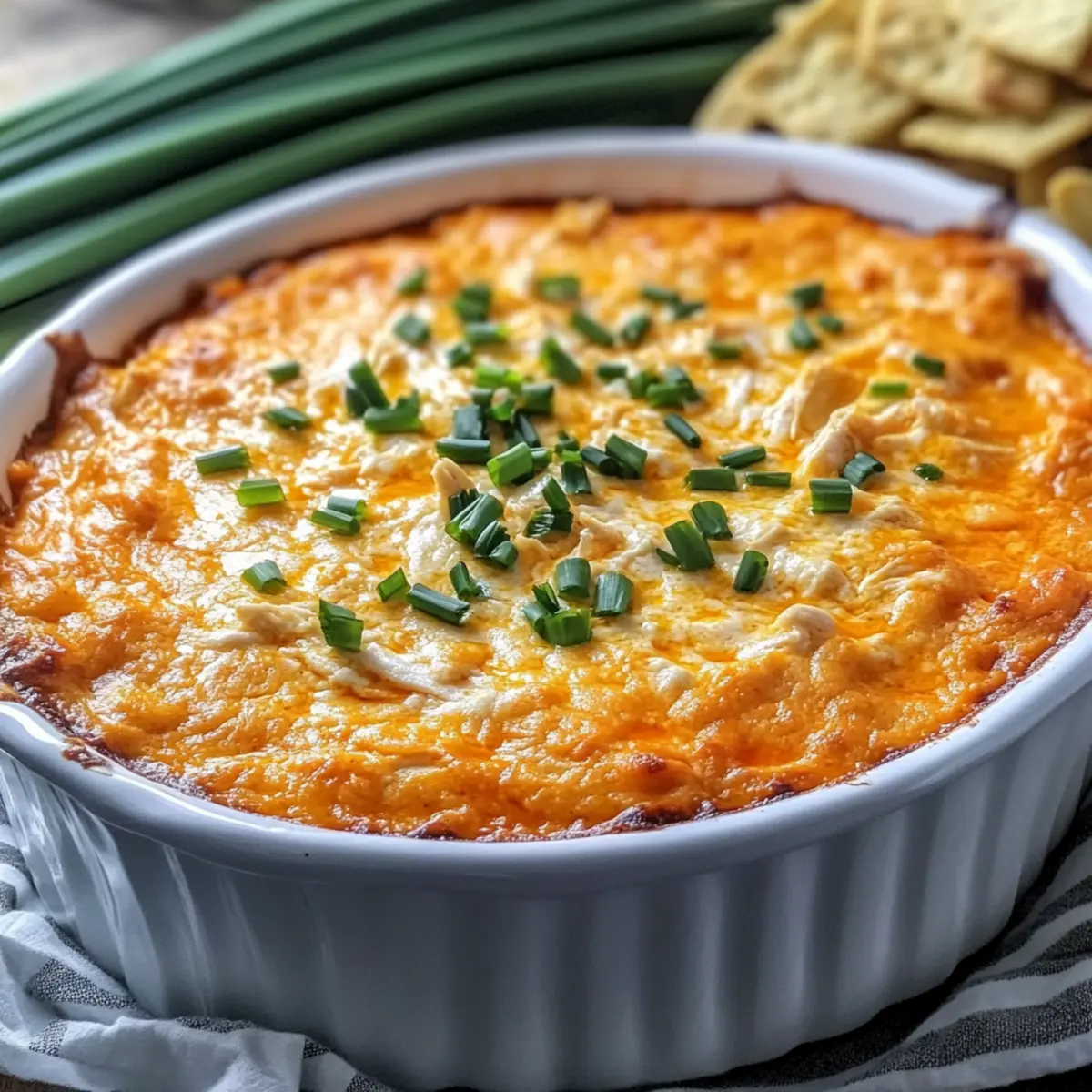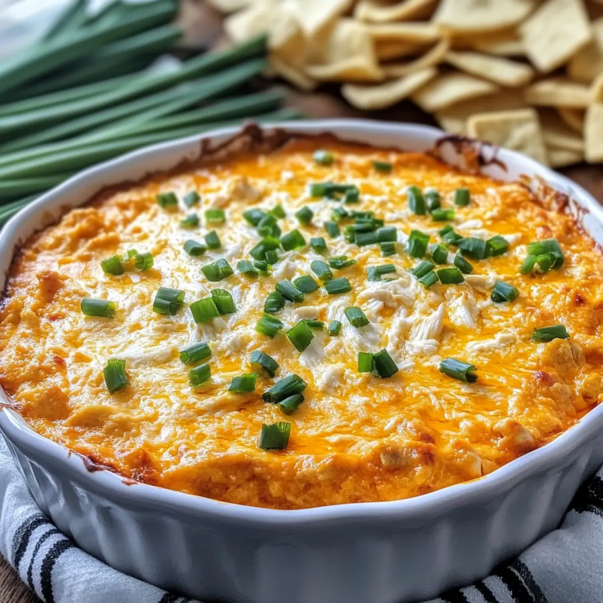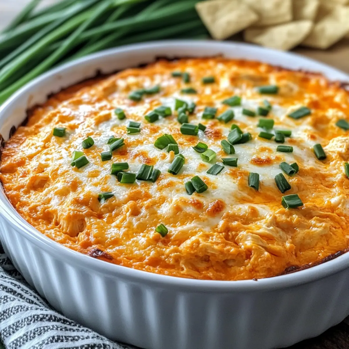 Jump to Recipe Print RecipeIt’s amazing how a simple gathering can transform into an unforgettable culinary experience, especially when you bring out a warm, bubbling dish of Savory Buffalo Chicken Dip. This delectable dip harmonizes spicy buffalo sauce with creamy cheese, making it the perfect companion for game nights or cozy evenings with friends. One of the best things about this dip is its incredible 30-minute prep time—ideal for those unexpected cravings or last-minute plans. Plus, it’s a guaranteed crowd-pleaser, ensuring smiles all around as everyone dips in with their favorite snacks. Whether you opt for gluten-free alternatives or mix in a twist of flavors, this dish is designed to adapt and impress. Ready to take your snacking game to the next level? Let’s dive into the details! Why is Buffalo Chicken Dip a Must-Try? Irresistible Creaminess: This Savory Buffalo Chicken Dip combines creamy textures with bold flavors, making each bite heavenly. Quick & Easy: With a simple 30-minute prep, you can whip this dip up anytime—perfect for game days or spontaneous get-togethers! Crowd-Pleasing Delight: It’s a guaranteed hit that will have your guests clamoring for more. Serve it with chips or fresh veggies for an impressive spread! Versatile Additions: Feel free to experiment with options like avocado or bacon—there’s always a tasty twist to try. Gluten-Free Friendly: Adaptable for various diets, ensuring everyone can enjoy without concerns. If you love hearty, satisfying dishes, pair this dip with some crunchy Chicken Bacon Ranch bites or a bowl of Cheesy Chicken Enchiladas for a complete feast! Savory Buffalo Chicken Dip Ingredients Get ready to impress with these essential ingredients! For the Dip Base Cream Cheese – Provides a creamy base; use full-fat for the best texture. Sour Cream – Adds tanginess; can be replaced with Greek yogurt for a lighter option. Ranch Seasoning – Enhances flavor; consider using homemade ranch for a personal touch. Worcestershire Sauce – Contributes depth of flavor; ensure gluten-free options are available. For the Flavor Buffalo-style Hot Sauce – The main flavor component that adds heat; choose your favorite brand. Shredded Cooked Chicken – Acts as the protein base; rotisserie chicken works wonders here. For the Cheese Shredded Cheddar Cheese – Adds cheesiness; opt for sharp or mild based on your taste. Crumbled Blue Cheese (Optional) – Offers a classic buffalo flavor; can be omitted if desired. For Garnishing Fresh Chives/Scallions – Adds freshness; sprinkle on top before serving for a pop of color. This Savory Buffalo Chicken Dip not only promises full flavor but also offers versatile ingredient swaps to cater to everyone’s tastes! Step‑by‑Step Instructions for Savory Buffalo Chicken Dip Step 1: Preheat the Oven Begin by preheating your oven to 375°F (190°C) to ensure a perfectly baked Savory Buffalo Chicken Dip. This temperature allows the cheese to melt beautifully and the dip to bubble, creating an irresistible, golden-brown topping. Set a timer for 10 minutes to let the oven reach the desired heat while you prepare the dip. Step 2: Mix Cream Cheese In a large mixing bowl, add the cream cheese and beat it with a hand mixer until it’s smooth and creamy, roughly 2–3 minutes. This step is crucial for achieving that velvety base for your dip. You want the cream cheese to be spreadable with no lumps, as it will blend better with the other ingredients. Step 3: Combine Additional Ingredients Next, add the sour cream, ranch seasoning, Worcestershire sauce, and buffalo-style hot sauce to the creamy mixture. Using a spatula, mix thoroughly until all ingredients are well incorporated and the mixture is a consistent color throughout. This ensures every bite of your Savory Buffalo Chicken Dip will be packed with flavor. Step 4: Incorporate Chicken and Cheese Gently fold in the shredded cooked chicken and half of the shredded cheddar cheese into your creamy mixture. Use a spatula to combine the ingredients, being careful not to over-mix, as you want to maintain a chunky consistency from the chicken. The added cheese will make the dip gooier and more irresistible. Step 5: Transfer to Baking Dish Spread the buffalo chicken mixture evenly into a 10-inch baking dish or a cast-iron skillet. Make sure to smooth the top with a spatula for even baking. This step sets the foundation for your dip, allowing it to heat evenly and develop that appealing, bubbling texture. Step 6: Add Remaining Cheese and Bake Sprinkle the remaining cheddar cheese generously on top of the dip, creating a deliciously cheesy layer. Bake uncovered in the preheated oven for 10-15 minutes, or until the dip is hot and bubbly, with the cheese melted and edges turning golden brown. This visual cue ensures you know when it’s time to enjoy! Step 7: Melt Blue Cheese (Optional) If you’re adding crumbled blue cheese, sprinkle it over the dip during the last 2-3 minutes of baking. This allows the cheese to melt perfectly without losing its distinct flavor. Keep an eye on it; the goal is a slight browning while the dip continues to bubble. Step 8: Garnish and Serve Once out of the oven, let your Savory Buffalo Chicken Dip cool for a minute before garnishing with chopped chives or sliced scallions for an added pop of freshness. This gives the dip a beautiful finishing touch and enhances its visual appeal, making it even more inviting for your guests. Savory Buffalo Chicken Dip Variations & Substitutions Feel free to customize your Savory Buffalo Chicken Dip with these delightful suggestions that will elevate your snacking experience! Monterey Jack Swap: Substitute Monterey Jack for a milder, creamy flavor. This cheese melts beautifully, making your dip extra gooey and inviting. Bacon Bliss: Add crispy, crumbled bacon bits for a smoky crunch. The combination of flavors creates a satisfying and indulgent treat that everyone will adore. Greek Yogurt Twist: Replac