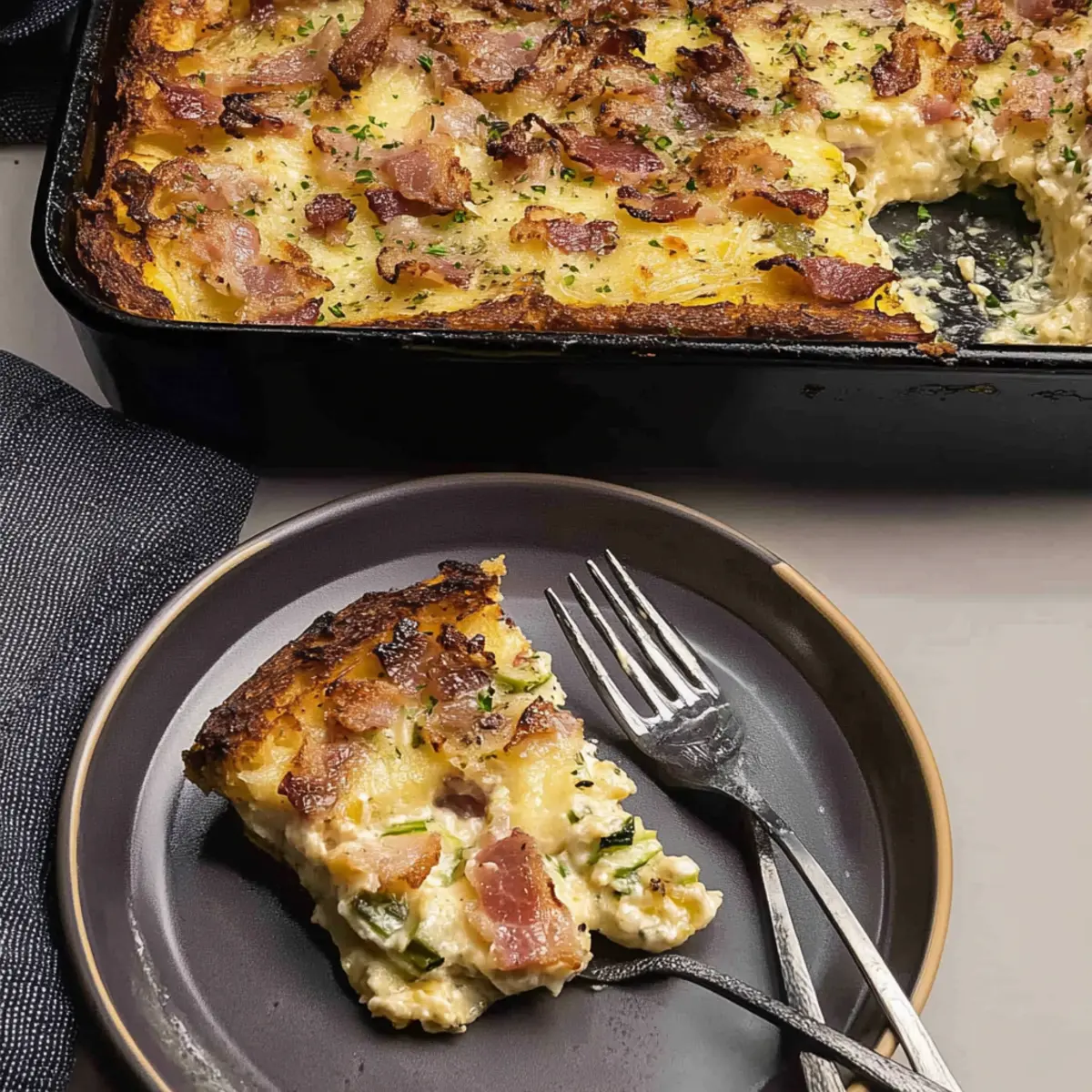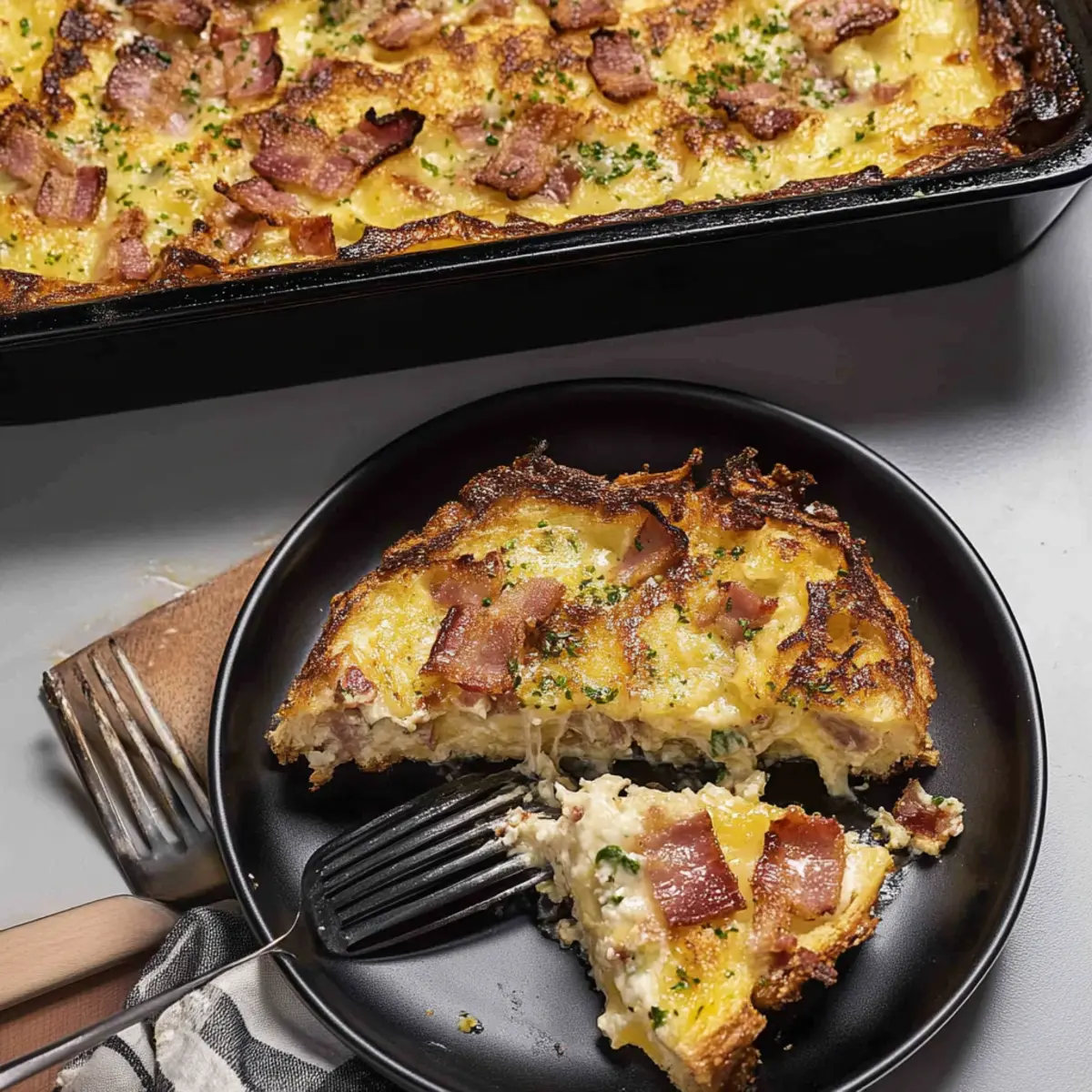 Savory French Toast Casserole combines crispy bacon and melted cheese for a delightful breakfast treat.