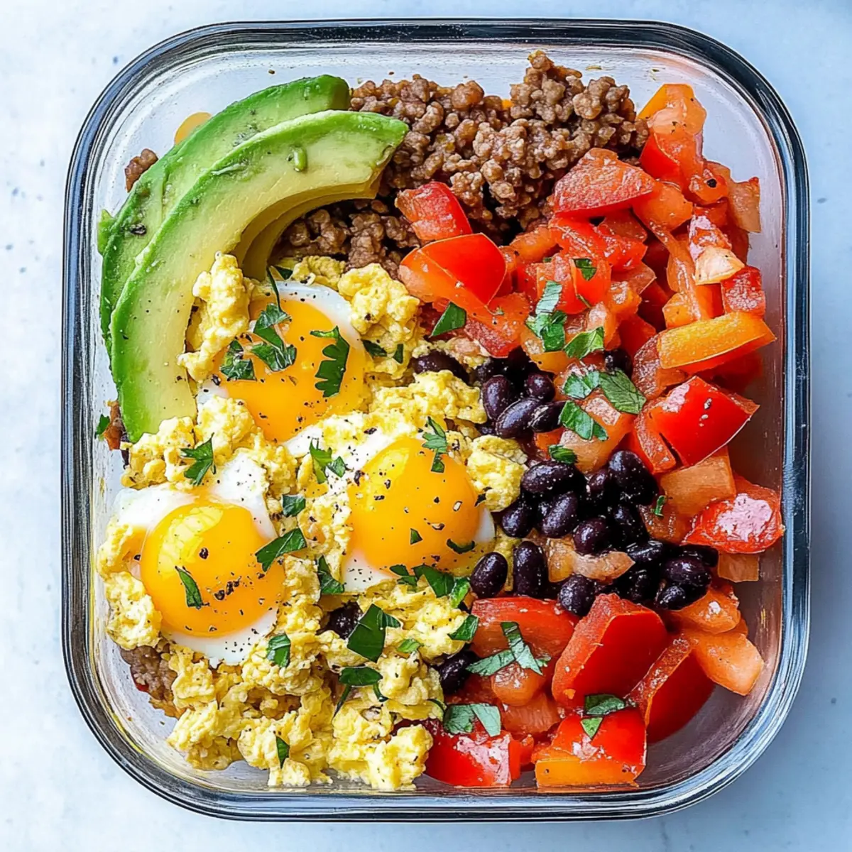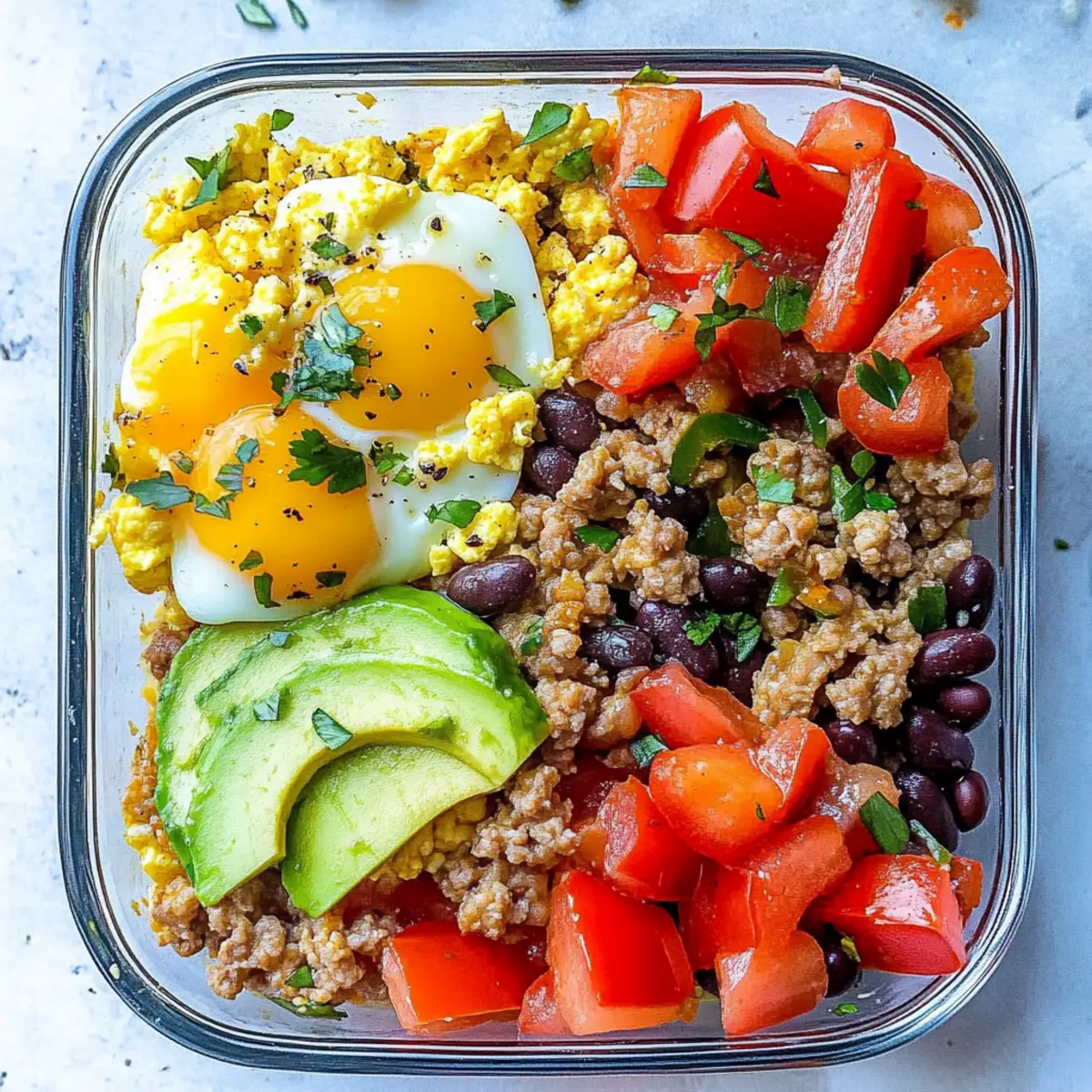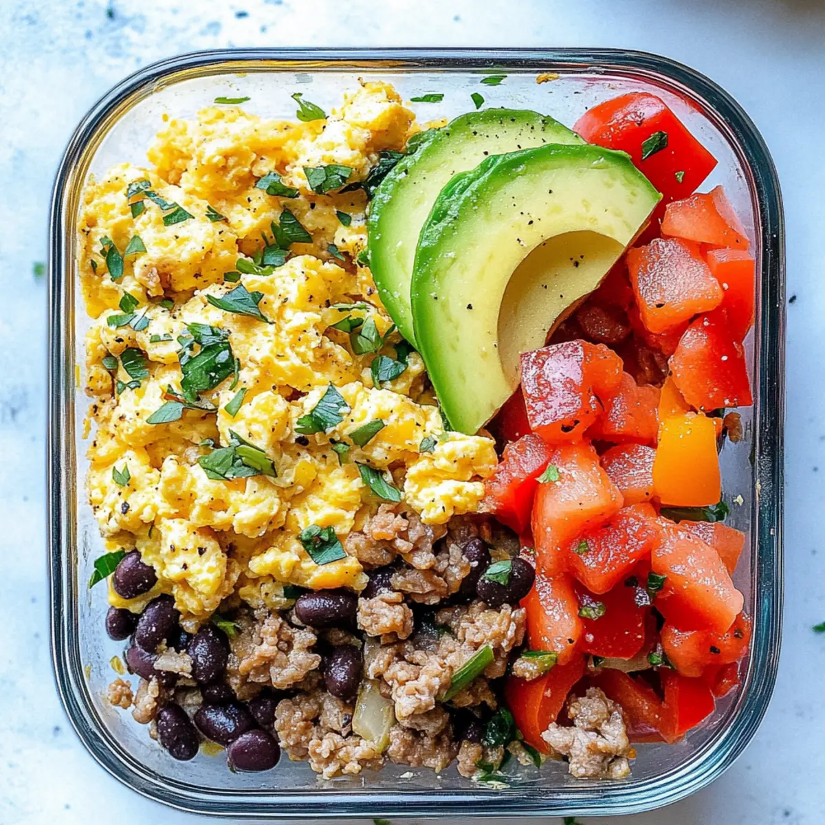 Jump to Recipe Print RecipeAs I stood in my kitchen, the aroma of sautéing onions and vibrant bell peppers wafted through the air, awakening my senses and setting the stage for a delightful morning. These Hearty Breakfast Scramble Meal Prep Bowls not only embody the spirit of clean eating, but they also promise a high-protein feast that’s perfect for meal prepping. Imagine diving into a bowl filled with fluffy scrambled eggs, seasoned meat, and colorful veggies, all ready to fuel your busy days ahead. And the best part? They can be whipped up in a flash and stored in the fridge for up to four days, ensuring that wholesome meals are always at your fingertips. So, whether you’re striving for a nutritious breakfast or a satisfying lunch, these scramble bowls will have you covered. Ready to elevate your mornings with a meal that’s as delicious as it is convenient? Let’s get cooking! Why choose this meal prep bowl? Nutritious and Convenient: These Hearty Breakfast Scramble Meal Prep Bowls are crafted for busy individuals who crave nutritious meals without the fuss. Flavor-Packed: With an array of fresh vegetables and savory spices, each bite bursts with delightful flavors. High-Protein Delight: The combination of protein-rich eggs and lean meat ensures you stay energized throughout your day. Versatile Options: Customize your bowls with your favorite veggies or switch to a vegetarian option using beans for added fiber. Easy to Make Ahead: Prep these delicious bowls in advance, and enjoy hassle-free meals ready to grab whenever hunger strikes. For even more meal prep inspiration, check out the Skillet Breakfast Meal or our High Protein Prep for balanced nutrition on-the-go. Scramble Clean Eating Meal Prep Ingredients For the Base • Lean Ground Beef or Turkey – Main protein source; use turkey for a lighter option. • Black Beans – Source of fiber; can substitute with kidney beans if preferred. • Eggs – Binder and additional protein; egg whites can be used for a lighter version. For the Vegetables • Green Bell Pepper – Adds crunch and color; can be substituted with red or yellow peppers for sweetness. • Yellow Bell Pepper – Enhances flavor; can be replaced with zucchini for a lower-carb option. • Sweet Onion – Provides sweetness and depth; yellow onion is a good substitute. • Garlic Cloves – Adds aromatic flavor; can use garlic powder in a pinch. • Cherry Tomatoes – Adds freshness; can use diced regular tomatoes as an alternative. • Fresh Cilantro – Garnish for freshness; omit if not preferred. For Cooking • Avocado Oil (or Olive Oil) – Used for sautéing; avocado oil has a higher smoke point. • Sea Salt and Fresh Ground Pepper – Essential for seasoning; adjust according to taste. For Flavor • Taco Seasoning – Provides a savory kick; can use homemade seasoning for fewer additives. • Shredded Cheese – Adds creaminess; omit for dairy-free or use vegan cheese. For Topping • Avocado – For healthy fats; include lime juice to prevent browning if making in advance. These Scramble Clean Eating Meal Prep ingredients come together to create a delightful and satisfying dish that will elevate your busy mornings! Step‑by‑Step Instructions for Hearty Breakfast Scramble Meal Prep Bowls for Clean Eating Step 1: Heat the Oil In a large skillet, heat half a tablespoon of avocado oil over medium heat. Allow it to warm for about 1 minute until shimmering, ensuring even cooking of your ingredients. This will be the base for sautéing your flavorful vegetables for the Hearty Breakfast Scramble Meal Prep Bowls. Step 2: Sauté the Vegetables Add diced sweet onion, minced garlic, and both green and yellow bell peppers to the skillet. Sauté the mixture for approximately 4 minutes, stirring occasionally until the vegetables soften and become fragrant. You want them to turn vibrant and slightly tender, creating a colorful foundation for your meal prep bowls. Step 3: Cook the Meat Next, add your choice of lean ground beef or turkey along with taco seasoning to the skillet. Break the meat into smaller pieces and cook for about 5 minutes, stirring frequently until it’s fully browned and no longer pink. The savory aroma will fill your kitchen, making it clear that your Hearty Breakfast Scramble is coming together beautifully. Step 4: Incorporate the Black Beans Once the meat is browned, stir in the black beans and cook for an additional minute. This will warm the beans through and allow their flavors to mingle with the meat mixture. Afterward, remove the skillet from heat and set the meat and vegetable mix aside in a bowl. Step 5: Whisk the Eggs In a separate bowl, crack open the eggs and whisk them together with shredded cheese, sea salt, and fresh ground pepper. Mix thoroughly until smooth, and the ingredients combine seamlessly. This step adds fluffiness to the eggs and enhances the flavor of your Hearty Breakfast Scramble Meal Prep Bowls. Step 6: Scramble the Eggs Return the skillet to the heat, adding the remaining avocado oil. Pour in the whisked eggs and gently scramble them with a spatula over medium-low heat for around 3–4 minutes. Cook until the eggs are just set but still soft and fluffy, creating a perfect contrast to the heartiness of the meat. Step 7: Assemble the Bowls Now, it’s time to assemble your Hearty Breakfast Scramble Meal Prep Bowls! Divide the meat and veggie mixture evenly among four meal prep containers. Layer each with the scrambled eggs, halved cherry tomatoes, and slices of avocado, ensuring each bowl is colorful and inviting. Step 8: Garnish and Store Finally, sprinkle fresh cilantro over each bowl to add a burst of freshness. Seal the containers tightly and refrigerate until you’re ready to enjoy them. These meal prep bowls can be stored for up to four days, ensuring wholesome meals are always moments away! How to Store and Freeze Scramble Clean Eating Meal Prep Fridge: Store assembled meal prep bowls in airtight contain