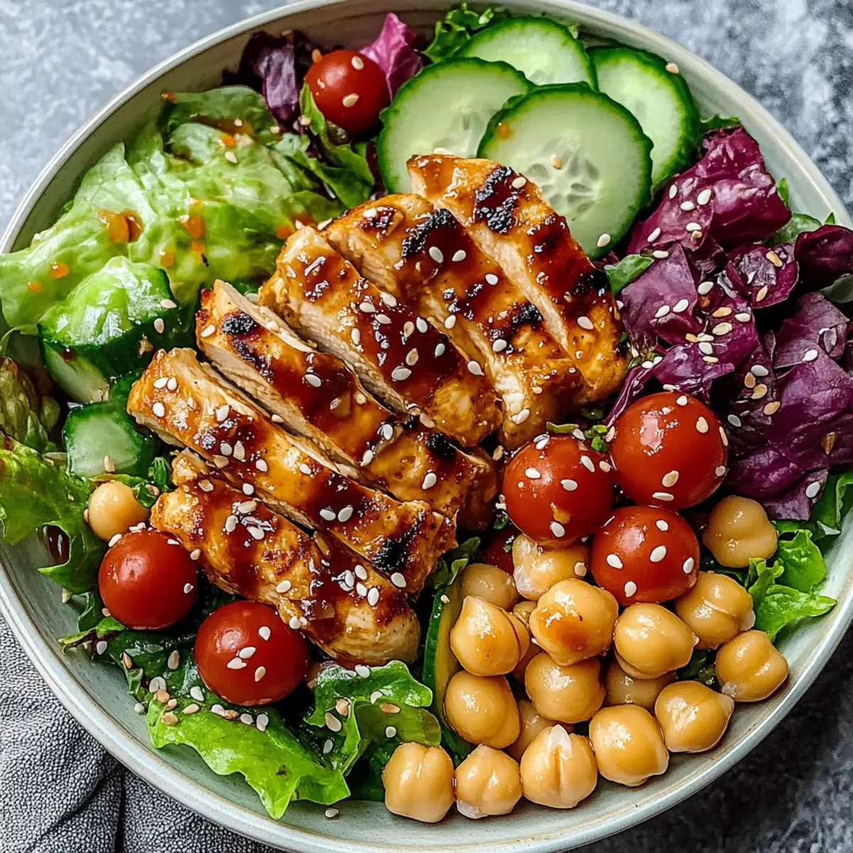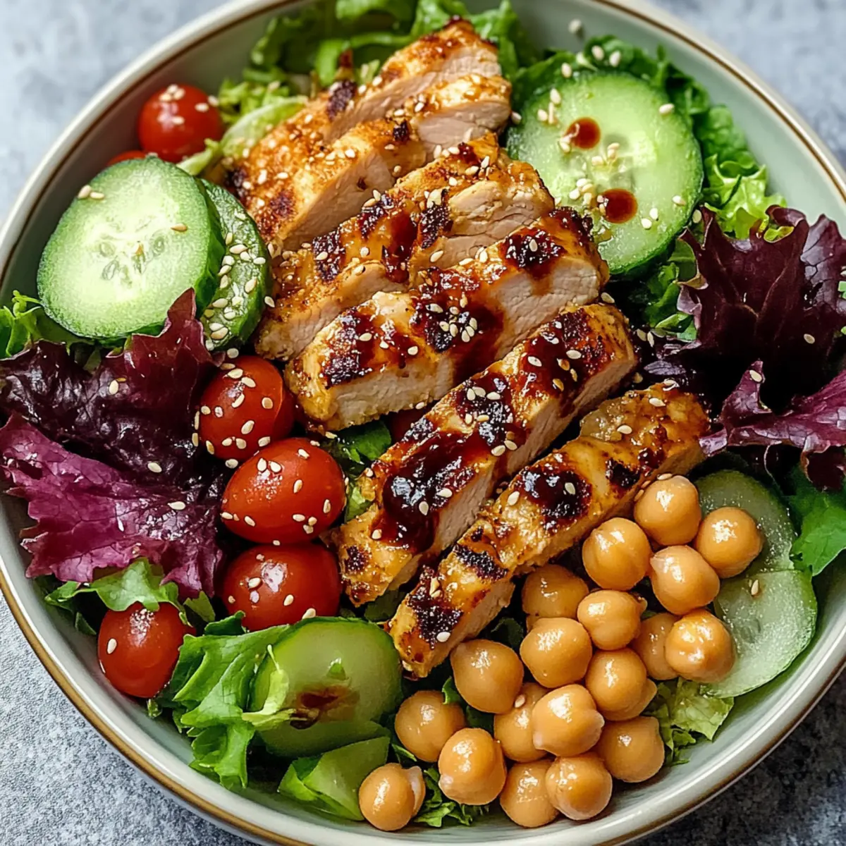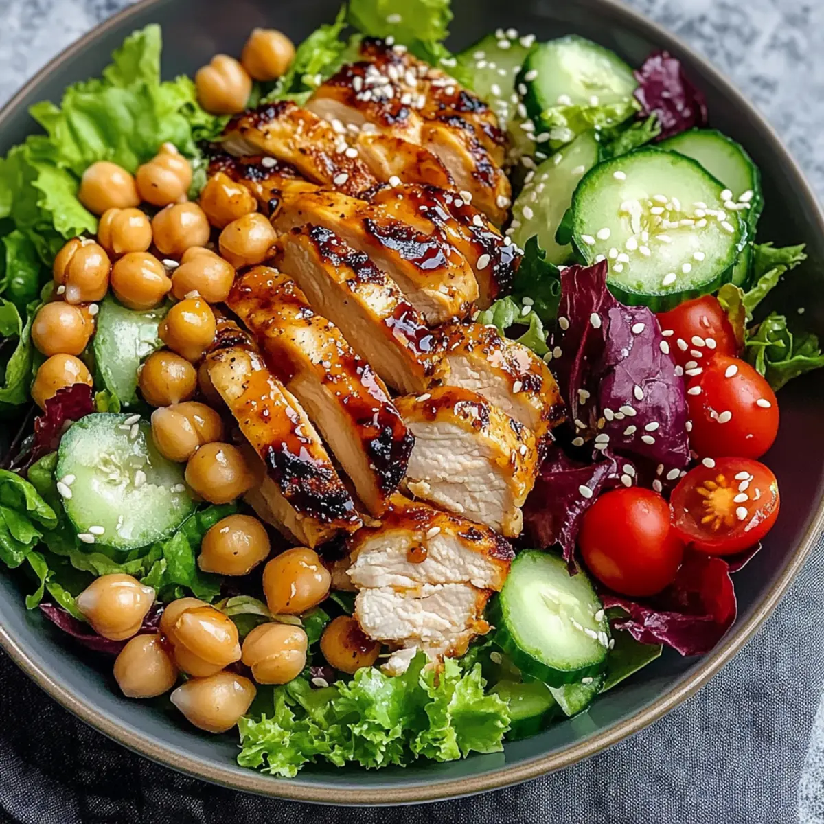 Jump to Recipe Print RecipeAs the sun shines brighter and the days grow warmer, I find myself craving dishes that are not only vibrant but also packed with nutrition. Enter the Sesame Chicken and Chickpea Salad—a delightful blend that perfectly balances juicy grilled chicken with protein-rich chickpeas and a rainbow of crisp veggies. What I love most about this easy salad recipe is how it transforms into a refreshing meal in just 35 minutes, making it a lifesaver for those busy weeknights. Plus, it’s a fantastic way to enjoy healthy eating without sacrificing taste. Are you ready to discover your new go-to summer dish? Let’s dive in! What makes this salad a must-try? Vibrant Flavors: Each ingredient shines in this colorful medley, where juicy chicken meets protein-packed chickpeas and fresh veggies for a delightful crunch. Quick Prep: In just 35 minutes, you’ll serve a satisfying meal that’s both nourishing and delicious—perfect for busy evenings! Healthy Choice: Fuel your body with a salad that’s not just light but packed with nutrients, making healthy eating enjoyable. Versatile Option: Whether you’re craving a vegetarian twist or want to add some nuts for extra crunch, this recipe is adaptable! For another refreshing take, check out my Hawaiian Chicken Salad. Impressive Presentation: With a colorful array of ingredients, this salad will surely impress friends and family at your next gathering. Sesame Chicken and Chickpea Salad Ingredients For the Chicken Chicken Breast – 1 lb (450g); the star of this dish, grilled to tenderness. Substitute with tofu or tempeh for a vegetarian variation. Sesame Oil – 1 tsp; infuses the chicken with a delightful nutty aroma. Feel free to replace it with vegetable or canola oil if necessary. Soy Sauce – 1 tbsp; enhances the savory flavor profile of the chicken. For the Salad Chickpeas – 1 can (15 oz), drained and rinsed; offers hearty protein and fiber to keep you satisfied. Cherry Tomatoes – 1 cup, halved; provides a burst of sweetness and juicy texture. Mixed Salad Greens – 2 cups; forms the refreshing base of this salad, adding crunch. Cucumber – 1 small, thinly sliced; contributes a cool, crisp bite and hydration. Red Onion – 1/4 cup, thinly sliced; adds a sharp bite that can be mellowed by soaking in water if you prefer. Toasted Sesame Seeds – 2 tbsp; brings extra crunch and enhances the sesame flavor. For the Dressing Extra Virgin Olive Oil – 2 tbsp; a rich base for the dressing that ties everything together. Rice Vinegar – 1 tbsp; offers a tangy twist; can substitute with lemon juice for a fresh zing. Ginger – 1 tsp, grated; imparts a warm, zesty kick to the dressing. Garlic – 1 clove, minced; deepens the flavor profile with its aromatic notes. Honey – 1 tbsp; sweetens the dressing and balances its savory aspects; can be swapped with maple syrup for a vegan-friendly version. Salt and Pepper – To taste; essential for seasoning and enhancing all other flavors in the salad. This Sesame Chicken and Chickpea Salad is more than just a meal—it’s a delightful experience of texture and taste that will brighten up your plate! Step‑by‑Step Instructions for Sesame Chicken and Chickpea Salad Step 1: Preheat the Grill Begin by preheating your grill or grill pan to medium-high heat, which usually takes about 5 minutes. This ensures a perfectly seared finish on your chicken. You’ll know it’s ready when you can hold your hand about six inches above the grate for only 3–4 seconds due to the heat. Step 2: Prepare the Marinade In a medium mixing bowl, combine sesame oil, soy sauce, honey, salt, and pepper. Whisk these ingredients together until they emulsify into a cohesive mixture, taking about a minute. This flavorful marinade will enhance the savory taste of the chicken, making it deliciously irresistible. Step 3: Marinate the Chicken Take your chicken breasts and brush them generously with the marinade, ensuring they are well coated. For the best flavor, allow the chicken to marinate for at least 10 minutes at room temperature while the grill continues to heat up, giving it time to absorb all those rich flavors. Step 4: Grill the Chicken Carefully place the marinated chicken breasts on the heated grill. Cook for 6–7 minutes on each side until the chicken is golden brown and reaches an internal temperature of 165°F (74°C). Look for nice grill marks and a slight char to indicate they’re perfectly grilled. Step 5: Let the Chicken Rest Once grilled, remove the chicken from the grill and allow it to rest for 5 minutes on a cutting board. This lets the juices redistribute, ensuring each bite is juicy and flavorful. After resting, slice the chicken into strips for the salad. Step 6: Prepare the Salad Base In a large salad bowl, combine the drained chickpeas, halved cherry tomatoes, mixed salad greens, thinly sliced cucumber, and red onion. Toss these vibrant ingredients gently together, creating a colorful and nutritious base for your Sesame Chicken and Chickpea Salad. Step 7: Make the Dressing In a separate bowl, whisk together extra virgin olive oil, rice vinegar, grated ginger, minced garlic, and a pinch of salt. Aim for a smooth consistency, allowing the flavors to mingle for a minute. This zesty dressing will beautifully enhance the overall flavor profile of your salad. Step 8: Assemble the Salad Drizzle the prepared dressing over the mixed salad ingredients, then toss everything together gently until well combined. Ensure the dressing evenly coats the chickpeas and fresh vegetables, allowing the flavors to meld. Step 9: Top with Chicken and Seeds Finally, arrange the sliced grilled chicken strips over the salad, and sprinkle with toasted sesame seeds for added crunch and flavor. This garnish not only elevates the dish visually but also enhances the sesame flavor that ties the salad together. Step 10: Serve Immediately Serve your delightful Sesame Chicken and Chickpea Salad immediately for the best f