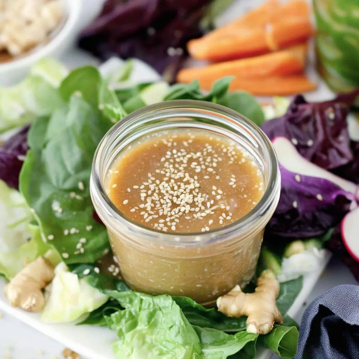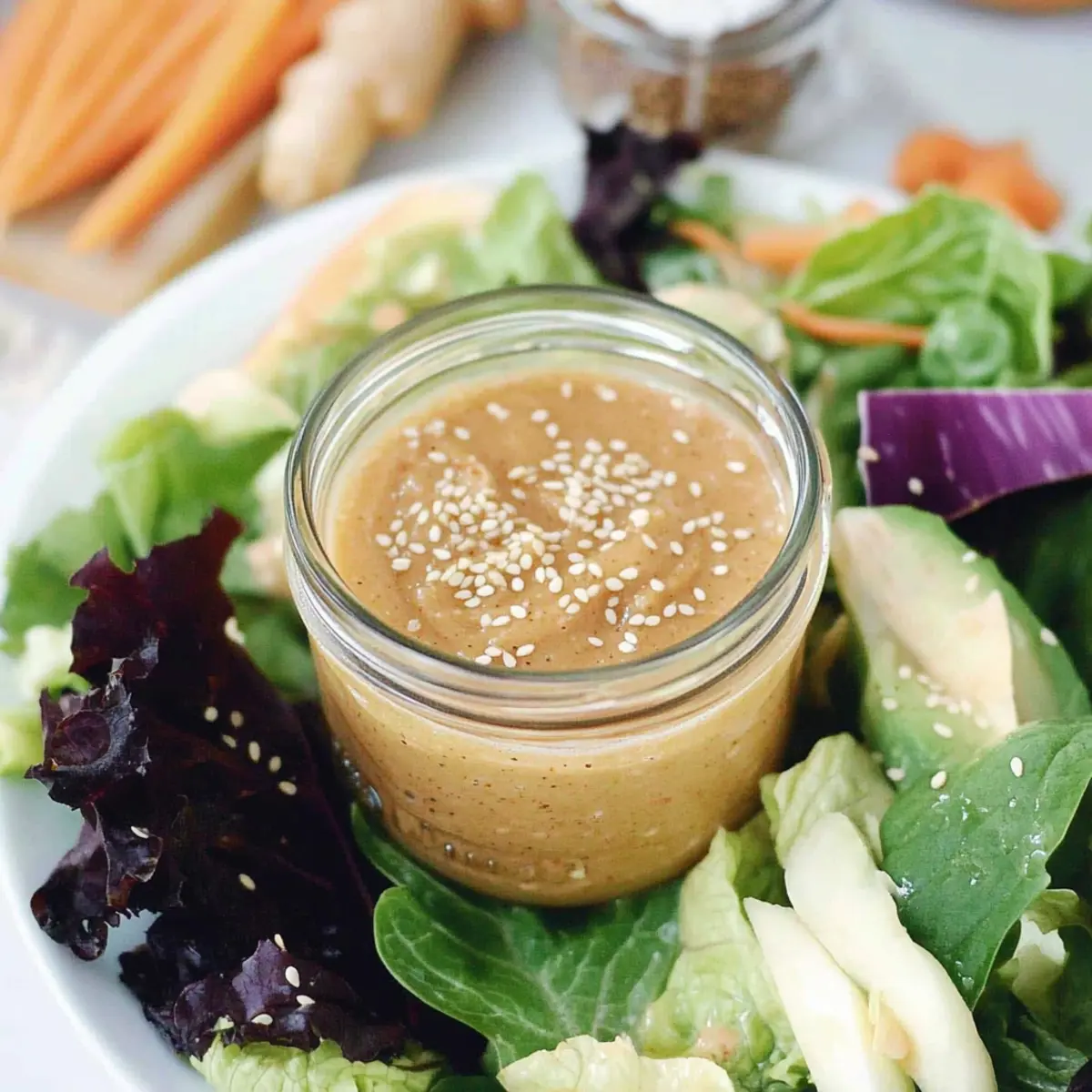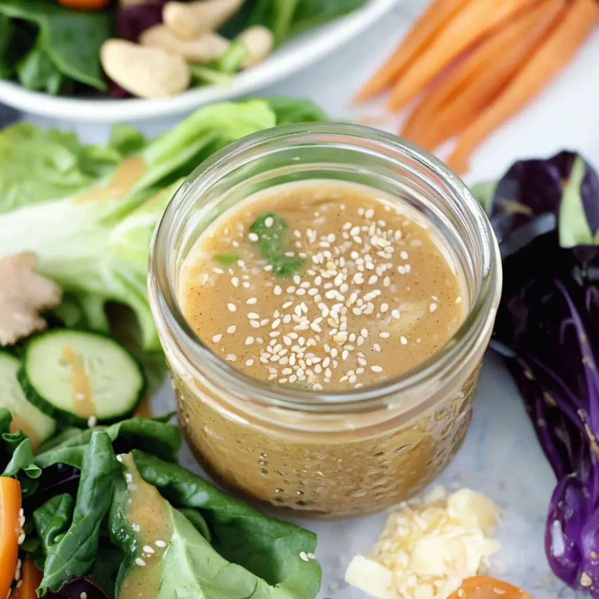 Jump to Recipe Print RecipeAs I stood in my kitchen, the fragrant aroma of fresh ginger and nutty tahini filled the air, instantly transporting me to a bustling Asian market. This Creamy Sesame Ginger Salad Dressing has become my go-to secret weapon, transforming simple greens into a mouthwatering masterpiece in just 10 minutes. With its tangy, velvety texture, it’s not only quick to whip up, but also perfect for drizzling over salads, grilled veggies, or even noodles. Plus, it’s a healthier alternative to store-bought options, leaving you feeling good about what you serve. Are you ready to elevate your next meal with this delightful dressing? Why is This Dressing a Must-Try? Quick and Easy: In just 10 minutes, you’ll have a creamy sauce that makes every salad shine. Flavorful Balance: The perfect harmony of ginger and tahini brings brightness and depth to any dish. Versatile Delight: Use it on salads, grilled veggies, or toss it with noodles for an instant flavor upgrade. It’s like having a gourmet dressing at home! Healthier Option: A lower-calorie alternative to store-bought dressings, this recipe lets you enjoy clean eating without sacrificing taste. Make Ahead: Store it for up to a week in the fridge—perfect for busy weeknights. Why not try drizzling this delightful dressing over a refreshing Watermelon Berry Salad or mix it into a vibrant Strawberry Spinach Salad? This dressing will have everyone asking for seconds! Sesame Ginger Salad Dressing Ingredients For the Dressing • Minced Fresh Ginger – Adds a bold, zesty kick; fresh is preferred for the best flavor. • Minced Red Onion – Contributes subtle sweetness and crunch; shallots can be a milder alternative. • Rice Vinegar – Provides acidity and balances sweetness; apple cider vinegar can be a flavorful substitute. • Mayonnaise – Ensures creaminess and richness; Greek yogurt is a lighter option if preferred. • Tahini – Adds a nutty flavor and smooth texture; can be omitted for nut-free diets but may alter consistency. • Sesame Oil – Imparts a deep, toasty flavor; any light oil can substitute, but flavor may vary. • Low-Sodium Soy Sauce – Introduces umami and saltiness; tamari is a gluten-free option. • Grapeseed Oil – Used to emulsify and blend the dressing smoothly; olive oil can be a healthier alternative. • Freshly Ground Black Pepper – Adds a little spice and depth; adjust based on your spice preference. • Toasted Sesame Seeds – Provide a crunch and enhance the sesame flavor; flax seeds can be used for extra nutrition. Prepare these simple yet vibrant ingredients for the perfect Sesame Ginger Salad Dressing that will have you drizzling with delight! Step‑by‑Step Instructions for Creamy Sesame Ginger Salad Dressing Step 1: Combine Ingredients In a blender, add the minced fresh ginger, minced red onion, rice vinegar, mayonnaise, tahini, sesame oil, and low-sodium soy sauce. Blend these vibrant ingredients on medium speed for about 30 seconds, until the mixture is smooth and creamy. The colors will harmonize beautifully, creating an inviting base for your Sesame Ginger Salad Dressing. Step 2: Emulsify with Oil With the blender running on low, slowly drizzle in the grapeseed oil. This process should take approximately 30 seconds; it helps emulsify the ingredients, creating a luscious texture. Watch as the dressing thickens and becomes velvety. Once the oil is fully incorporated, pause to scrape down the sides if needed, ensuring everything is well combined for the best results. Step 3: Add Seasoning After emulsifying, add freshly ground black pepper to taste. Blend again for about 10 seconds, just enough to incorporate the pepper throughout the dressing. This step enhances the flavor profile of your Sesame Ginger Salad Dressing, ensuring that every drop is packed with deliciousness. Step 4: Mix in Toasted Sesame Seeds Once blended, take a moment to stir in the toasted sesame seeds with a spatula. This adds a delightful crunch that elevates the texture of your dressing. Ensure they are well distributed, providing that signature sesame flavor as they coat each salad leaf beautifully. Step 5: Taste and Adjust Before serving, taste the dressing and adjust the seasoning if necessary. You may wish to add a bit more soy sauce for saltiness or extra black pepper for zest. Blend once more for about 5 seconds, ensuring all flavors meld perfectly. Your Creamy Sesame Ginger Salad Dressing is now ready to enhance any dish it graces. Step 6: Store for Future Use If you’re not using the dressing immediately, pour it into an airtight container and refrigerate. This dressing can stay fresh for up to a week. Just give it a good shake or stir before drizzling over your favorite salads or other dishes, bringing a burst of flavor to your meals. How to Store and Freeze Sesame Ginger Salad Dressing Fridge: Store your Sesame Ginger Salad Dressing in an airtight container in the fridge for up to one week. Make sure to give it a good shake or stir before each use to reintegrate the flavors. Freezer: If you want to keep the dressing for a longer period, you can freeze it in ice cube trays. Once frozen, transfer the cubes to a resealable bag and enjoy them within three months. Thawing: To use frozen dressing, simply thaw the desired amount in the fridge overnight or leave it at room temperature for about an hour before serving. Reheating: This dressing is typically enjoyed cold, so there’s no need to reheat. Just shake or stir before drizzling it over your favorite salads or dishes! Expert Tips for Sesame Ginger Salad Dressing • Room Temperature Ingredients: Ensuring all ingredients are at room temperature promotes better emulsification, creating a smoother, creamier dressing. • Store Properly: Keep the Sesame Ginger Salad Dressing in an airtight container in the fridge for up to a week. Remember to shake or stir well before using! • Balance Your Flavors: Always taste and adjust seasoning as you 