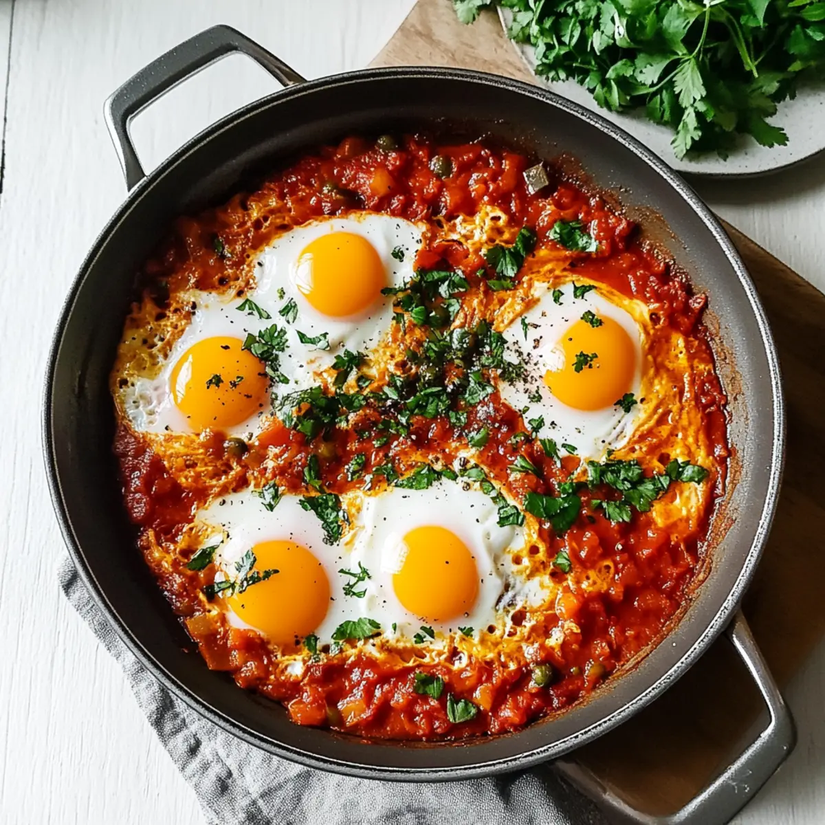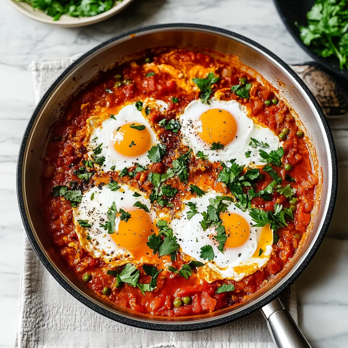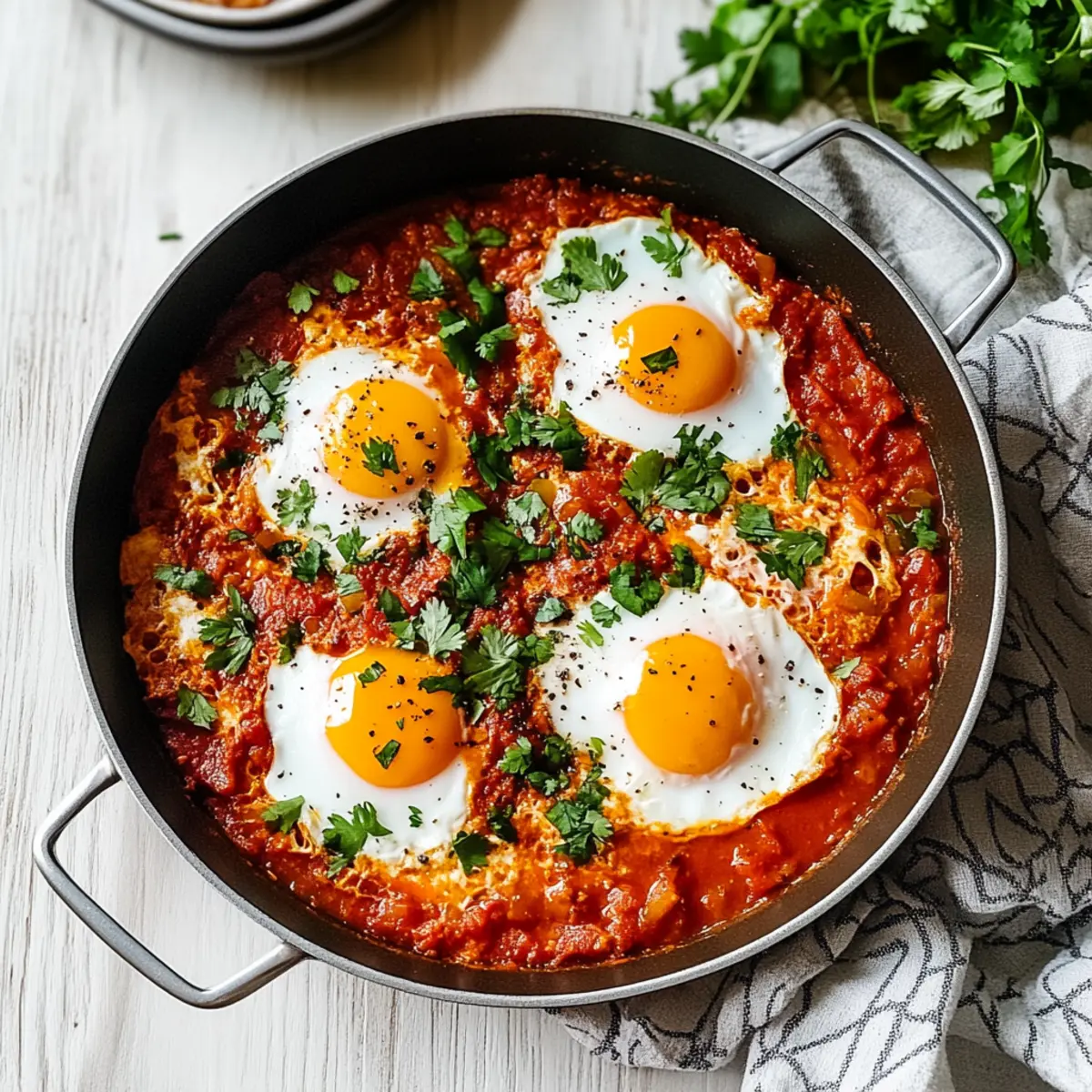 Jump to Recipe Print RecipeAs I stood in my kitchen, the aroma of sizzling onions and garlic transported me straight to a sun-soaked cafe in Morocco. Shakshuka is more than just a dish; it’s a quick, vibrant experience that transforms humble ingredients into a hearty meal. This spicy North African breakfast features poached eggs nestled in a luscious tomato sauce, combining healthiness with comfort in less than 30 minutes. Perfect for breakfast, lunch, or dinner, it’s a delightful way to make mealtime special without extensive prep. The beauty of shakshuka lies in its versatility—you can easily adapt it with different vegetables or spices to suit your taste. Have you ever thought about making a colorful twist on this classic recipe? Let’s dive into the world of shakshuka and explore its endless possibilities! Why is Shakshuka a Must-Try Dish? Quick and Easy: This recipe takes less than 30 minutes from start to finish, making it perfect for busy mornings or spontaneous lunch breaks. Flavor Explosion: The rich blend of spices, combined with poached eggs in a zesty tomato base, offers a beautiful harmony of savory and tangy flavors that will awaken your taste buds. Versatile Option: Customize your shakshuka! Add your favorite veggies like spinach or zucchini, or experiment with spices to cater to any palate. Nutritious Meal: With a balance of healthy fats and protein, this dish is not just delicious but packed with nutrients, ideal for a wholesome breakfast or quick dinner. Crowd-Pleaser: Whether serving family, friends, or just yourself, shakshuka is sure to impress. It’s a unique meal that transforms simple ingredients into something extraordinary. Don’t forget, serving it with some crusty bread can elevate your experience as you soak up all that flavorful sauce! Check out our tips on how to make the perfect shakshuka variations for even more delightful meal options. Shakshuka Ingredients For the Sauce • Olive Oil – Adds richness and aids in sautéing; substitute with avocado oil for a different flavor. • Onion – Provides sweetness and depth of flavor; use yellow or white onion for best results. • Red Bell Pepper – Adds sweetness and texture; can be replaced with green bell pepper. • Garlic – Imparts a robust flavor; increase for more garlic goodness or use garlic powder. • Paprika – Delivers smokiness and color; smoked paprika enhances the overall flavor profile. • Cumin – Adds earthy warmth; substitute with coriander for a lighter spice. • Chili Powder – Provides mild heat and depth; adjust quantity to suit your heat preference. • Whole Peeled Tomatoes – Key for the sauce base; fresh tomatoes can be swapped in if desired. For the Eggs • Large Eggs – Create a satisfying protein-rich element; use tofu for a vegan version if preferred. Seasonings • Salt and Pepper – Essential for taste enhancement; consider using sea salt for richer flavor. • Cilantro and Parsley – Fresh herbs for garnish; basil or green onions work as tasty alternatives. Each ingredient in this shakshuka recipe contributes to a beautiful, flavor-packed meal that you can enjoy in under 30 minutes! Step‑by‑Step Instructions for Shakshuka Step 1: Heat the Oil In a large sauté pan, heat 2 tablespoons of olive oil over medium heat until shimmering. This should take about 1-2 minutes. The oil is ready when you see it glistening. Make sure to use a pan with a lid, as you’ll need to cover it later for cooking the eggs. Step 2: Sauté the Vegetables Add 1 diced onion and 1 diced red bell pepper to the hot oil, sautéing for about 5 minutes. Stir occasionally until the onion turns translucent and fragrant, signaling that it’s softened and sweetened. The vibrant colors will brighten up your kitchen and set the stage for the delicious Shakshuka that’s to come. Step 3: Add Aromatics and Spices Stir in 3 minced garlic cloves along with 1 teaspoon each of paprika and cumin, plus ½ teaspoon of chili powder. Cook for an additional minute until the mixture becomes aromatic. The spices will toast lightly, filling your kitchen with enticing scents—this is the foundation of your rich tomato sauce. Step 4: Incorporate the Tomatoes Pour in a 28-ounce can of whole peeled tomatoes, breaking them down with a wooden spoon as you mix. Season with salt and pepper to taste, then allow the mixture to come to a gentle simmer. This will take about 5 minutes; visually, you’ll see the sauce thicken slightly and bubble around the edges. Step 5: Create Wells for Eggs Once the sauce is simmering beautifully, use the back of a spoon to make small wells in the sauce. Carefully crack 4 large eggs into each well, keeping the yolks intact. It’s okay if the eggs disperse a little; they’ll cook perfectly in the sauce. Step 6: Cover and Cook the Eggs Cover the pan with a lid and let the Shakshuka simmer for 5 to 8 minutes. Keep an eye on the eggs; you want the whites to be set while the yolks remain runny. Once the edges appear firm and the whites are no longer clear, it’s time to remove the lid. Step 7: Garnish and Serve Once fully cooked, remove the pan from heat and sprinkle with freshly chopped cilantro and parsley for a burst of color and flavor. Serve your Shakshuka hot, ideally with crusty bread for dipping. This hearty and visually appealing meal is now ready to be enjoyed right from the pan! What to Serve with Shakshuka Transform your delicious shakshuka into a complete meal by pairing it with these enticing dishes and drinks. Crusty Bread: Perfect for soaking up the rich tomato sauce, bread adds a delightful texture to your meal. Avocado Slices: Creamy avocado complements the spicy flavors beautifully, providing a refreshing contrast in every bite. Feta Cheese: Crumbled on top, feta introduces a salty creaminess that balances the shakshuka’s robust spices. Mixed Green Salad: A light salad with lemon vinaigrette offers a zesty freshness, brightening the overall experience. Roaste