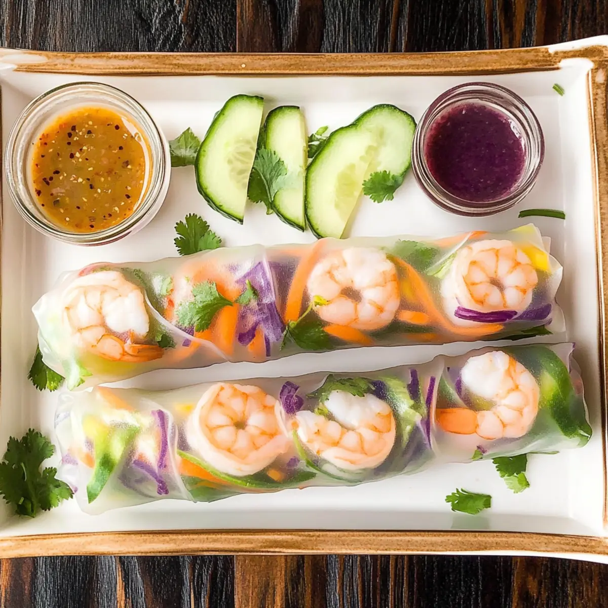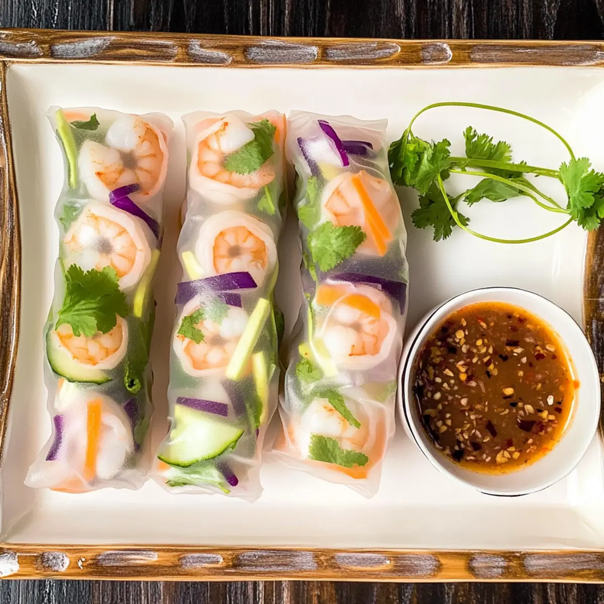 Jump to Recipe Print RecipeThe moment I rolled the first shrimp spring roll, I felt like a culinary magician conjuring up something delightful. These fresh shrimp spring rolls, with their vibrant wraps boasting crisp veggies and tender shrimp, have become a staple in my kitchen. Not only are they a feast for the eyes, but their quick prep time of just 15 minutes also makes them perfect for busy weeknights or casual gatherings. Plus, their versatility means you can customize them with your favorite fillings, whether that’s zesty herbs or a medley of colorful vegetables. Ready to impress your friends and family? Let’s dive into this delicious recipe, guaranteed to bring a burst of freshness to your dining table! Why are Shrimp Spring Rolls a Must-Try? Freshness, these spring rolls are all about vibrant, crisp ingredients that jump off the plate. Customization allows you to swap in your favorite veggies or proteins, making each roll uniquely yours! Quick to prepare, these beauties are ready in just 15 minutes, so they fit perfectly into a busy lifestyle. Healthy option, at just 104 calories per roll, they’re packed with flavor and nutrients, keeping you satisfied without the guilt. Crowd-pleaser, whether served as appetizers at a party or enjoyed as a light meal, these rolls are sure to impress guests and family alike! Try pairing them with a delicious main course like Crispy Ginger Beef for a complete feast! Shrimp Spring Rolls Ingredients For the Rolls • Rice paper wrappers – These pliable wrappers are essential for holding everything together; soak briefly for flexibility. • Shrimp – Provides satisfying protein and a mild seafood flavor; feel free to substitute with cooked chicken, tofu, or smoked salmon if desired. • Carrots – Add crunchy texture and vibrant color; slicing them into matchsticks enhances the overall experience. • Cucumbers – Offer a refreshing crispness; peel and julienne for ease of rolling. • Yellow bell pepper – Contributes sweetness and color; thin slices create a balanced bite. • Red cabbage – Adds a pop of purple and extra crunchiness. • Microgreens – Introduce a fresh, slightly peppery note to your rolls. • Rice noodles – Helps bulk up the rolls with a chewy texture; make sure they are cooked and drained. • Fresh basil – Delivers a sweet and aromatic herbal note, making it a wonderful base for the filling. For the Spicy Garlic Dipping Sauce • Red chili sauce – Forms the spicy base of this dip, bringing the heat! • Garlic – Adds a robust flavor that enhances the overall taste. • Rice wine vinegar – Introduces tanginess, balancing the heat perfectly. • Ginger paste – Offers warmth and a zing that complements the other flavors. • Soy sauce – Provides a depth of umami flavor and a hint of saltiness. • Red pepper flakes – For an extra kick in the dipping sauce; adjust to your heat preference. Dive into this simple yet delightful recipe, and let the freshness of your shrimp spring rolls shine through! Step‑by‑Step Instructions for Fresh Shrimp Spring Rolls Step 1: Prepare the Fillings Begin by preparing the vibrant fillings for your shrimp spring rolls. Slice the cucumbers and yellow bell pepper into thin strips, and shred the red cabbage finely. Next, cook the rice noodles according to package instructions, then drain them and rinse under cold water to stop the cooking process. Set all these colorful ingredients aside, ready for assembly. Step 2: Soak Rice Paper Wrappers In a shallow dish, pour warm water and dip the rice paper wrappers in for about 5-10 seconds until they become soft and pliable. Carefully remove the wrappers and place them on a damp surface or plate to prevent sticking. This step is crucial for ensuring your shrimp spring rolls have that perfect delicate texture. Step 3: Assemble the Rolls Take a softened rice paper wrapper and lay it flat on your work surface. Starting about one-third from the bottom, place three shrimp horizontally down the center. Layer on fresh basil leaves, followed by a small handful of rice noodles, matchstick carrots, julienned cucumbers, sliced bell pepper, shredded red cabbage, and a few microgreens to fill the rolls generously but not overflowing. Step 4: Roll It Up Fold the sides of the rice paper inward, then carefully roll it tightly from the bottom up to form a secure wrap around your delicious filling. Aim for a snug but gentle grip to maintain the structure of your shrimp spring rolls. Repeat this process with the remaining wrappers and filling until all ingredients are utilized. Step 5: Make the Spicy Garlic Dipping Sauce To prepare the flavorful dipping sauce, grab a food processor and combine red chili sauce, minced garlic, rice wine vinegar, ginger paste, soy sauce, and red pepper flakes. Blend these ingredients until smooth and well-integrated, tasting to adjust the heat level to your preference. This zesty sauce will elevate your fresh shrimp spring rolls beautifully. Step 6: Serve and Enjoy Once all your fresh shrimp spring rolls are assembled, arrange them on a serving platter alongside the spicy garlic dipping sauce. These spring rolls are best enjoyed fresh, so gather your family or friends, and dig in right away to savor the delightful crunch-and-flavor combination in each bite! Make Ahead Options These Fresh Shrimp Spring Rolls are a fantastic choice for meal prep, allowing you to enjoy healthy, flavorful bites throughout the week! You can prepare all the fillings—including the shrimp, vegetables, and rice noodles—up to 3 days in advance. Simply store them in airtight containers in the refrigerator to maintain their freshness. For best results, soak the rice paper wrappers just before rolling; this keeps them pliable and prevents them from hardening. When you’re ready to serve, assemble the rolls and enjoy them with the spicy garlic dipping sauce, ensuring you have a quick and satisfying meal ready in no time. This way, you can sk