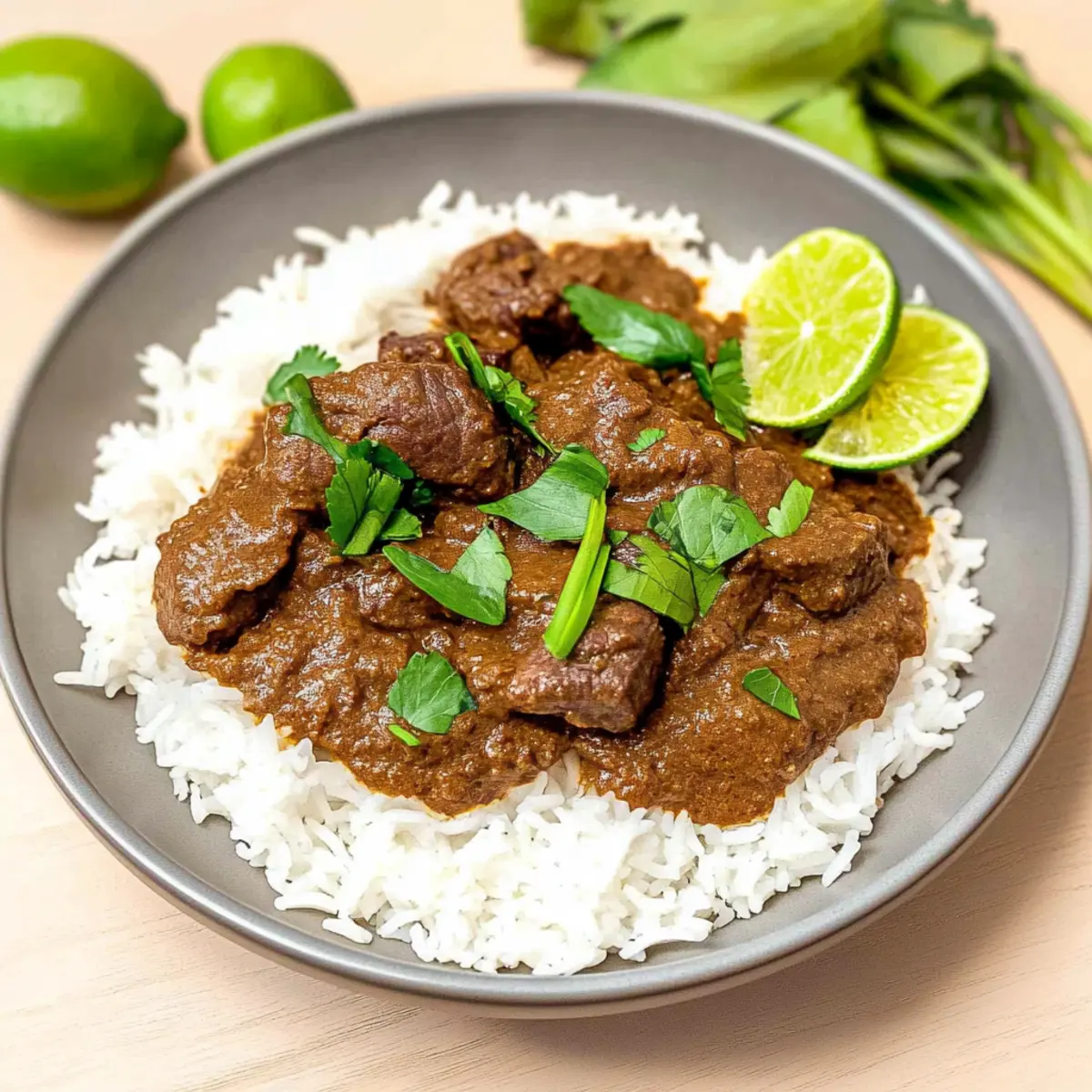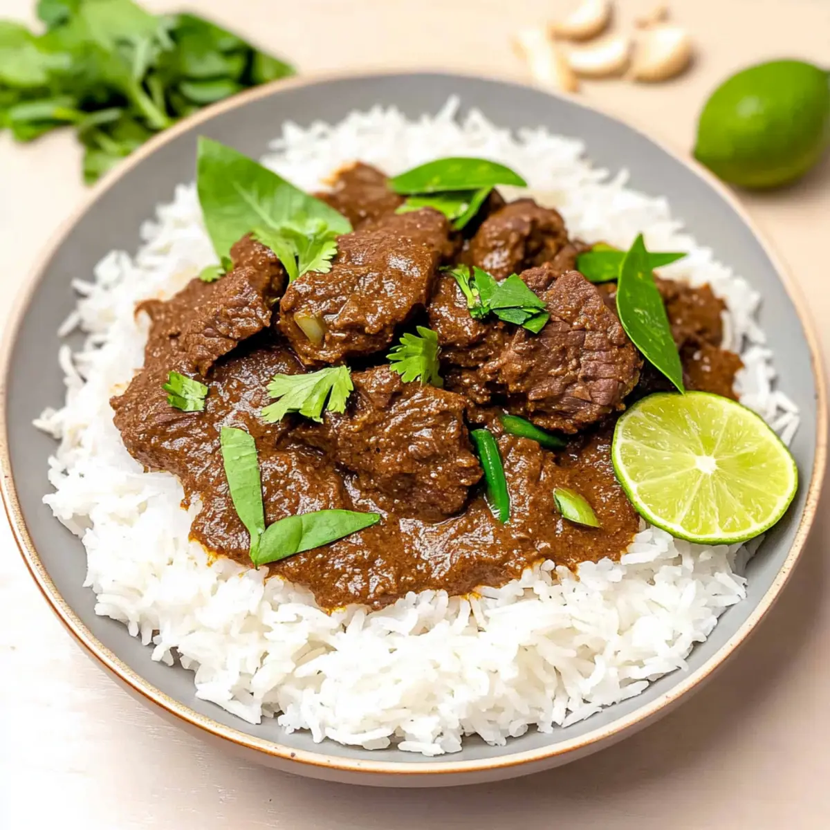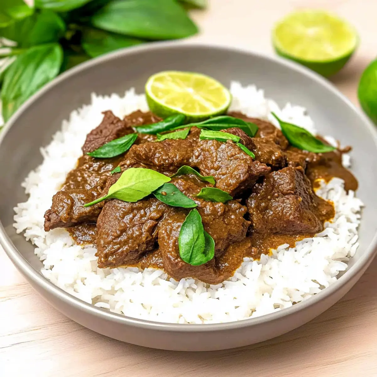 Jump to Recipe Print Recipe“I wasn’t expecting to be transported to a bustling market in Jakarta while stirring my slow cooker last week. The aroma of spices filled my kitchen as I set out to create a rich and fragrant Slow Cooker Beef Rendang. This Indonesian curry, with its tender chunks of beef simmered in creamy coconut milk and an orchestra of spices, is a delicious escape from the ordinary. Not only is this dish easy to prepare—just dump everything into the pot and let it work its magic—but it also invites unique flavors that can redefine your weeknight meals. If you’re craving comfort food that stands out and delights the senses, keep reading to uncover the secrets of an unforgettable slow-cooked masterpiece. What are you waiting for?” Why is Slow Cooker Beef Rendang a Must-Try? Irresistible Flavor: This Beef Rendang combines the deep, rich taste of coconut milk with aromatic spices that will mesmerize your taste buds. Simple Preparation: Just dump everything in the slow cooker, and you’re set! Perfect for those busy weeknights when you crave something extraordinary without the hassle. Crowd-Pleaser: Whether you serve it to family or guests, this dish will impress everyone at the table. It’s a fantastic centerpiece for gatherings! Versatile Options: Try substituting beef with chicken or even go vegan with hearty vegetables for those special dietary needs. Each variation stays deliciously true to its roots. Freezer-Friendly: Make ahead and store in the freezer—this dish stays flavorful for up to three months! Just think how easy dinner will be when you have Savory Slow Cooker meals ready to go. Slow Cooker Beef Rendang Ingredients For the Beef • Stewing Beef or Boneless Beef Shank – Cut into 2-inch cubes for tender, succulent bites. For the Sauce • Full-Fat Coconut Milk – Adds a creamy richness that balances the spices perfectly. • Whole Cloves – Infuse a warm, aromatic flavor that enhances the richness of the stew. • Lemongrass – Offers fresh, lemony brightness; cut into segments for a vibrant infusion. • Ginger – Adds warmth and spice; peel and slice before blending for the best flavor. • Galangal – Imparts a unique, floral taste; substitute with more ginger and lemongrass if needed. • Garlic – Use an entire head for robust, savory depth that transforms the sauce. • Thai Chile Peppers – Adds heat; adjust the amount based on your spice preference or omit for a milder stew. • Shallots or Onion – Adds sweetness and depth; shallots are traditional, but onions work just as well. • Salt – Enhances overall flavor; adjust to taste based on your preference. For the Spices • Star Anise – Contributes sweet, anise notes; one whole piece brings fantastic flavor balance. • Cinnamon Stick – Introduces warmth and comforting aroma; a two-inch piece is sufficient. For Garnishing • Toasted Coconut Flakes (Kerisik) – Essential for flavor depth; can be homemade or store-bought. • Makrut Lime Leaves (Kaffir Lime Leaves) – Critical for authentic flavor; excellent for drying or freezing for later use. • Tamarind Paste – Adds tanginess; lime juice mixed with brown sugar can be a good substitute. Use these ingredients to create an unforgettable Slow Cooker Beef Rendang that will bring warmth to your dinner table! Step‑by‑Step Instructions for Slow Cooker Beef Rendang Step 1: Prepare the Beef Begin by adding 2 pounds of stewing beef or boneless beef shank, cut into 2-inch cubes, to your slow cooker. Ensure the beef is evenly distributed across the bottom to promote even cooking. This hearty foundation is essential for creating the rich and flavorful meat that defines your Slow Cooker Beef Rendang. Step 2: Blend the Sauce In a blender, combine one can of full-fat coconut milk, whole cloves, half of the lemongrass segments, ginger, galangal, garlic, Thai chile peppers, shallots, and salt. Blend until the texture is chunky yet smooth, allowing the vibrant flavors to mingle. This aromatic sauce will envelop the beef in your slow cooker, creating layers of taste as it cooks. Step 3: Combine and Infuse Pour the blended sauce over the beef in the slow cooker, ensuring all the meat is generously coated. Next, add the star anise, cinnamon stick, toasted coconut flakes, and the remaining lemongrass segments. These spices will infuse warmth and depth into the dish, enhancing the traditional flavors of the Slow Cooker Beef Rendang. Step 4: Cook Slow and Steady Cover the slow cooker and set it to cook on high for 6 hours. The smell will be fantastic as the mixture bubbles gently. After about 3 hours of cooking, stir in the makrut lime leaves, which will impart their citrusy aroma into the stew. Step 5: Final Touches Once the cooking time is complete, mix in the tamarind paste and adjust the salt to your taste. If the dish appears too wet, let it simmer uncovered for an additional 30 minutes on high; it should thicken to a rich consistency. Your Slow Cooker Beef Rendang should now look thick and dark, ready to be savored. How to Store and Freeze Slow Cooker Beef Rendang Fridge: Keep your Slow Cooker Beef Rendang in an airtight container for up to 4 days for the best flavor retention. Freezer: Freeze portions in airtight bags or containers for up to 3 months. Make sure to label them for easy identification and convenience! Reheating: Thaw overnight in the fridge before reheating. Warm on the stove or microwave until steaming hot. Add a splash of coconut milk if the sauce thickens too much. Room Temperature: Avoid leaving the beef rendang out for more than 2 hours to maintain its quality and safety. Make Ahead Options These Slow Cooker Beef Rendang preparations are perfect for busy home cooks looking to save time during the week! You can chop the beef and blend the sauce up to 24 hours in advance, then refrigerate them separately to maintain their freshness. Just remember to cut the beef into 2-inch cubes and store it in an airtight containe