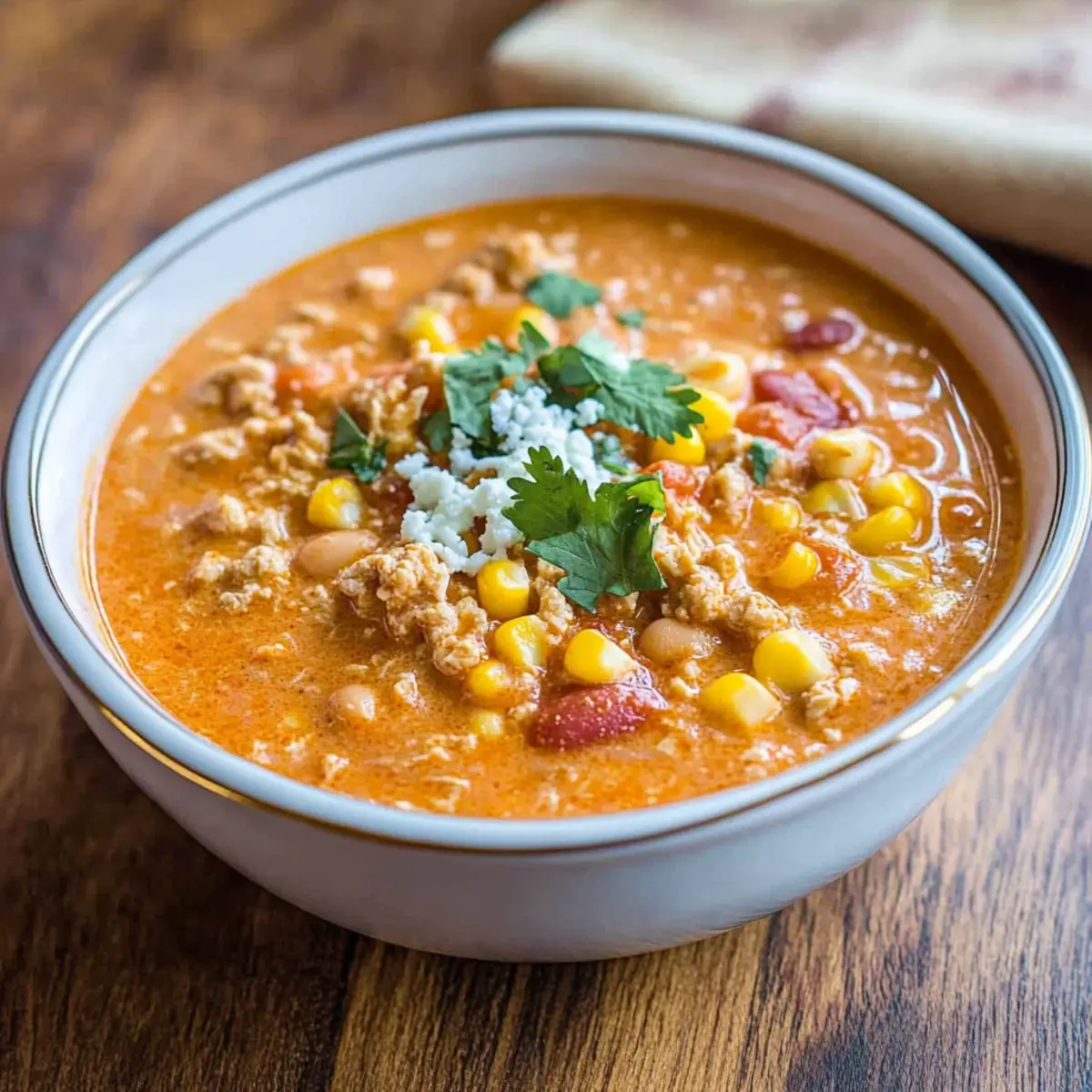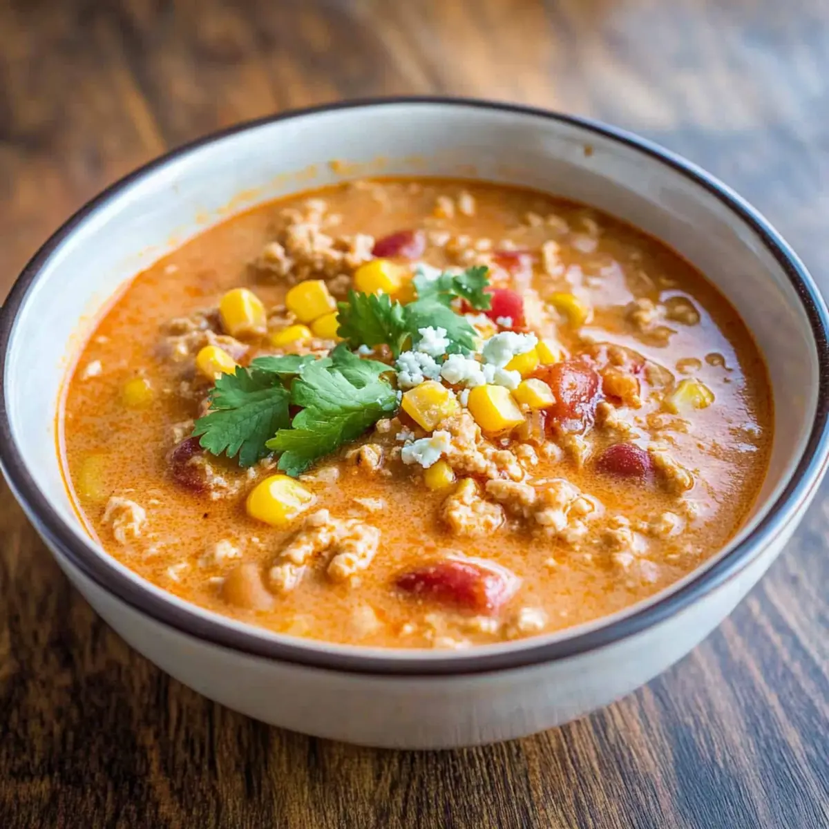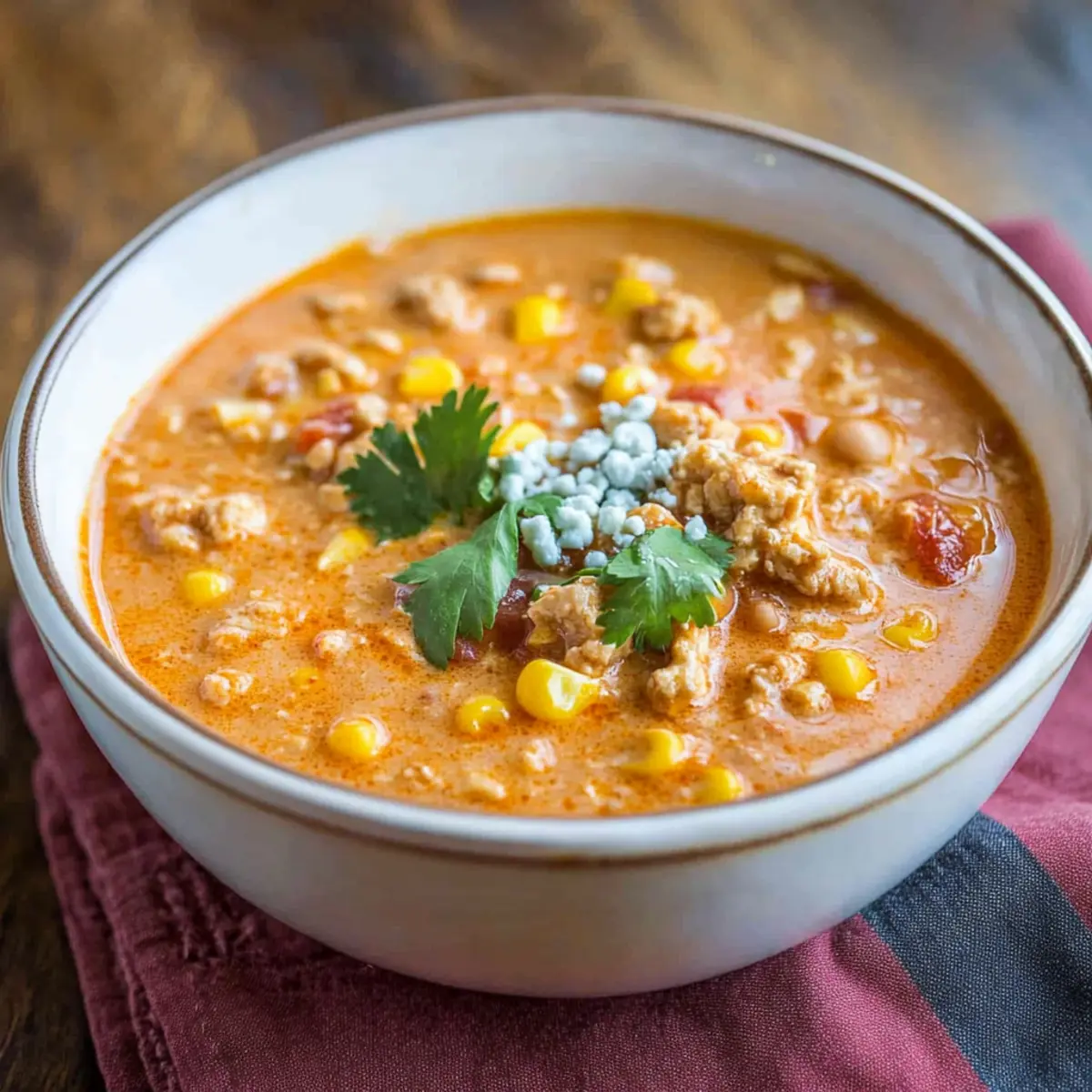 Jump to Recipe Print RecipeWalking into my kitchen, I’m greeted by the mouthwatering aroma that promises a cozy evening ahead. Today, I’m excited to share my recipe for Slow Cooker Buffalo Chicken Chili, a dish that transforms a few simple ingredients into a heartwarming comfort food experience. The combination of ground chicken, a dash of buffalo sauce, and the creamy richness of cream cheese makes this chili not just a meal, but an invitation to gather around the table. It’s ideal for everything from family movie nights to those spontaneous get-togethers with friends. With minimal prep and maximum flavor, you can easily whip up a batch that delights and nourishes. Are you ready to dive into this creamy, spicy delight that’s sure to become a new favorite at your table? Why is This Chili a Must-Try? Comforting, Creamy Texture: The blend of cream cheese adds a rich velvetiness that makes each spoonful feel indulgent. Spicy Kick: A generous splash of buffalo sauce ensures your taste buds are awakened by a delightful heat without being overwhelming. Effortless Preparation: Simply combine your ingredients in a slow cooker, letting technology do the work while you enjoy other activities. Family-Friendly Appeal: This chili is a crowd-pleaser! Serve it at family gatherings or alongside other favorites like Cheesy Chicken Enchiladas for an unforgettable meal. Versatile and Adaptable: Easily personalize it with extra veggies or adjust the spice level to accommodate everyone’s tastes. Whether you’re cooking for one or a group, this recipe offers flexibility without sacrificing flavor. Make-Ahead Wonder: Prepare in advance and freeze! It’s your go-to dish for those busy days or unexpected get-togethers. Simply reheat and serve with tortilla chips for added crunch. Slow Cooker Buffalo Chicken Chili Ingredients For the Chili • Ground Chicken – Provides the primary protein source for the chili; substitute with ground turkey for a leaner option. • Canned White Navy Beans – Adds heartiness and fiber; can be replaced with cannellini beans or omitted for a bean-free version. • Fire Roasted Tomatoes – Contributes a rich flavor and slightly smoky essence; use regular diced tomatoes in a pinch. • Chicken Broth – Forms the chili base, enhancing the overall flavor; vegetable broth can substitute for a vegetarian option. • Buffalo Wing Sauce – Brings heat and spiciness; adjust the quantity according to spice preference, using a milder sauce for less heat. • Ranch Dressing Mix – Infuses tangy flavor; homemade ranch seasoning can be a healthier alternative. • Frozen Corn Kernels – Adds sweetness and color; fresh corn can be used if in season. • Onion Powder, Garlic Powder, Celery Salt, Dried Cilantro, Salt – Enhance the flavor profile; adjust these seasonings based on your taste. For the Creaminess • Cream Cheese – Provides creaminess and richness; for a lighter version, low-fat cream cheese or Greek yogurt work well. • Blue Cheese Crumbles (optional) – Adds an extra layer of flavor; omit if not preferred or for a milder finish. Step‑by‑Step Instructions for Slow Cooker Buffalo Chicken Chili Step 1: Brown the Chicken In a large skillet, heat a splash of oil over medium heat. Add the ground chicken and cook until it’s beautifully browned and no longer pink, about 5-7 minutes. This step enhances the flavors, so make sure to break up the meat as it cooks. Once done, drain any excess fat and set the browned chicken aside. Step 2: Combine Ingredients In your slow cooker, combine the browned chicken with the canned white navy beans, fire roasted tomatoes, chicken broth, buffalo wing sauce, ranch dressing mix, frozen corn, onion powder, garlic powder, celery salt, and dried cilantro. Stir everything together to blend the flavors evenly, creating a vibrant mix that promises deliciousness in your Slow Cooker Buffalo Chicken Chili. Step 3: Add the Cream Cheese Place the block of cream cheese directly on top of the mixture in the slow cooker. There’s no need to mix it in just yet; covering it will let it melt beautifully as the chili cooks. Make sure your slow cooker lid is snug to keep all the heat and moisture in for a richer flavor. Step 4: Cook the Chili Set your slow cooker to high and let it work its magic for 4 hours, or on low for 8 hours. As it cooks, the aromas will fill your kitchen, signaling that your Slow Cooker Buffalo Chicken Chili is coming together nicely. You’ll know it’s ready when the chili is bubbly and thickened, and the cream cheese has fully melted. Step 5: Finish and Adjust Once the cooking time is up, stir the chili thoroughly to mix in the melted cream cheese, creating that luxurious, creamy texture. Taste your dish and adjust the spice level by adding more buffalo sauce if desired, perfecting the heat to suit your family’s preference before serving. Step 6: Serve Ladle the comforting Slow Cooker Buffalo Chicken Chili into bowls, and if you want to elevate it further, sprinkle with optional blue cheese crumbles on top. Serve it hot, pairing it with tortilla chips or cornbread for a delightful meal. This dish not only warms the soul but also brings everyone together. What to Serve with Slow Cooker Buffalo Chicken Chili Set your table for a cozy gathering, pairing the bold flavors of this delightful chili with simple sides that enhance its warmth and comfort. Tortilla Chips: The perfect crunchy counterpart, perfect for scooping up the creamy chili, adding texture and contrast. Creamy Coleslaw: A refreshing, tangy slaw brightens each bite, balancing the chili’s rich flavors with a crisp, cooling touch. Cornbread Muffins: Soft and slightly sweet, these muffins soak up the chili’s juices, making for an indulgent side that’s utterly satisfying. Greek Yogurt: A dollop of yogurt on top adds a smooth creaminess that complements the spices, making each spoonful a little more luxurious. Honey Glazed Carrots: Their natural sweetness pa
