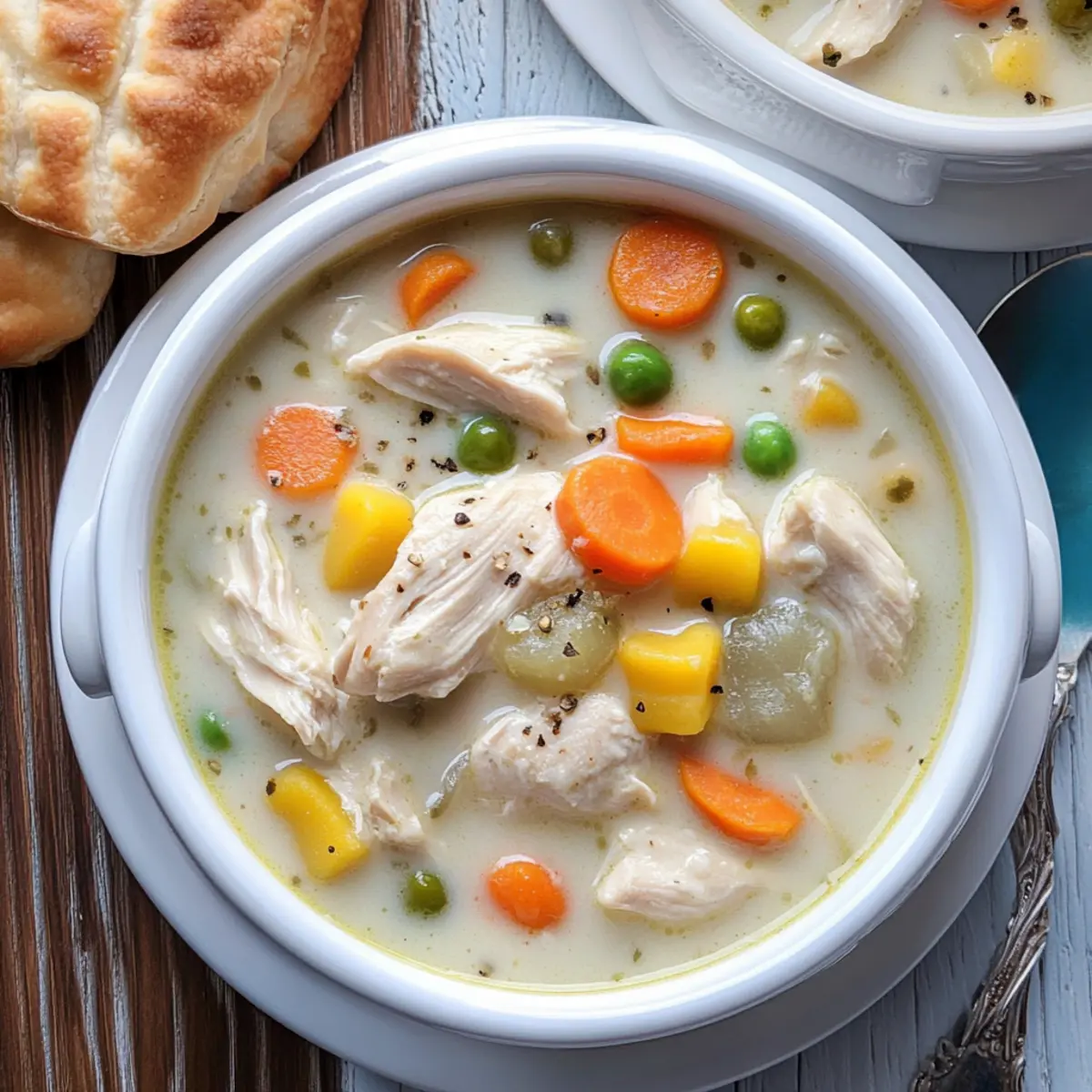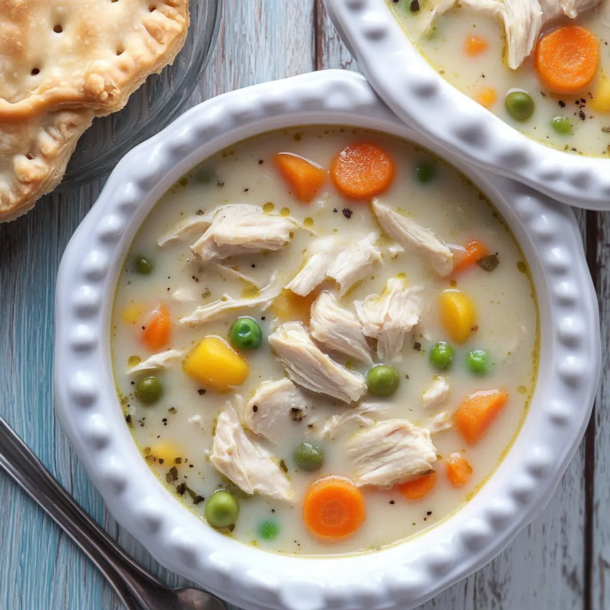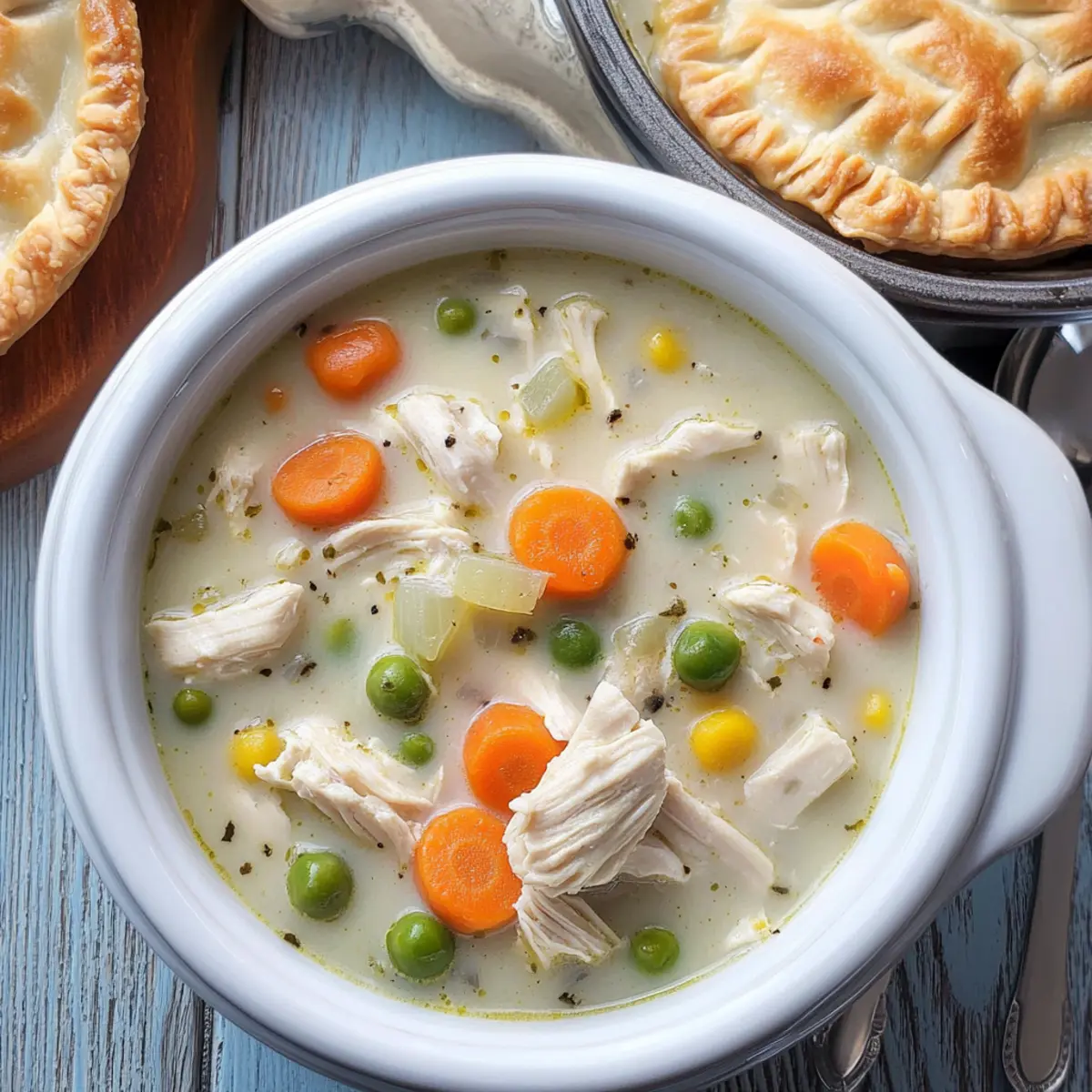 Jump to Recipe Print RecipeAs the leaves change and the air turns crisp, there’s nothing quite like a bowl of Slow Cooker Chicken Pie Soup to wrap you in warmth and comfort. This hearty dish brilliantly combines the classic flavors of chicken pot pie into a delightful soup, making it the perfect easy recipe for those busy fall and winter nights. With tender pieces of chicken, vibrant vegetables, and a creamy broth, this soup checks all the boxes: it’s wholesome, satisfying, and truly mouthwatering. Plus, the slow cooker means you can set it and forget it—perfect for those hectic days when you need a meal that practically prepares itself. Are you ready to fill your kitchen with the enticing aroma of comforting goodness? Let’s dive into this cozy masterpiece! Why is this Chicken Pie Soup a Must-Try? Warmth in Every Spoonful: Enjoy a hearty bowl filled with the comforting flavors of chicken pot pie brought to life in soup form. Effortless Cooking: With your trusty slow cooker, this dish is easy to whip up, allowing you to tackle your busy day without a hitch. Flexible Ingredients: Using simple, accessible ingredients means you can tailor the soup to your taste. Swap in your favorite veggies or proteins based on what you have on hand! Family-Friendly Appeal: Kids and adults alike will adore this crowd-pleaser, making it perfect for family dinners or hearty gatherings. Serve it with crusty bread or homemade biscuits to soak up the luscious broth! Nutritional Balance: Each serving provides a satisfying dose of flavor and nourishment, helping you stay warm and healthy during cold months. This recipe truly embodies the spirit of comfort food! Slow Cooker Chicken Pie Soup Ingredients For the Soup Boneless Chicken Breast – Main protein source providing heartiness; consider using shredded rotisserie chicken for a quicker option. Onion – Adds a natural sweetness and base flavor to the soup. Celery – Provides a crunchy texture and aromatic flavor that enhances the soup. Carrots – Contributes sweetness and vibrant color to the mix. Frozen Peas – Introduces sweetness and a bright pop of color in every bowl. Frozen Corn – Adds sweetness and texture; you can replace it with more peas if you prefer. Russet Potatoes – Offers bulk and creaminess when cooked; substitute with Yukon gold potatoes for a buttery taste. Garlic – Enhances the overall flavor profile; fresh is ideal, but garlic powder works in a pinch. Chicken Broth – Serves as the base liquid, contributing to the soup’s depth of flavor—opt for low-sodium if you prefer less saltiness. Heavy Cream – Adds richness and creaminess to the soup; coconut milk is a great dairy-free alternative. All-Purpose Flour – Thickens the soup; swap with cornstarch for a gluten-free option. Salt & Pepper – Essential seasonings that elevate all the flavors. Dried Thyme & Bay Leaf – These herbs add complexity and a great aroma to the mix. Dive into this Slow Cooker Chicken Pie Soup and create a bowl of comfort that warms both the body and the soul! Step‑by‑Step Instructions for Slow Cooker Chicken Pie Soup Step 1: Prep Ingredients Begin by trimming the boneless chicken breast and chopping your onion, celery, and carrots into bite-sized pieces. Peel and chop the russet potatoes, and then drain the frozen peas and corn. Finally, mince the garlic to infuse the soup with robust flavors. This prep work ensures that your Slow Cooker Chicken Pie Soup will cook evenly and absorb all the delicious flavors. Step 2: Combine in Slow Cooker In a 5-6 quart slow cooker, add the trimmed chicken breast along with the chopped onion, celery, carrots, and potatoes. Sprinkle in the minced garlic, salt, pepper, and dried thyme, then toss in the bay leaf. Pour the chicken broth over the ingredients, making sure everything is submerged. This combination of fresh veg and broth sets the stage for a comforting soup. Step 3: Cook Cover the slow cooker and set it to cook on high for 4 hours. At this point, the chicken should be cooked through, and the vegetables will be tender. You’ll want to see a warm bubbling around the edges, which indicates that your Slow Cooker Chicken Pie Soup is coming together beautifully. Step 4: Shred Chicken After the cooking time has elapsed, carefully remove the bay leaf and take the chicken out of the slow cooker, letting it cool slightly. Once cool enough to handle, shred the chicken with two forks, achieving the perfect bite-sized pieces. Return the shredded chicken back to the slow cooker, mixing it into the flavorful broth. Step 5: Make Cream Mixture In a separate bowl, whisk together the all-purpose flour and heavy cream until smooth. This creamy mixture will add richness and help thicken the soup. Ensure there are no lumps as you blend, creating a velvety texture that will elevate your Slow Cooker Chicken Pie Soup to new heights of indulgence. Step 6: Thicken Soup Stir the creamy flour mixture into the slow cooker, gently folding it into the soup. Cover and cook on high for an additional 30-45 minutes, allowing it to thicken. As it cooks, keep an eye out for a creamy, luscious consistency that signals your soup is nearly ready to be served! Step 7: Serve Once thickened to your liking, ladle the rich and comforting Slow Cooker Chicken Pie Soup into warm bowls. You can garnish with fresh herbs for an extra touch if desired. Pair with crusty bread or homemade biscuits for a complete meal that warms the heart and soul. Enjoy your delicious creation! Make Ahead Options Creating your Slow Cooker Chicken Pie Soup ahead of time is a fantastic way to streamline meal prep. You can chop all your vegetables and trim the chicken up to 24 hours in advance; simply store them in an airtight container in the refrigerator to keep them fresh. For even more efficiency, you can also mix the cream and flour in a bowl and refrigerate that as well. When you’re ready to cook, combine all the prepped ingredients in your slow cooker, add the b