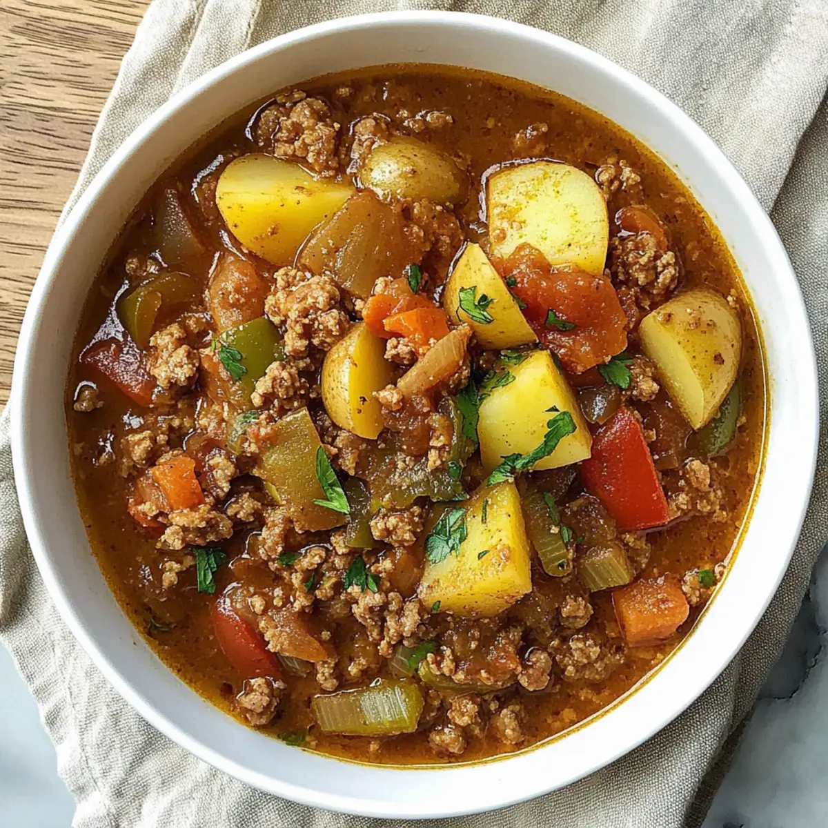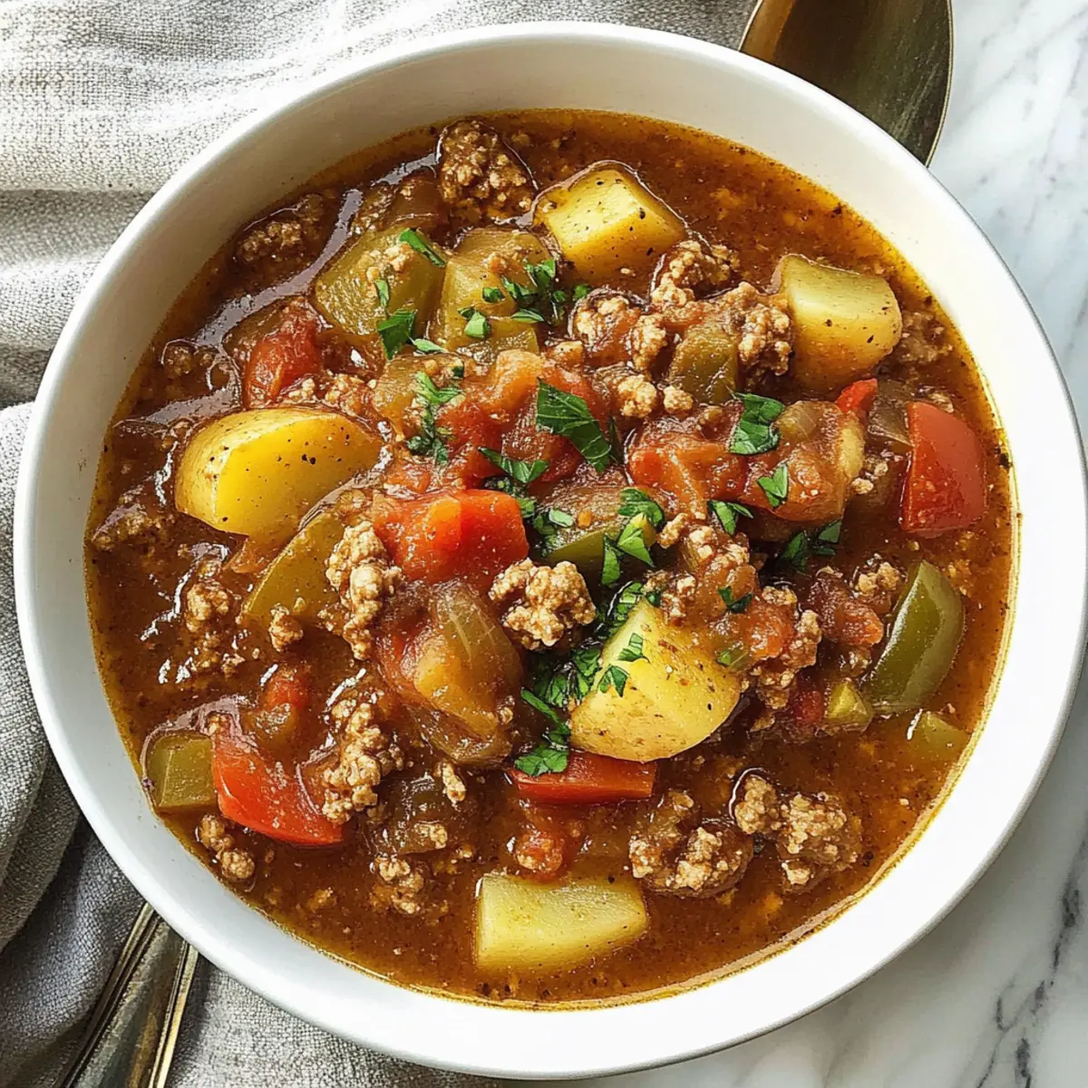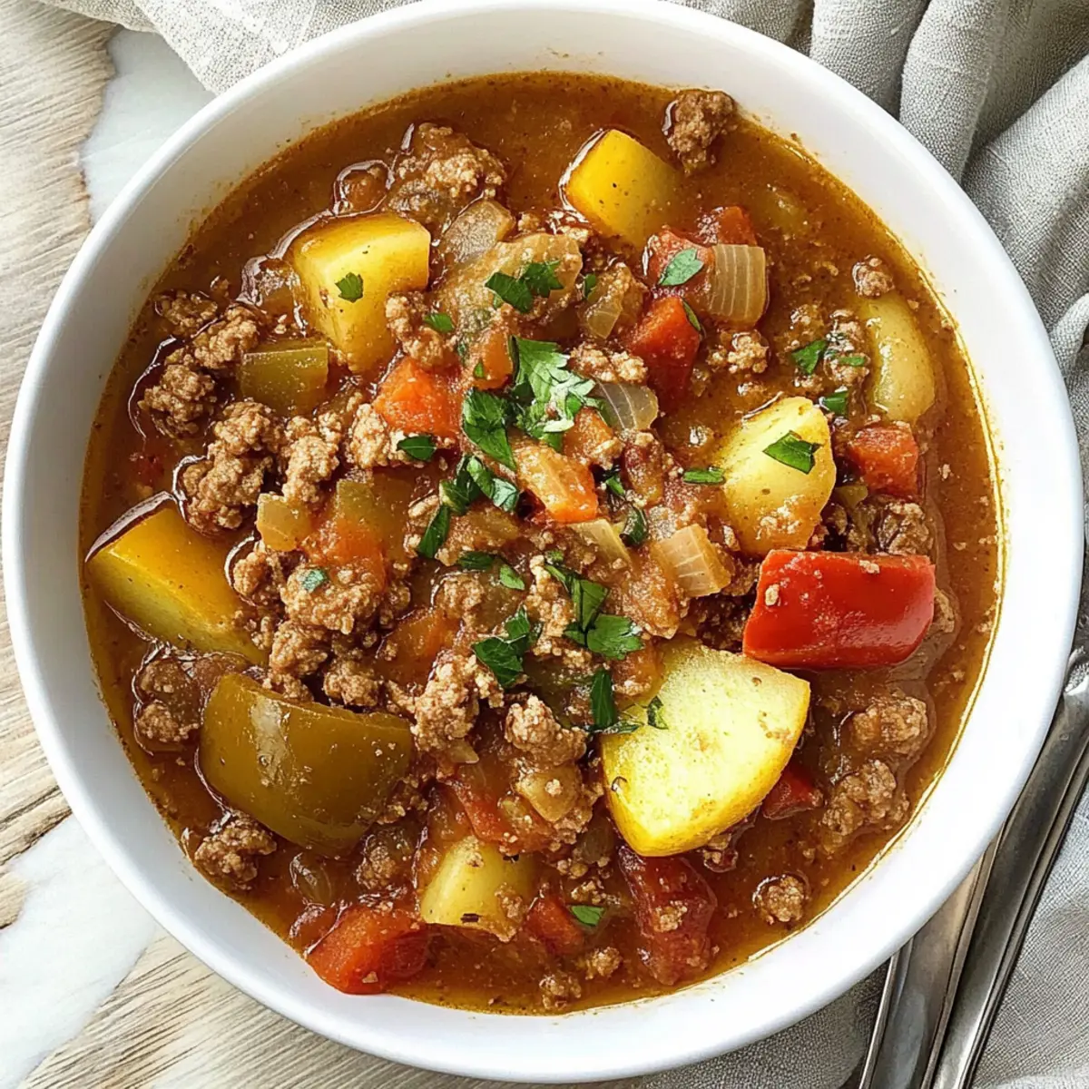 Jump to Recipe Print RecipeWinter evenings often evoke a special kind of warmth, especially when I catch a whiff of Slow Cooker Hamburger Stew simmering away. This hearty meal is my go-to for chilly nights, uniting ground beef, vibrant veggies, and aromatic spices into a comforting embrace. The beauty of this dish lies not just in its rich flavors but also in the effortless preparation—it practically cooks itself while I tackle other chores or curl up with a book. And if you’re mindful of dietary choices, you’ll love that this recipe is adaptable for Whole30 and low-carb diets. So, are you ready to discover how to make this soul-soothing stew? Let’s dive into the details! Why Is This Stew a Must-Try? Comforting Flavors: This Slow Cooker Hamburger Stew wraps you in a warm embrace with its savory blend of beef and veggies, perfect for chilly nights. Effortless Cooking: Simply toss all ingredients in the slow cooker; it’s set-it-and-forget-it marvel—ideal for busy days. Versatility Galore: With options to modify for Whole30 or low-carb diets, everyone can enjoy a bowl of goodness. Nutrient-Rich: Packed with hearty vegetables and lean protein, it’s a wholesome choice that fills you up without weighing you down. Crowd-Pleasing Delight: Whether you serve it at family gatherings or cozy dinners, this stew will have everyone asking for seconds! Consider pairing it with Hawaiian Chicken Salad for a refreshing side. Slow Cooker Hamburger Stew Ingredients • The key components that make this stew a comforting masterpiece! For the Beef Base Ground Beef – Use lean ground beef for a healthier option without sacrificing flavor. Low-Sodium Beef Broth – This adds liquid and depth of flavor; vegetable broth works if you prefer a lighter taste. For the Vegetables Potatoes – They provide hearty texture; waxy potatoes like red or yellow hold their shape beautifully during cooking. Onion – Adds sweetness and depth; yellow onions bring out the best flavors in stews. Garlic – Fresh garlic boosts flavor; a 1/4 teaspoon of garlic powder can be a quick substitute. Bell Pepper – Contributes color and sweetness; feel free to mix colors or use mild hot peppers for a kick. Celery – Offers crunch and flavor; you can omit if you’re short on ingredients. Diced Tomatoes – Serves as the base; canned make it easy, but fresh is delightful if you have them. For Flavoring Dry Mustard – Adds a subtle tang; swapping it for a teaspoon of Dijon works in a pinch. Relish – Brings a touch of sweetness; omit if you’re looking to cut down on sweetness. Seasonings (Salt & Pepper) – Essential for flavor; adjust these seasonings to your preference. Get ready to enjoy the warmth and comfort of this Slow Cooker Hamburger Stew as it simmers away, filling your kitchen with irresistible aromas! Step‑by‑Step Instructions for Comforting Chicken Pot Pie Soup Step 1: Brown the Beef In a large skillet over medium heat, add a drizzle of olive oil and heat for about 1 minute. Once hot, add the ground beef and chopped onions; cook for 5-7 minutes until the beef is browned and no longer pink, breaking it apart with a spatula as it cooks. Drain any excess grease before moving to the next step. Step 2: Add Garlic Stir in minced garlic and continue cooking for an additional minute until fragrant, stirring frequently to avoid burning. This step enhances the flavor profile of your Comforting Chicken Pot Pie Soup. Once done, transfer the beef mixture into your slow cooker for the next phase of cooking. Step 3: Combine Ingredients To the slow cooker, add diced potatoes, diced tomatoes, chopped celery, and bell pepper. Pour in the low-sodium beef broth along with the dry mustard and relish. Stir all ingredients together well to ensure the flavors meld beautifully while the soup cooks throughout the day. Step 4: Season and Cook Season your mixture generously with salt and pepper to taste, enhancing the comfort food richness. Cover the slow cooker and set it to cook on HIGH for 3-4 hours or on LOW for 6-8 hours. You’re looking for the vegetables to be tender and the soup to have thickened slightly by the end of the cooking time. Step 5: Adjust Consistency After the cooking time is up, check the consistency of your soup. If it’s too thick for your liking, stir in additional beef broth or water a little at a time until you reach your desired creamy texture. This step allows for personalization in your Comforting Chicken Pot Pie Soup before it’s served piping hot. Step 6: Serve and Enjoy Ladle the hearty soup into bowls and serve hot with crusty bread or a side salad for a complete meal. The savory aroma will fill your home, welcoming everyone to gather around the table and enjoy this cozy dish, perfect for chilly evenings. Make Ahead Options Preparing your Slow Cooker Hamburger Stew in advance is a fantastic way to save time on busy weeknights! You can chop your vegetables, cook the ground beef, and combine these components up to 24 hours in advance. Simply refrigerate the beef mixture and veggies in an airtight container. When you’re ready to enjoy your comforting stew, add everything to the slow cooker with broth and seasonings, and cook according to your recipe. This ensures your stew remains just as delicious while saving you essential cooking time. Plus, the flavors intensify overnight, making it even more delightful when served! What to Serve with Comforting Slow Cooker Hamburger Stew Looking to create a cozy, hearty meal that perfectly complements the rich flavors of your stew? Crusty Bread: This rustic side is perfect for dipping into the stew’s savory broth, enhancing the comfort food experience. Garlic Bread: The buttery, garlicky flavor pairs beautifully with the stew, adding a delightful crunch and aroma. Imagine savoring each bite, soaking up the delicious sauce. Steamed Green Beans: Fresh green beans provide a vibrant contrast that brightens the meal, balancing the richness of the stew. Simply st