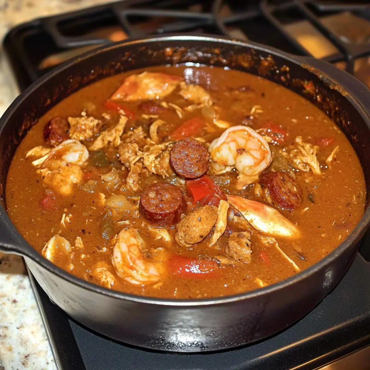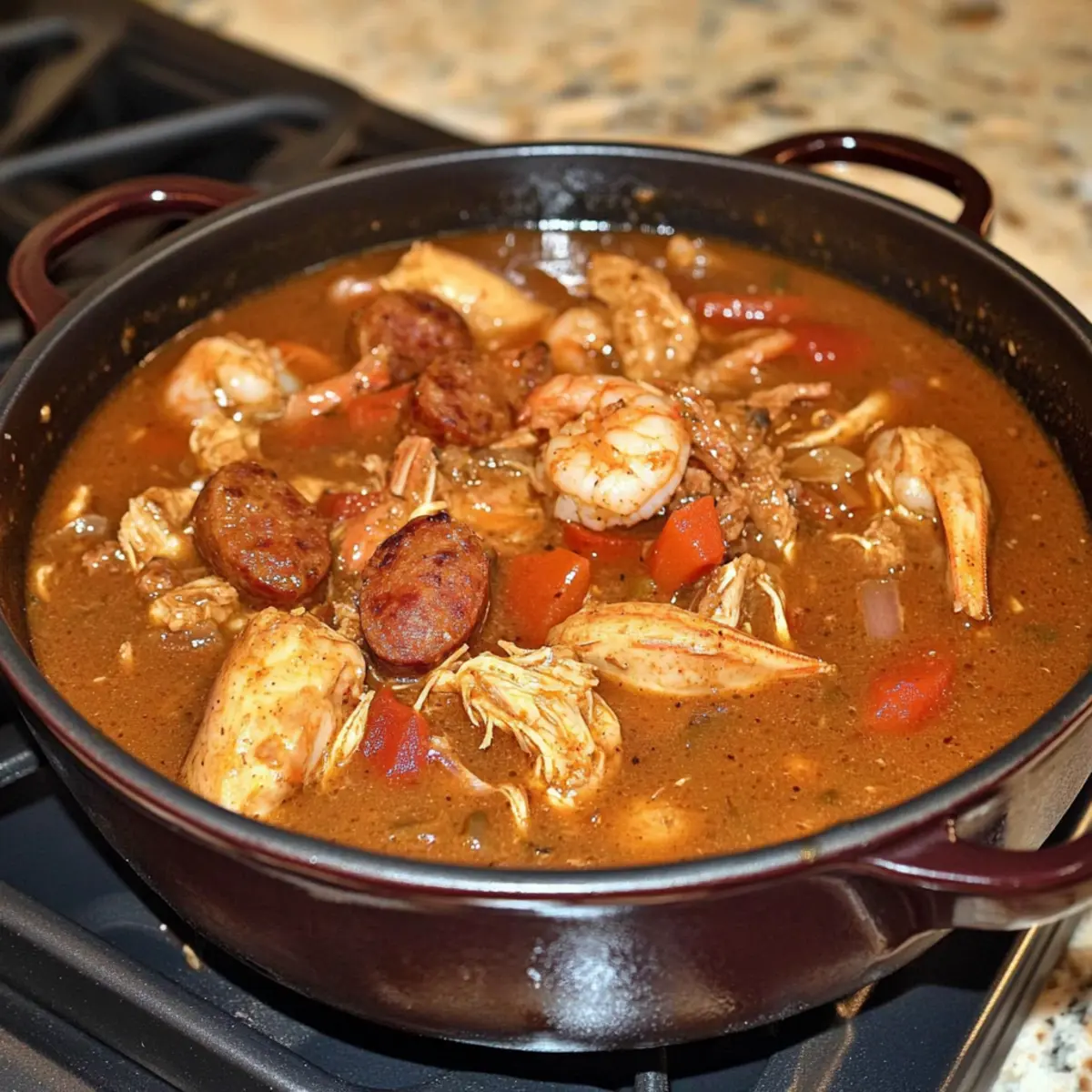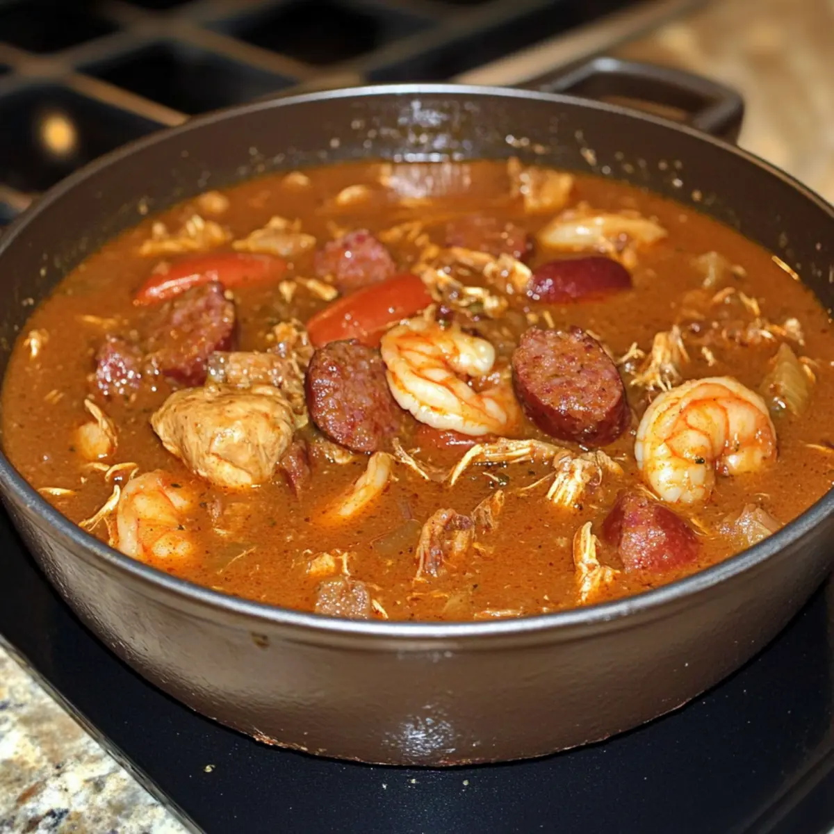 Jump to Recipe Print RecipeAs the fragrant aroma of Cajun spices begins to waft through your kitchen, you might find yourself transported to the vibrant streets of Louisiana. This Slow Cooker Keto Gumbo is not just a dish; it’s a celebration of flavor that serves up a hearty bowl of comfort while being mindful of your low-carb lifestyle. Packed with succulent chicken, spicy andouille sausage, and perfectly tender shrimp, this recipe allows you to create a delicious, gluten-free meal with minimal effort. One of the best parts? You can set it and forget it, letting the slow cooker work its magic while you go about your day. Whether you’re looking to impress friends at dinner or craving a cozy night in, this gumbo will surely be a hit. Curious about how easy it is to whip up? Let’s dive into this culinary adventure! Why is this keto gumbo a must-try? Easy Preparation: Just toss all the ingredients into your slow cooker, and you’re set! Bold Flavors: The combination of cajun spices, andouille sausage, and shrimp creates an unforgettable taste that transports you straight to Louisiana. Healthy Comfort Food: Enjoy a hearty dish that aligns perfectly with your keto, gluten-free, and paleo diets. Time-Saving: With minimal hands-on time, you can focus on other activities while this gumbo cooks to perfection. Crowd Pleaser: Impress guests or family with this inviting, satisfying meal that offers both richness and depth in every bowl. Discover tips on making mouthwatering one-pot meals with our Savory Slow Cooker options! Slow Cooker Keto Gumbo Ingredients • Get ready to create a meal full of flavor and comfort! For the Gumbo Base Chicken Thighs – Provides a rich, meaty base for the gumbo; use boneless, skinless thighs for easy preparation. Sausage – Cut into rounds; contributes a smoky flavor typical in gumbo; smoked sausage is preferred. Frozen Shrimp – Adds a seafood element; deveined and with tails removed for convenience. Bell Pepper – Diced for sweetness; a traditional gumbo ingredient that enhances flavor. Onion – Diced onion adds depth and sweetness to the broth. Celery Stalks – Diced for texture; a classic flavor base in soups. Garlic in Olive Oil – Introduces aromatic notes; can substitute fresh garlic or garlic powder if desired. Tomato Paste – Provides richness and thickness to the broth; choose low-sugar varieties to maintain keto status. Diced Tomatoes – Adds acidity; ensure no added sugars in canned products for a healthy option. For the Seasoning Cajun Seasoning – Essential for authentic flavor; can use store-bought or make your own for a personal touch. Cayenne, Thyme, Oregano, Pepper – Enhances the flavor profile; adjust quantities based on your preferred heat level. For Thickening Xanthan Gum – Acts as a thickening agent in the absence of traditional roux; start with a small amount and adjust as needed. For the Broth Chicken Bone Broth – Provides a flavorful cooking liquid; can substitute with regular chicken broth, but bone broth adds depth. This Slow Cooker Keto Gumbo ingredient lineup is designed to create a wholesome meal that’s bursting with flavor while keeping it low-carb. Happy cooking! Step‑by‑Step Instructions for Slow Cooker Keto Gumbo Step 1: Prepare the Slow Cooker Begin by placing your slow cooker on a stable surface, and ensure it’s plugged in. Gather all your fresh ingredients: chicken thighs, sausage, bell pepper, onion, celery, and garlic in olive oil. Chop the vegetables and cut the sausage into rounds before adding them to the slow cooker, along with the chicken thighs, mixing well to ensure an even distribution. Step 2: Add the Liquids and Seasonings Next, stir in the tomato paste and diced tomatoes, combining them seamlessly with the other ingredients. Pour in the chicken bone broth to cover the mixture, then sprinkle in the Cajun seasoning, cayenne, thyme, oregano, and pepper. This step allows the Slow Cooker Keto Gumbo to develop its rich flavor base, so ensure everything is well coated and combined. Step 3: Set the Cooking Time Secure the lid on your slow cooker and choose your cooking setting. For a quicker option, set it to cook on high for 3–4 hours; if you prefer a more leisurely approach, select low for 7–8 hours. The gumbo is ready when the chicken is tender and easily shreds with a fork, allowing it to soak up all the delicious spices. Step 4: Add the Shrimp About 20 minutes before you plan to serve, carefully lift the lid and add the frozen shrimp to the slow cooker. Distributing the shrimp evenly allows them to cook through without overcooking. You’ll know it’s time to serve when the shrimp turn pink and opaque, integrating perfectly into your robust Slow Cooker Keto Gumbo. Step 5: Adjust the Thickness Once the shrimp is cooked, you might want to check the consistency of your gumbo. If it’s thinner than desired, mix in xanthan gum to thicken it. Start with ½ teaspoon, stirring well, and allow it to cook for an additional few minutes until the thickness reaches your preference, resulting in a satisfying stew-like texture. Step 6: Final Touches and Serve After adjusting the thickness, keep the Slow Cooker Keto Gumbo on the warm setting until you’re ready to serve. It’s delightful over a bed of cauliflower rice for a low-carb option! Ladle the gumbo into bowls, letting those vibrant colors and tempting aromas invite everyone to dig in and enjoy this hearty meal. How to Store and Freeze Slow Cooker Keto Gumbo Fridge: Store leftovers in an airtight container in the fridge for up to 3 days. Reheat on the stovetop or microwave until heated through. Freezer: Freeze portions of Slow Cooker Keto Gumbo in freezer-safe containers for up to 3 months. Thaw overnight in the fridge before reheating. Reheating: When ready to enjoy, reheat gently on the stovetop over low heat, adding a splash of broth if necessary to restore the desired consistency. Serving Tip: For the best results, enjoy your gumbo over 