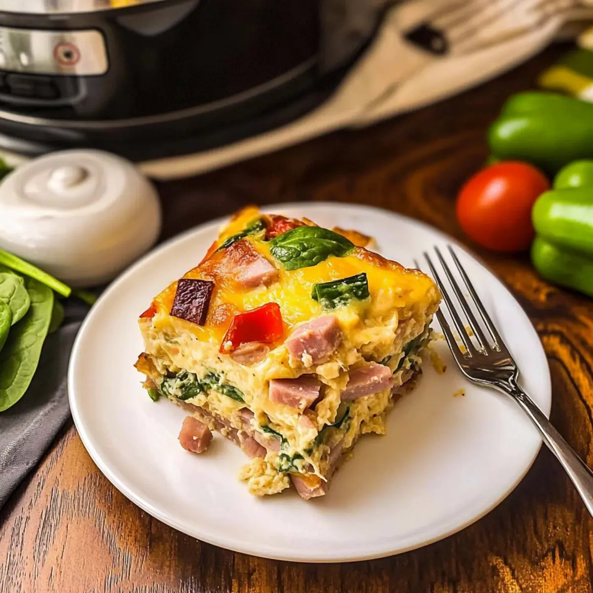 Jump to Recipe Print RecipeAs I stood in my kitchen the other night, the aroma of sautéed ham and fresh veggies filled the air, instantly transporting me to cherished holiday brunches with loved ones. That’s when I knew I had to share my go-to recipe for a Slow Cooker Overnight Breakfast Casserole. This dish not only brings comforting warmth to your mornings but also makes meal prep a breeze, allowing you to savor every precious moment spent with family. With its savory layers of flavors and a delightful interplay of textures—from creamy cheese to crispy hash browns—this make-ahead breakfast is an absolute crowd-pleaser. Plus, it’s easily customizable with your favorite proteins or veggies, ensuring that everyone at the table finds something they love. So, are you ready to elevate your breakfast game and create delicious memories? Let’s dive in! Why is This Casserole a Must-Try? Ease of Preparation: With just a few minutes of prep time the night before, you can set it and forget it, making breakfast a breeze on busy mornings. Flavor Explosion: The combination of savory ham, melty Gouda, and fresh vegetables creates a symphony of flavors that will delight your taste buds. Perfect for Any Occasion: Whether it’s a holiday brunch or a casual family breakfast, this casserole suits any gathering. Pair it with a light breakfast charcuterie board for a complete meal! Versatile Options: Easily swap ingredients to cater to your family’s likes—use chicken or load up on your favorite veggies. Crowd-Pleasing Appeal: It’s a guaranteed hit with family and friends, perfect for gatherings where everyone will be asking for seconds! Slow Cooker Overnight Breakfast Casserole Ingredients For the Casserole • Ham – Adds savory flavor and protein; substitute cooked bacon, chicken, or omit for a vegetarian twist. • Bell Pepper – Introduces color and crunch; can be replaced with onions or other available vegetables. • Spinach – Provides nutrition and vibrant color; kale or Swiss chard are great alternatives. • Cherry Tomatoes – Adds sweetness and acidity; substitute with diced standard tomatoes or omit if unavailable. • Gouda Cheese – Delivers rich, melty texture; cheddar, mozzarella, or Monterey Jack can work well. • Hash Browns – Offers a hearty base; fresh potatoes are fine too, just be sure to parboil them first. • Butter – Enhances richness and moisture; olive oil makes a great dairy-free alternative. • Cayenne Pepper – Imparts a hint of spice; omit for a milder flavor or replace with smoked paprika. • Eggs – Serves as the primary binding agent, packed with protein; vegan egg alternatives can be used if needed. • Heavy Cream – Enriches the dish for creaminess; replace with half-and-half or a dairy-free cream option. • Garlic Powder – Provides savory depth; fresh minced garlic is equally delightful. • Salt and Black Pepper – Essential for seasoning; adjust to taste for your preferred flavor. • Sour Cream – Adds creaminess; Greek yogurt is a healthier substitute if desired. • Dijon Mustard – Introduces a tangy note; feel free to use any mustard variety or omit if not wanted. Optional Toppings • Chopped Avocados – Adds a creamy texture; these should be sliced fresh before serving to avoid browning. • Chives – Impart a mild onion flavor; sprinkle them on just before serving for the best taste. • Fresh Herbs – Elevate freshness; experiment with parsley or cilantro to enhance flavor. • Sriracha – For those who like a spicy kick; drizzle over each serving for added heat. This Slow Cooker Overnight Breakfast Casserole is truly a delightful way to elevate your breakfast gatherings! Step‑by‑Step Instructions for Slow Cooker Overnight Breakfast Casserole Step 1: Prep Ingredients Begin by prepping your ingredients for the Slow Cooker Overnight Breakfast Casserole. Chop the leftover ham, bell pepper, spinach, and cherry tomatoes into bite-sized pieces. Shred the Gouda cheese to ensure it melts beautifully during cooking. Having all your ingredients ready will streamline the layering process. Step 2: Mix Hash Browns In a large bowl, combine the thawed hash browns with melted butter and half of the cayenne pepper. Stir until all the hash browns are evenly coated. This will serve as a hearty base for your casserole. Set this mixture aside while you prepare the egg filling. Step 3: Combine Egg Mixture In a separate bowl, whisk together the eggs, heavy cream, garlic powder, salt, black pepper, sour cream, and Dijon mustard. Ensure the mixture is smooth and well combined, which will help bind all the flavors in your casserole. This creamy mixture will be poured over your layers of goodness in the slow cooker. Step 4: Layer in Slow Cooker Spray the inside of your slow cooker with non-stick spray to prevent sticking. Begin layering by placing one-third of the hash browns at the bottom. Next, add half of the chopped ham, followed by half of the bell peppers, half of the spinach, and half of the shredded Gouda. Repeat these layers one more time for a deliciously built casserole. Step 5: Add Eggs Once all your layers are set, pour the prepared egg mixture evenly over the whole casserole. It should seep down into the layers, coating everything for that perfect creamy texture. Give it a gentle press with a spatula if needed, to ensure all ingredients are well incorporated. Step 6: Cook Cover the slow cooker and set it to cook on low for 6 hours, or on high for 2.5 hours. When done, the casserole should be set, with the eggs fully cooked and the cheese melted nicely. The sides may have a slight golden hue, indicating a perfect bake. Step 7: Add Cheese and Serve In the final moments of cooking, sprinkle any remaining Gouda cheese on top of the casserole. Cover again for 10-15 minutes to let the cheese melt completely. Once ready, serve warm, garnished with fresh chopped avocados and herbs to elevate your Slow Cooker Overnight Breakfast Casser
