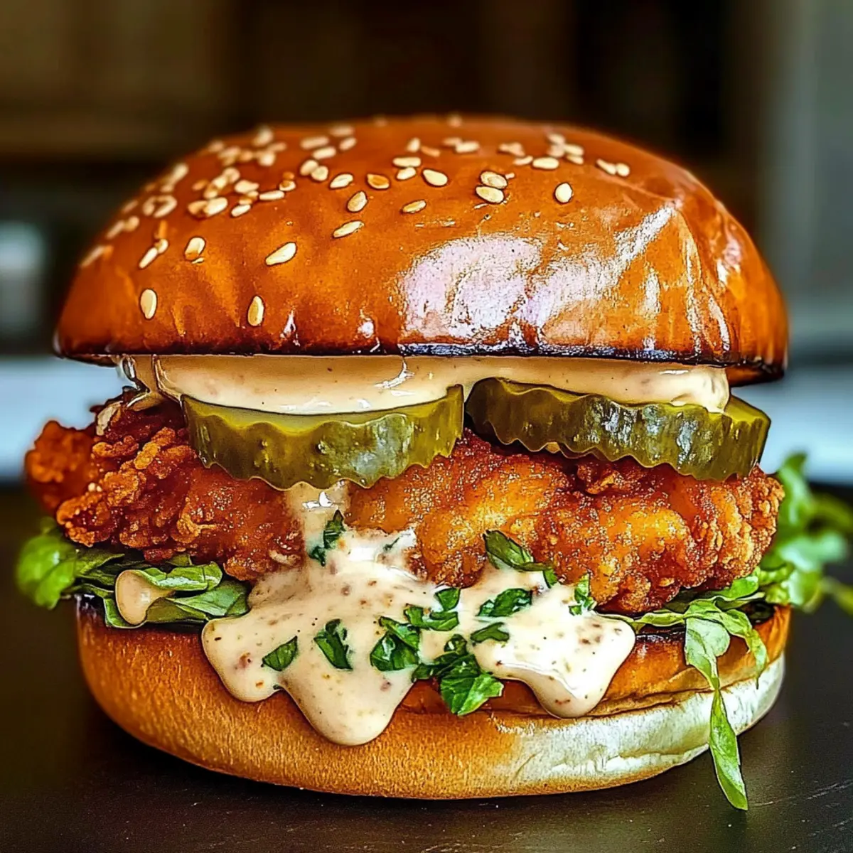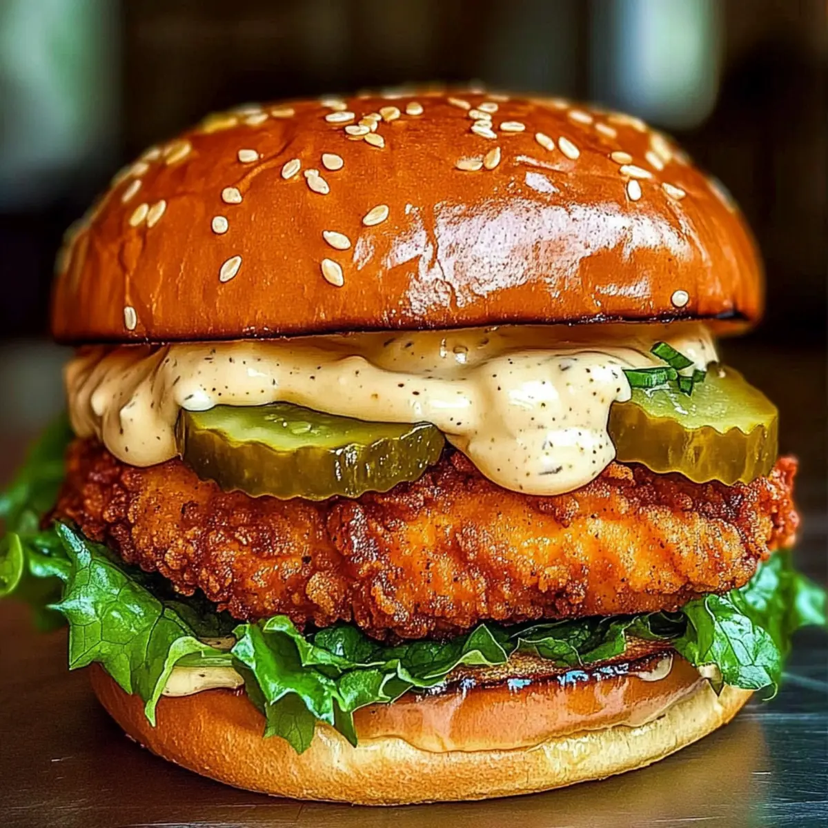 Jump to Recipe Print RecipeThe sizzle of chicken frying in hot oil can instantly elevate your mood, transporting you to a bustling kitchen full of savory aromas. Today, I’m excited to share my Spicy Chicken Sandwich with Creamy Homemade Sauce—a dish that combines vibrant flavors and comfort in every bite. This recipe not only features crispy, spicy chicken fillets nestled within a soft, buttery brioche bun, but it also boasts a creamy sauce that harmonizes the heat beautifully. It’s an ideal meal for hectic weeknights or lazy weekends, bringing joy to your table without the hassle of fast food. Plus, with its family-friendly appeal, it’s sure to become a household favorite! Ready to impress your loved ones with this delicious creation? Stay with me as we dive into the details! Why Make This Spicy Chicken Sandwich? Crispy, Golden Perfection: Each chicken fillet is fried to a golden-brown, creating a satisfying crunch that contrasts beautifully with the soft brioche bun. Flavor Explosion: With a perfect balance of spicy, savory, and creamy notes, this sandwich is sure to tantalize your taste buds and leave you craving more. Quick & Easy: You’ll whip up this meal within 30 minutes, making it a perfect choice for busy evenings or last-minute gatherings! Family Favorite: Its mouthwatering appeal guarantees that everyone at your table will be satisfied—pair it with a fresh salad or Cheesy Chicken Enchiladas for a complete feast! Customizable: Mix things up with endless flavor variations—add jalapeños or switch to a lighter bun! This adaptability makes every sandwich a new adventure, perfect for those who love experimenting in the kitchen. Spicy Chicken Sandwich Ingredients • Get ready to whip up a delicious Spicy Chicken Sandwich! For the Chicken Boneless Skinless Chicken Breasts/Thighs – Choose thighs for juiciness or breasts for a leaner option. Buttermilk – A tenderizing marinade that keeps the chicken moist; substitute with yogurt mixed with water if needed. Paprika – Adds warmth and color; opt for smoked paprika for a richer flavor. Cayenne Pepper – Provides that spicy kick; adjust to your desired heat level! Garlic Powder – Elevates the flavor; fresh garlic can be used if preferred. Onion Powder – Adds depth; you can swap it for fresh onion if desired. For the Coating All-Purpose Flour – Creates a crispy crust for the fried chicken. Cornstarch – Adds extra crunch; you can double the flour if cornstarch is unavailable. Vegetable Oil – Essential for frying; choose high smoke point oils like canola or peanut oil. For the Creamy Sauce Mayonnaise – Acts as the base for your creamy sauce; use Greek yogurt for a healthier twist. Sour Cream – Adds a delightful tang to the sauce; low-fat versions work just as well. Hot Sauce – A must for an extra layer of heat; adjust to your spice preference. Lemon Juice – Brightens the sauce’s flavor; feel free to substitute with lime juice. Smoked Paprika – Incorporate this for an additional flavor twist in the sauce. Honey (optional) – Sprinkle in some sweetness to balance the heat; adjust quantities to taste. For Assembly Brioche Buns – Soft and buttery, perfect for enhancing the sandwich’s richness; hamburger rolls are fine too. Dill Pickles – Bring crunch and tang to your sandwich; optional for those preferring milder flavors. Lettuce – Adds freshness; you can swap with spinach or arugula for variety. Tomato (optional) – Adds juiciness; skip it or replace with avocado slices for a different texture. Feel free to gather these ingredients and prepare to embark on a culinary adventure with this delightful Spicy Chicken Sandwich! Step‑by‑Step Instructions for Spicy Chicken Sandwich Step 1: Prepare the Chicken Begin by pounding the boneless skinless chicken breasts or thighs to an even thickness of about ½ inch. In a large bowl, marinate the chicken in buttermilk, hot sauce, salt, paprika, cayenne pepper, garlic powder, and onion powder for at least 1 hour, or up to overnight in the refrigerator to enhance flavor and tenderness. Step 2: Prepare the Dredge In a shallow dish, whisk together all-purpose flour, cornstarch, and any remaining spices from your marinade, ensuring an even mix for the crispy coating. This mixture will give your Spicy Chicken Sandwich its signature crunch. Set this aside while the chicken continues to marinate, allowing the spices to blend further. Step 3: Heat the Oil In a large skillet or Dutch oven, heat vegetable oil over medium-high heat until it reaches 350°F (175°C). It’s essential to ensure the oil is hot enough before frying, which will help achieve that golden-brown crust on your spicy chicken. To check, you can drop a small amount of the dredge into the oil; it should sizzle immediately. Step 4: Dredge the Chicken Remove the marinated chicken from the buttermilk mixture, allowing excess marinade to drip off. Dredge each piece in the flour mixture, pressing firmly to ensure the coating adheres well. For an extra crispy texture in your Spicy Chicken Sandwich, consider double dredging by repeating the process once more before frying. Step 5: Fry the Chicken Carefully place the dredged chicken pieces into the hot oil, frying them in batches to avoid overcrowding. Fry each piece for 4-6 minutes per side or until the chicken is golden brown and the internal temperature reaches 165°F (74°C). Once cooked, remove the chicken and let it drain on a wire rack to maintain its crispy texture. Step 6: Make the Creamy Sauce In a separate bowl, prepare your creamy sauce by whisking together mayonnaise, sour cream, hot sauce, lemon juice, smoked paprika, garlic powder, and honey if using. Taste and adjust the seasoning as needed to achieve the perfect balance of creaminess and tanginess that will elevate your Spicy Chicken Sandwich. Step 7: Toast the Buns While the chicken is cooling, lightly toast the brioche buns in a skillet or oven until golden and warm. This step adds a d