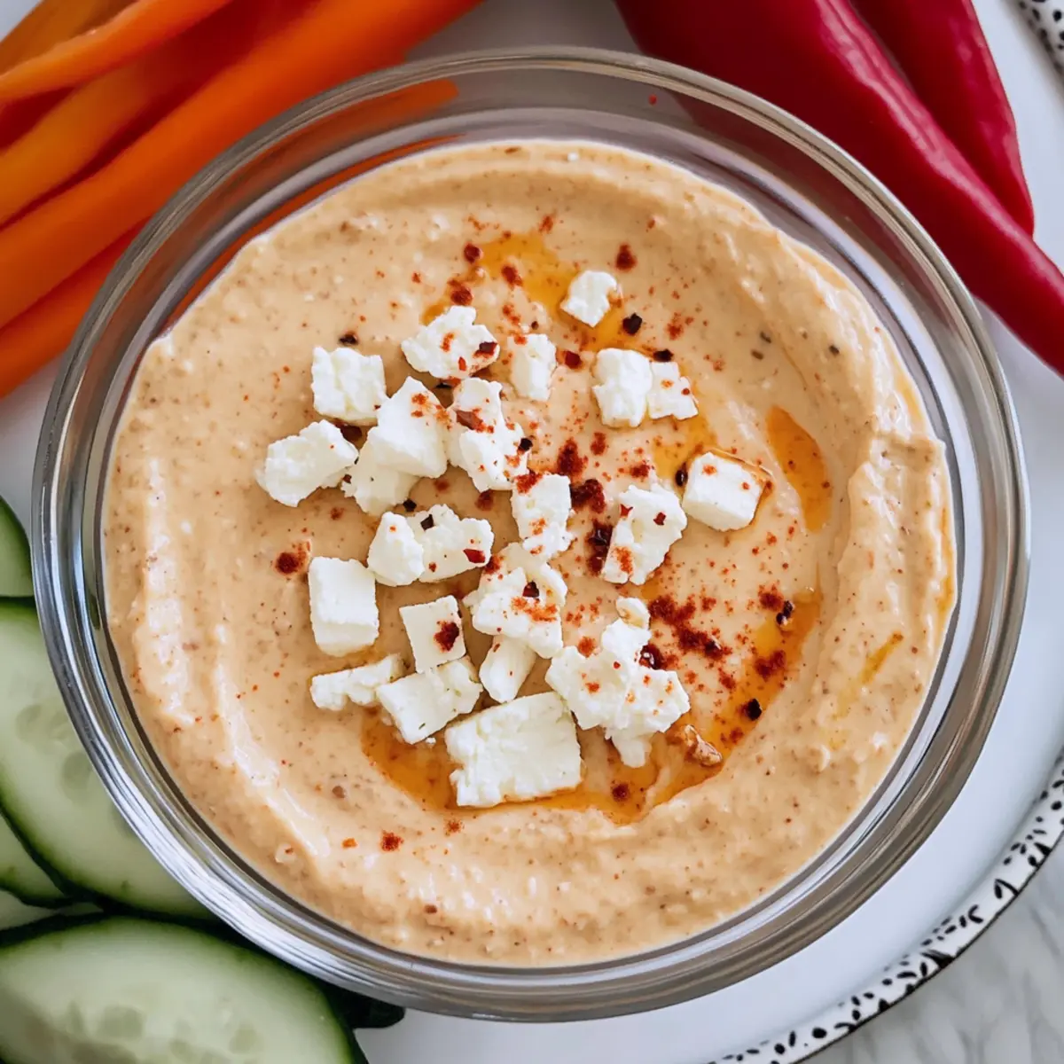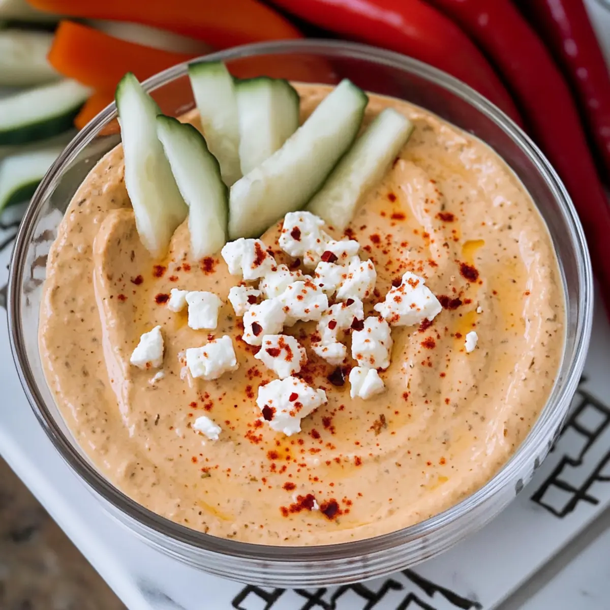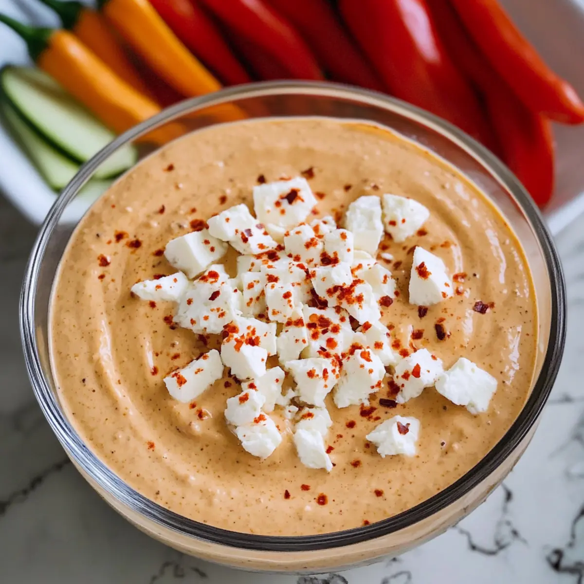 Jump to Recipe Print RecipeAs the vibrant colors of summer dance in the air, I find myself craving something fresh and exciting to share with friends. Enter the Spicy Feta Dip, a creamy gem known as tirokafteri that’s come to steal the show at my gatherings. With just five simple ingredients, this quick and easy appetizer comes together in a matter of minutes, making it a true lifesaver for those busy days. The delightful combination of roasted red peppers and luscious feta blended with Greek yogurt strikes the perfect balance of tangy and savory, ensuring you’ll never reach for store-bought again. Plus, it’s gluten-free and vegetarian, welcoming everyone to the feast! Whether you’re looking for a fun addition to a party platter or a flavorful dip for movie night, this recipe has you covered. What’s your favorite way to enjoy feta? Let’s dive into this delicious journey together! Why is Spicy Feta Dip a Must-Try? Unforgettable Flavor: This dip brings together the rich creaminess of feta with the smokiness of roasted red peppers, creating a flavor profile that is hard to resist. Quick & Easy: Ready in just 10 minutes with five simple ingredients, this recipe is perfect for busy weeknights or surprise guests. Versatile Treat: Serve it with fresh vegetables, pita chips, or slather it on gyros — it complements a variety of dishes! Gluten-Free Goodness: This dip allows everyone to join in on the fun, making it a crowd-pleaser for your next gathering. For more delightful Greek-inspired dishes, try the invigorating flavors of Honeycrisp Apple Feta or enjoy a savory twist with Feta Cranberry Rigatoni. Spicy Feta Dip Ingredients For the Dip • Roasted Red Peppers – Adds a mild spice and sweetness; look for jarred or homemade for the best flavor. • Feta Cheese – Provides a salty, creamy foundation; choosing block feta over crumbled ensures a smoother blend. • Plain Greek Yogurt – Contributes creaminess and tang; whole milk yogurt is ideal for a richer taste. • Granulated Sugar – Balances the flavors; it enhances the sweetness from the roasted peppers and can be omitted if desired. • Extra Virgin Olive Oil – Enriches the dip and helps achieve a smooth texture; opt for high-quality olive oil for the best results. • Red Pepper Flakes (optional) – Adds extra heat if preferred; adjust according to your spice tolerance. Be prepared to impress your guests with this Spicy Feta Dip that is not only gluten-free and vegetarian but also a delightful addition to any appetizer spread! Step‑by‑Step Instructions for Spicy Feta Dip Step 1: Prepare the Ingredients Start by gathering your ingredients for the Spicy Feta Dip. Dice the roasted red peppers into large chunks, and cut the feta cheese into sizable pieces to ensure they blend smoothly. Measure out the plain Greek yogurt and have the granulated sugar and extra virgin olive oil ready. This ensures you have everything at your fingertips for a seamless prep. Step 2: Blend the Base In a food processor, combine the diced roasted red peppers, feta cheese chunks, Greek yogurt, and sugar. Pulse the mixture for about 10-15 seconds until the ingredients begin to come together, forming a thick, coarse blend. You want to achieve a cohesive texture that incorporates all the flavors without making it completely smooth just yet. Step 3: Achieve Creaminess With the food processor running, slowly drizzle in the extra virgin olive oil over the mixture. This process should take about 30 seconds as you watch the dip transform into a creamy and luscious consistency. Continue blending until you achieve that smooth, inviting texture reminiscent of a thick hummus, which is key for the Spicy Feta Dip. Step 4: Adjust the Heat If you like an extra kick, now is the time to stir in some red pepper flakes. Use a spatula to fold them into the dip until evenly distributed, keeping in mind your spice tolerance. This flavorful addition will elevate your Spicy Feta Dip, making it even more irresistible for your guests. Step 5: Chill for Flavor Enhancement Transfer the creamy mixture to a serving bowl and cover it tightly. Allow your Spicy Feta Dip to chill in the refrigerator for at least one hour before serving. This chilling time is essential for allowing the flavors to meld beautifully, creating a rich and delectable dip that’s perfect for any occasion. Step 6: Serve and Enjoy Once chilled, take your Spicy Feta Dip out of the refrigerator and give it a quick stir. It pairs wonderfully with fresh vegetables like cucumbers and carrots, pita chips, or can be used as a generous spread in gyros. This delightful dip is sure to be a hit at your next gathering! Make Ahead Options These Spicy Feta Dip preparations are perfect for busy home cooks who love to meal prep! You can make the entire dip up to 3 days in advance, allowing the flavors to meld beautifully in the refrigerator. Simply follow the recipe instructions through Step 5, then cover the dip tightly and refrigerate. To maintain its delicious quality, give the dip a good stir and taste before serving, adjusting any seasonings as needed. When it’s time to serve, transfer the chilled Spicy Feta Dip to a bowl, and pair it with fresh vegetables or pita chips for an effortless, crowd-pleasing appetizer that’s just as delicious as when first made! How to Store and Freeze Spicy Feta Dip Fridge: Store your Spicy Feta Dip in an airtight container in the refrigerator for up to 7 days. This allows the flavors to continue to meld and create a tastier dip. Freezer: Avoid freezing this dip, as it can alter the creamy texture and flavor profile, making it less enjoyable when thawed. Reheating: If your dip thickens after refrigeration, simply stir in a splash of Greek yogurt or olive oil to restore its creaminess before serving. Meal Prep: Make this dip ahead of time for parties! Preparing it a few days in advance ensures you have a delicious appetizer on hand whenever you need it. What to Serve with Spicy F