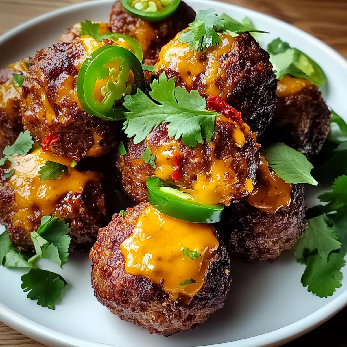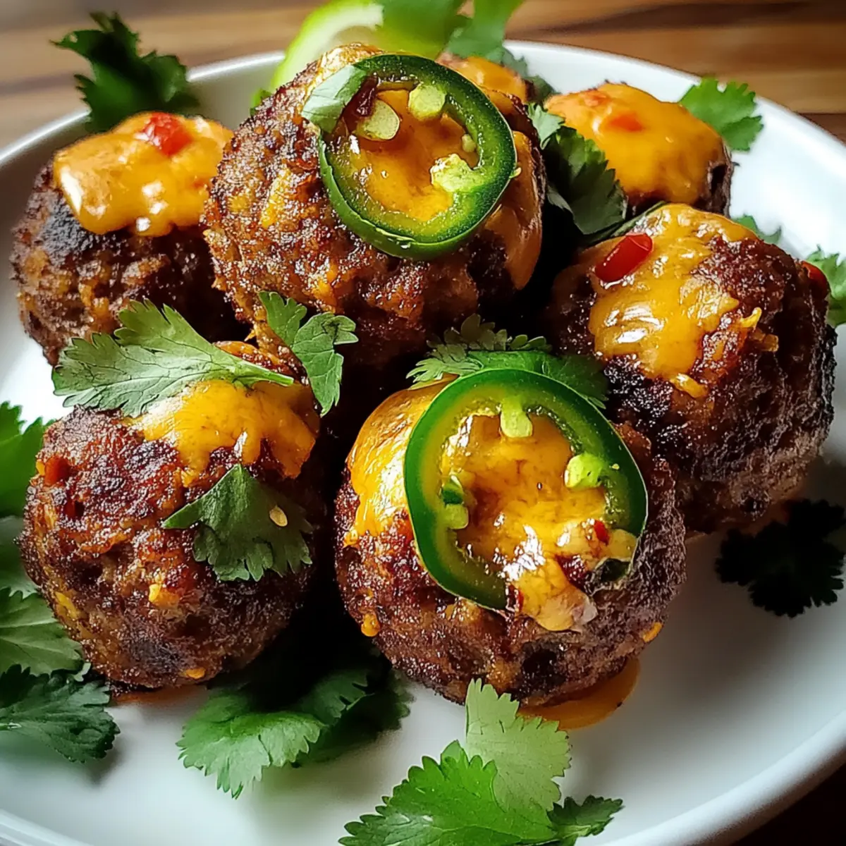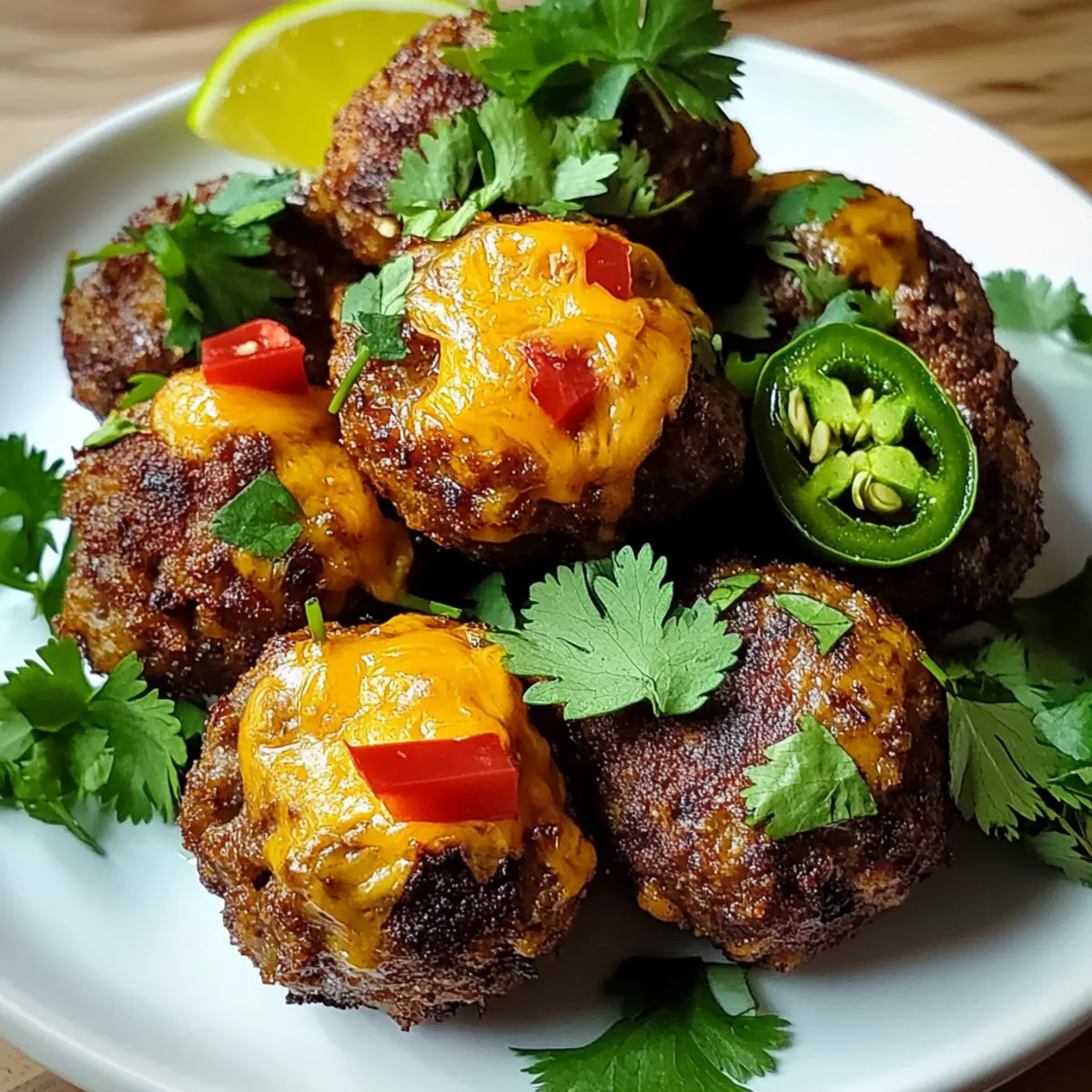 Jump to Recipe Print RecipeA tantalizing aroma wafted through my kitchen, instantly transporting me to a sun-soaked fiesta in Mexico. Today, I want to share my favorite recipe for Spicy Mexican Donkey Balls with Cheesy Center, a dish that harmonizes comfort food and bold flavors. These delightful meatballs are incredibly easy to whip up, boasting a prep time of just 20 minutes, making them a perfect choice for those hectic weeknights or casual get-togethers. Not only are they a surefire crowd-pleaser, but they also offer the versatility to be gluten-free if you skip the tortillas. Each bite provides a juicy, spiced kick complemented by a gooey cheese center that makes a lasting impression. Ready to turn up the heat in your kitchen? Let’s dive in! Why Are Spicy Mexican Donkey Balls Amazing? Bold Flavors: These meatballs deliver a delightful punch of spice and zest, bringing a burst of authentic Mexican flair to your table. Cheesy Center: The gooey cheddar surprise at the heart of each meatball elevates your dining experience, making every bite a comforting treasure. Quick & Easy: With a prep time of just 20 minutes, this dish fits perfectly into your busy schedule without sacrificing flavor. Perfect for Parties: Whether it’s game night, a casual gathering, or taco Tuesday, these meaty bites are sure to impress your guests and keep them coming back for more. Versatile Options: Feel free to swap out the ground beef to make it leaner or adjust the spice levels to suit your taste. For a refreshing twist on dinner, pair them with sides like Coconut Bliss Balls or serve them alongside a vibrant salad. Spicy Mexican Donkey Balls Ingredients For the Meatballs • Ground Beef – Provides the main protein base, ensure a mix with some fat for moisture and flavor. • Chopped Onion – Adds sweetness and depth; substitute with shallots for a milder flavor. • Chopped Fresh Cilantro – Intensifies freshness; or omit it for a more straightforward flavor profile. • Jalapeño Pepper – Brings heat; deseed it for milder spice, or swap with a bell pepper for no heat. • Minced Garlic – Essential for enhancing overall flavor in savory dishes. • Ground Cumin – Offers warm, earthy flavors, a staple in Mexican cuisine. • Chili Powder – Adds heat and depth; adjust according to your spice preference. • Smoked Paprika – Introduces a subtle smoky touch; regular paprika can be used in a pinch. • Salt and Pepper to Taste – Essential for balancing flavors. For the Cheesy Center • Shredded Cheddar Cheese – Melts beautifully for that gooey center; Monterey Jack makes a great substitute. For Coating and Binding • Crushed Tortilla Chips – Provides texture and crunch; breadcrumbs can also be used for a different consistency. • Beaten Egg – Acts as a binder to hold the meatballs together. For Cooking • Olive Oil – Ideal for searing; vegetable oil is a suitable alternative. • Mexican-Style Tomatoes with Green Chilis – Adds moisture and flavor; can substitute with plain diced tomatoes plus chili powder for a similar effect. For Serving • Fresh Lime Wedges – Enhance flavor; completely optional but highly recommended for brightness. Each ingredient plays a crucial role in creating these delightful Spicy Mexican Donkey Balls. Whether you want to adjust for dietary preferences or simply try something new, this recipe is full of opportunities to make it your own! Step‑by‑Step Instructions for Spicy Mexican Donkey Balls Step 1: Preheat the Oven Begin by preheating your oven to 375°F (190°C). This ensures that as soon as your Spicy Mexican Donkey Balls are ready, they will cook through perfectly. Make sure your oven racks are in the middle position for even heat distribution, setting the stage for deliciously baked meatballs. Step 2: Combine the Ingredients In a large mixing bowl, combine the ground beef, chopped onion, fresh cilantro, finely chopped jalapeño, minced garlic, cumin, chili powder, smoked paprika, salt, and pepper. Mix gently until all ingredients are uniformly distributed, being careful not to overmix, as this can make the meatballs tough. Step 3: Add Cheese and Crunch Next, fold in the shredded cheddar cheese and crushed tortilla chips into the meat mixture. The cheese will add a gooey center to the Spicy Mexican Donkey Balls, while the crushed tortilla chips provide delightful texture. Make sure everything is well incorporated without excessive kneading. Step 4: Bind with Egg Add the beaten egg to the mixture and stir until fully combined. This egg serves as a binder that will help your meatballs hold their shape during cooking. The consistency should be slightly sticky but solid enough to form; if it feels too loose, add a few more crushed tortilla chips. Step 5: Shape the Meatballs Using your hands, form the mixture into golf-ball-sized meatballs, about 1 to 2 inches in diameter. Aim for uniform sizes so they cook evenly. Place them on a plate or parchment-lined tray as you shape them, ensuring they are compact to keep the cheesy center intact. Step 6: Sear the Meatballs Heat olive oil in an ovenproof skillet over medium heat. Once hot, carefully add the meatballs, leaving space between each to prevent sticking. Sear the meatballs for about 5 minutes, or until they’re beautifully browned on the outside, which adds a rich flavor layer. Step 7: Add the Tomatoes Pour the Mexican-style tomatoes with green chilis over the seared meatballs in the skillet. The tomatoes will cook down, adding moisture and flavor, elevating your Spicy Mexican Donkey Balls to perfection. Make sure the meatballs are somewhat submerged in the sauce for even cooking. Step 8: Bake for Perfection Transfer the skillet to your preheated oven and bake for 15-20 minutes. Use an instant-read thermometer to check that the internal temperature of the meatballs reaches 160°F (71°C). They should have a lovely golden brown exterior when done, ensuring they are juicy inside. Step 9: Serve and