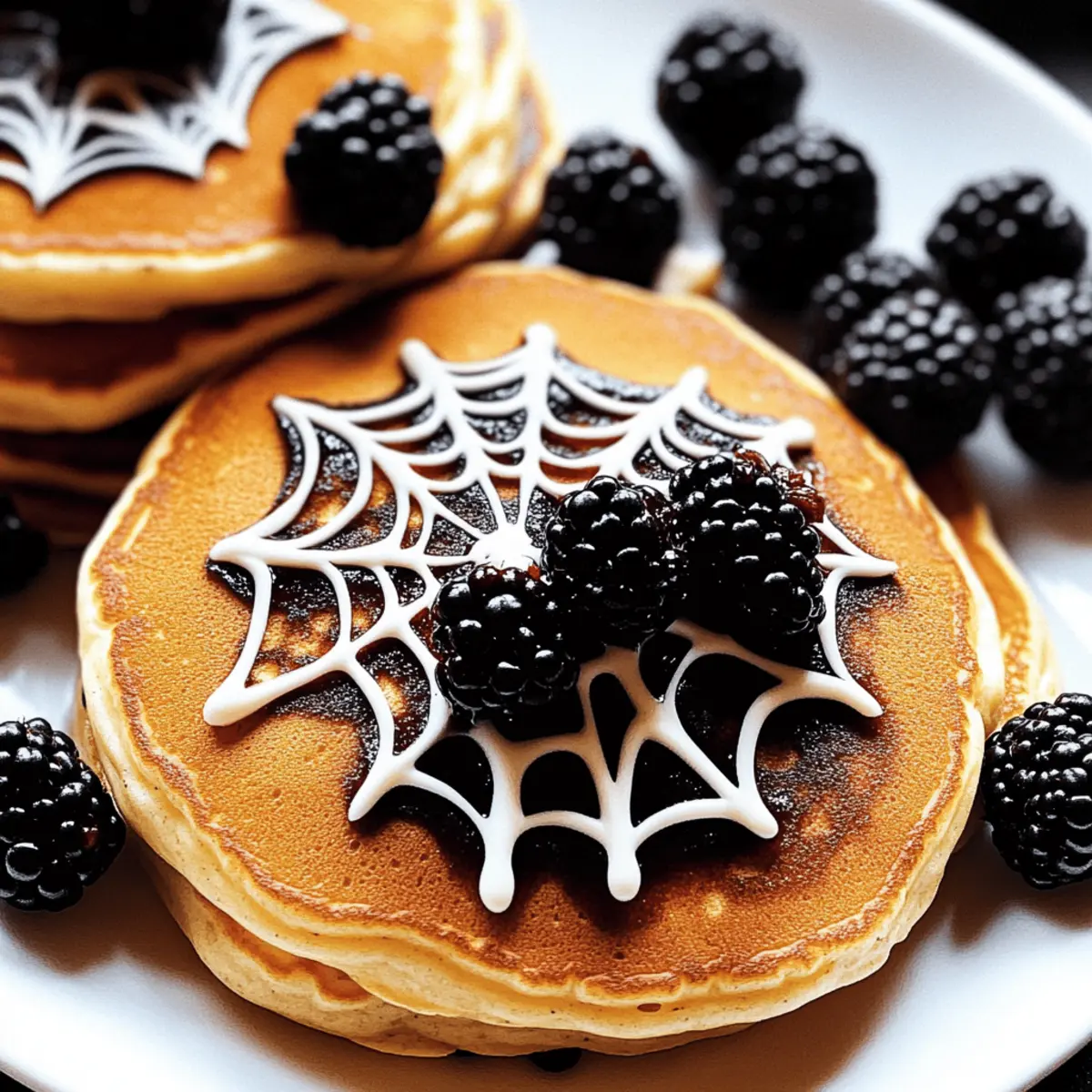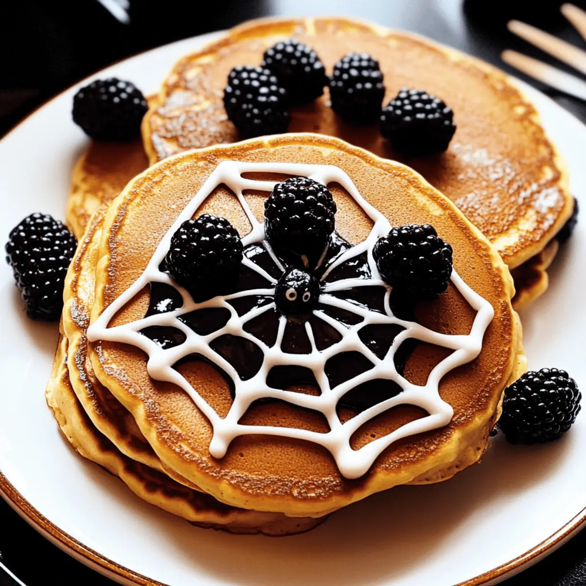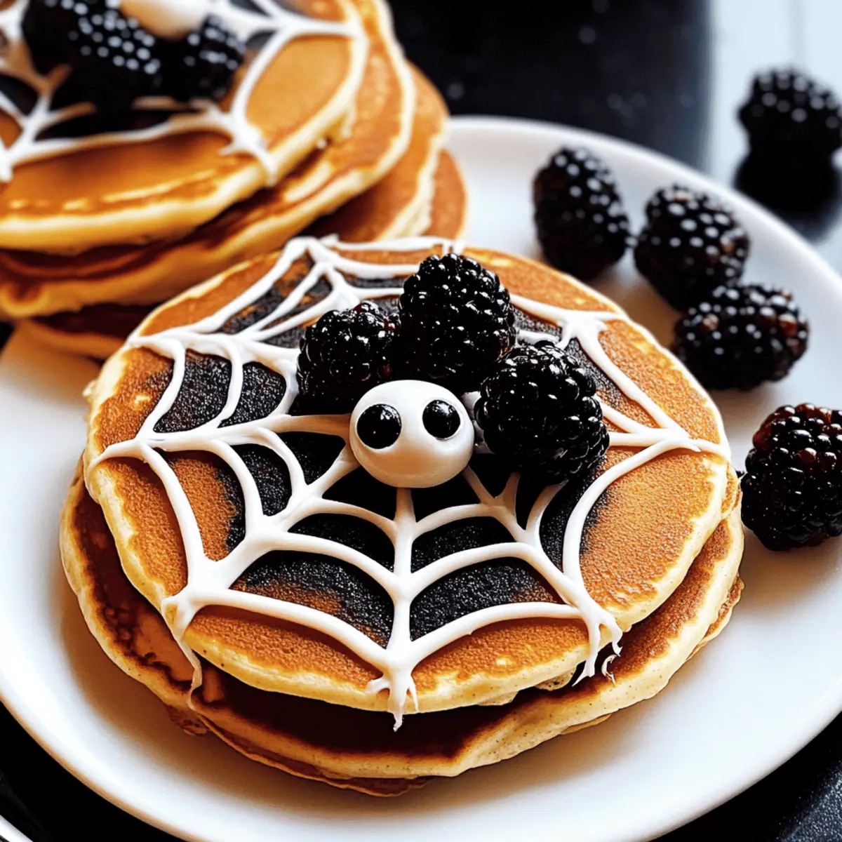 Jump to Recipe Print RecipeThe first whiff of autumn is in the air, and with it comes a delightful tradition that kids eagerly await—Halloween! I love the excitement that fills the kitchen as I whip up these Easy Spider Pancakes, transforming a simple breakfast into a festive feast that sparks joy and creativity. These fluffy stacks are not too sweet, allowing the playful decorations to shine through, making them perfect for little hands eager to lend a hand. Not only are these spider pancakes a hit with kids, they’re also a breeze to prepare—ideal for busy mornings. So, gather your ingredients and let’s create some frightfully fun Halloween magic together! Who’s ready to join in on the decorating fun? Why Are Spider Pancakes a Halloween Must? Fun and Festive: These pancakes turn an ordinary breakfast into an exciting Halloween adventure that kids will love! Creative Decoration: With simple icing and fresh berries, you can let your imagination soar while decorating, making each plate unique. Quick and Easy: Perfect for busy mornings, this recipe is straightforward and quick, ensuring you can still enjoy a festive meal without spending hours in the kitchen. Crowd-Pleasing Delight: With their adorable look and yummy taste, these pancake spiders will surely impress little ones and adults alike. Engaging Activity: Involving kids in the decorating process not only makes mealtime fun but also creates cherished memories. So, get the family together for this delightful culinary experience and make Halloween morning unforgettable! Spider Pancakes Ingredients • Get ready for some Halloween fun! For the Pancakes Pancakes – Make your base with homemade batter, a boxed mix, or even frozen pancakes for a quick start! For the Decoration White Icing – This sweet topping is essential for creating your spiderweb design; substitute with melted white chocolate if desired. Blackberries – These juicy treats double as the spider’s body; they can be swapped with raspberries or blueberries for a colorful twist. Candy Googly Eyes – These optional decorations add a fun touch to your spooky theme; they are sure to bring smiles to little faces! Let’s get cooking and bring these Spider Pancakes to life for a magical Halloween breakfast! Step‑by‑Step Instructions for Spider Pancakes Step 1: Prepare the Pancakes Start by cooking your pancakes to golden perfection! If using homemade batter, preheat a non-stick skillet or griddle over medium heat (around 350°F or 175°C). Pour 1/4 cup of batter for each pancake, cooking for about 2-3 minutes until bubbles form and the edges look set. Flip and cook an additional 2 minutes until both sides are golden brown. Stack the pancakes on a serving plate as you go. Step 2: Make the Icing While the pancakes cool slightly, whisk together the icing by mixing powdered sugar with a few teaspoons of water in a bowl. Aim for a thin, drizzling consistency, adding a splash of vanilla for extra flavor. If the icing is too thick, add a bit more water, as you want it loose enough to pipe out nicely to create the spiderweb design on your spider pancakes. Step 3: Fill the Piping Bag Once the icing is ready, transfer it to a zippered sandwich bag. Seal the bag tightly and snip off a small corner (about 1/4 inch). Hold the bag over your pancake stack, gently squeezing to pipe out the icing. This will allow you to create the spiderweb design that makes these pancakes so festive and fun, just like true spider pancakes! Step 4: Create the Spiderweb Design Now, it’s time to decorate! Starting from the center of the pancake stack, pipe out the icing in a spiral pattern, gradually working your way outward to form a web. Use quick, light-handed movements to create swirls that mimic a spiderweb. Aim for a delicate touch, allowing the icing to cascade around the pancakes, enhancing your spooky design. Step 5: Add Blackberries as Spiders Next, place three blackberries on the outer edges of the pancake stack to represent spiders. You can position them however you like; creativity is key! For an extra touch, you can gently dab a small amount of icing on each blackberry and attach candy googly eyes, bringing a whimsical character to your spider pancakes. Step 6: Serve and Enjoy Your Halloween masterpiece is now complete! Serve your spider pancakes while they’re still warm, allowing the kids to marvel at this fun breakfast. Consider adding a side of fresh fruit or yogurt for a well-rounded meal. Let this delightful creation bring smiles and laughter to your Halloween morning as everyone digs in! What to Serve with Easy Spider Pancakes? Start your Halloween celebration right with side dishes that complement the delightful sweetness and spooky charm of these pancake creations! Fresh Fruit Salad: A mix of seasonal fruits like oranges and grapes adds vibrant color and a refreshing taste, balancing the sweetness of the pancakes. Greek Yogurt: Creamy and tangy yogurt provides a healthy contrast, plus it’s a perfect base for drizzling extra icing or honey for those who want more sweetness. Warm Maple Syrup: A classic syrup enhances the pancake experience and adds depth to each bite. Drizzle it over the web to create a tasty twist! Halloween-themed Smoothies: Blend fruits with a splash of orange juice for a seasonal drink that ties the spooky theme together. Consider adding spinach for a fun green twist! Cream Cheese Spread: A light, tangy cream cheese spread adds a delightful edge to your pancakes if spread on the side, creating an engaging taste experience. Chocolate Milkshake: Indulge your sweet tooth with a rich milkshake that pairs wonderfully with the softness of the spider pancakes—a treat kids will love! Homemade Pumpkin Spice Latte: Embrace the autumn flavors with this cozy drink that adds a warm, spiced note to your breakfast table and enhances the festive mood. Spider Pancakes Variations & Substitutions Feel free to spin these spider pancakes into something uniquely yours