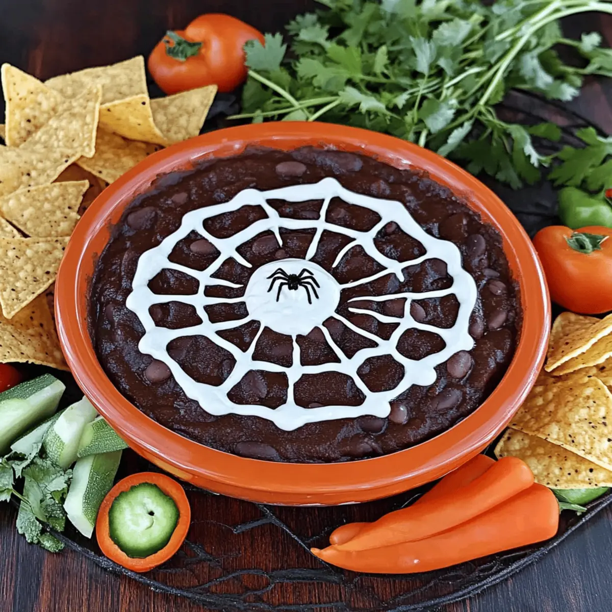 Pair your Spider Web Black Bean Dip with a variety of dippables such as tortilla chips, sliced veggies, or colorful bell pepper strips. Arrange them on a platter for a festive presentation. This dish not only delights the eyes with its design but also satisfies the taste buds with its rich flavors, making it a memorable addition to your Halloween gathering.
