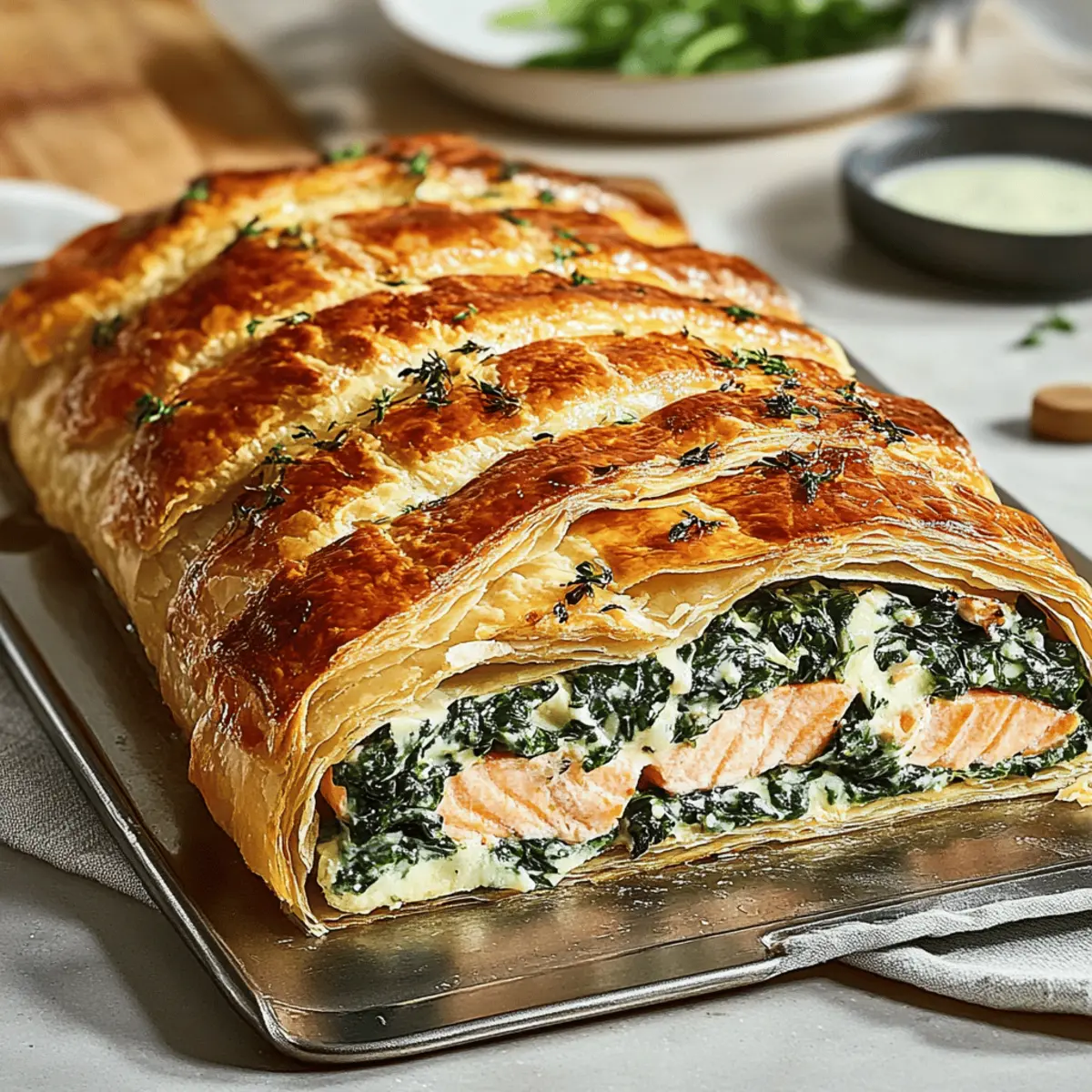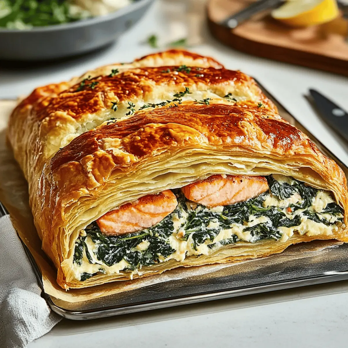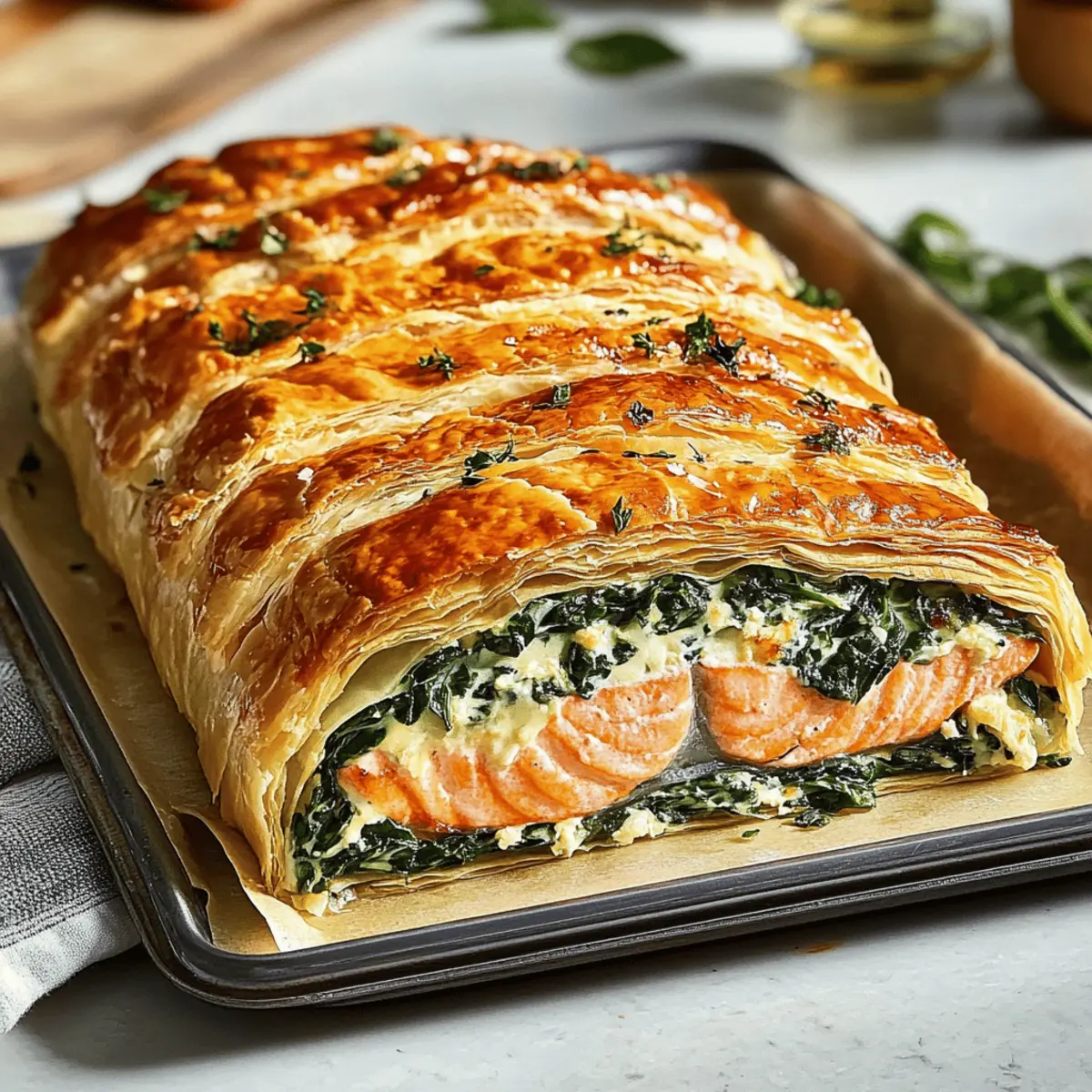 Jump to Recipe Print RecipeAs the oven hums and fills the kitchen with warmth, I can hardly contain my excitement for this Spinach and Cheese Stuffed Salmon Wellington. This dish is not just a feast for the eyes, but a celebration of simple yet vibrant flavors. With its flaky puff pastry wrapping moist, succulent salmon and a creamy spinach filling, you’ll have a show-stopping centerpiece for your dinner table. Best of all, it’s surprisingly quick to prepare, making it perfect for weeknight dinners or special occasions alike. Plus, it’s customizable to suit various dietary preferences—whether you’re a seafood lover or want to experiment with chicken or veggies. Ready to impress your taste buds and elevate your cooking game? Let’s dive into this delightful recipe together! Why is this Wellington so irresistible? Deliciously Nutritious: Packed with omega-3 fatty acids from salmon and vitamins from spinach, this dish fuels your body while satisfying your taste buds. Effortlessly Elegant: The flaky puff pastry gives a stunning presentation while wrapping the flavorful filling, making it an eye-catching centerpiece for any gathering. A Versatile Canvas: Customize the recipe with different proteins or cheeses, or create a veggie version that allows for endless flavor combinations to delight every guest. Time-Friendly Preparation: With a cooking time of just 30 minutes, this dish is perfect for busy weeknights or when you want to impress without hours in the kitchen. Crowd-Pleasing Appeal: Everyone at the table, from seafood lovers to picky eaters, will rave about this dish, making it a must-try at your next dinner party or family meal. For a refreshing side, consider pairing it with a vibrant Strawberry Spinach Salad to balance the richness of the Wellington! Spinach Cheese Stuffed Salmon Wellington Ingredients For the Salmon Filling Salmon – A rich source of omega-3 fatty acids; feel free to substitute with cod or halibut. Spinach – Fresh or frozen; this leafy green adds essential vitamins and a pop of color. Cheese – Use mascarpone, cream cheese, or any soft cheese you love; different cheeses can create unique flavors. For the Puff Pastry Puff Pastry – Opt for store-bought for convenience; homemade is great for the adventurous cook. Egg (for wash) – Helps achieve that beautiful golden color on the pastry; an essential step for presentation. Optional Flavor Enhancers Fresh Herbs – Basil or thyme can elevate the flavor profile; feel free to experiment! Step‑by‑Step Instructions for Spinach Cheese Stuffed Salmon Wellington Step 1: Preheat the Oven Begin your culinary adventure by preheating your oven to 400°F (200°C). This ensures a perfectly crisp and flaky pastry as you prepare your Spinach Cheese Stuffed Salmon Wellington. While the oven heats up, gather your ingredients and equipment, including a baking sheet lined with parchment paper for easy cleanup. Step 2: Sauté the Spinach In a medium skillet over medium heat, add a drizzle of olive oil, then toss in your fresh or thawed spinach. Sauté for about 3-5 minutes, stirring frequently until the spinach wilts and softens, reducing its volume significantly. The vibrant green color will signal that it’s done. Remove from heat and let it cool slightly before mixing in your choice of creamy cheese. Step 3: Prepare the Puff Pastry On a floured surface, roll out your puff pastry sheet to a rectangle about ¼ inch thick. Make sure it’s large enough to encase your salmon and filling comfortably. If using store-bought, it should already be rolled out; just ensure there are no tears in the pastry that might leak filling during baking. Step 4: Assemble the Wellington Place your salmon fillet in the center of the prepared puff pastry. Spoon the sautéed spinach and cheese mixture generously on top of the salmon, ensuring an even distribution to infuse flavor throughout. This layering will create a delicious contrast in the finished Spinach Cheese Stuffed Salmon Wellington. Step 5: Seal the Pastry Carefully fold the puff pastry over the filling, ensuring all edges are securely sealed to avoid leaks during baking. Trim any excess pastry if necessary, and crimp the edges with a fork for a rustic finish. Brush the entire surface with egg wash for that golden, glossy finish. Step 6: Bake the Wellington Transfer your beautifully assembled Wellington to the lined baking sheet. Bake in the preheated oven for 25-30 minutes, or until the pastry turns a lovely golden brown and becomes flaky. To check for doneness, make sure the salmon is opaque and reaches an internal temperature of 145°F (63°C). Step 7: Rest and Serve Once baked, remove the Spinach Cheese Stuffed Salmon Wellington from the oven and let it rest for about 5 minutes. This resting time allows the filling to set slightly, making it easier to slice. Serve warm with your favorite side dishes, such as a crisp salad or roasted vegetables for a complete meal. Make Ahead Options These Spinach and Cheese Stuffed Salmon Wellington are perfect for meal prep enthusiasts! You can prepare the filling—sautéing spinach and mixing it with cheese—up to 24 hours in advance. Simply store this mixture in an airtight container in the refrigerator. Moreover, you can assemble the entire Wellington, cover it tightly, and refrigerate it for up to 2 days before baking. To maintain the pastry’s crispness, avoid brushing it with the egg wash until just before baking. When you’re ready to serve, simply preheat your oven and bake the Wellington as directed, ensuring a deliciously fresh meal with minimal effort! Expert Tips for Spinach Cheese Stuffed Salmon Wellington Check Doneness: Use a food thermometer to ensure the salmon reaches 145°F (63°C); opaque center means it’s done perfectly. Avoid Soggy Pastry: Pat the spinach dry after sautéing to avoid excess moisture, which can make the puff pastry soggy. Chill Before Baking: If using homemade pastry, chill the assembled Wellingto