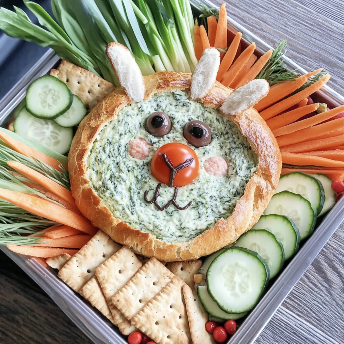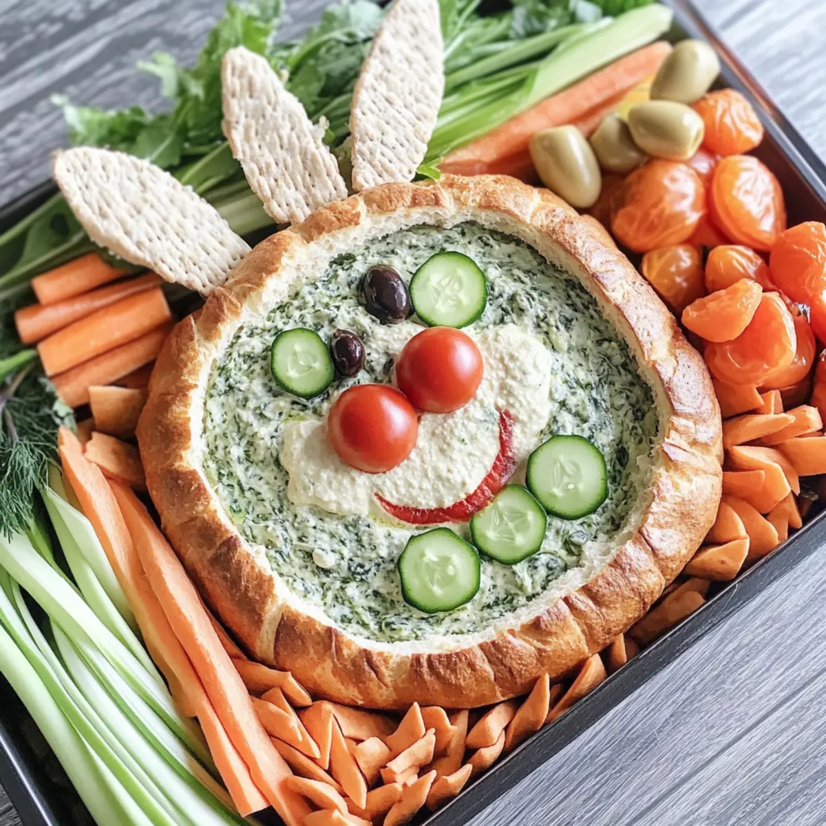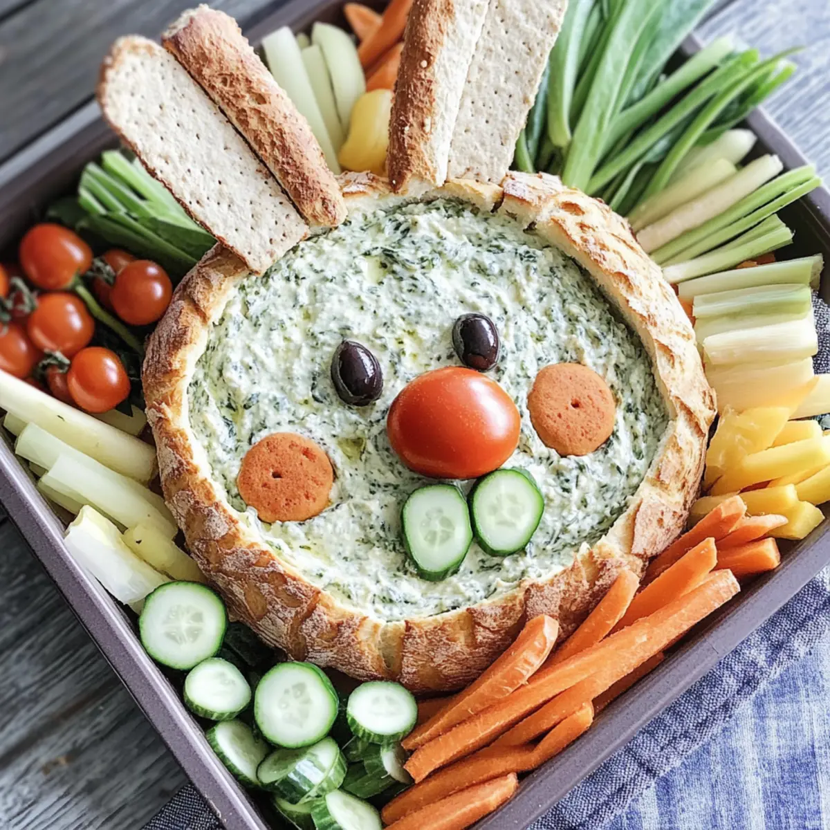 Jump to Recipe Print RecipeAs I prepared for our Easter gathering, a playful idea tickled my imagination: why not elevate our appetizer spread with a Spinach Dip Bunny Veggie Tray? This delightful dish seamlessly combines rich, creamy spinach dip with a charming bunny presentation that will bring smiles to both kids and adults. Not only is it a crowd-pleaser, but its easy preparation allows you to spend more time celebrating with loved ones—making it the perfect centerpiece for your Easter festivities. With its vibrant colors and inviting textures, this veggie tray is sure to spark joy and maybe even a little playful competition over who can create the cutest bunny face! Ready to hop into some fun? Why is this an Easter must-try? Visual Appeal: The Spinach Dip Bunny Veggie Tray is not just delicious; it’s a feast for the eyes! Its whimsical bunny shape captures attention and adds joy to your buffet. Crowd-Pleasing Flavor: Creamy, savory spinach dip served with fresh veggies and crunchable crackers means everyone can indulge in deliciousness. Effortless Preparation: With just a few simple steps, you’ll create a stunning centerpiece that takes little time to whip up. More time to enjoy with family! Versatile Options: Feel free to switch out the veggies or even substitute the bread for a different flavor profile. Create your own delightful version! Perfect for All Ages: Both kids and adults will find joy in this playful dish, making it an unforgettable addition to your Easter celebration. Whether alongside other apps like my Strawberry Spinach Salad or as a standalone star, it’s sure to be a hit! Spinach Dip Bunny Veggie Tray Ingredients For the Spinach Dip Chopped Spinach – Provides the base flavor and nutrients for the dip; make sure it’s well thawed and drained for the best texture. Knorr Dry Vegetable Mix – Enhances the taste of the dip with savory flavors; feel free to substitute with any other vegetable dip mix if needed. Mayo – Adds creaminess and helps bind the dip; light or vegan mayo can be used for a healthier twist. Sour Cream – Contributes a tangy flavor and richness; Greek yogurt offers a lighter alternative if you prefer. For the Bunny Presentation Assorted Vegetables – Adds fresh crunch and vibrancy; carrots, bell peppers, and celery are great choices for dippage. Crackers – Serve alongside the dip for that satisfying crunch; any variety will work, but consider gluten-free options if necessary. Hawaiian Bread – Creates the adorable bunny shape and acts as the cozy bread bowl for your dip; other soft breads can be used if Hawaiian isn’t available. Cucumbers (2) – Sliced for the bunny’s ears; choose firm cucumbers to maintain their crispness. Black Olives – Sliced to form the eyes and mouth, adding a savory touch to the presentation. Green Onions – Used for the bunny’s whiskers; chives make a lovely substitute if you have them on hand. Cherry Tomato – Acts as a cute bunny nose; you might enjoy a radish for a colorful twist! Feel free to gather these ingredients and hop into the fun of creating your Spinach Dip Bunny Veggie Tray! This delightful Easter appetizer will surely win hearts and appetites alike. Step‑by‑Step Instructions for Spinach Dip Bunny Veggie Tray Step 1: Prepare the Dip In a large mixing bowl, combine the chopped spinach, Knorr dry vegetable mix, mayo, and sour cream. Stir well until all ingredients are thoroughly blended, creating a smooth and creamy mixture. This step should take about 5 minutes. Once mixed, the dip should look rich and vibrant, signaling it’s ready for chilling. Step 2: Chill the Mixture Cover the mixing bowl with plastic wrap or a lid, and place it in the refrigerator for at least one hour. This chilling time allows the flavors to meld beautifully, enhancing the overall taste of your spinach dip. When ready to remove, the mixture should be slightly firmer and aromatic, providing a delicious base for your bunny veggie tray. Step 3: Create the Bunny Bowl While the dip chills, prepare your bunny-shaped bowl by taking a round Hawaiian bread roll. Carefully cut a circle from the top and hollow out the center, reserving the soft bread pieces for dipping later. The bread should have a sturdy shell, holding the dip snugly while maintaining its adorable shape. Step 4: Fill the Bread Bowl Once your spin dip is chilled and flavorful, fill the hollowed-out Hawaiian bread bowl with the creamy mixture. Use a spatula to spread it evenly, ensuring the surface is smooth for decoration. The dip should overflow just slightly at the top of the bowl, creating an inviting look for guests eager to dig in. Step 5: Arrange the Veggies and Crackers On a large serving platter, arrange the assorted vegetables and crackers in a vibrant circle around the filled bread bowl. Include a colorful mix of carrots, bell peppers, and celery to add brightness. This presentation should be playful and inviting, encouraging your guests to savor the fresh, crunchy dippers alongside the spinach dip bunny. Step 6: Decorate the Bunny Face Now for the fun part! Use sliced cucumbers to form the bunny’s ears atop the filled bread bowl. Add black olives for the eyes and mouth, and position a cherry tomato for the nose. Use green onions creatively to make whiskers, completing this whimsical Spinach Dip Bunny Veggie Tray. The final design should evoke delight and whimsy on your Easter table. Step 7: Serve and Enjoy Your Spinach Dip Bunny Veggie Tray is now ready to serve! Place it on your appetizer table, allowing guests to enjoy this enchanting dish immediately. The colorful presentation combined with creamy dip and crunchy veggies will surely be a hit, brightening up your Easter celebration. How to Store and Freeze Spinach Dip Bunny Veggie Tray Fridge: Store leftover spinach dip in an airtight container for up to 3 days. This keeps it fresh and ready for quick snacking or future gatherings. Freezer: While not recommended for the decorated bunny