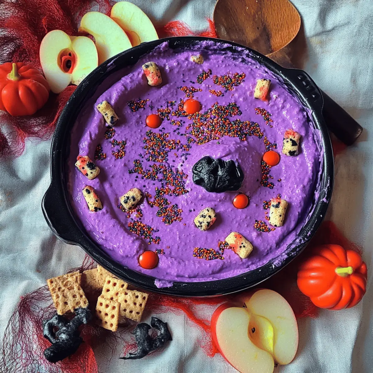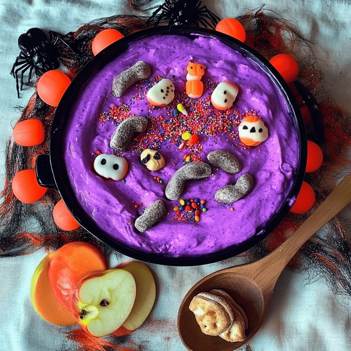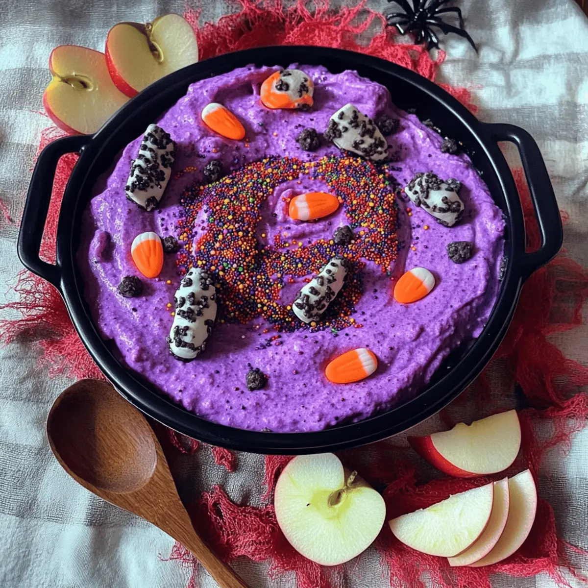 Jump to Recipe Print RecipeAs I rummaged through my pantry one rainy afternoon, I stumbled upon a treasure trove of nostalgic flavors just waiting to be rediscovered. That’s when the idea for my Spooky Dunkaroo Dip was born! Perfect for all your fall gatherings, this easy-to-make dessert dip merges the familiar fun of childhood treats with a delightful spooky twist. It’s not just a crowd-pleaser; it also offers a quick prep time, so you can spend less time in the kitchen and more time enjoying the Halloween festivities with friends and family. Pull out your favorite dippers, whether they be cookies, fruit, or even pretzels, and let’s dive into a delicious treat that sparks joy and laughter. Now, who’s ready to elevate their snack game this season? Why is Spooky Dunkaroo Dip a Must-Try? Nostalgic Flavors: This dip brings back childhood memories, combining sweet creaminess with a dash of fun! Quick & Easy: With minimal ingredients, you can whip this up in just 15 minutes—perfect for last-minute gatherings. Versatile Pairings: Whether you choose cookies, fruit, or pretzels as dippers, this dip caters to all preferences. Crowd-Pleaser: Friends and family will love it, making it an ideal centerpiece for your Halloween festivities. Discover more fun recipes like this Dunkaroo-inspired dessert that will impress your guests! Spooky Dunkaroo Dip Ingredients • Get ready to create some magical flavors! For the Dip • Cream cheese – adds a creamy texture that forms the base of your dip. • Sour cream – balances the sweetness while keeping the dip light and fluffy. • Vanilla extract – infuses a warm, comforting flavor reminiscent of classic desserts. • Powdered sugar – sweetens the dip; feel free to adjust according to your taste preferences. • Rainbow sprinkles – adds a festive touch that makes your dip extra fun for Halloween! For the Dippers • Graham crackers – provide a sturdy, crunchy base that pairs beautifully with the dip. • Apple slices – offer a refreshing contrast to the sweetness of the Spooky Dunkaroo Dip. • Mini pretzels – their saltiness balances the dip’s sweetness for a delicious combo! Let the spooky celebrations begin as you prepare this delightful treat! Step‑by‑Step Instructions for Spooky Dunkaroo Dip Step 1: Prepare the Base In a medium mixing bowl, beat together 8 ounces of softened cream cheese and 1 cup of sour cream using an electric mixer on medium speed for about 2 minutes. You’re aiming for a smooth and creamy texture, so ensure there are no lumps. Once well-combined, this forms the delightful base of your Spooky Dunkaroo Dip. Step 2: Add Sweetness and Flavor Next, mix in 1 teaspoon of vanilla extract and gradually add 1 to 2 cups of powdered sugar, tasting as you go to reach your desired sweetness. Continue to beat the mixture for another 1 to 2 minutes until it becomes fluffy and light. The vanilla will infuse a warm, comforting aroma, making your dip irresistibly inviting! Step 3: Incorporate the Fun Fold in 1/4 cup of rainbow sprinkles gently with a spatula to maintain their vibrant colors. This will give your Spooky Dunkaroo Dip its fun, festive character, perfect for Halloween celebrations. Make sure the sprinkles are evenly distributed throughout the dip for that exciting burst of color. Step 4: Chill and Serve Transfer the dip into a fun Halloween-themed serving bowl and cover it with plastic wrap. Refrigerate for at least 30 minutes to let the flavors meld and achieve a refreshing coolness. You’ll know it’s ready when the dip is chilled and firm but still easily scoopable—ideal for dipping! Step 5: Prepare Your Dippers While the dip chills, prep your dippers! Slice up some crunchy apples, break the graham crackers into manageable pieces, and have mini pretzels at the ready. Arrange these on a platter around your Spooky Dunkaroo Dip for a magical presentation that invites everyone to dig in and enjoy the treats! Expert Tips for Spooky Dunkaroo Dip • Soften Cream Cheese: Make sure your cream cheese is at room temperature before mixing. This ensures a smooth, lump-free dip that blends seamlessly with sour cream. • Adjust Sweetness: Taste as you add powdered sugar! Everyone’s sweetness levels are different; start with 1 cup and gradually increase to avoid an overly sweet dip. • Even Sprinkle Distribution: Gently fold in the rainbow sprinkles to maintain their colors. Over-mixing can cause the sprinkles to bleed, dulling the festive look of your Spooky Dunkaroo Dip. • Chill Time Importance: Don’t skip the chill time! Refrigerating for at least 30 minutes not only enhances flavors but also firms up the dip, making it easier to scoop. • Creative Dippers: Think beyond traditional dippers! Try gummy worms or Halloween-themed cookies for an extra spooky touch to your presentation. What to Serve with Spooky Dunkaroo Dip Elevate your Halloween feast with delicious accompaniments that will make your Spooky Dunkaroo Dip shine even brighter! Graham Crackers: Their crunchy texture is a classic pairing that complements the dip’s creaminess perfectly. Dip them generously and savor the nostalgia! Apple Slices: These provide a refreshing crunch and a tart contrast to the dip’s sweetness, making each bite a delightful experience. The crispness of the apples balances the rich flavors wonderfully. Mini Pretzels: A great savory option, their salty flavor enhances the dip’s sweet profile, creating a delicious harmony. The textural contrast adds an exciting element to your gathering! Chocolate Chip Cookies: This tried-and-true favorite adds a chewy, rich dimension to the dip. The sweetness from the cookies, when dipped in the Spooky Dunkaroo Dip, is pure bliss! Gummy Worms: For extra spooky fun, add colorful gummy worms as dippers! They not only look festive but also appeal to every sweet tooth at the party. Halloween-themed Cookies: Opt for ghost or pumpkin-shaped cookies to keep the festive spirit alive. They